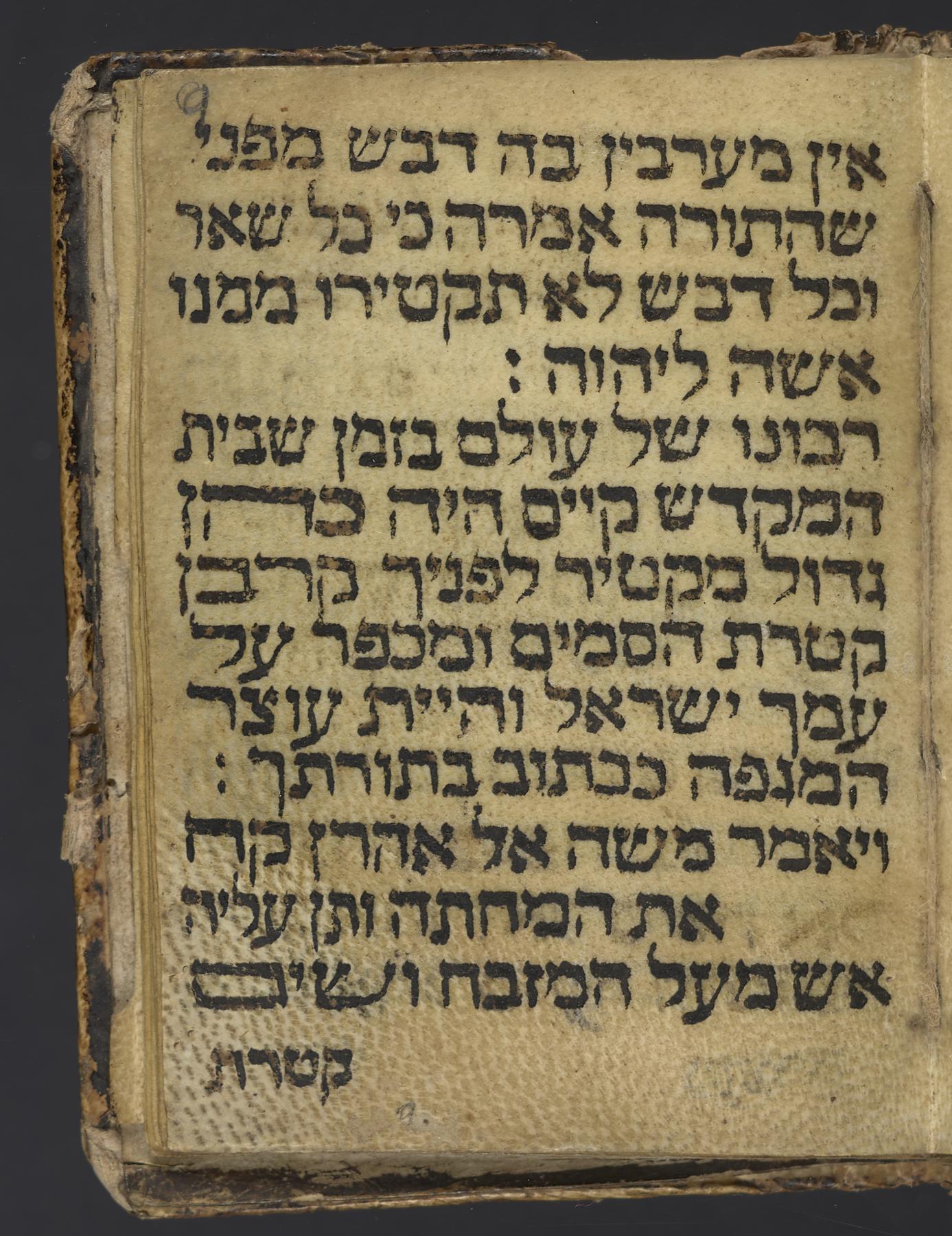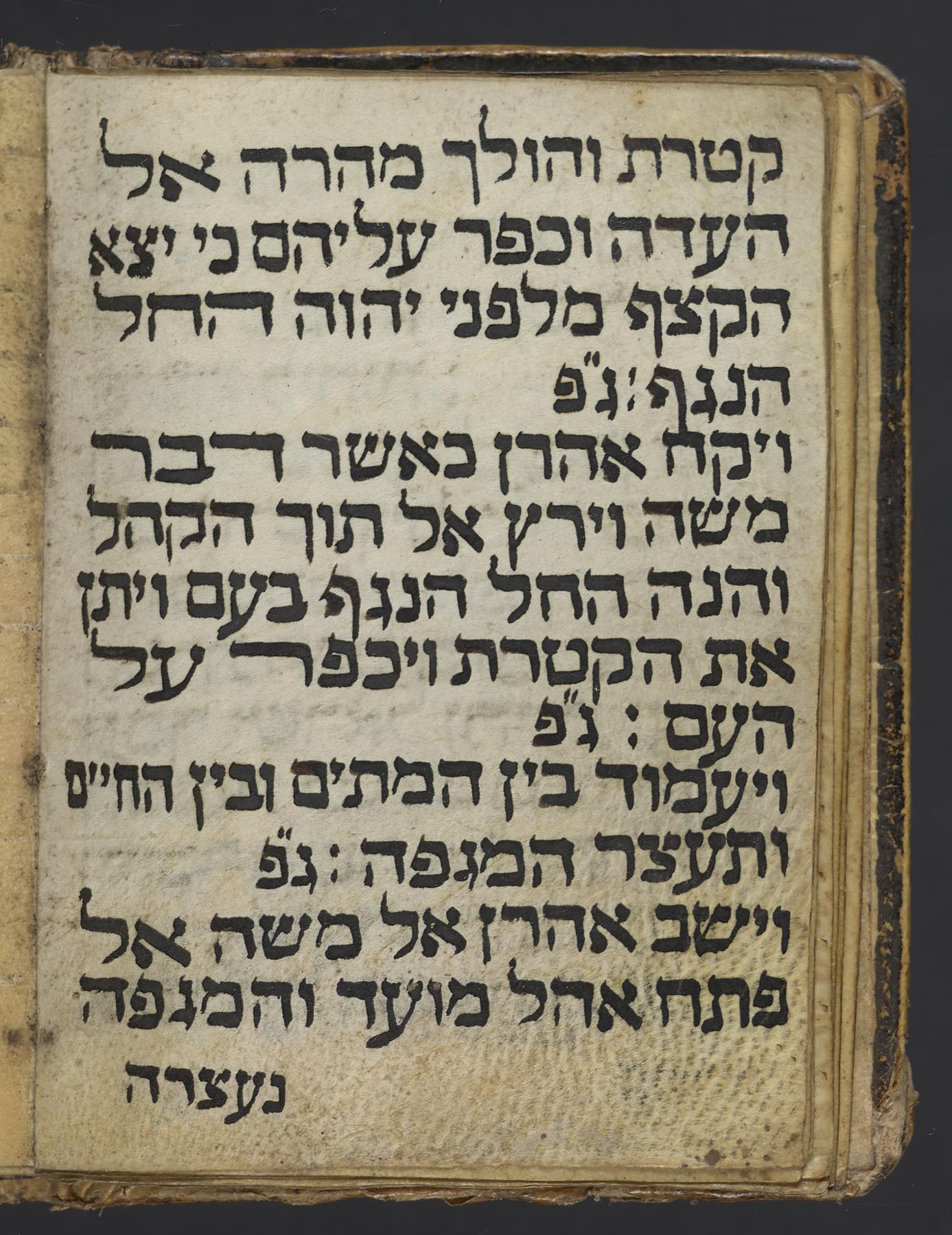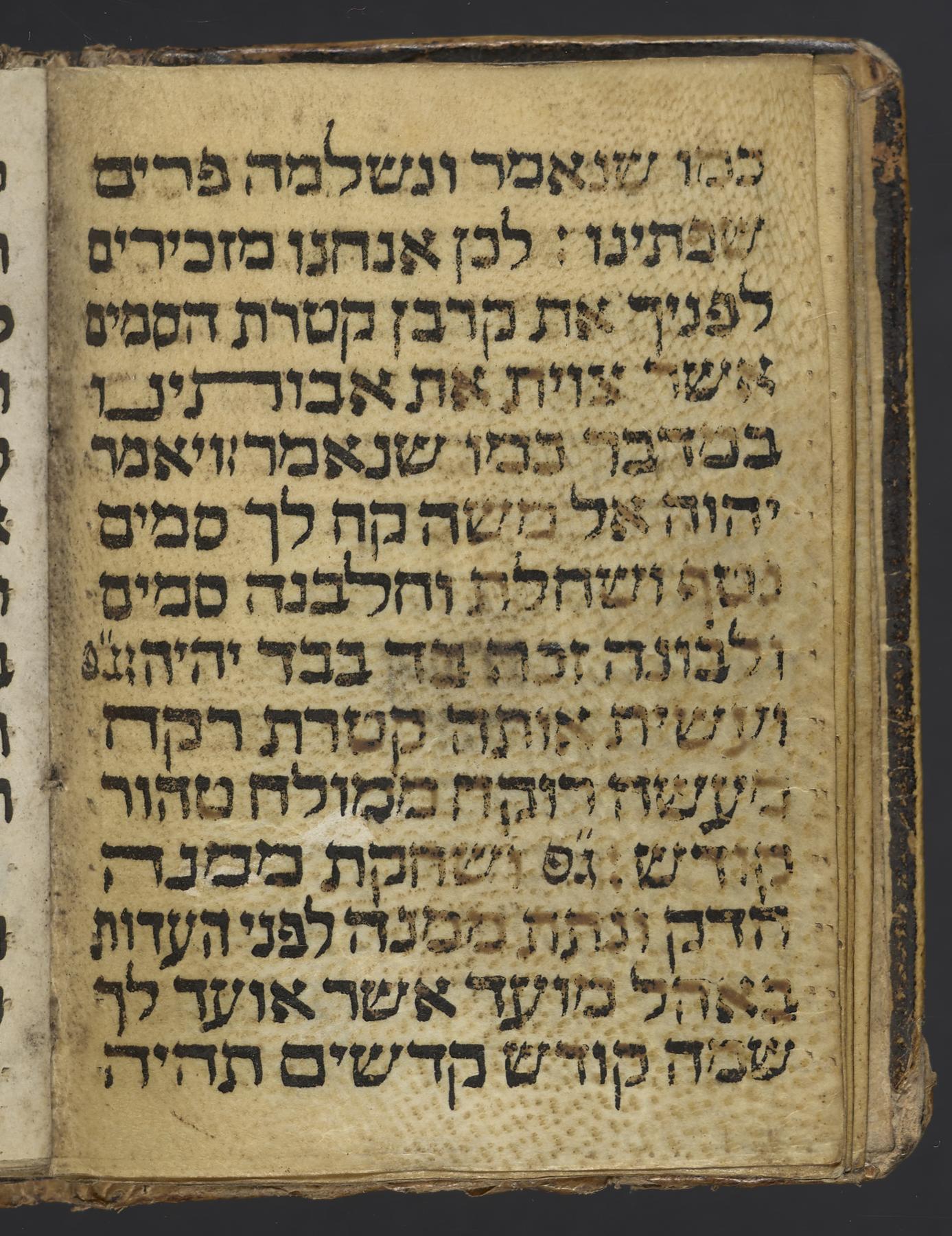 This is a miniature manuscript of prayers for the time of plague on parchment; the prayers consist of selections from the Psalms (XLI, XX, XXXVIII) and verse repetition (Genesis XVIII:6, XLIII:11) and the "Parashat ha-Ḳeṭoret" (the Biblical and Talmudic passages detailing the creation of the incense in the Temple; the invocation of the incense used as a spiritual protection from plague is likely based on the Zohar (Ṿa-yeḥi 419)), completing on f. 9r; additional verses from Numbers (XVII:11-13), and the concluding prayer (f. 10r-11r), and miscellanea (f. 11r-12v). A Shiviti amulet was begun but not finished (f. 13r; folios 14-16 blank); large Shiviti text written in calligraphy (f. 1r).
