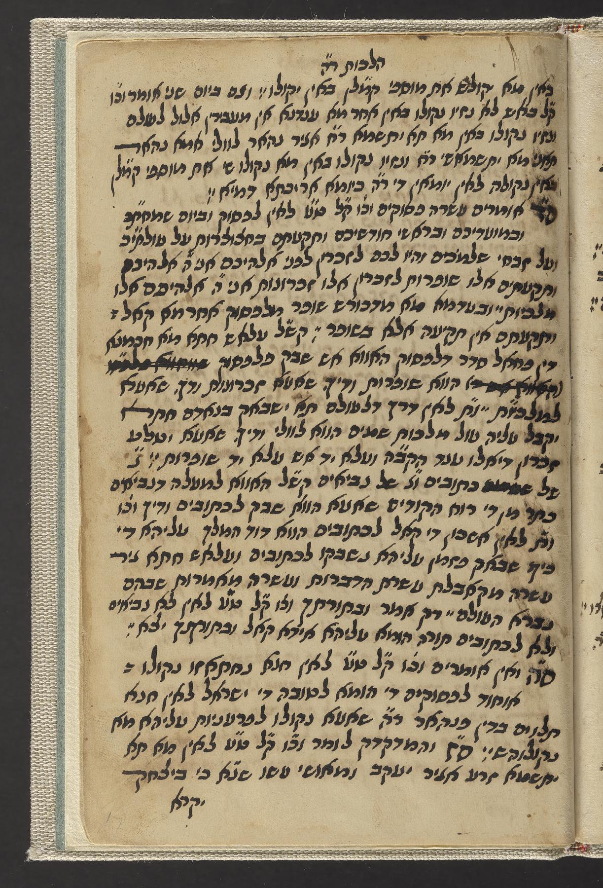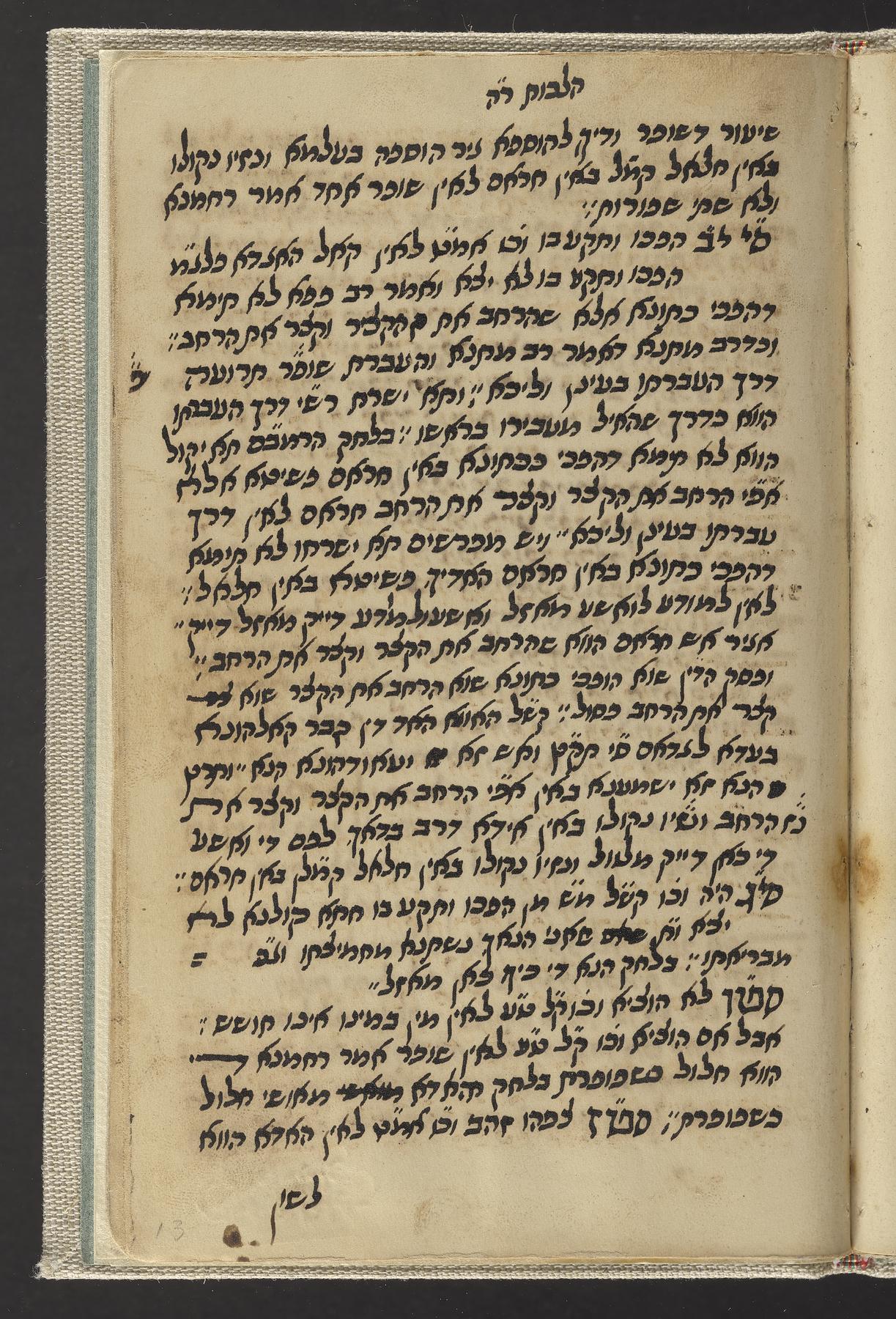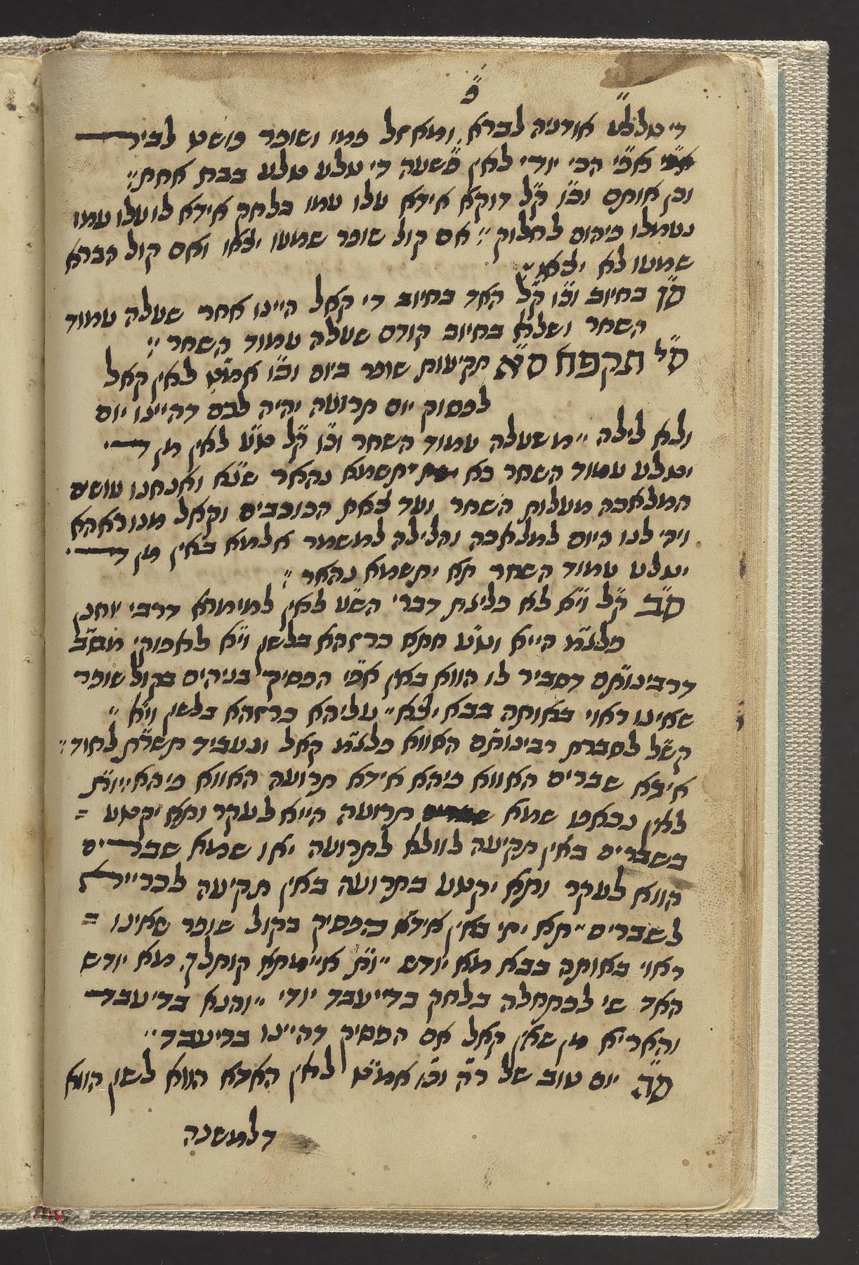 Manuscript miscellany recording sermon material for funerals, cabalistic remedies, and writing relating to Rosh ha-Shanah, written in a scribal Sephardic semi-cursive script; the Halakhic portion is written in a similar style to Sofer, Yaʻaḳov Ḥayim. Kaf ha-Ḥayim, to Shulḥan ʻarukh Oraḥ Ḥayim 586, and the manuscript likely originated in the sphere of Sofer and Yosef Hayyim (1835-1909, known as Ben Ish ḥai), based upon the script, style, and content.