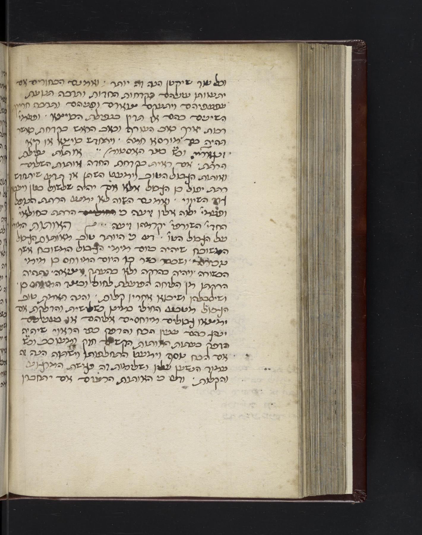 Books 1-3 and the beginning of Book 4 of Avicenna's 11th-century comprehensive medical work, translated into Hebrew from Arabic. At the end of the volume is Maimonides's 12th-century treatise on poisons, a much shorter work, which is also lacking the end of the text and was also translated from Hebrew to Arabic, by Mosheh Ibn Tibon. Marginal notes in Hebrew, with at least one in Italian (f. 44v).