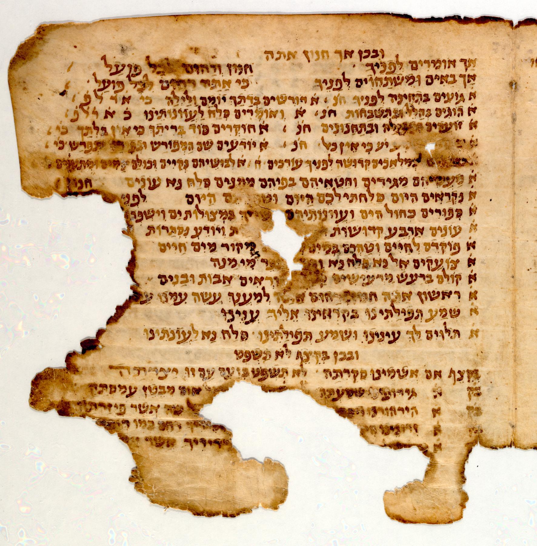 - Verse endings denoted by a punctus; Most of the piyutim here are common found arranged in the Ḳedushta for Yom Kippur שושן עמק; Fol. 1: A. A complete version of אך אומרים לפניך (Thesaurus of mediaeval Hebrew poetry / Israel Davidson. New York : JTS, 1924, 3211), possibly Kallirian (Maḥazor le-yamim ha-noraʾim / E.D. Goldschmidt [ed.]. Jerusalem : Koren, 1970, v. 2, p. 357); B. בקצף אם אשמינו סקרת (TMHP 1315) possibly Kallirian (Goldschmidt, ibid. p. 383. Verses through are damaged; C. The Kallirian אמיצי שחקים ממעל (TMHP 5708). The fragment reaches verse מ; Fol. 2: D. The last 10 verses (מ-ת) of אתה ברחמיך הרבים רחם עלינו (TMHP 8716); E. A piyyut of short verses, averaging 8 syllables each, alphabetically arranged, one verse per letter. Starts איום אין בלעדיך; F. In a similar scheme: אל עורך דין\ באמת ואין עול (TMHP 3953). Verses and onwards are damaged or missing from the bottom of the recto; G. In a similar scheme (5 syllables per verse) אל אלהינו בשמים\ גבור ונערץ (Goldschmidt, ibid. p.376); H. אל [אמונה] אתה ורחום לכל מאמינך (Goldschmidt, ibid. p. 378); I. The beginning of לאוהב צדקות\ לבוחן כליות (Goldschmidt, ibid. p 380). Verses ז and onwards are damaged or missing from the bottom of the verso.