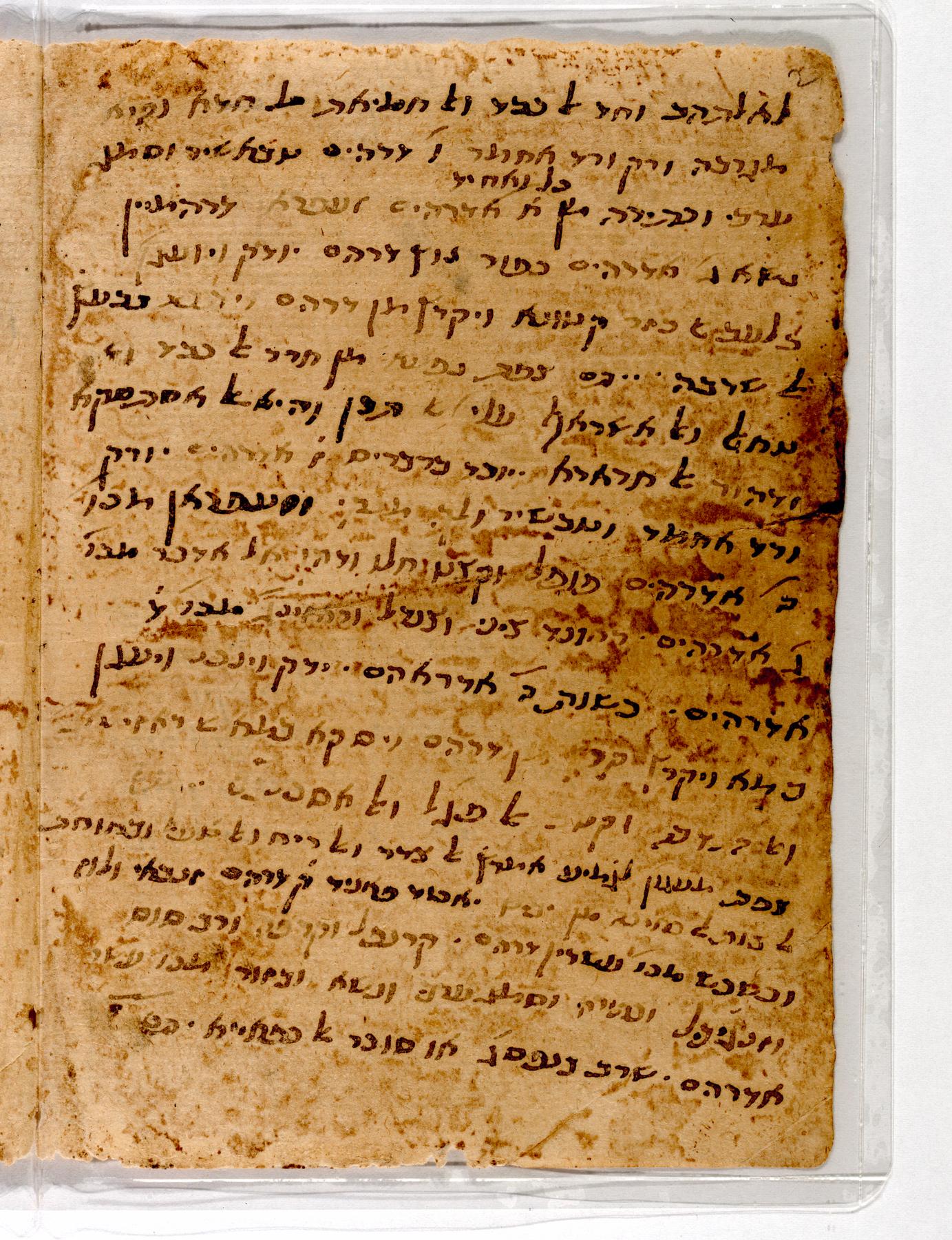 - Fol. 1r, under the heading פזמון, is Abraham ben Samuel Abulafia's kabbalic poem for Shavuotאשתעשע במש(א)ל קדמון, which ends in praise for Maimonides. See Steinschneider, Koṿets ʹal yad, sidrah 1, kerehh 1 (1885), p. 4, 15. Followed by Hebrew instructions for preparing a prescription for sorts of leprosy. Together they are 17 lines, the remainder of the page is empty; Fol. 1v contains various remedies in Judeo-Arabic; Fol. 2v contains a potion in Hebrew for a thin man or woman who wishes to be fat; remainder of the page is empty.