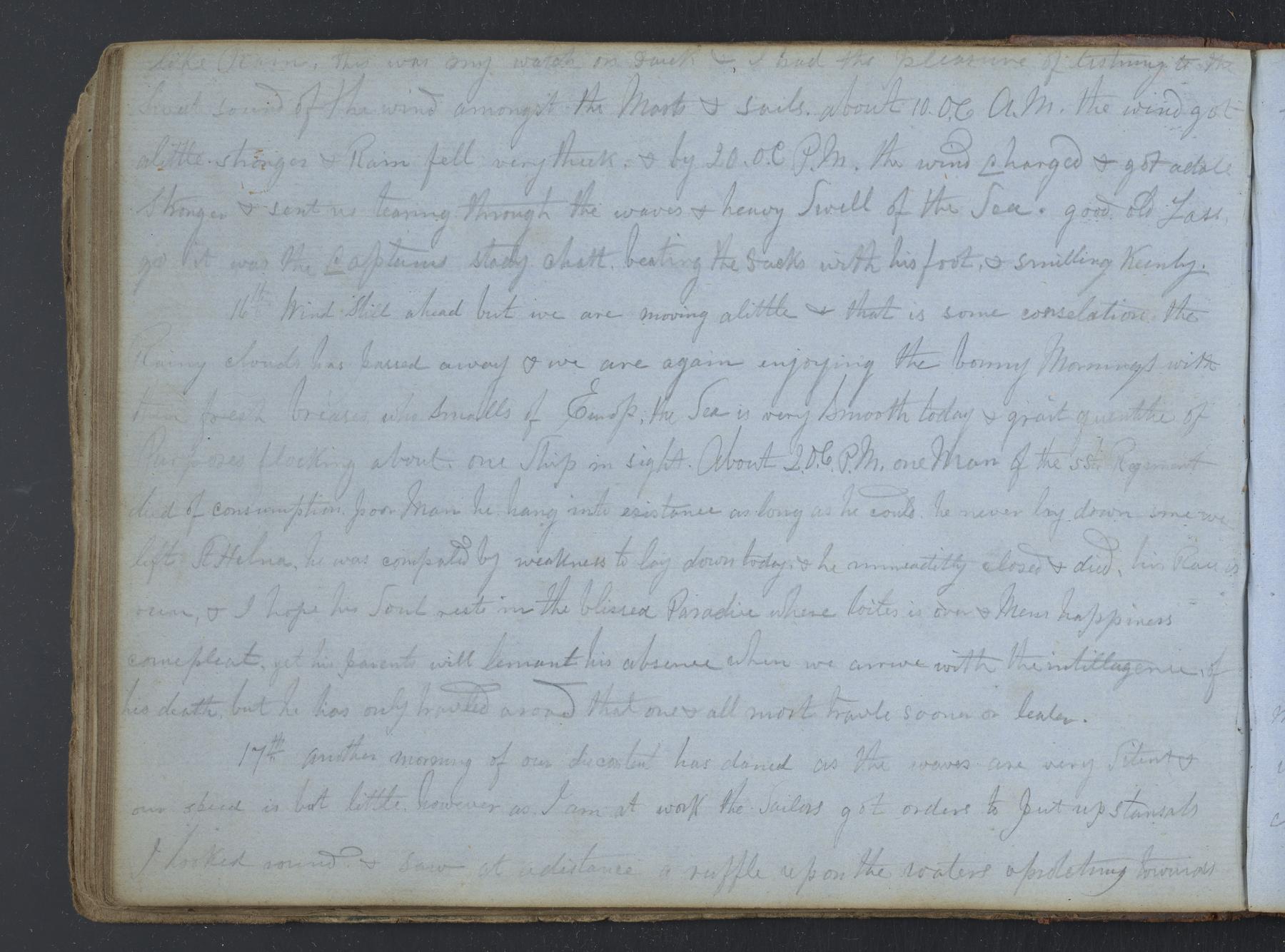 A worn, marbled-paper covered volume comprising the journal of William B. Hadden. The journal was written during Hadden's three-month voyage from India to England on board the ship Gosforth during the month from April 3 to July 31, 1865. Above his first entry on April 3, 1865 Hadden wrote "Passage from India to England." Hadden noted the ship was overcrowded due to the number of soldiers leaving India. Hadden recorded his experiences on board, daily life, and passing time. He was returning to England after a twelve-year absence. In the journal he reminisced of his boyhood in Benholm, Kincardineshire, Scotland. Hadden recorded sailing conditions, passing ships, daily rations, laundry day, and his assignments of guard duty. He provided descriptions of amusements and distractions on board the ship including watching flying fish, porpoises, and whales; playing games of cards and dice; and reading, writing, and sketching. Hadden also wrote of his conversations on board, his dreams, and his writing case. He noted a man who jumped overboard, a widow pursuing his company, and a punishment at sea. Reading the volume from back to front is a fictional story with the heading Adventures amongst the Himalayan Mountains. The tale involves Hadden and a fellow soldier in pursuit of two young Indian women. The account describes altercations with the family of the girls and the consequences of the forbidden romance. Also included in the volume are fifteen drawings in colored pencil of sites including Dagshai, Baghdad, and the Cape of Good Hope. One drawing is labeled "Harvest House. Of all Scotland." There are also a few poems, a table longitude and latitude by place, and a list of words in Urdu with English translation are included in the volume.