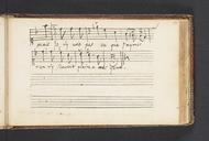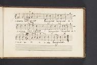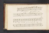 Oblong songbook containing melodies (some with accompanying bass) and texts of songs and arias in French, with a few in Italian and some religious pieces in Latin. Of the French pieces, two arias are identified by their operas (f. 43v-46r), which are by Jean-Baptiste Lully; several more Lully arias are included without attribution, and the latest identifiable composition is "Cher souvenir douce tendresse" (f. 73r-75r), from the 1688 opera Zéphire et Flore, thought to be by Pierre Vignon and Jean-Louis Lully. Italian songs include two by 17th-century Italian composer Mario Savioni, "L'amor e lo sdegno sapete cos' è" (f. 34v-35r) and "Pupille serene, voi sette dei cieli" (f. 35v-36r). Latin religious works include a few hymns at the beginning (f. 1r-6r), a motet for the Eucharist (f. 68v-72r), and parts of settings of the Lamentations of Jeremiah and the Magnificat and more hymns (f. 76v-88v). Some of the Latin pieces have paratextual elements, such as titles and directions, in French. The last song in the volume, "Hark, hark, hark, the storm grows loud" (f. 89v-92v) was originally published by English composer Pelham Humfrey in 1673. A modern note in French summarizing the contents is pasted on the front flyleaf.