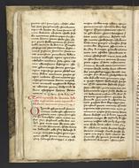 - Most folios were remargined at an early date. The current collation bears little relationship to the original, since all bifolia were made single leaves, then resewn, possibly out of order (catchwords on f. 6v do not match the text on f. 7r, and the 17th-century numbering is out of order). However, the current order agrees with the 15th-16th-century table of contents (f. 50r-52r), so the manuscript may have been taken apart, misbound, foliated and then rebound in the correct order. Folio 39 is bound backwards.