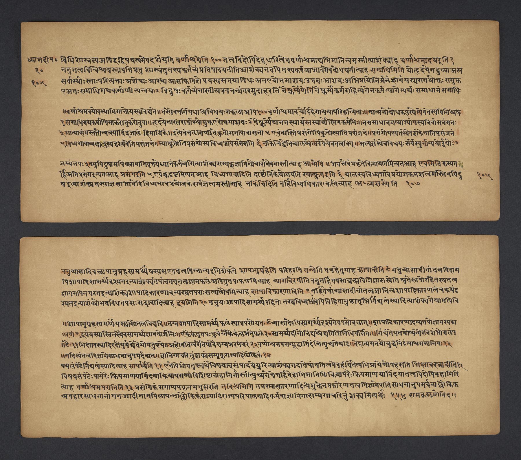 Manuscript is used for contemplation and study and is a treatise on Hindu philosophy whose title is translated as Light on meditation, written from the perspective of the Advaita (non-dualism) Vedānta school of philosophy; work contains part of an extensive commentary called the Tātparyabodhinī by Rāmakṛṣṇa running parallel, above and below, the main root text.