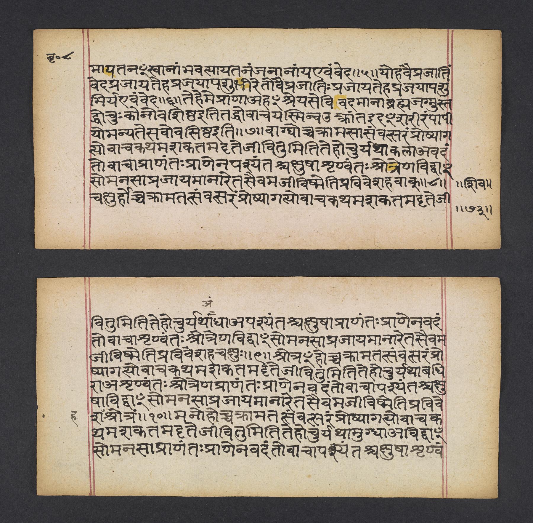 Colophon: iti bṛhadāraṇyake aṣṭamo 'dhyāyaḥ samāptaḥ // iti ṣṭahadāraṇyako 'paniṣatsamāptaṃ // oṃ tat sad brahmārpaṇam // (f. 87v).Provenance