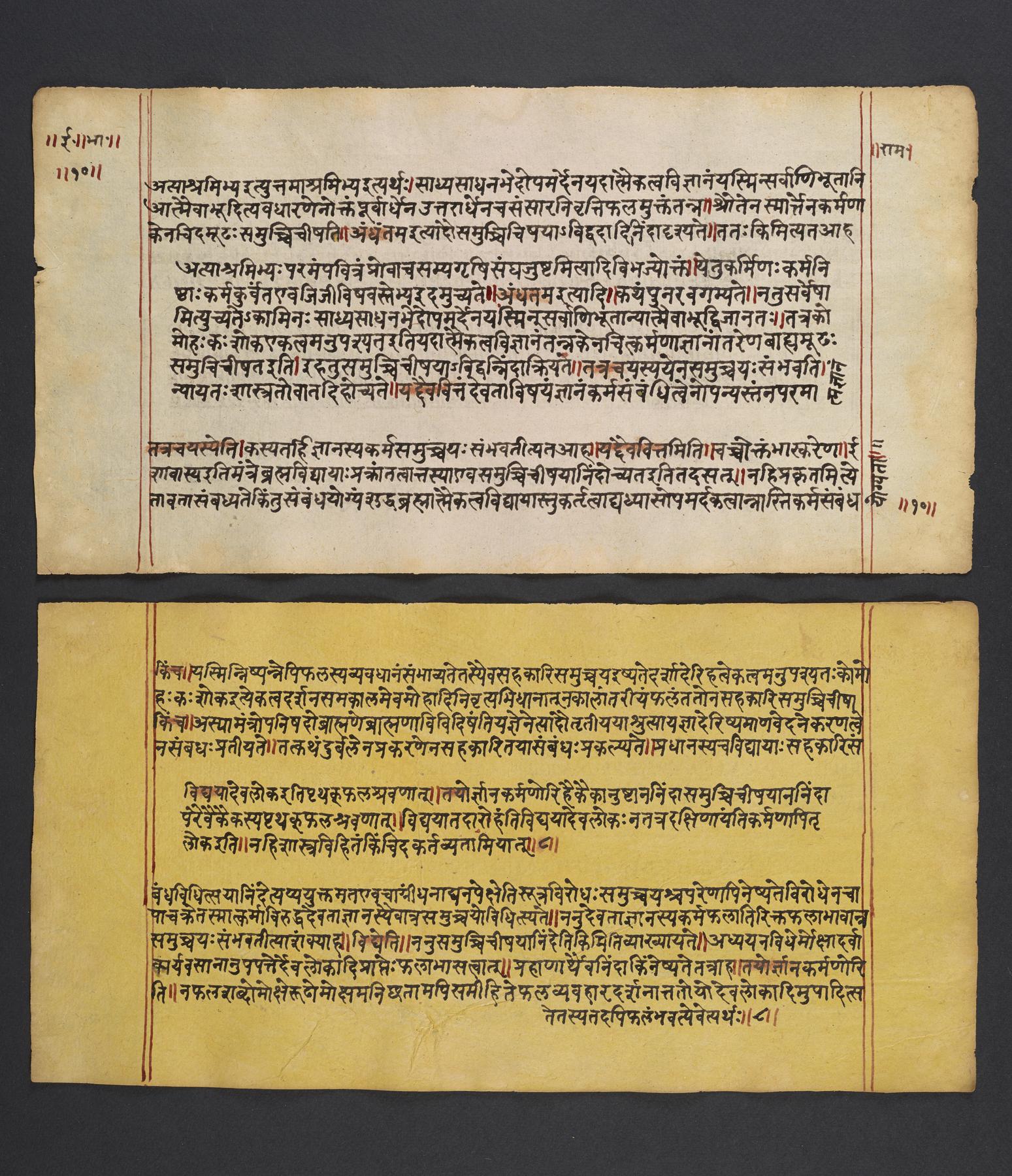 - Mistakes covered over in yellow or blacked out; some corrections and additions in margins; significant syllables, words, or phrases highlighted in red throughout; vertical margins marked with double red line. Some folios are treated with yellow turmeric powder to protect the manuscript from insects.