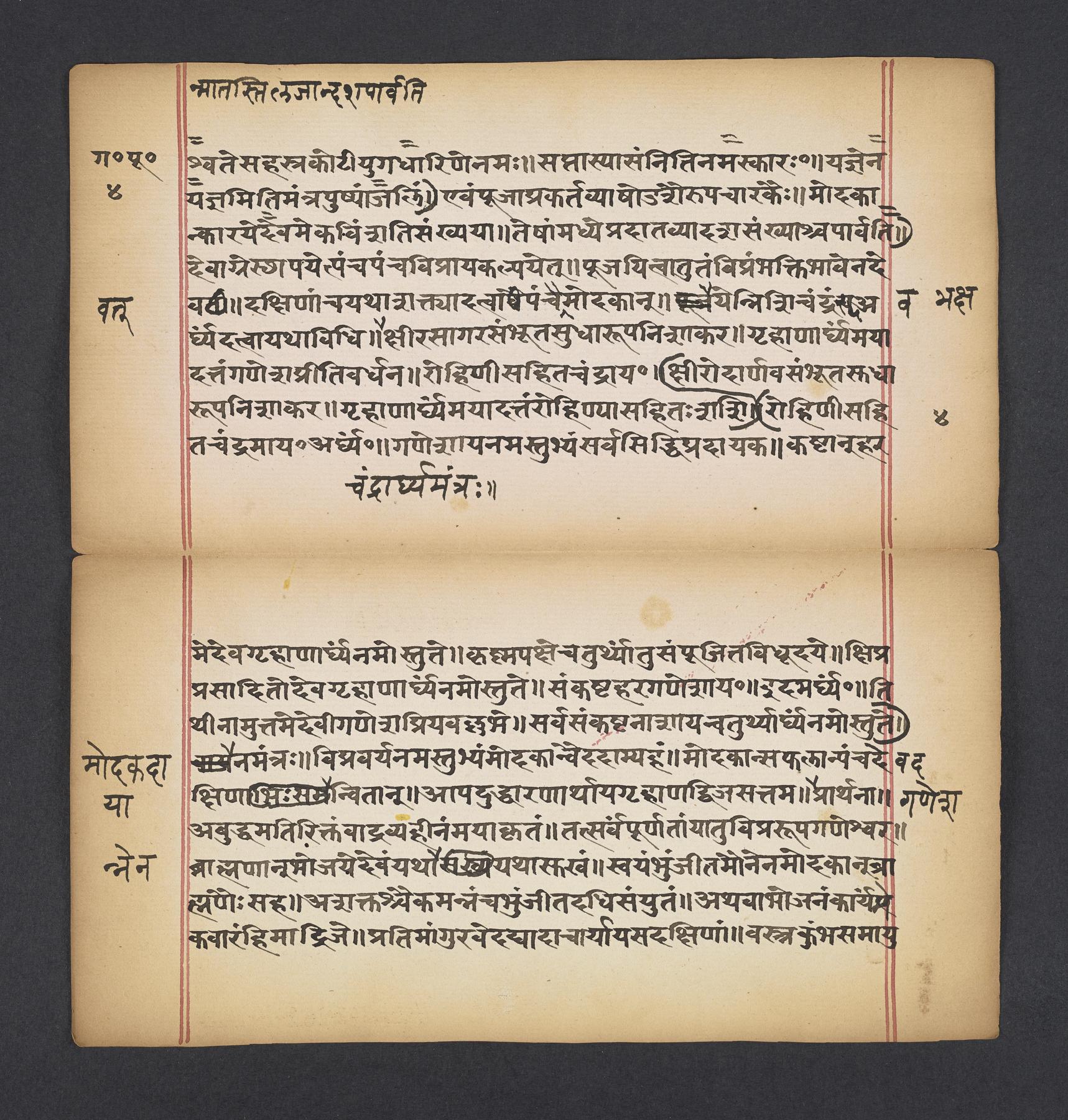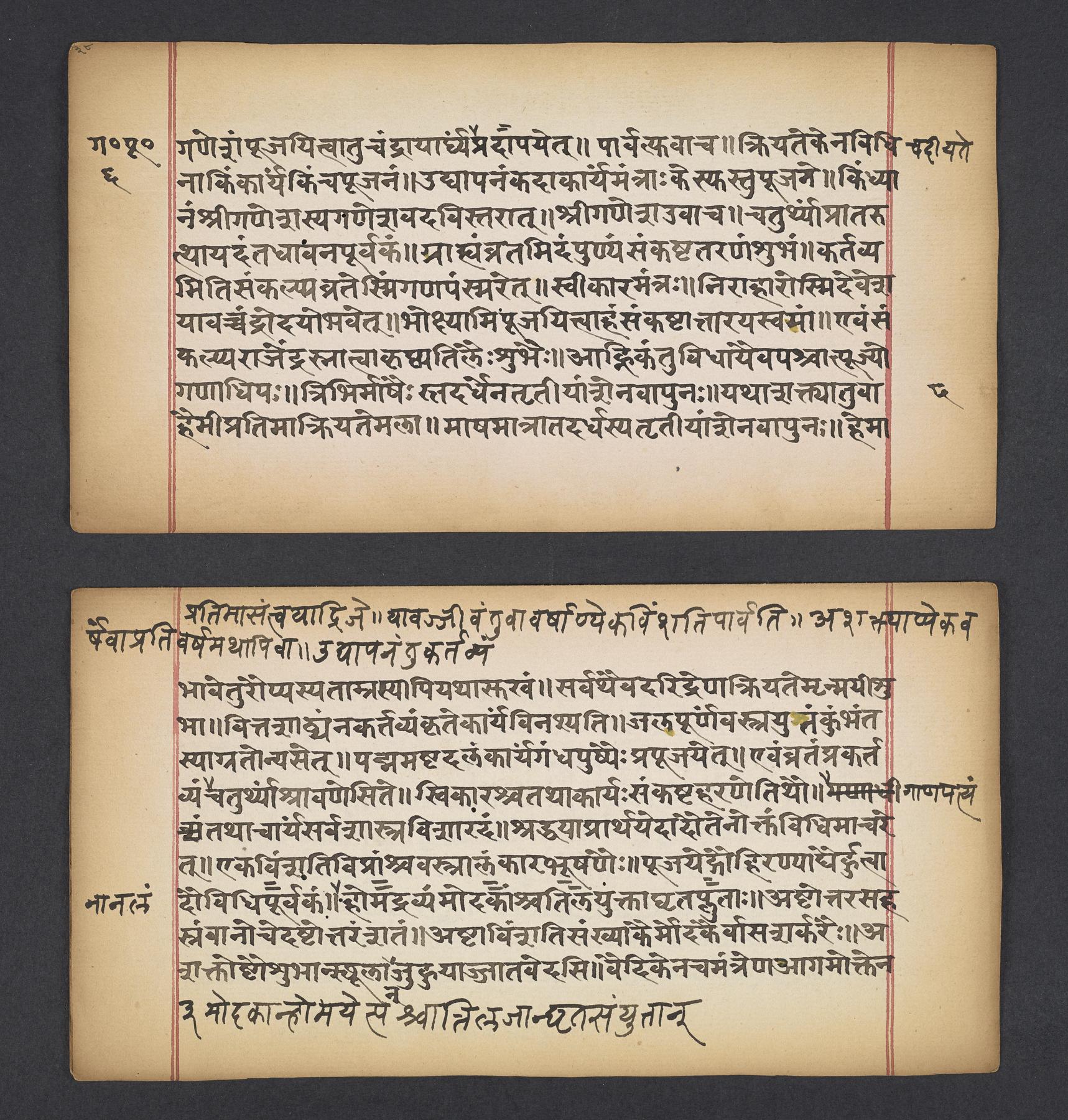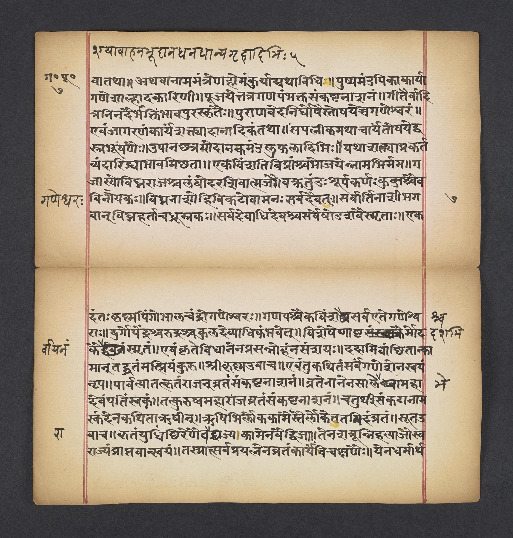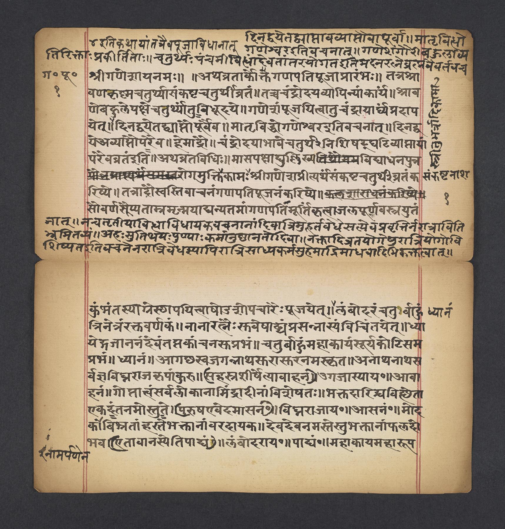 Manual including rules and laws (dharma) for rites and observances (vratas) in a celebration and praise of the Hindu elephant-headed deity Gaṇeśa that occurs during each lunar month to help avoid trouble and pain. The manuscript was likely part of a larger compendium of observances (vratas) called the Vratārka which itself is likely drawn from the Skandapurāṇa (f. 8v).