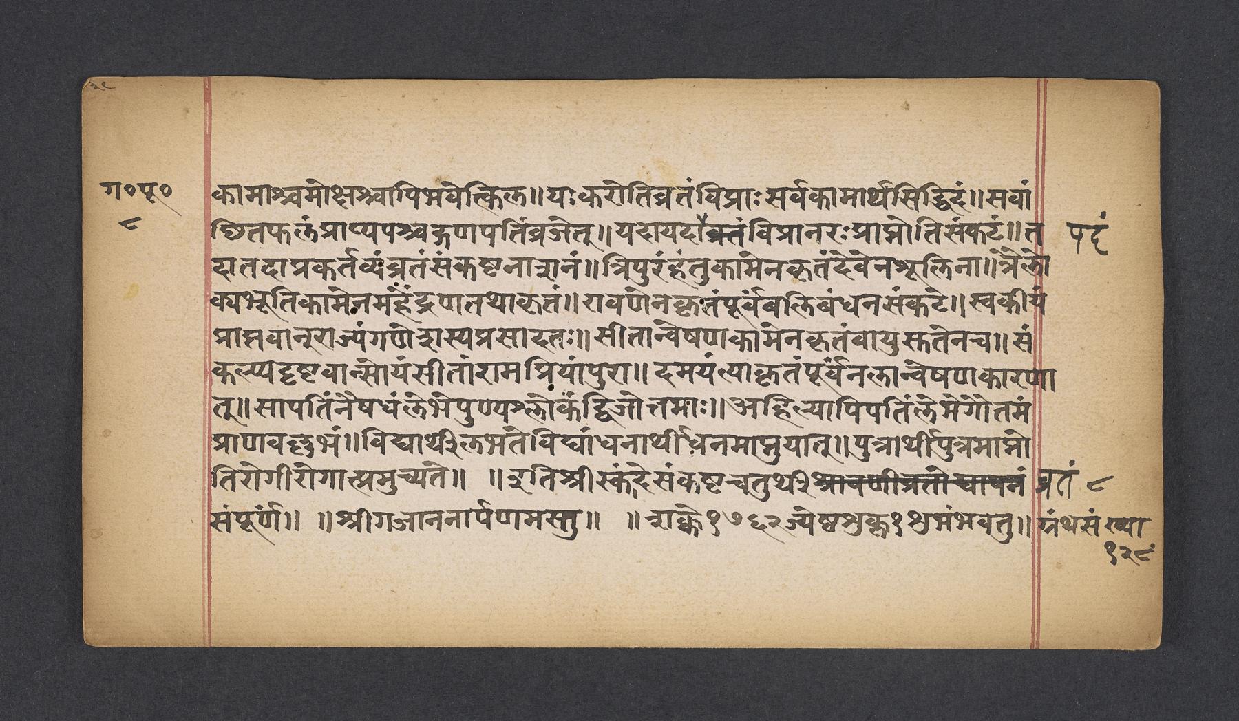 Colophon: iti śrīskaṃde saṃkaṣṭacaturthivrataṃ saṃpūrṇaṃ // śrīgajānanārpaṇam astu // (f. 8v).Subjects topical