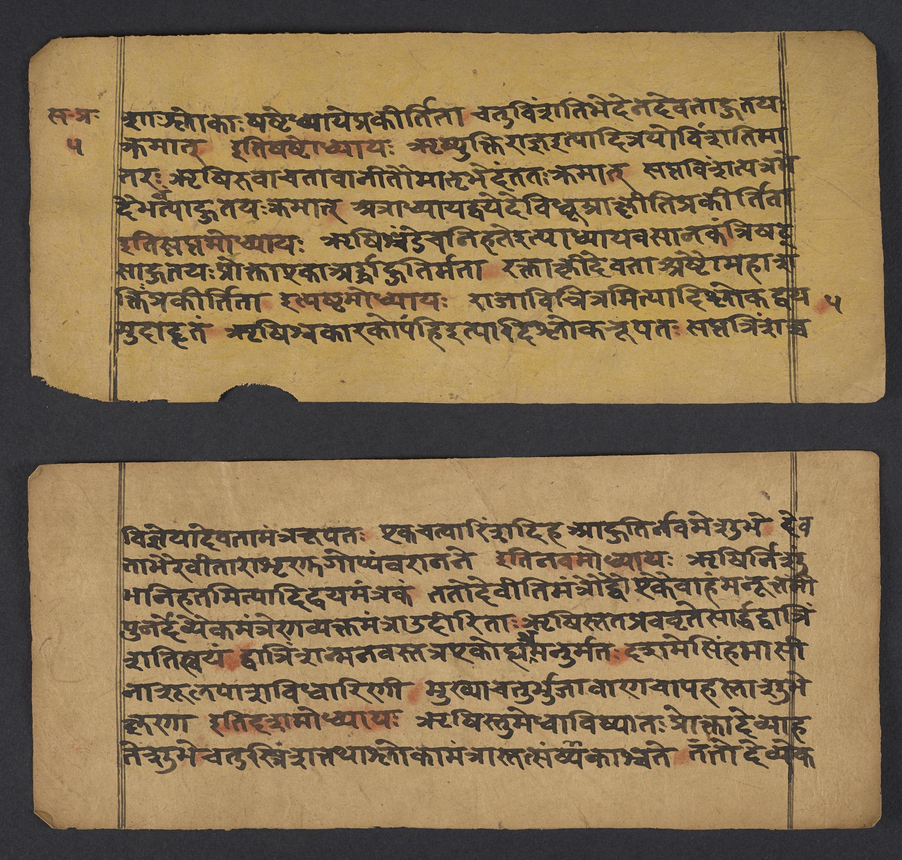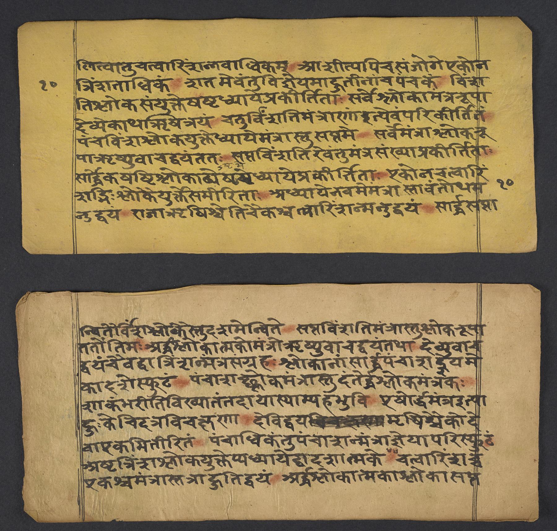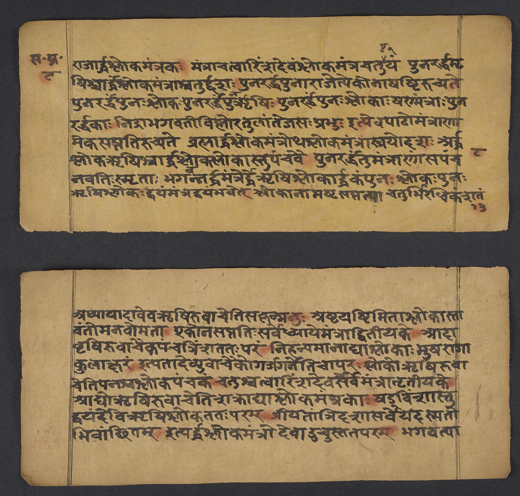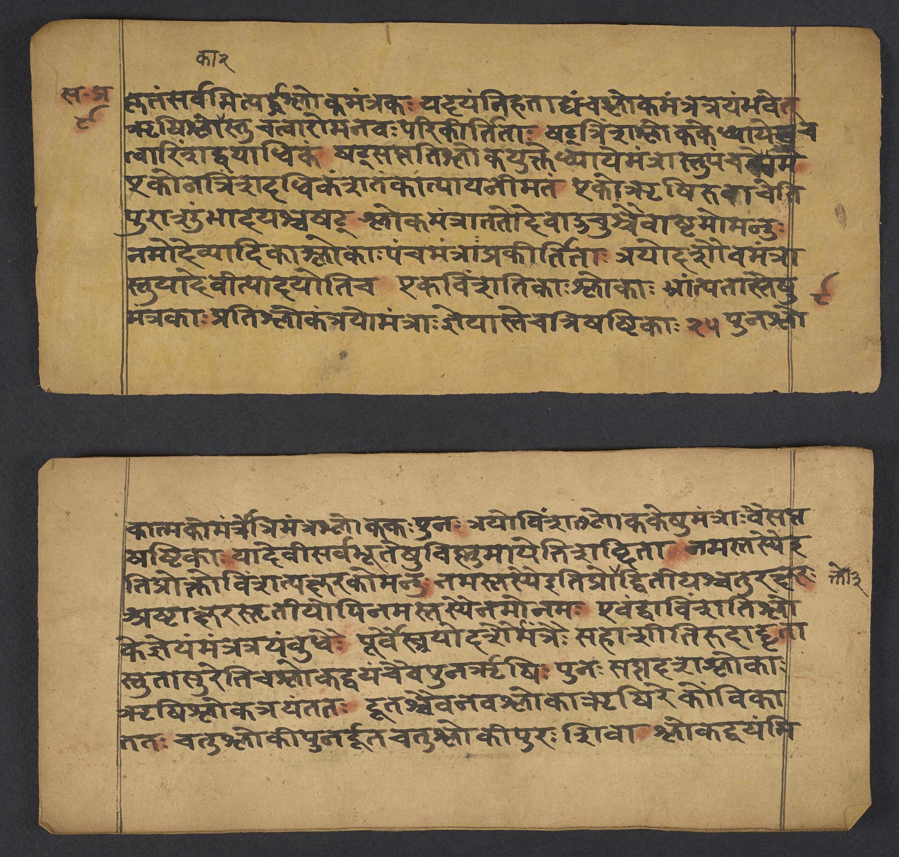 - Reddish-orange powder rubbed over invocation; colophon; syllables having a final visarga, anusvara or hiatus; some words, and all numbers. Mistakes crossed through, blotched out with black, or indicated with vertical strokes over the syllable in question. Some marginal corrections.