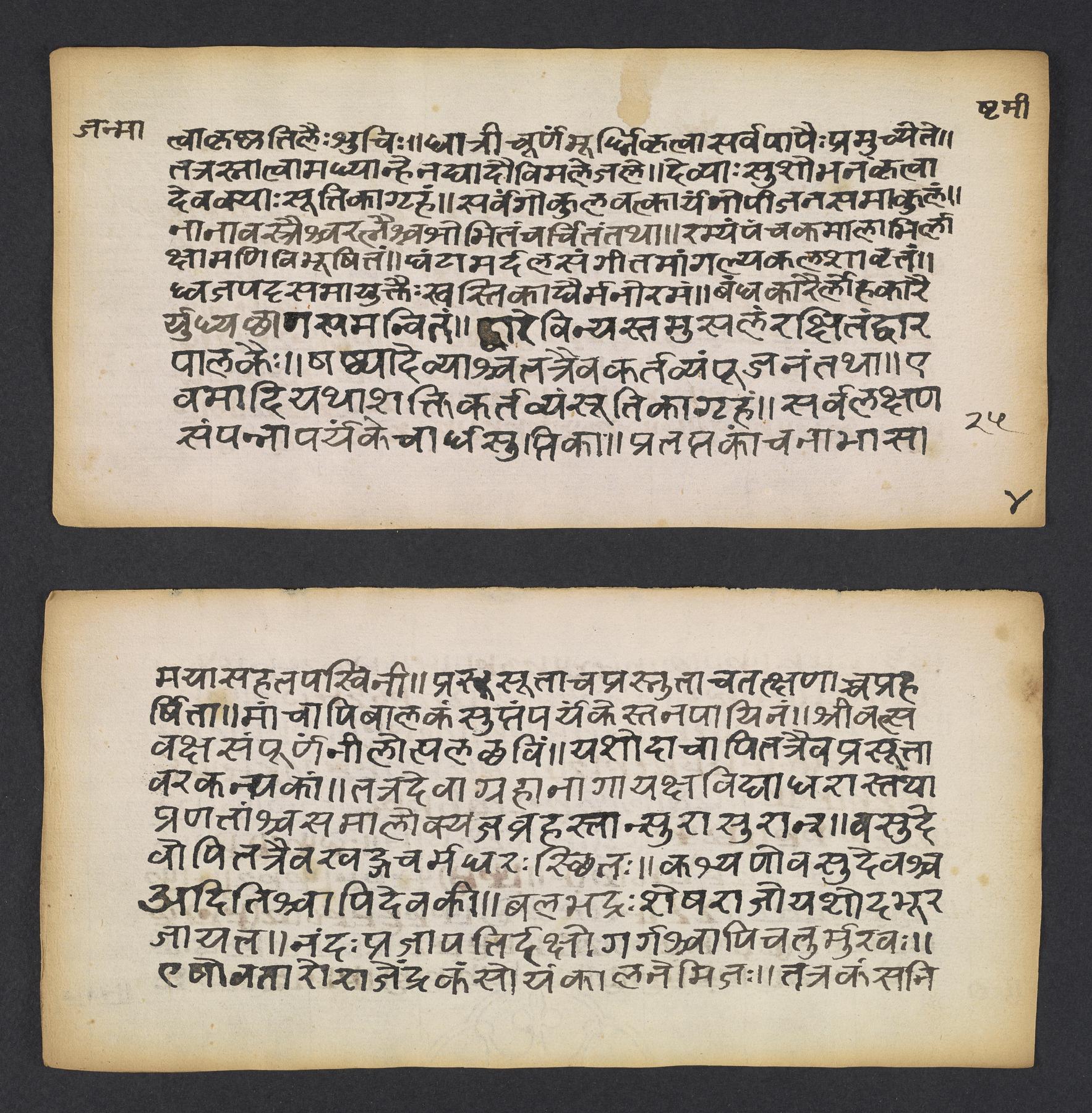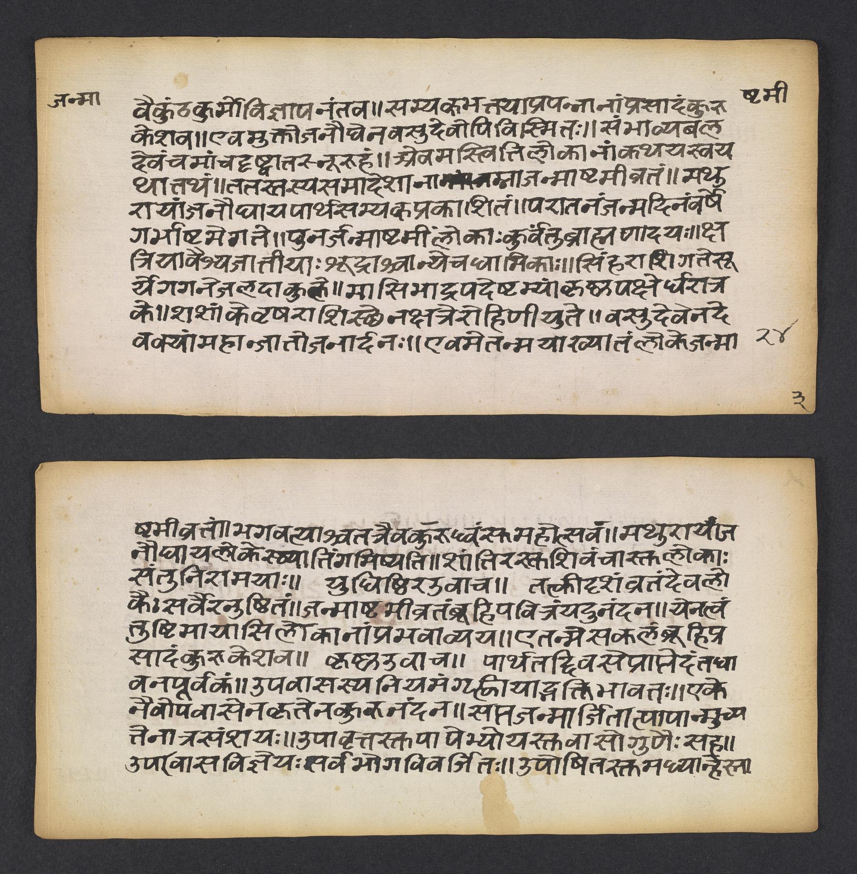 Observances (vrata), rites, and worship (pūjā) performed during the month of Bhādrapada (August-September) in honor of the supposed birthday of the Hindu deity Kṛṣṇa. Additional foliation (f. 122-129) suggests that it was part of a larger manuscript and was likely housed with similar texts; Item 1460 was very likely housed with this manuscript and created by the same scribe. Possibly a larger work containing different vratas was separated to be more profitable.