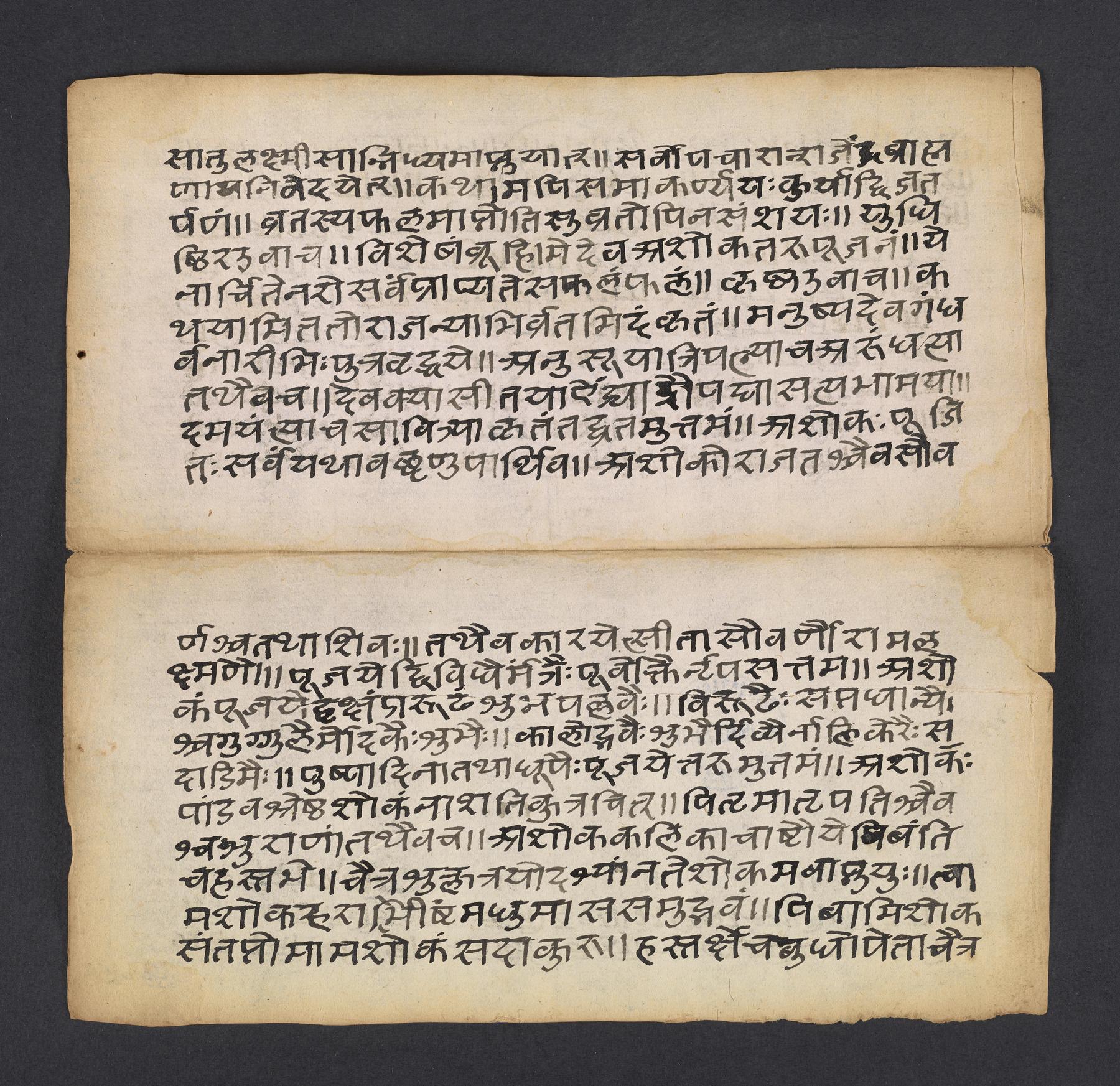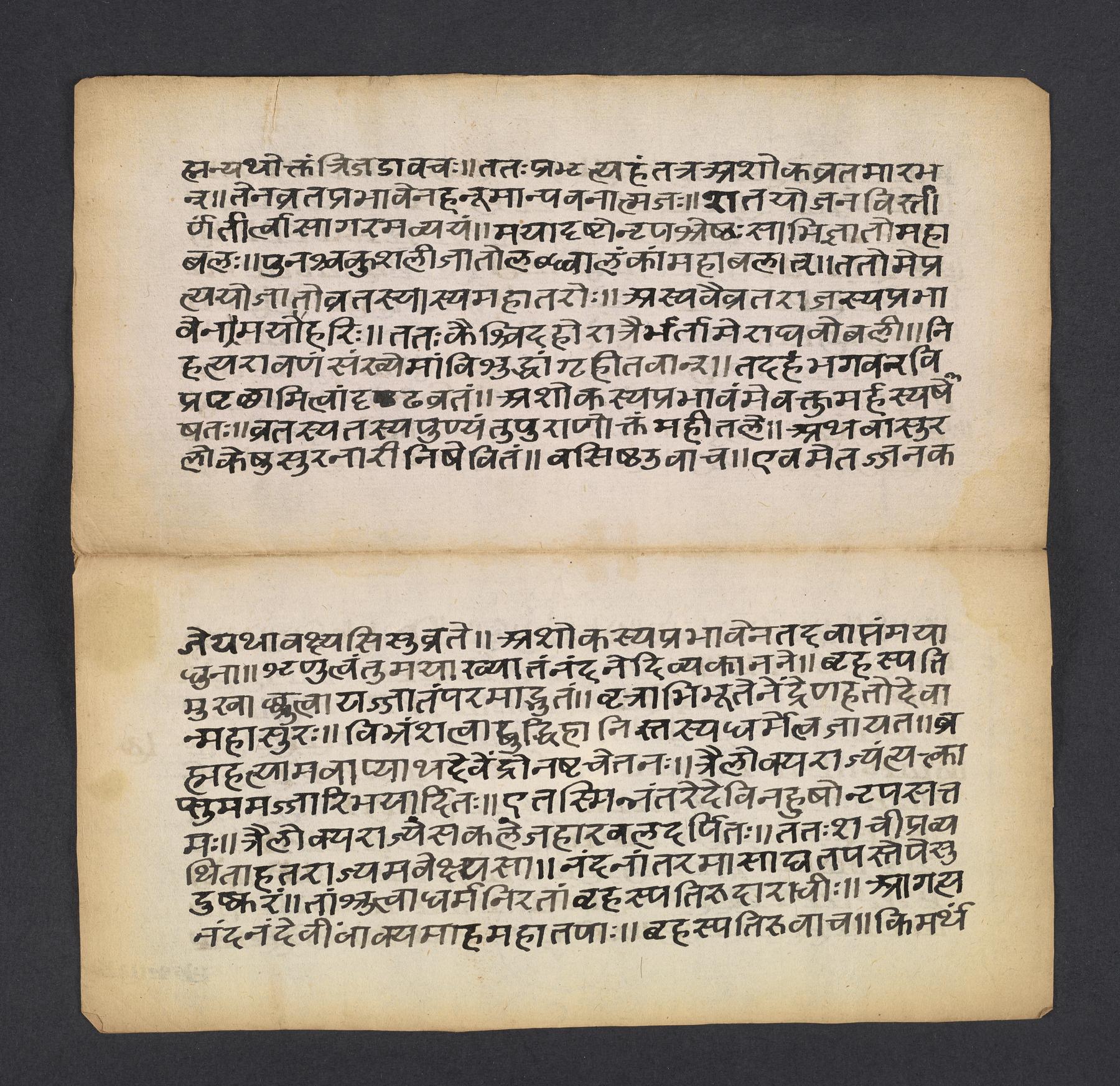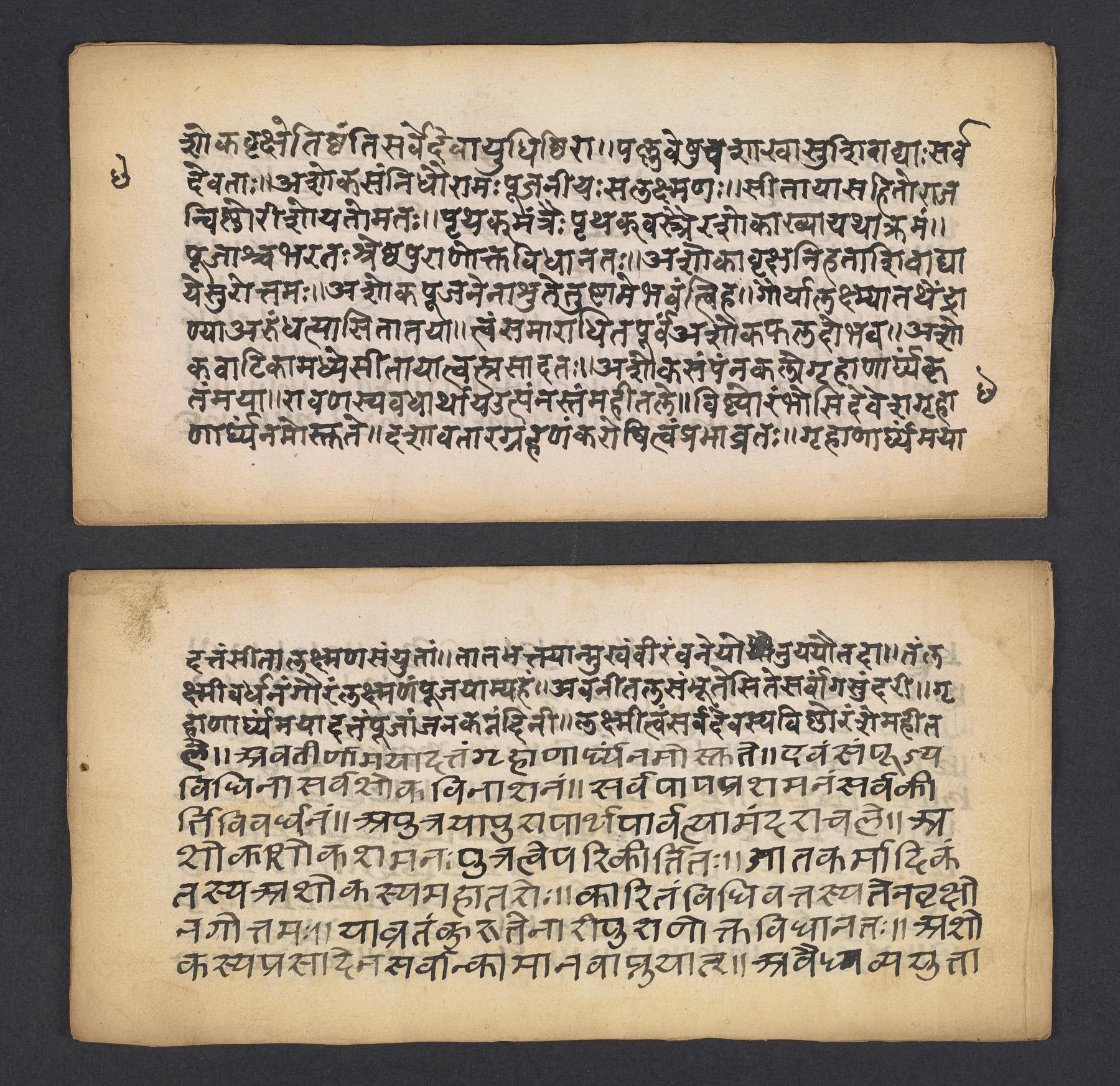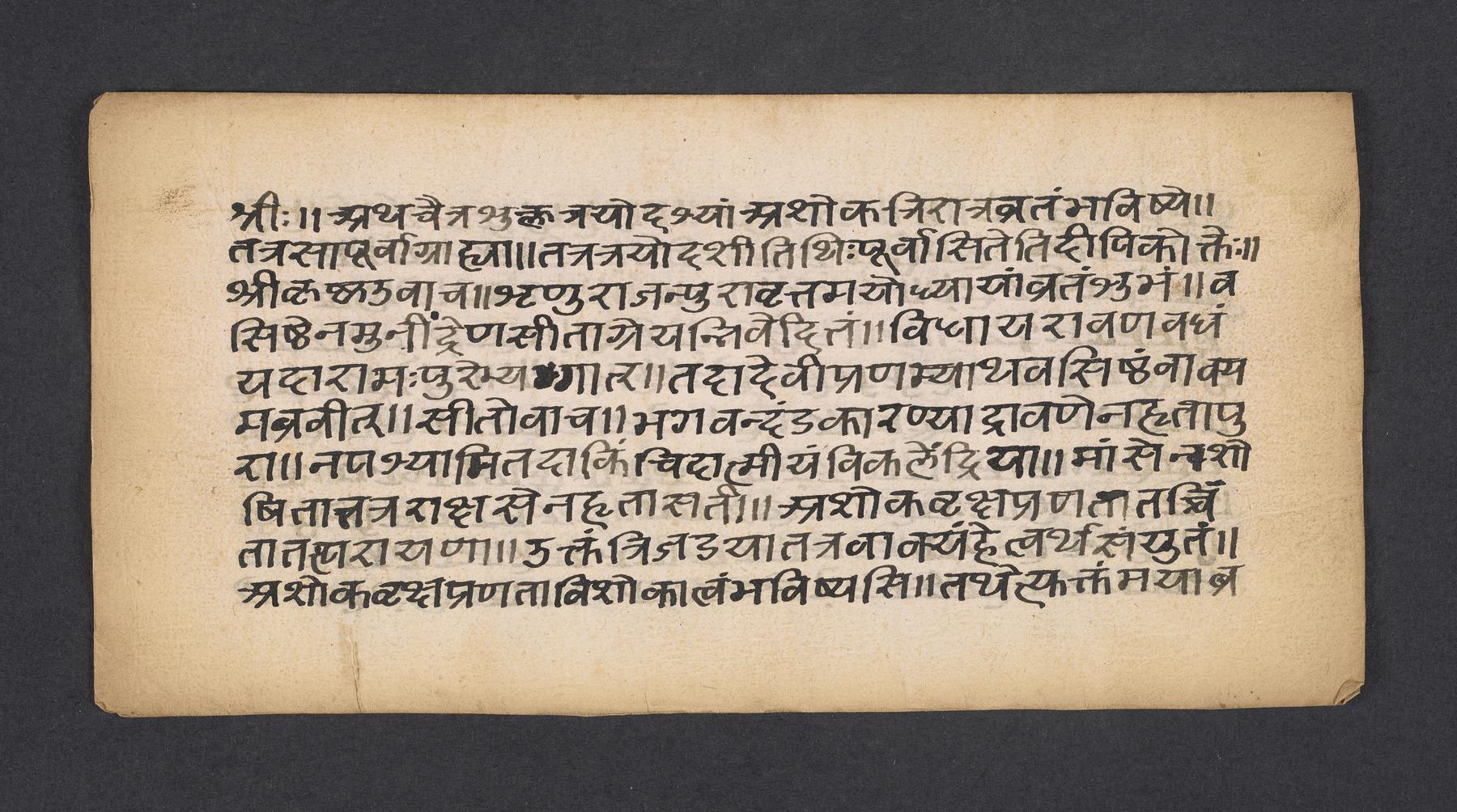 Manuscript for public or private use for consultation, recitation, and celebration of a feast that is held over the course of three nights (trirātra) and the performance of related observances (vratas). Text celebrates the killing of the demon king Rāvaṇa and the sorrow-ending powers of the Aśoka tree.