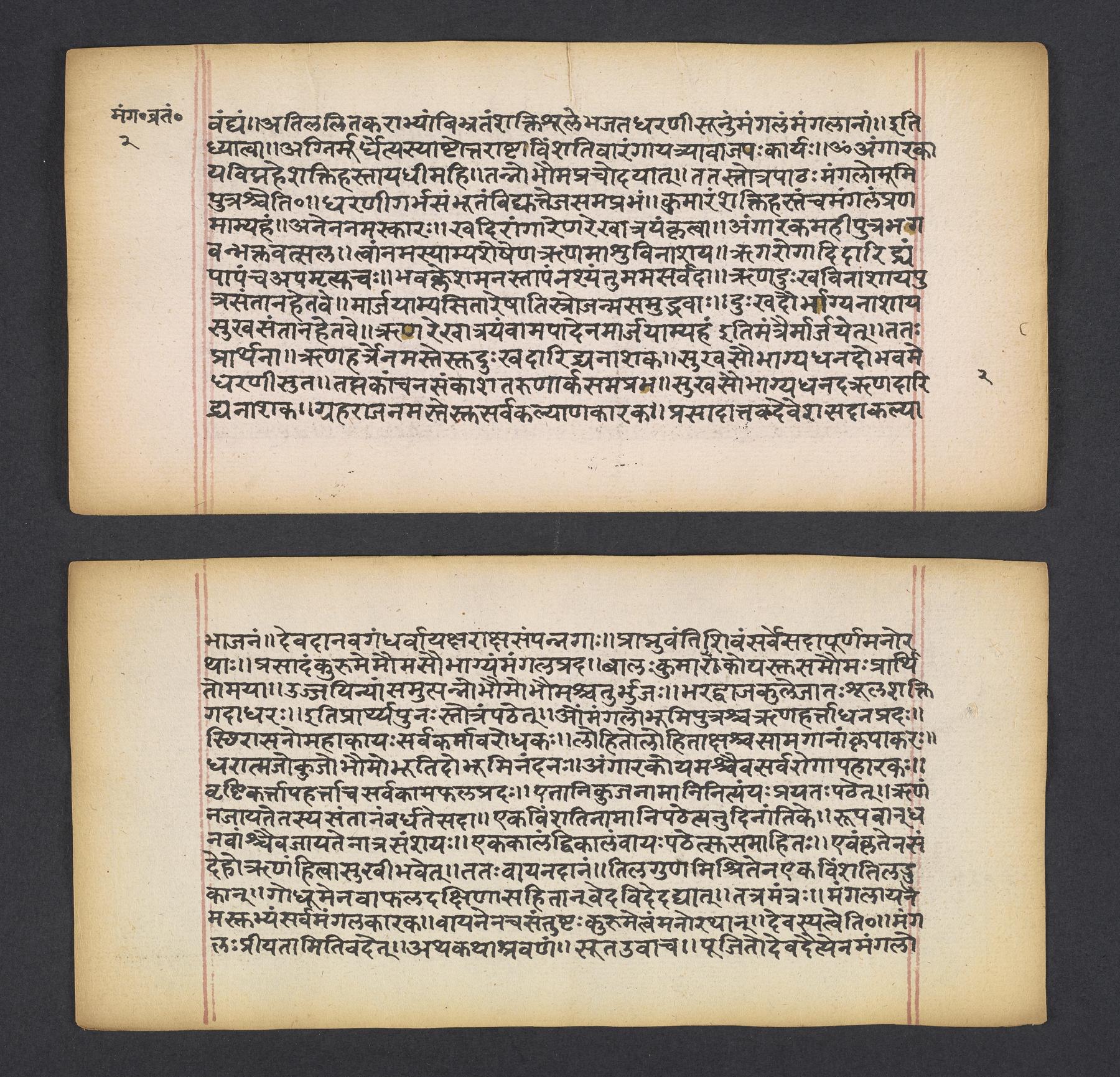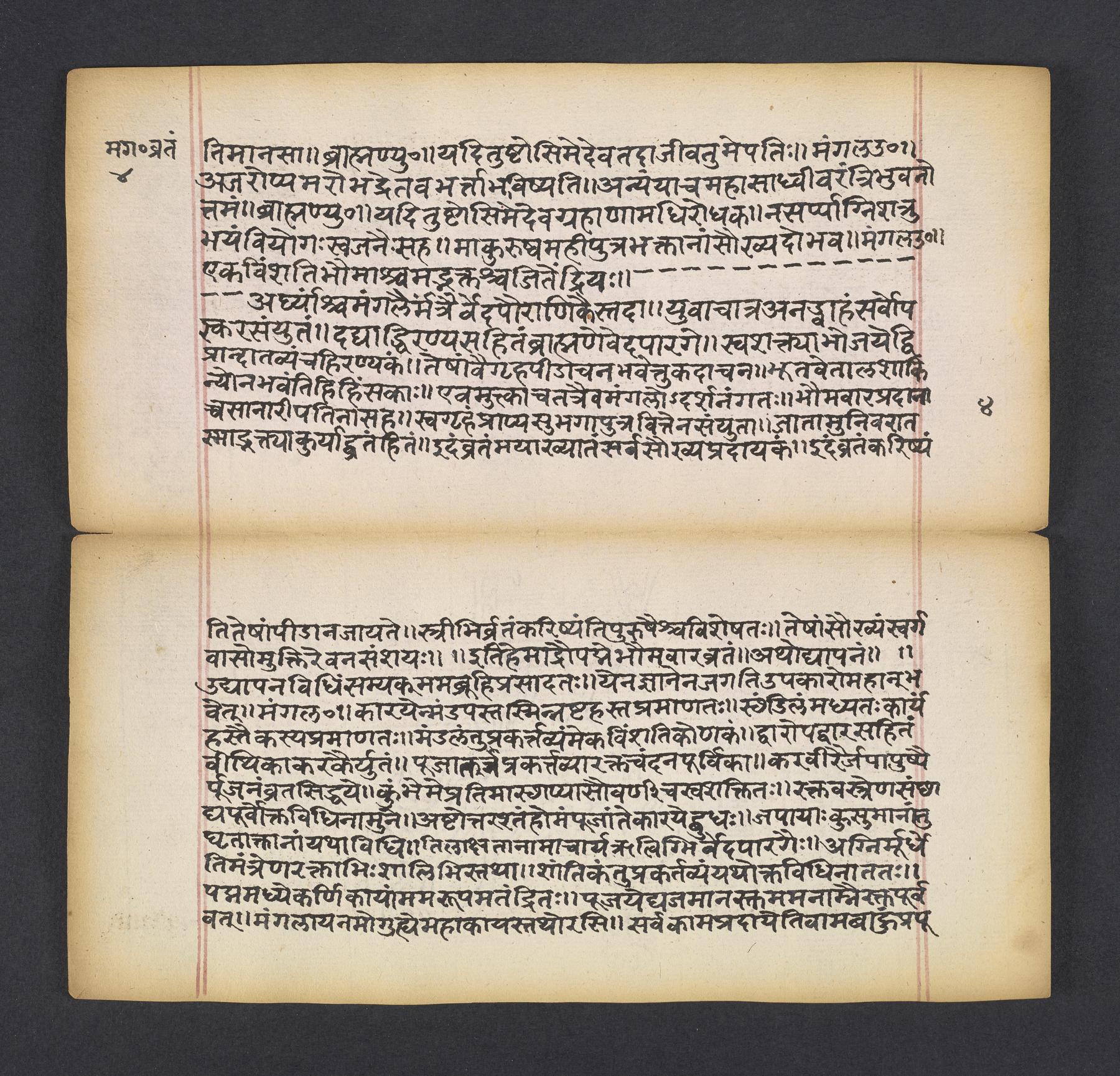 Manuscript is used as a kind of manual or handbook for consultation by a priest or household member (especially women) wanting to perform the rites, ceremonies, observances (vratas), and worship (pūjā) associated with this rite fasting. Usually performed on Tuesdays at the break of dawn for a variety of personal benefits and is usually held during the month of Śrāvaṇa (July/August). Contains numerous prayers and mantras to be recited.