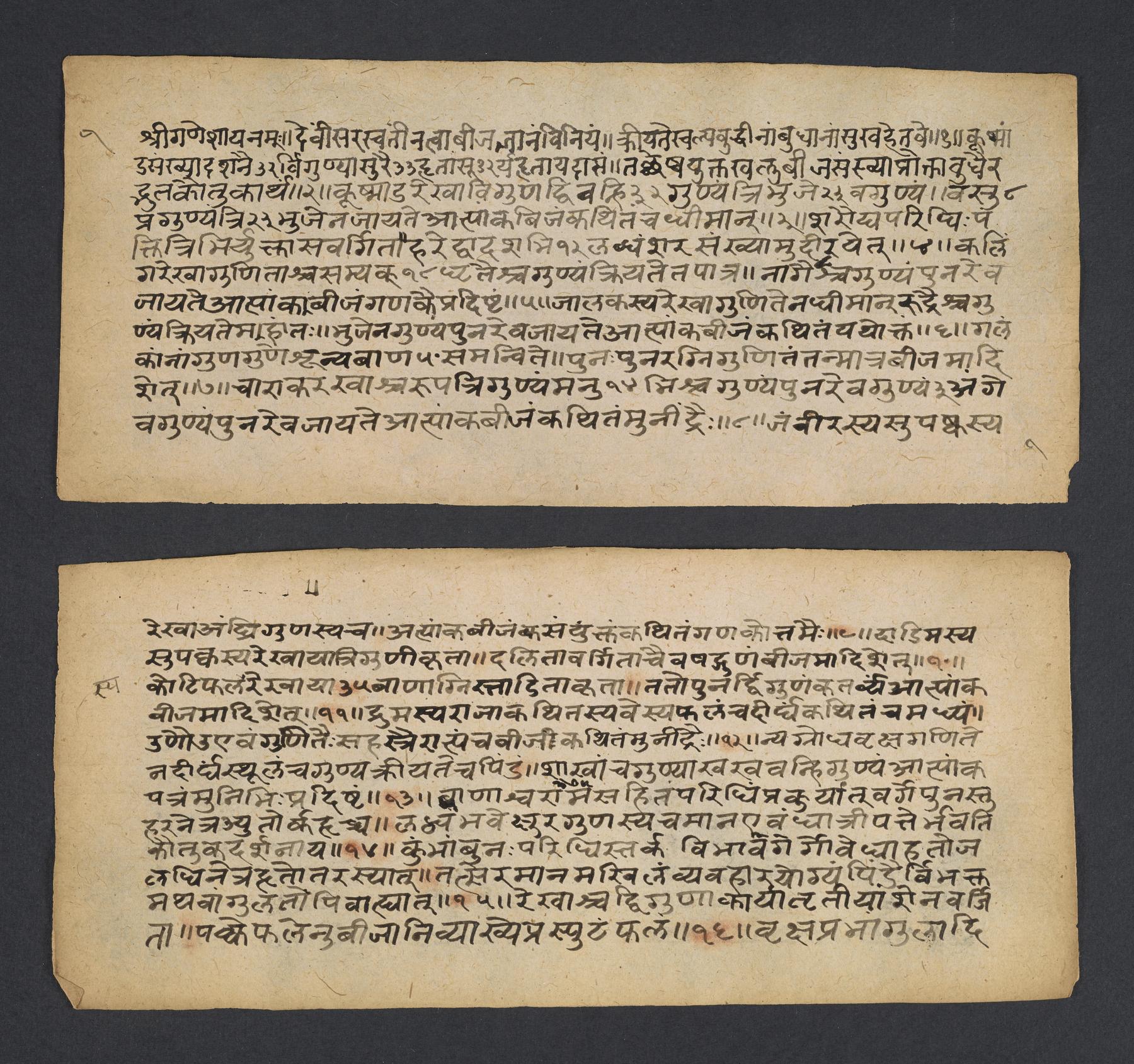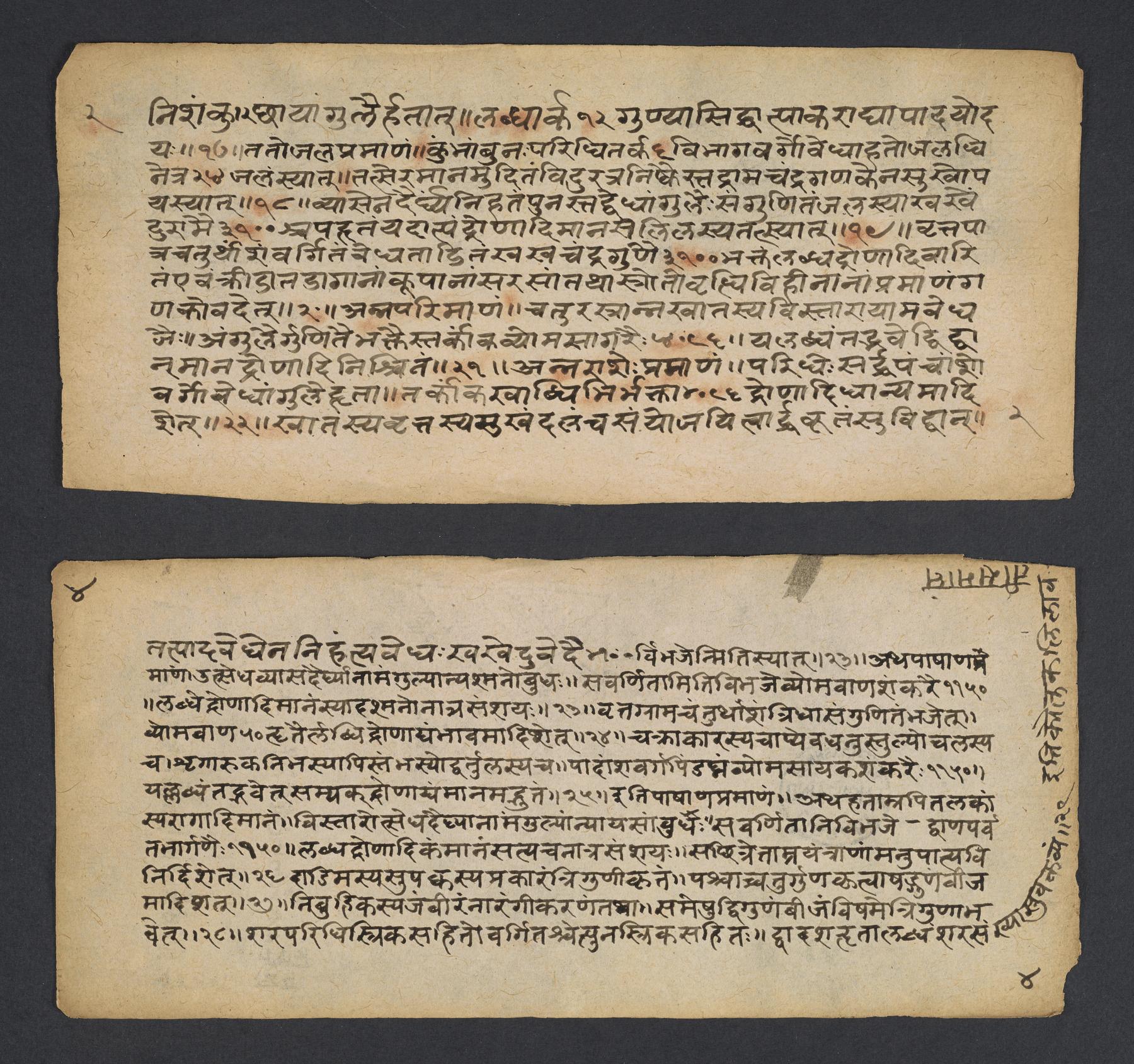 Manuscript used for contemplation and study and is a treatise from the Siddhāntaśiromaṇi, on astrology and mathematics as derived from planetary movements and used for predictions about a marriage ceremony. There is a small table drawn with diagonal lines with numbers and characters written inside of them as well as two columns with headings for candra and sūrya nakṣatras, that is, the constellations through which the moon and sun pass (f. 4v). Manuscript is incomplete.
