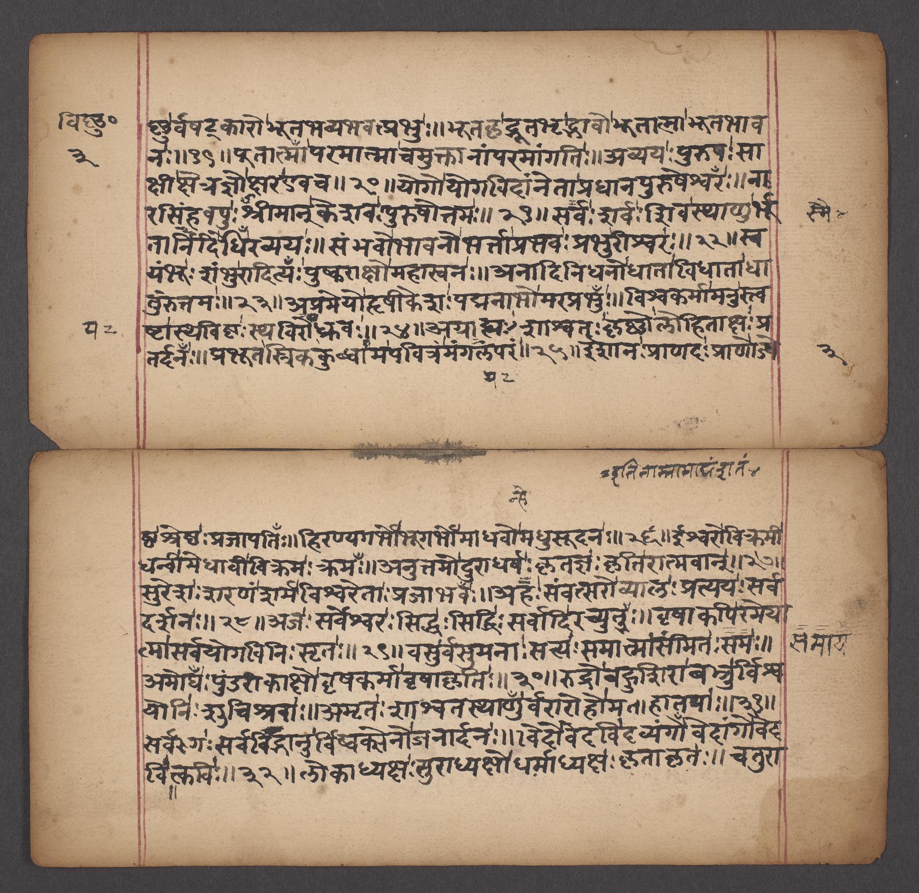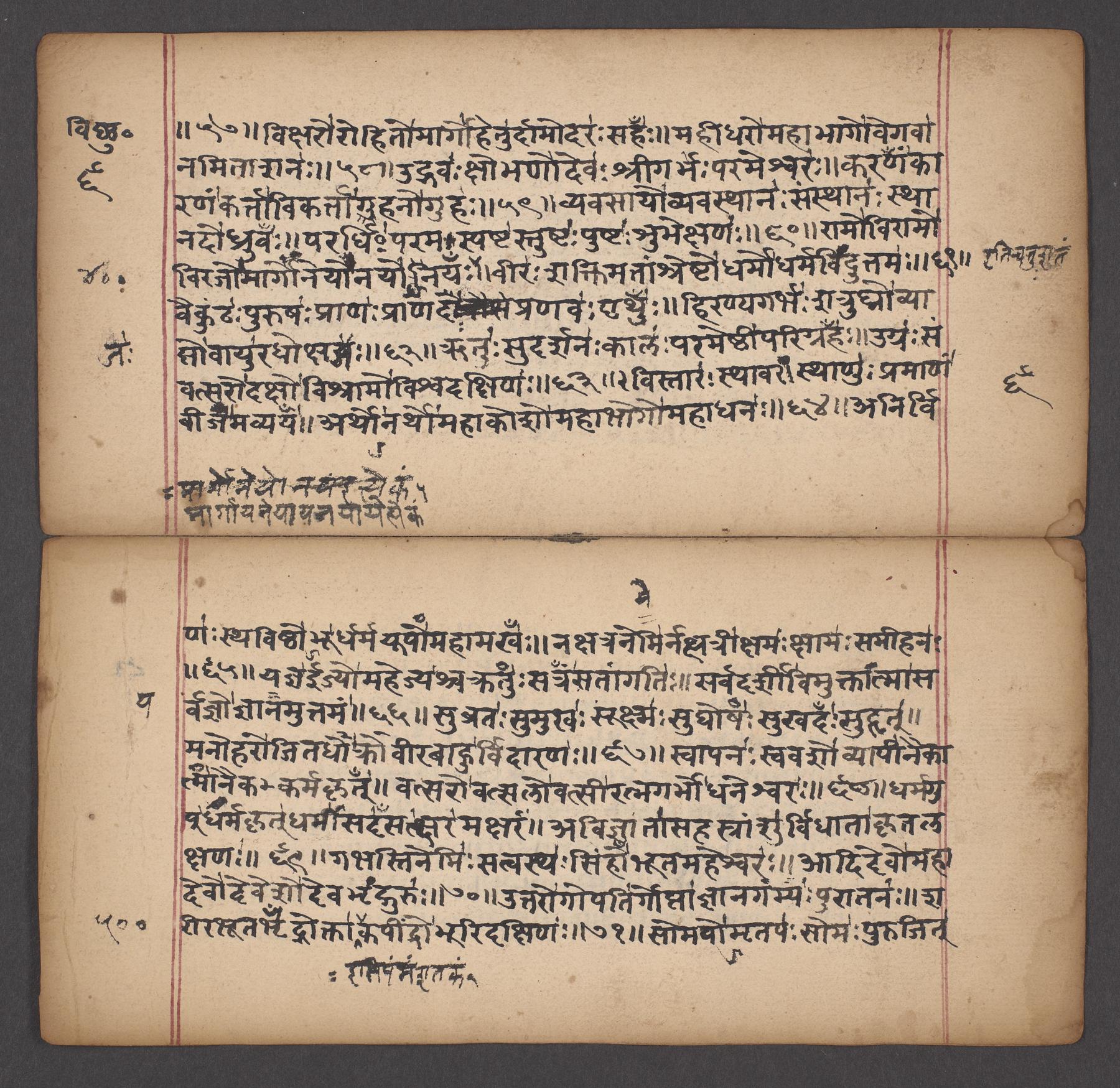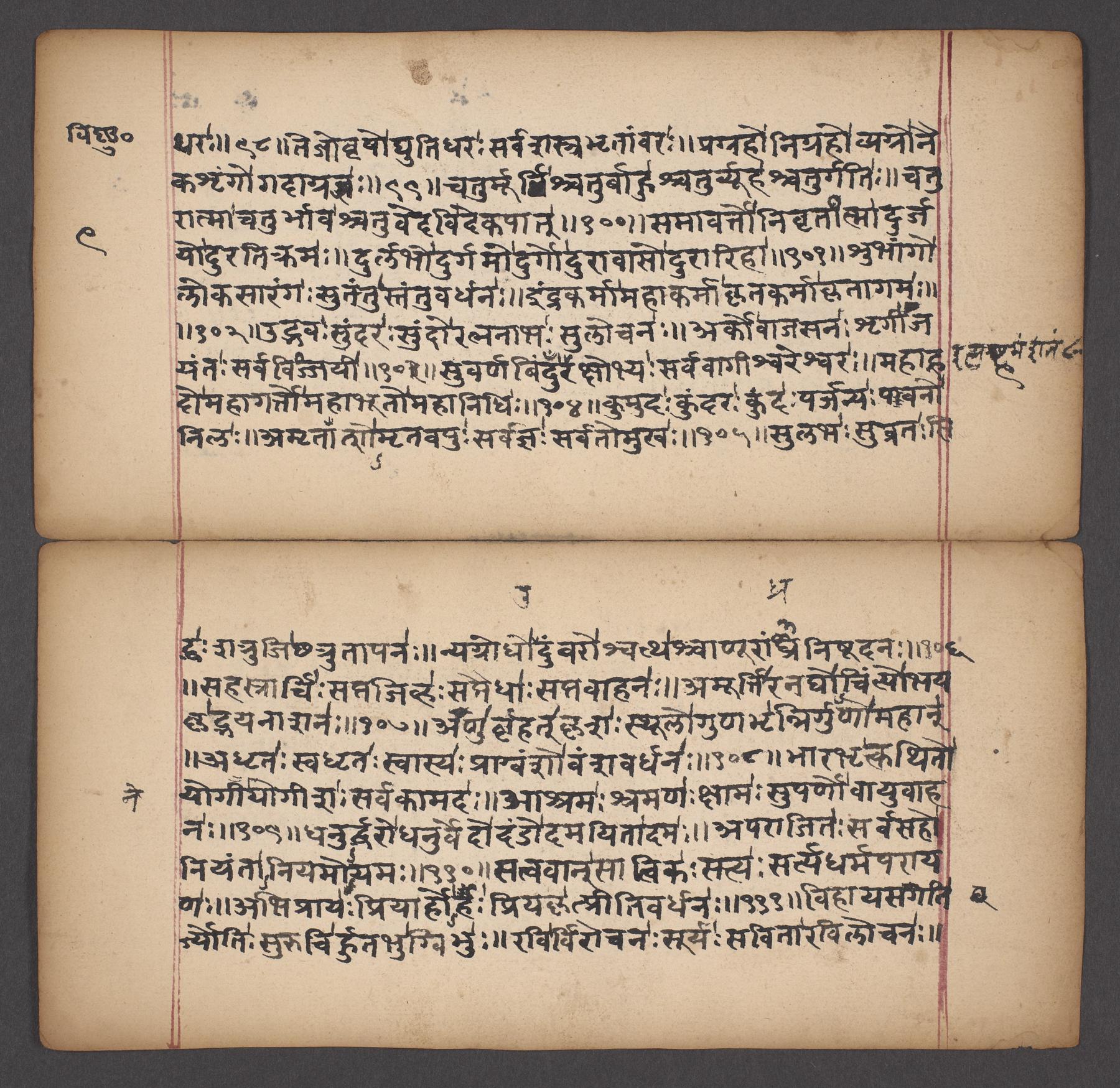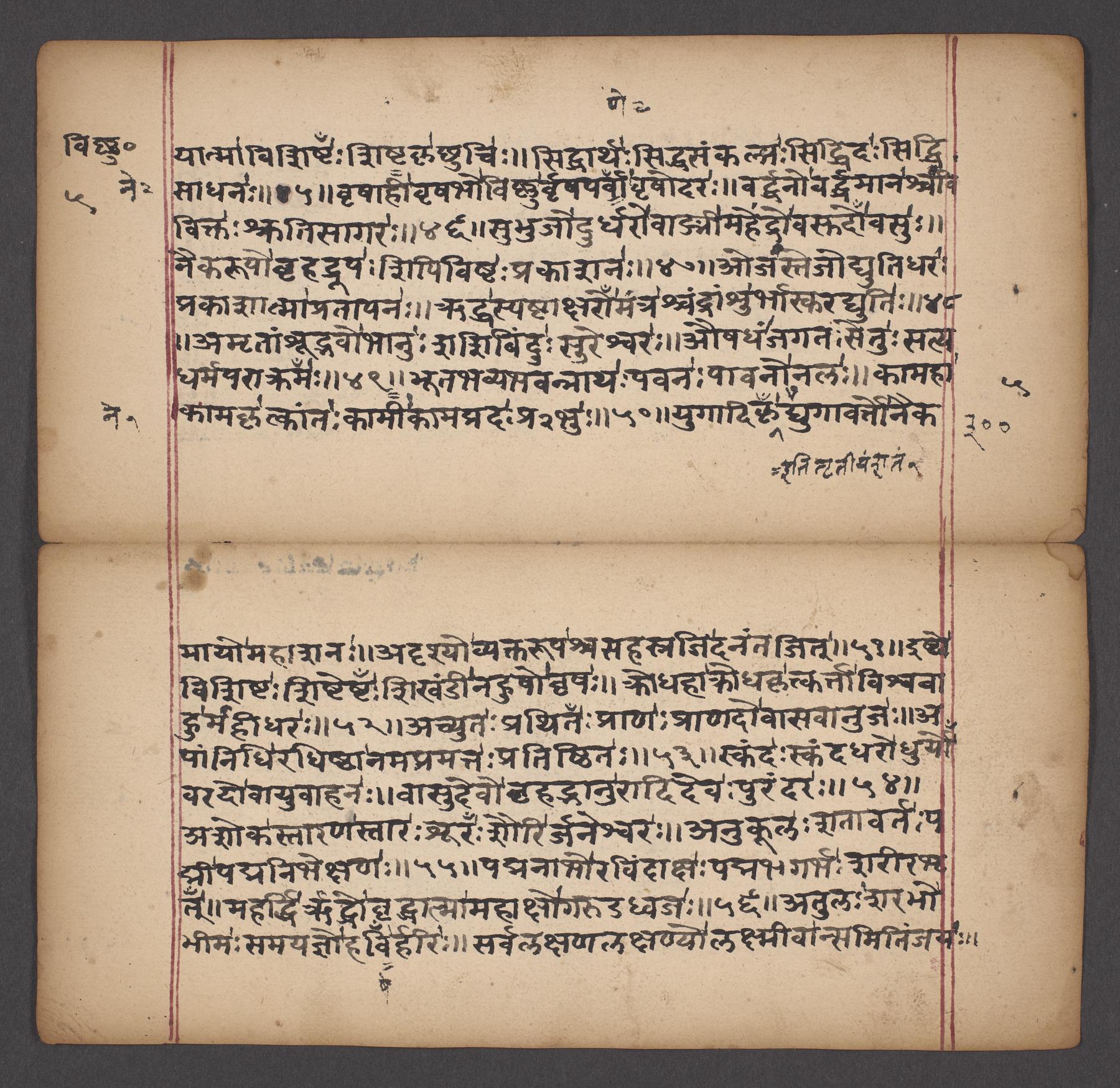 - These images and the content of Kislak Center for Special Collections, Rare Books and Manuscripts Ms. Coll. 390 Item 2239: Viṣṇusahasranāmastotra are free of known copyright restrictions and in the public domain. See the Creative Commons Public Domain Mark page for usage details, http://creativecommons.org/publicdomain/mark/1.0/.