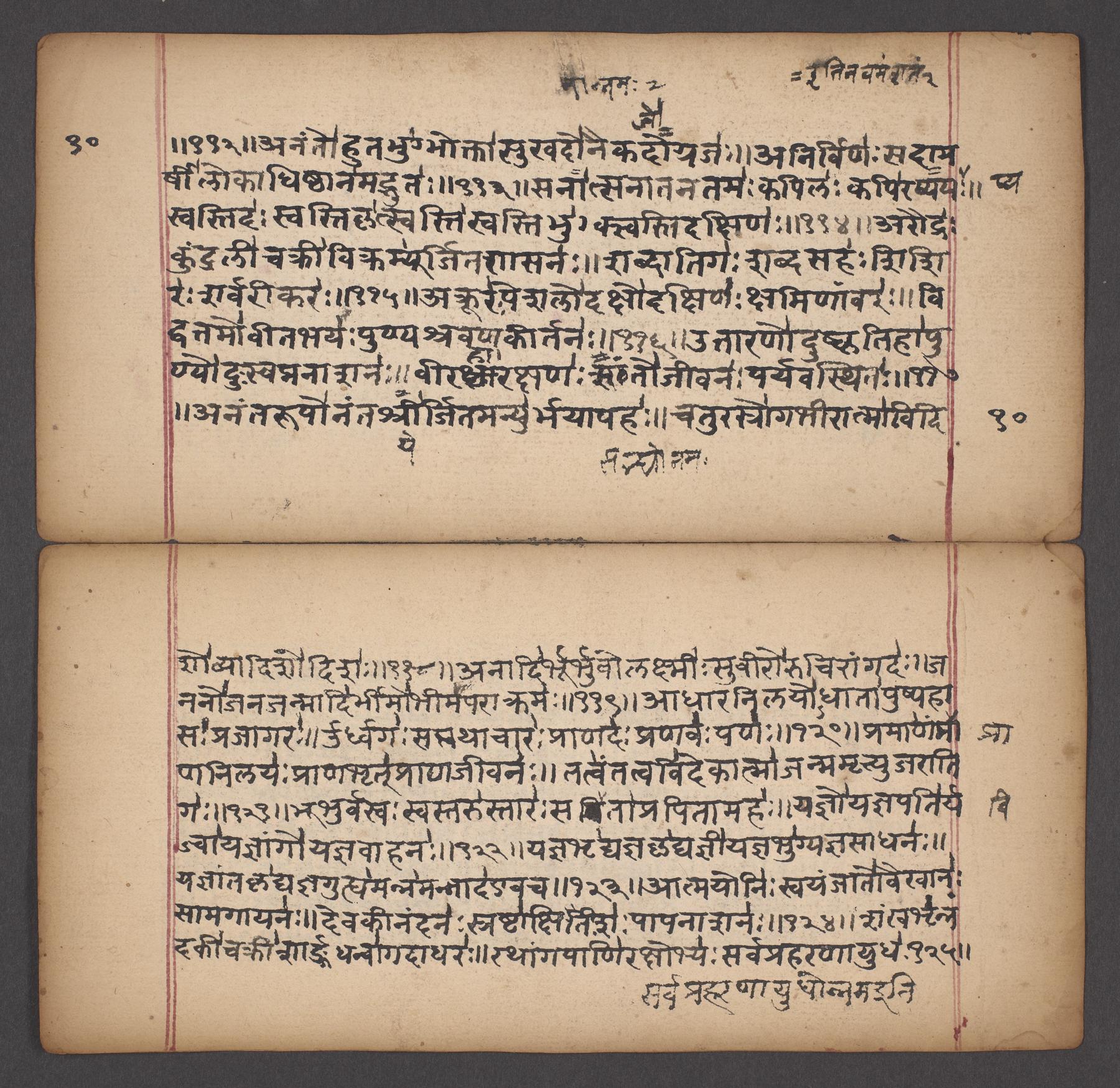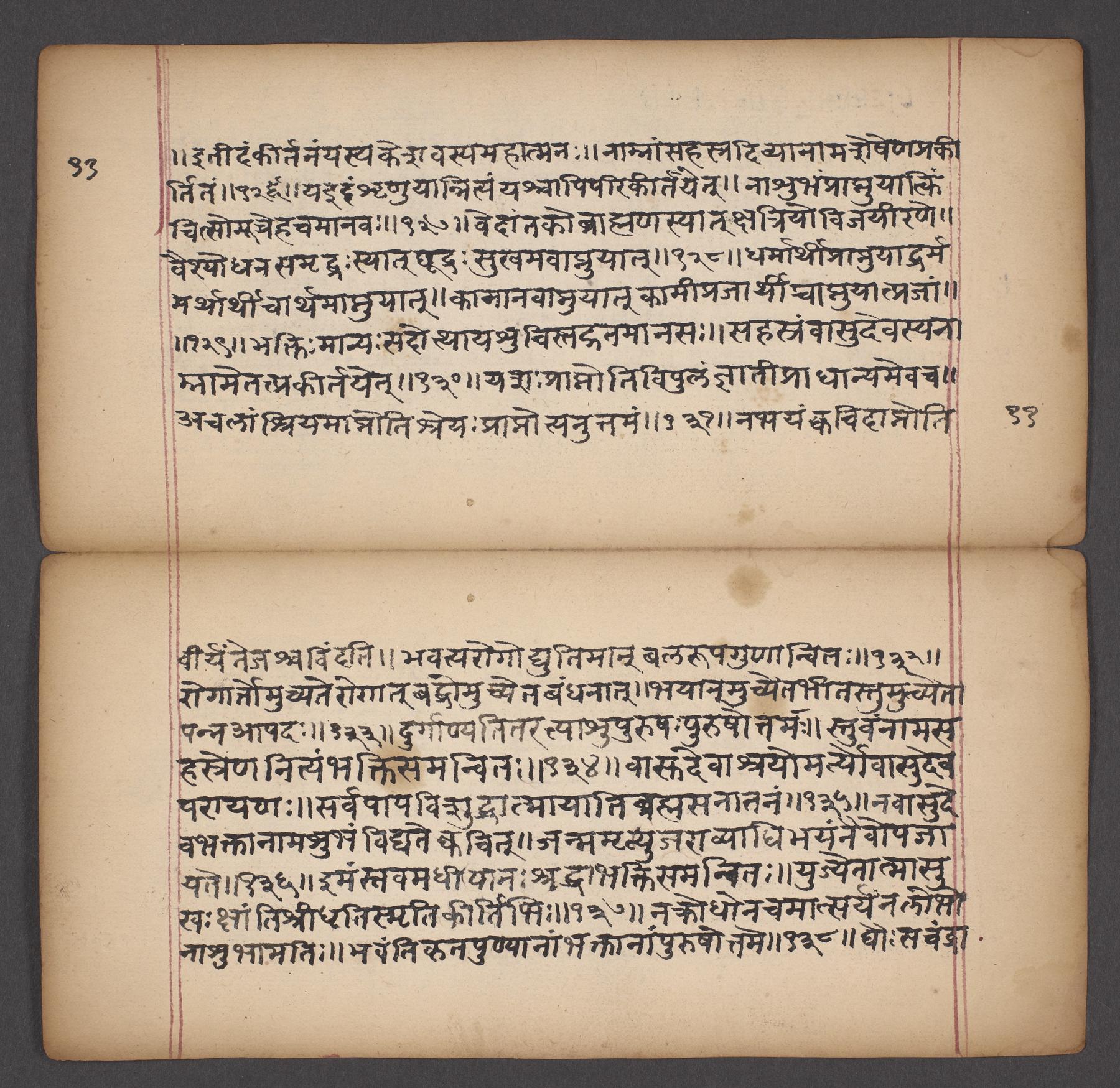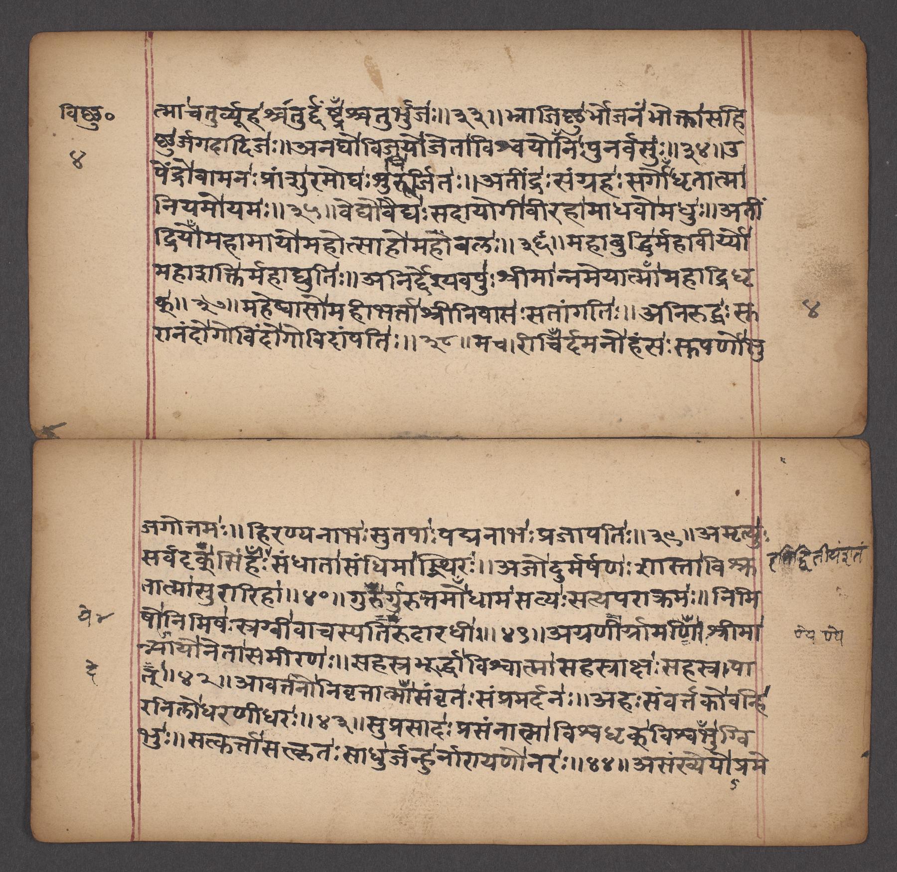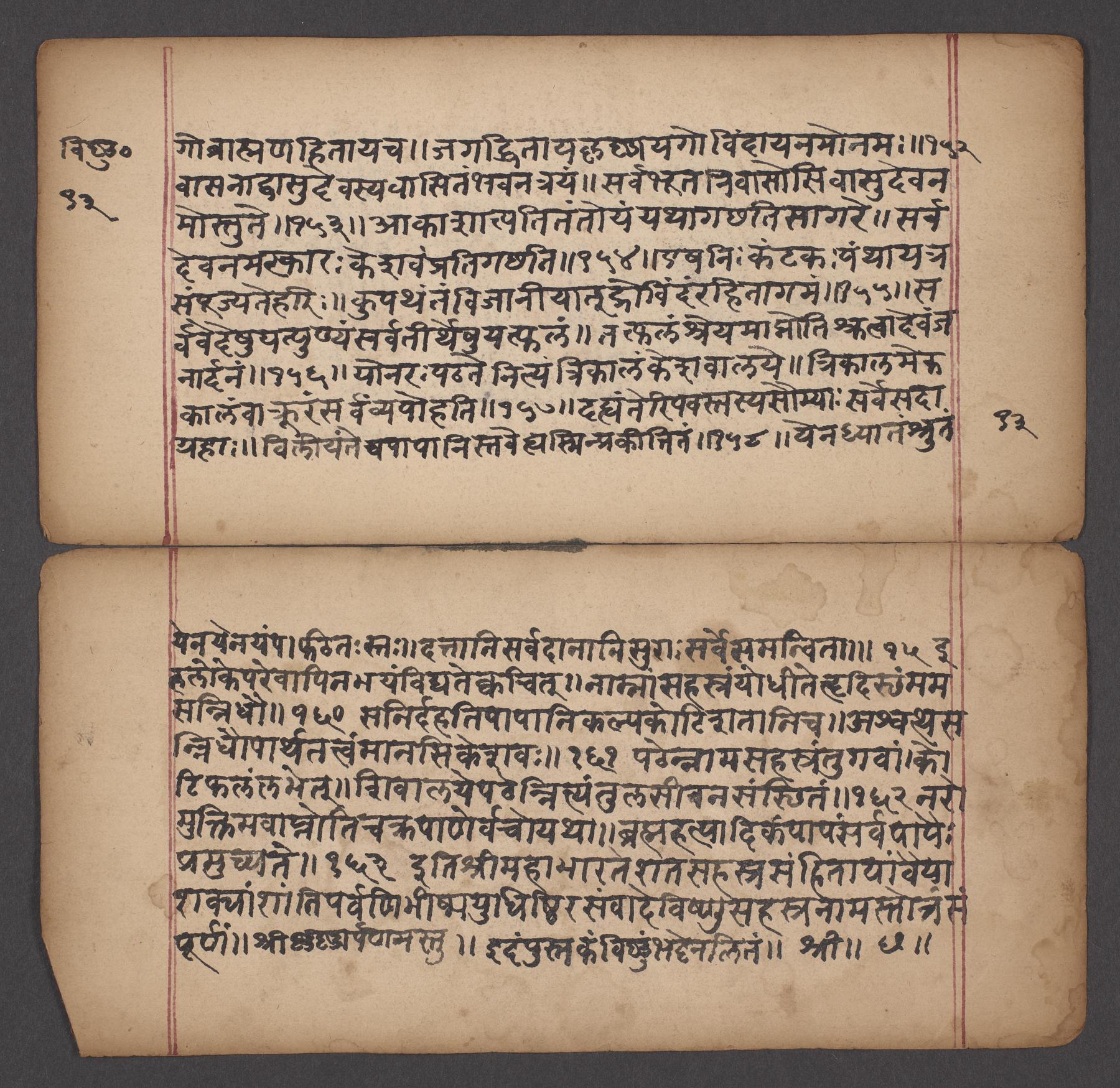 - These images and the content of Kislak Center for Special Collections, Rare Books and Manuscripts Ms. Coll. 390 Item 2239: Viṣṇusahasranāmastotra are free of known copyright restrictions and in the public domain. See the Creative Commons Public Domain Mark page for usage details, http://creativecommons.org/publicdomain/mark/1.0/.