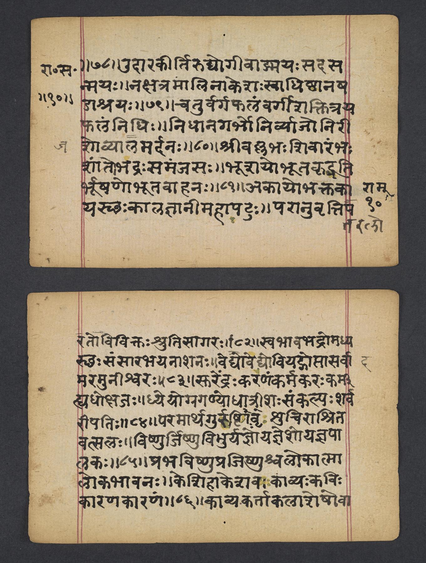 Small manuscript used in private or public recitation and prayer, praising and worshiping (pūjā) the Hindu deity Rāma and his one thousand names employing mantras. Presented in the form of a dialogue between the deities Maheśvara (a form of Śiva) and Umā (a form of the goddess Pārvatī).