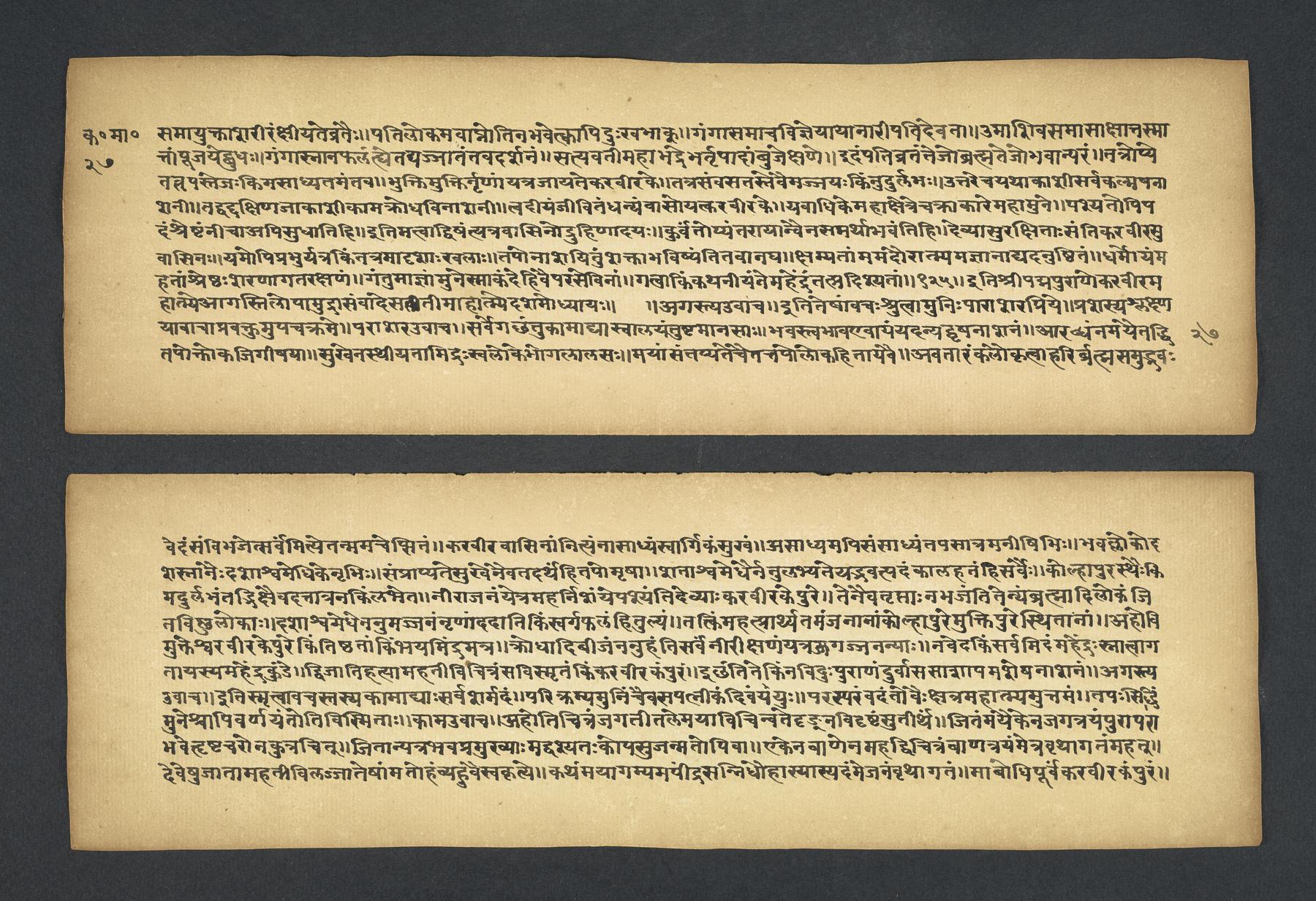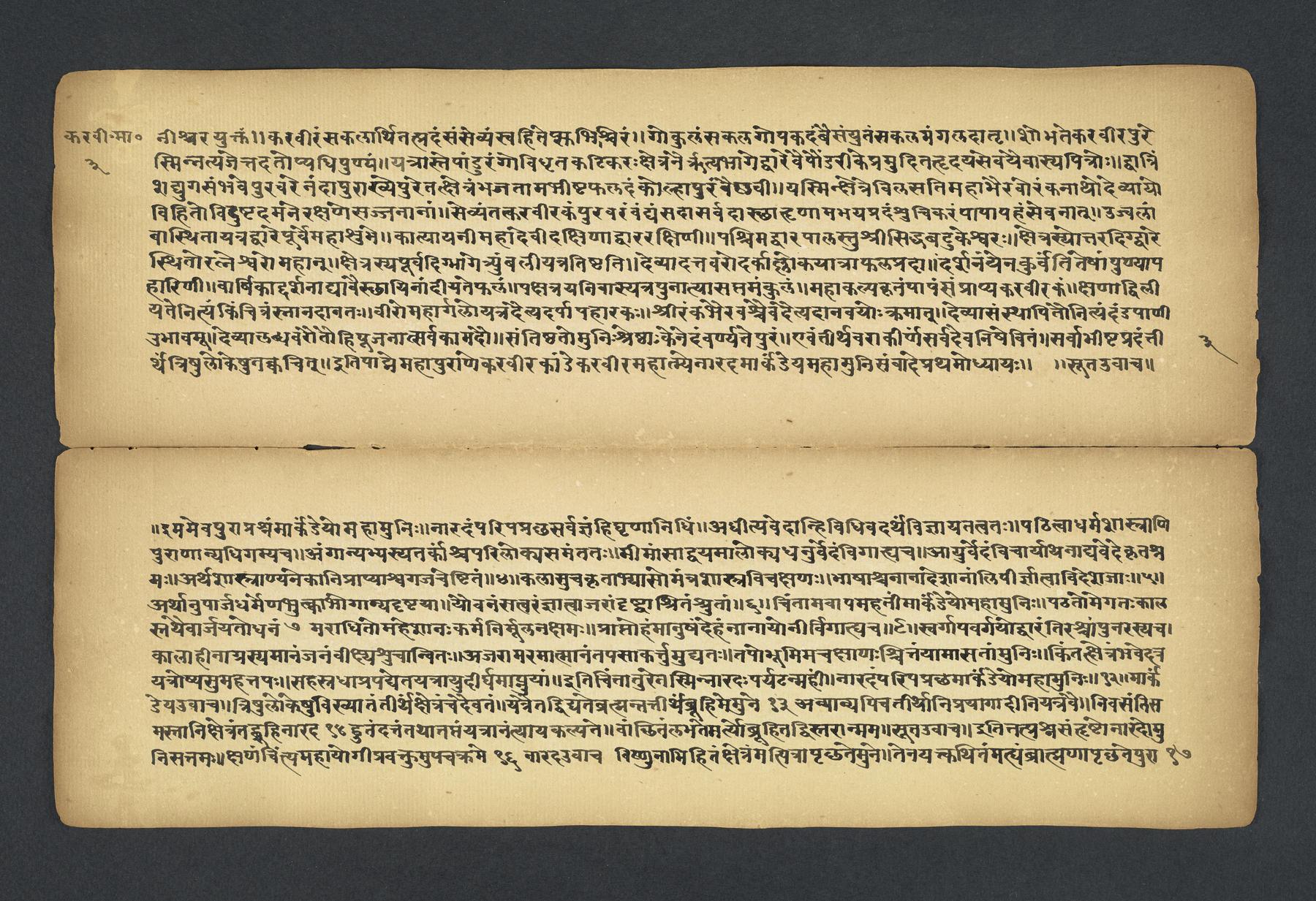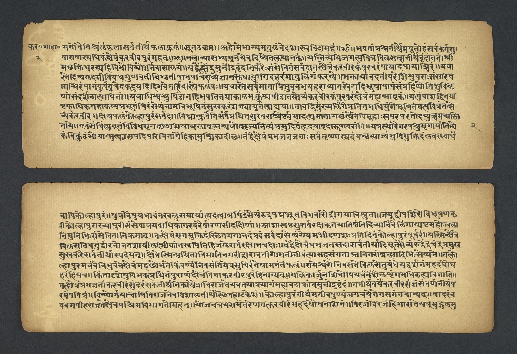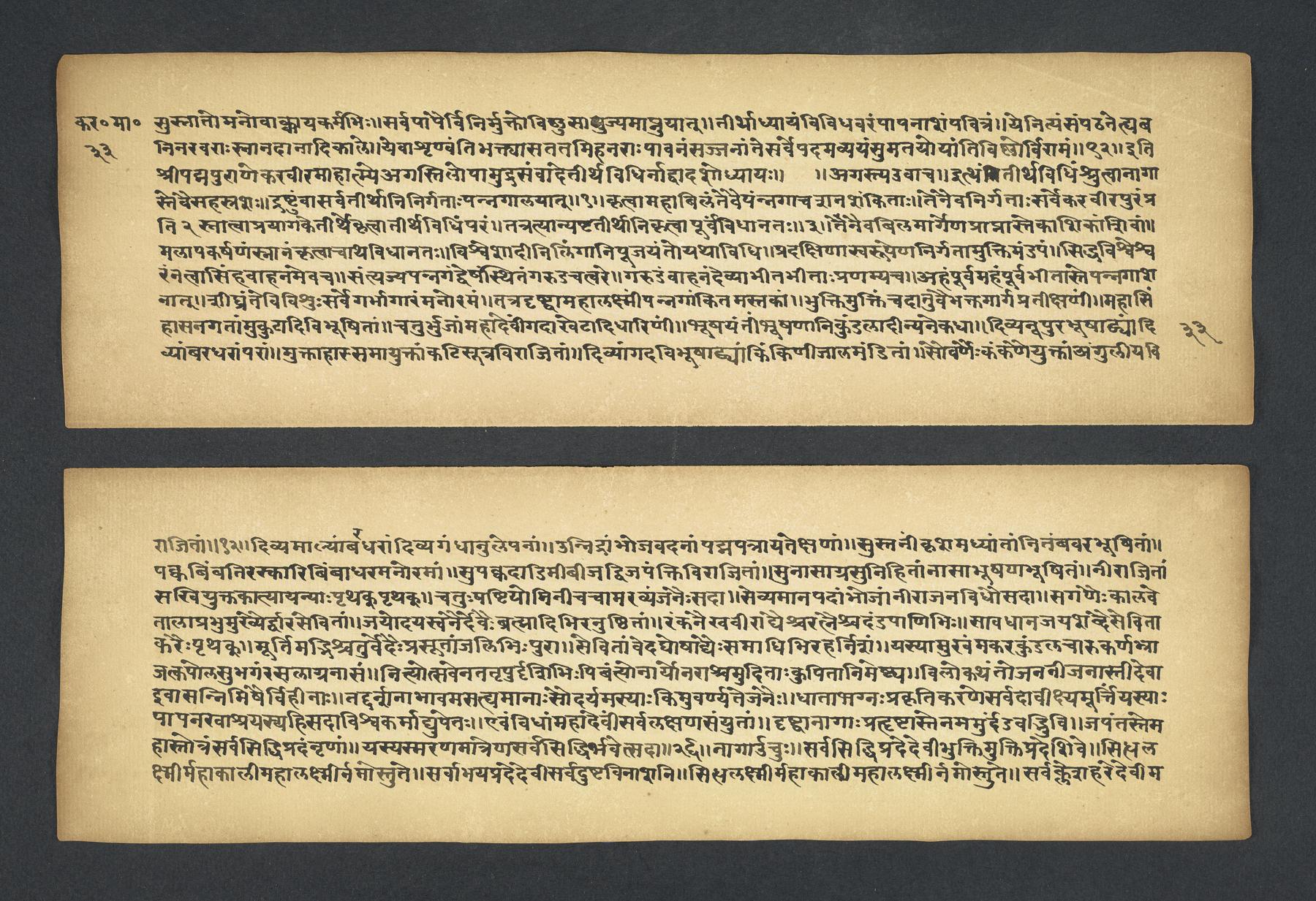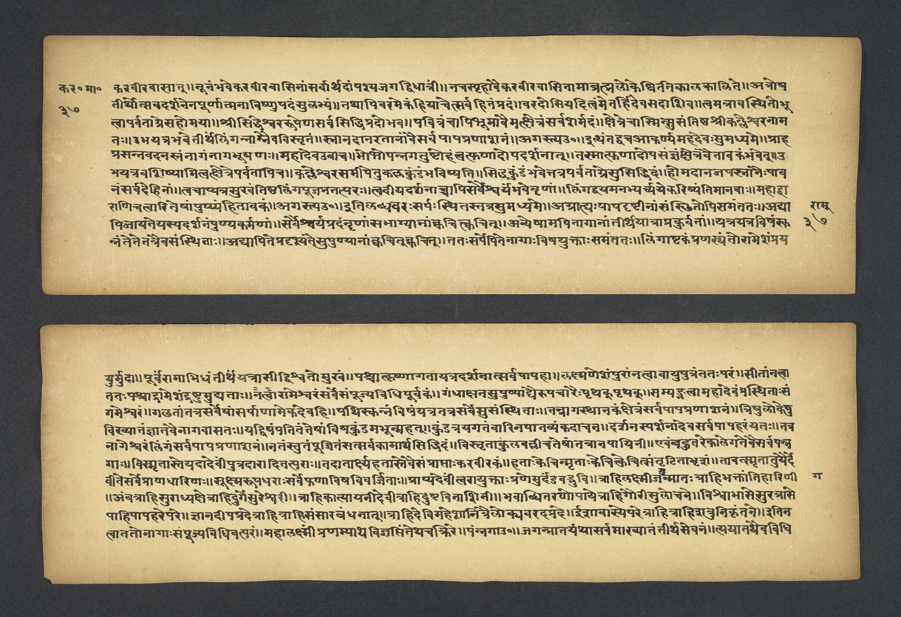 Praises the pilgrimage center of Karavīra, related to the modern city of Kolhapur in Maharashtra (India), suggesting that it surpasses even the famous center of Vārāṇasī. Especially praises the Hindu goddess Lakṣmī and mentions regional deities such as Pāṇḍuraṅga, a youthful god sometimes equated with Kṛṣṇa and well known in Maharashtra. Presented as a discussion between the legendary sage Agasti and his wife Lopāmudrā. Text is incomplete containing full chapters from 1-19 (f. 1v-49r) and ending in chapter 20 with: jāpyate paśavaṃputrādha (f. 58r).