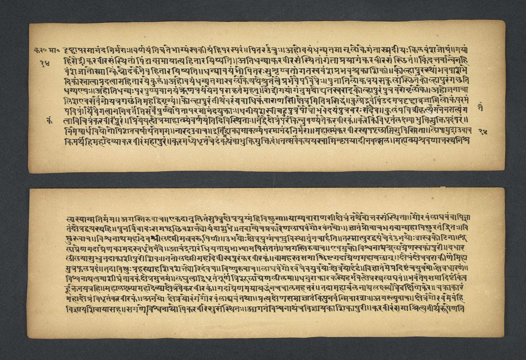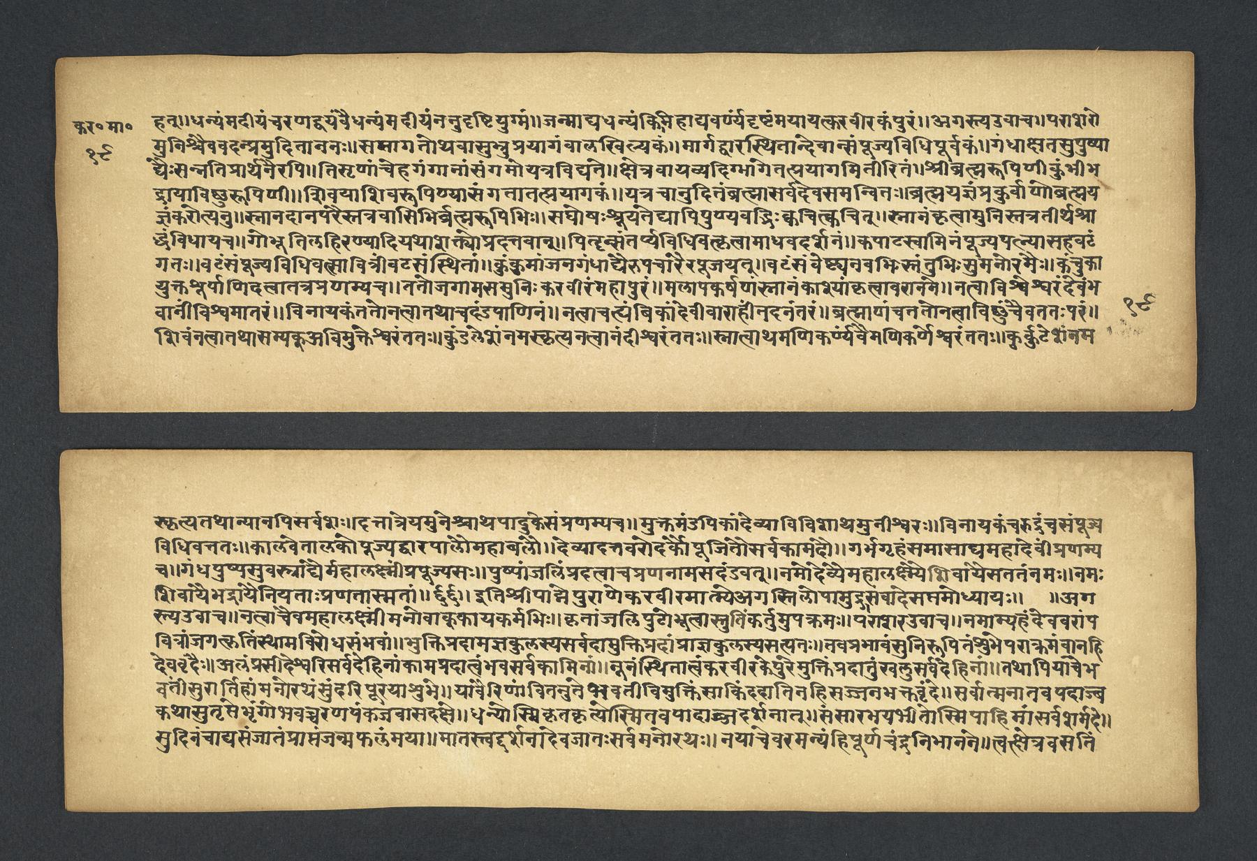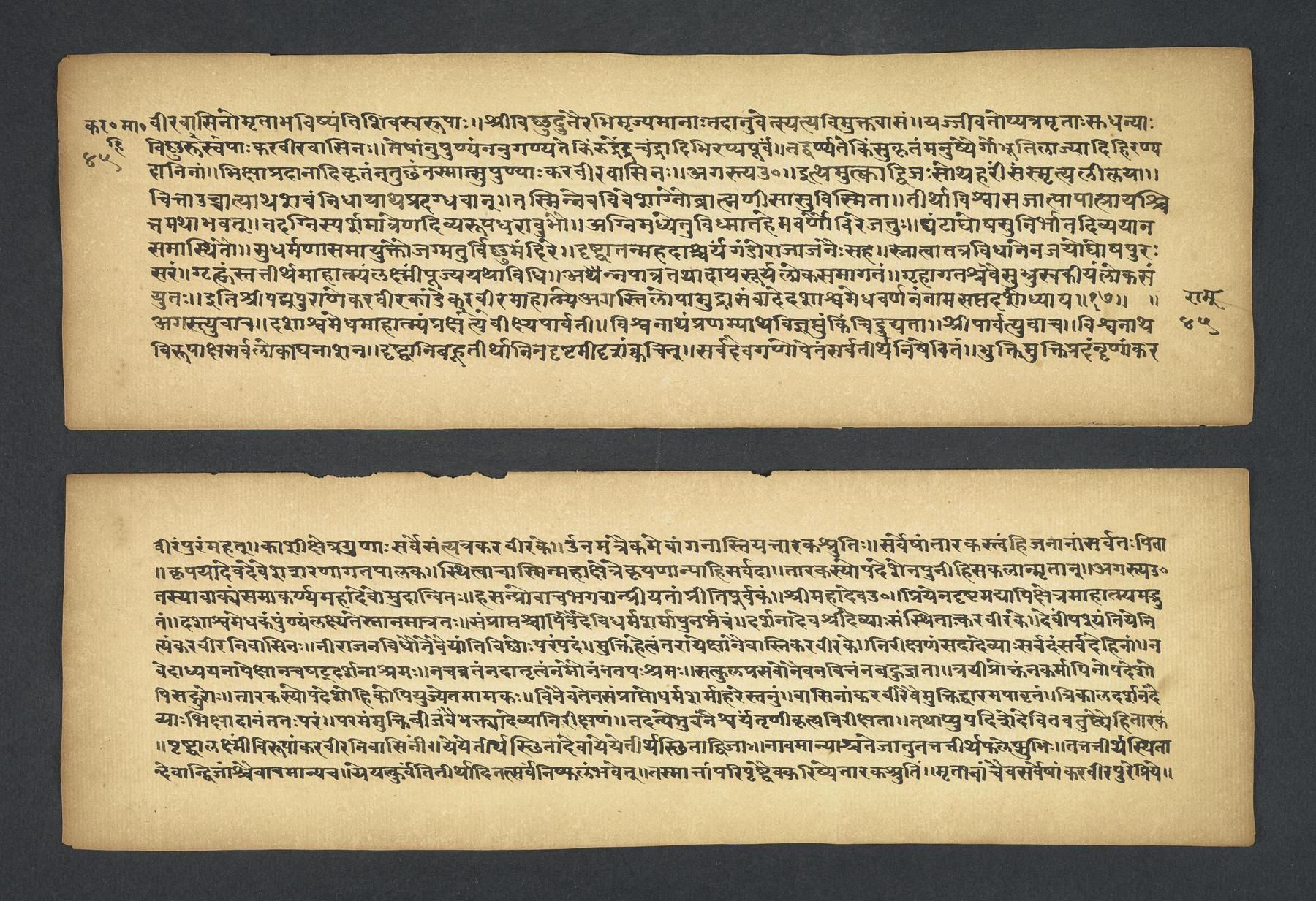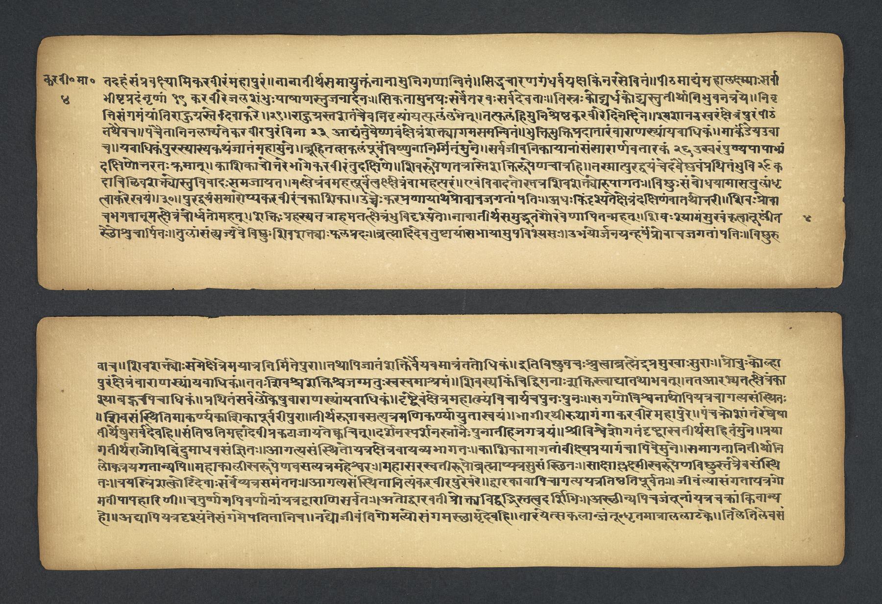 Praises the pilgrimage center of Karavīra, related to the modern city of Kolhapur in Maharashtra (India), suggesting that it surpasses even the famous center of Vārāṇasī. Especially praises the Hindu goddess Lakṣmī and mentions regional deities such as Pāṇḍuraṅga, a youthful god sometimes equated with Kṛṣṇa and well known in Maharashtra. Presented as a discussion between the legendary sage Agasti and his wife Lopāmudrā. Text is incomplete containing full chapters from 1-19 (f. 1v-49r) and ending in chapter 20 with: jāpyate paśavaṃputrādha (f. 58r).