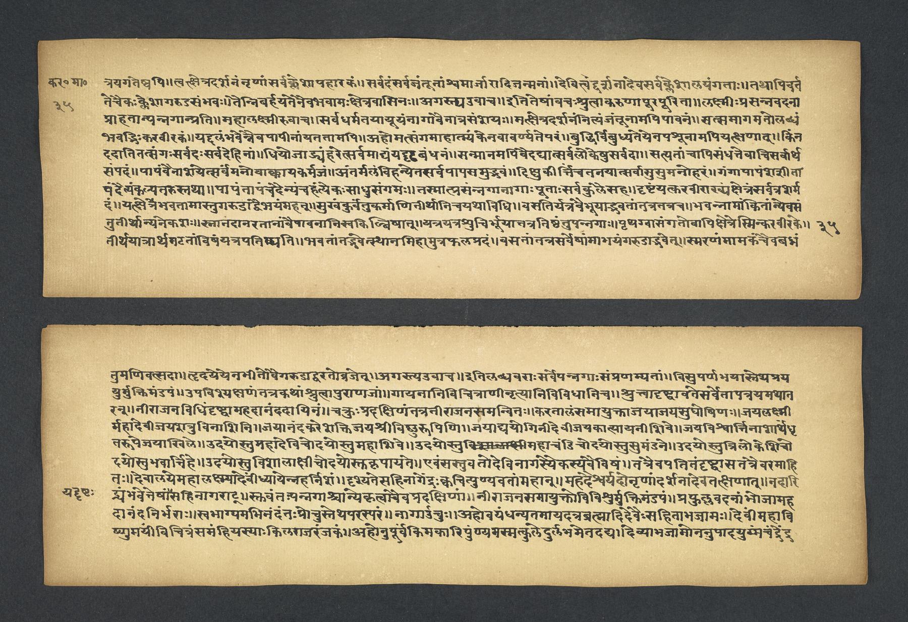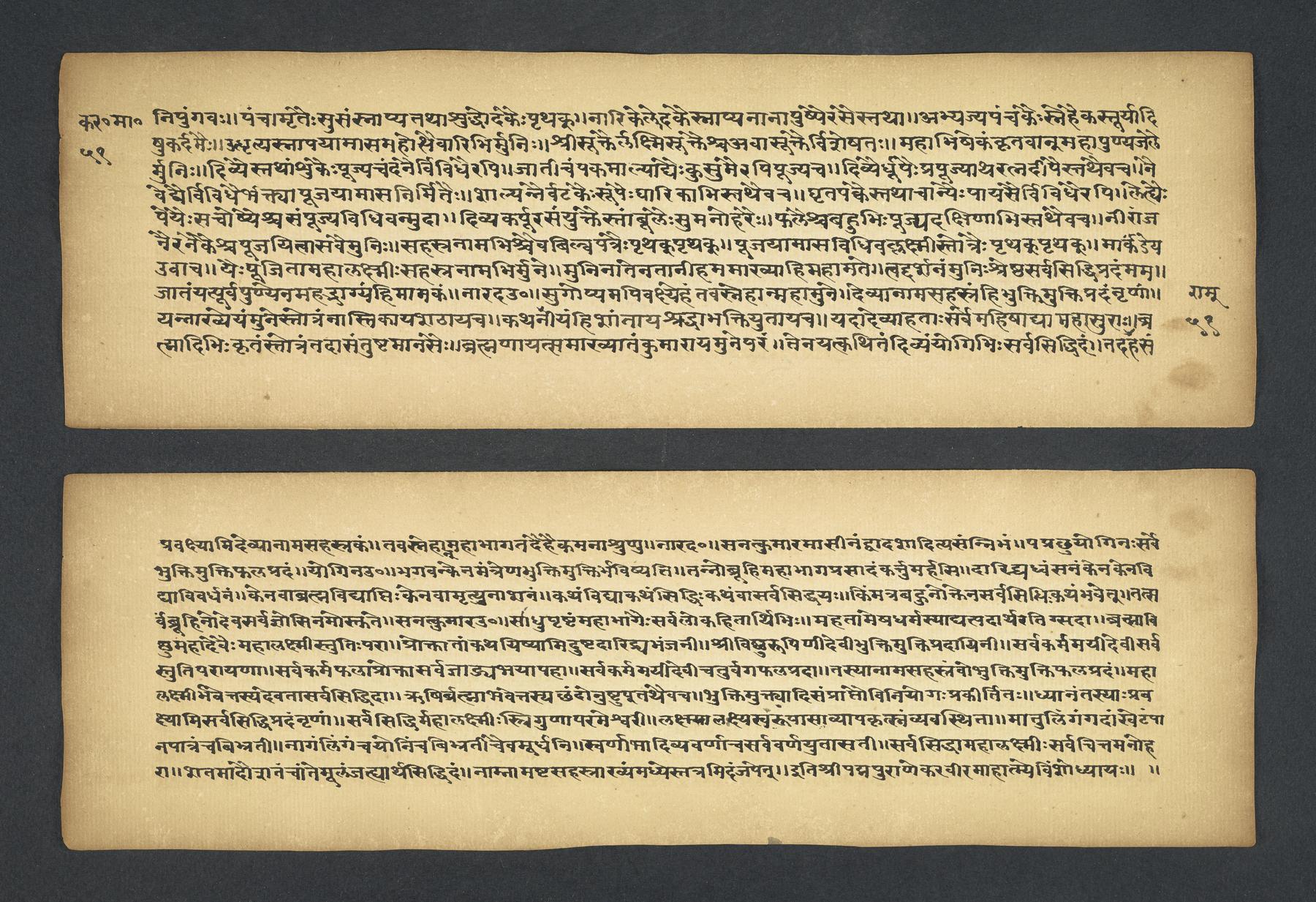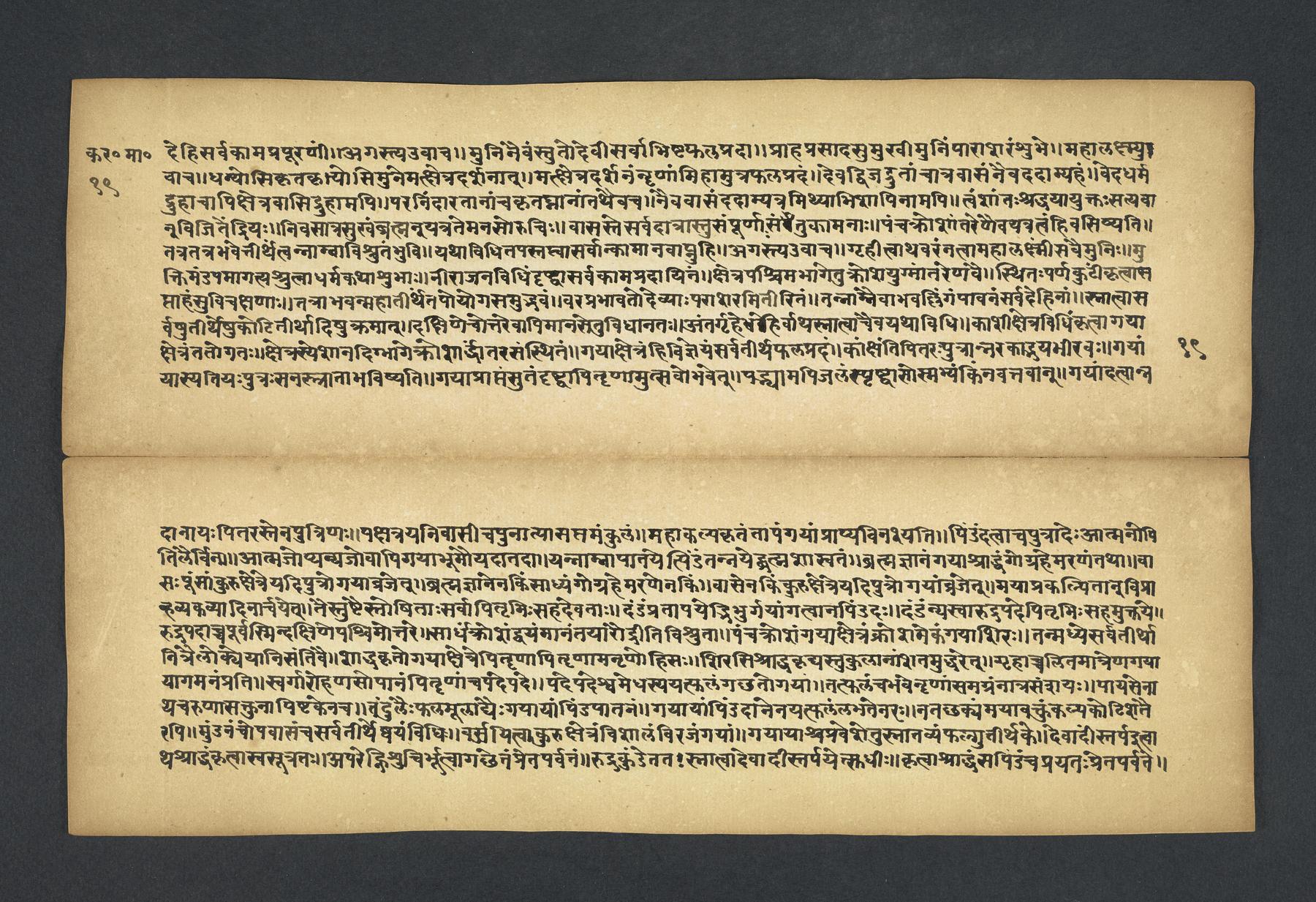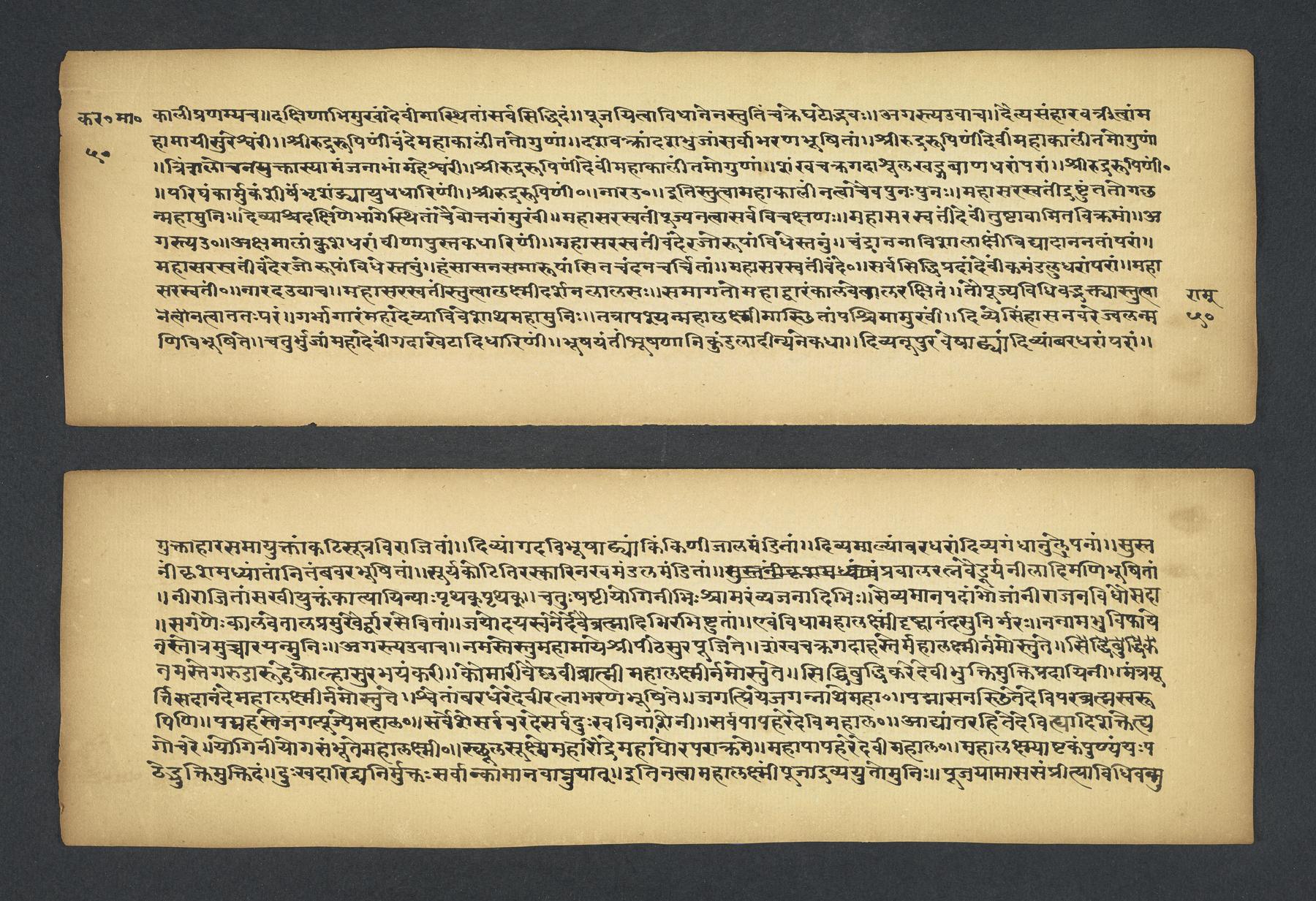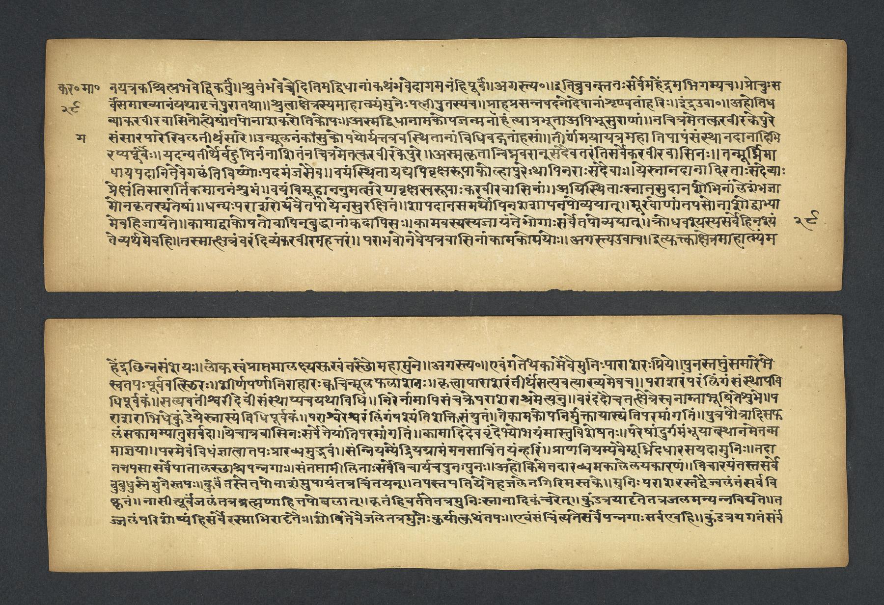 Praises the pilgrimage center of Karavīra, related to the modern city of Kolhapur in Maharashtra (India), suggesting that it surpasses even the famous center of Vārāṇasī. Especially praises the Hindu goddess Lakṣmī and mentions regional deities such as Pāṇḍuraṅga, a youthful god sometimes equated with Kṛṣṇa and well known in Maharashtra. Presented as a discussion between the legendary sage Agasti and his wife Lopāmudrā. Text is incomplete containing full chapters from 1-19 (f. 1v-49r) and ending in chapter 20 with: jāpyate paśavaṃputrādha (f. 58r).