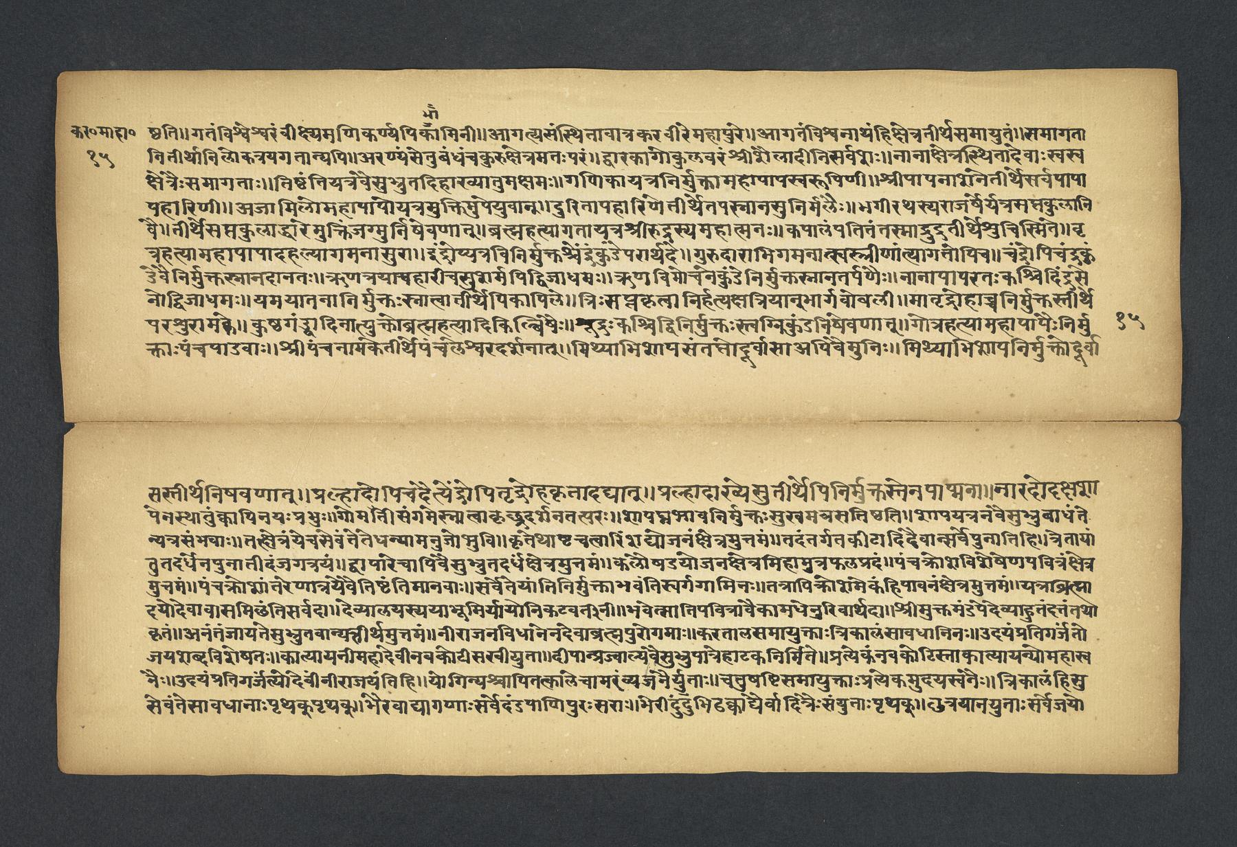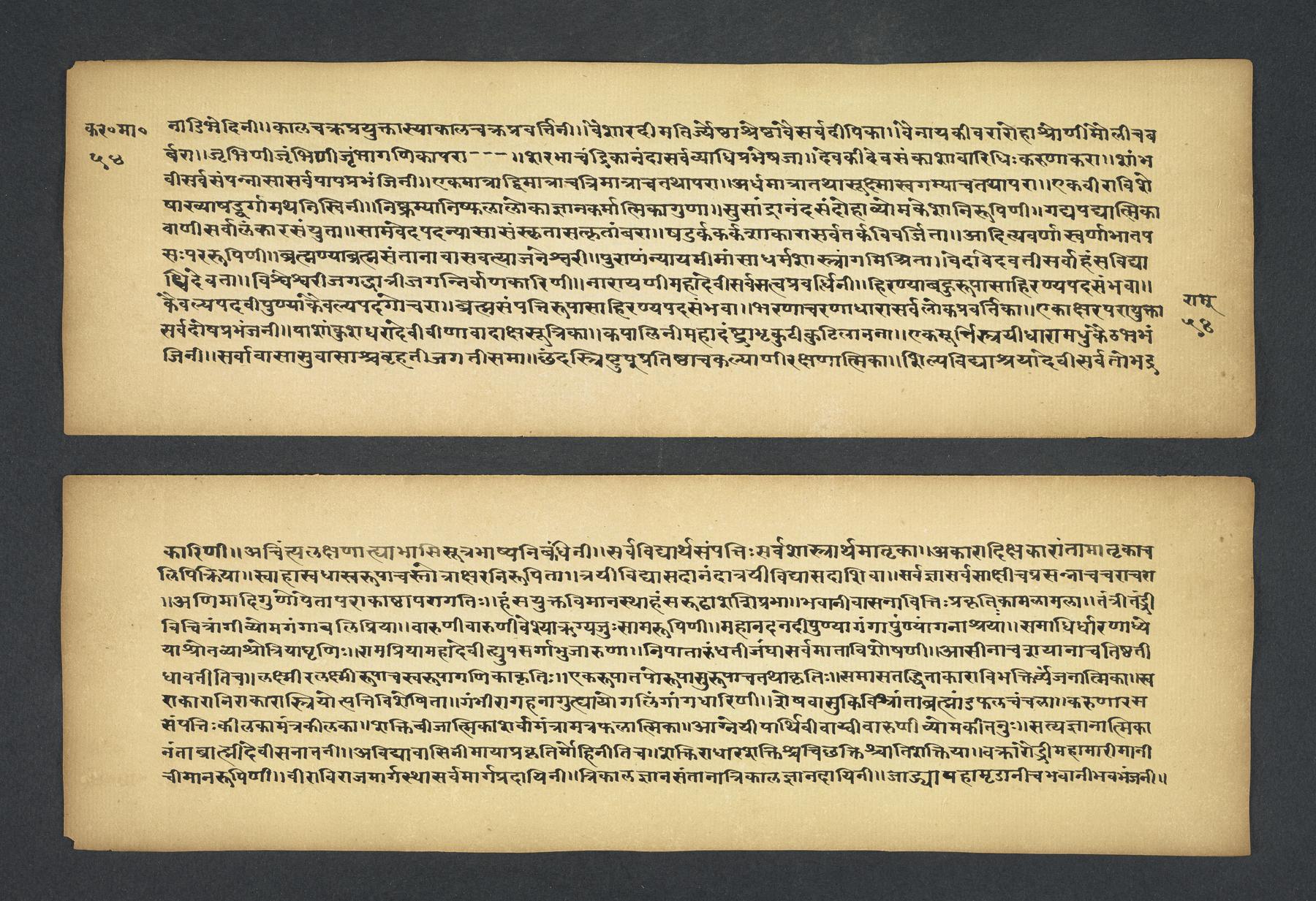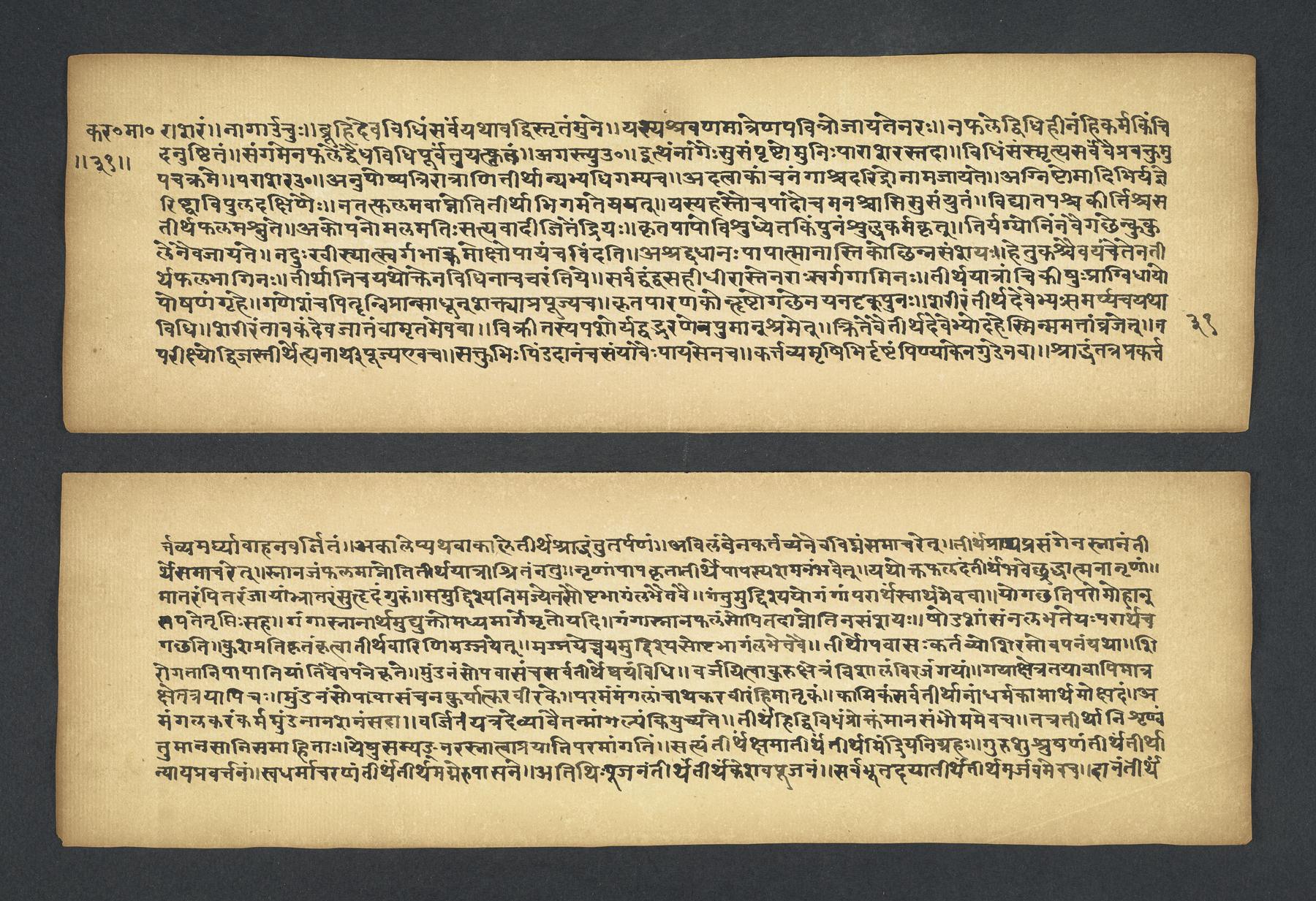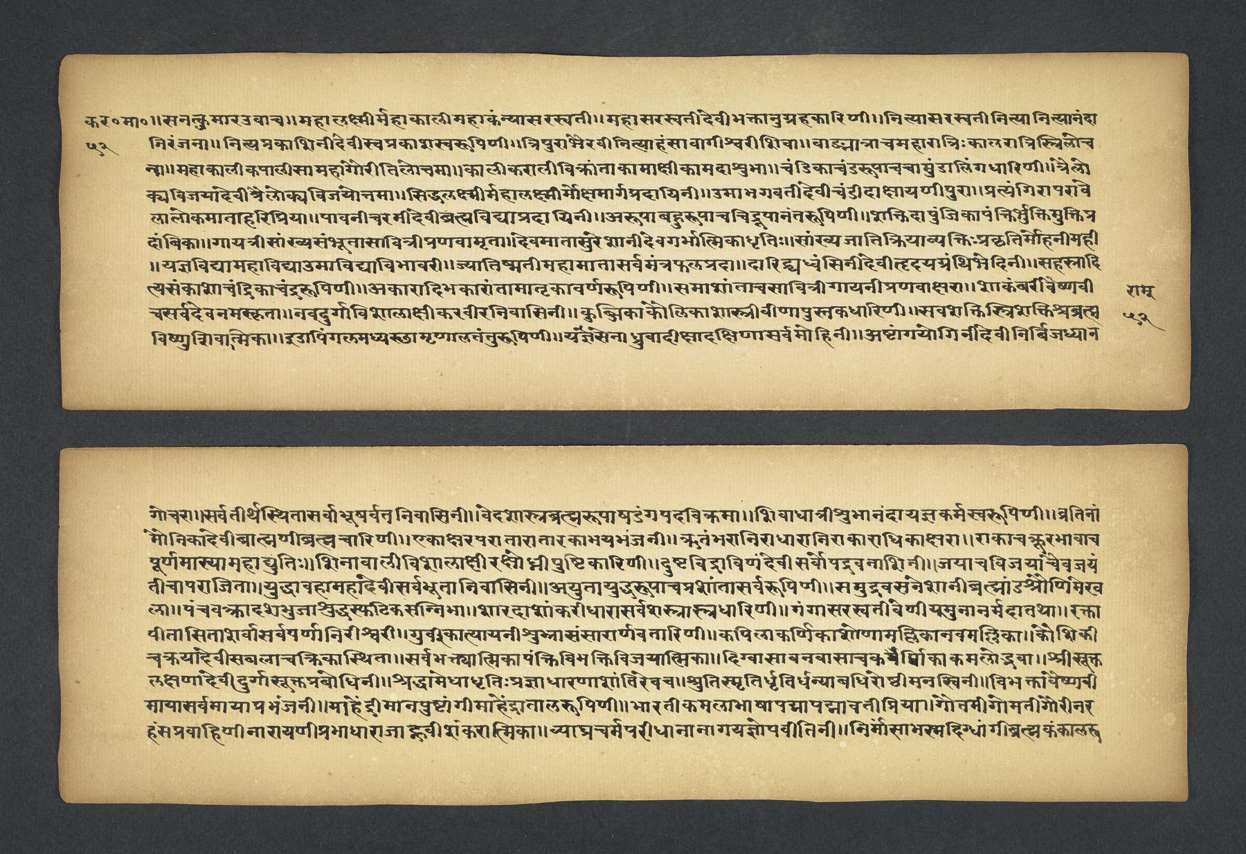 Praises the pilgrimage center of Karavīra, related to the modern city of Kolhapur in Maharashtra (India), suggesting that it surpasses even the famous center of Vārāṇasī. Especially praises the Hindu goddess Lakṣmī and mentions regional deities such as Pāṇḍuraṅga, a youthful god sometimes equated with Kṛṣṇa and well known in Maharashtra. Presented as a discussion between the legendary sage Agasti and his wife Lopāmudrā. Text is incomplete containing full chapters from 1-19 (f. 1v-49r) and ending in chapter 20 with: jāpyate paśavaṃputrādha (f. 58r).