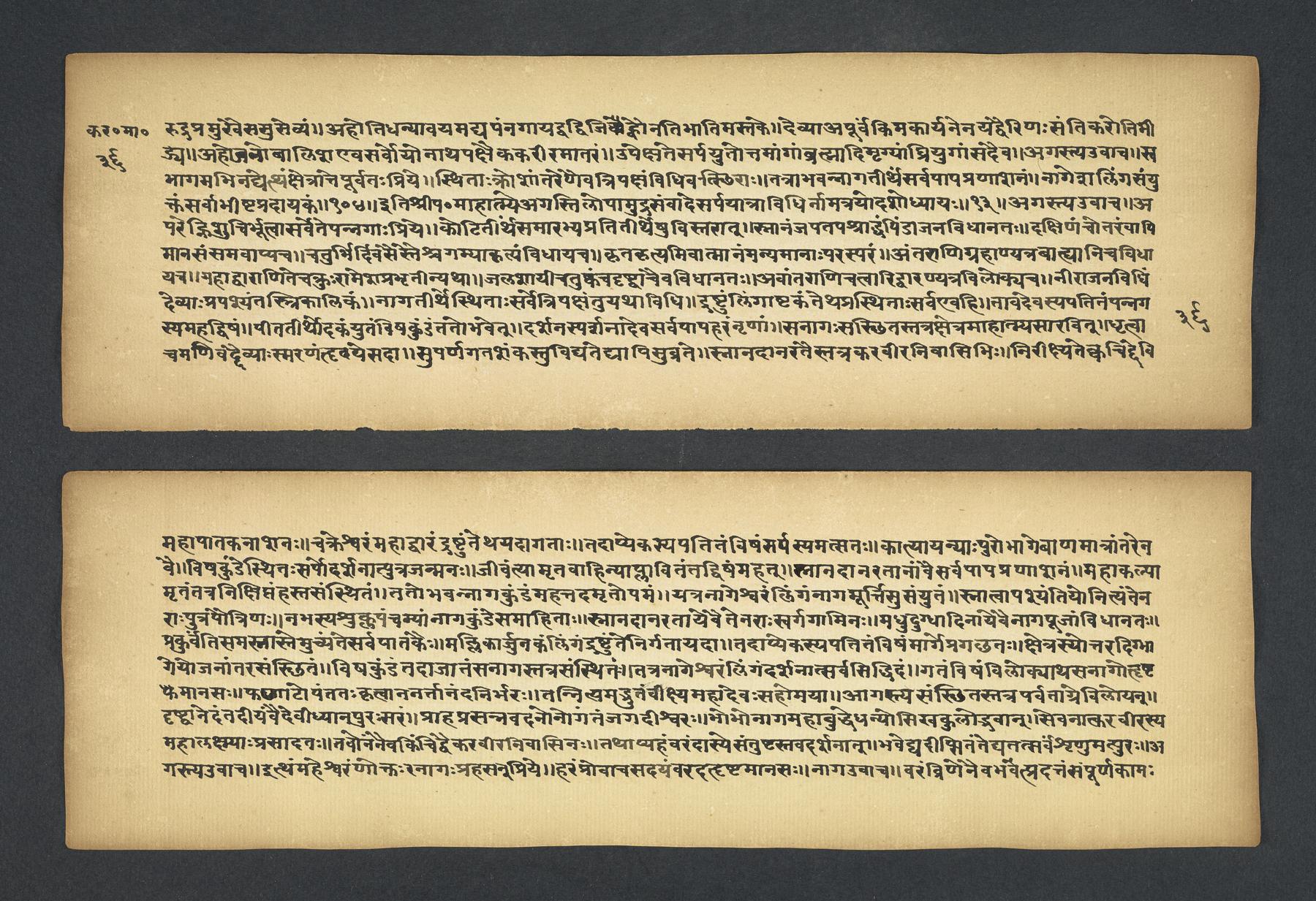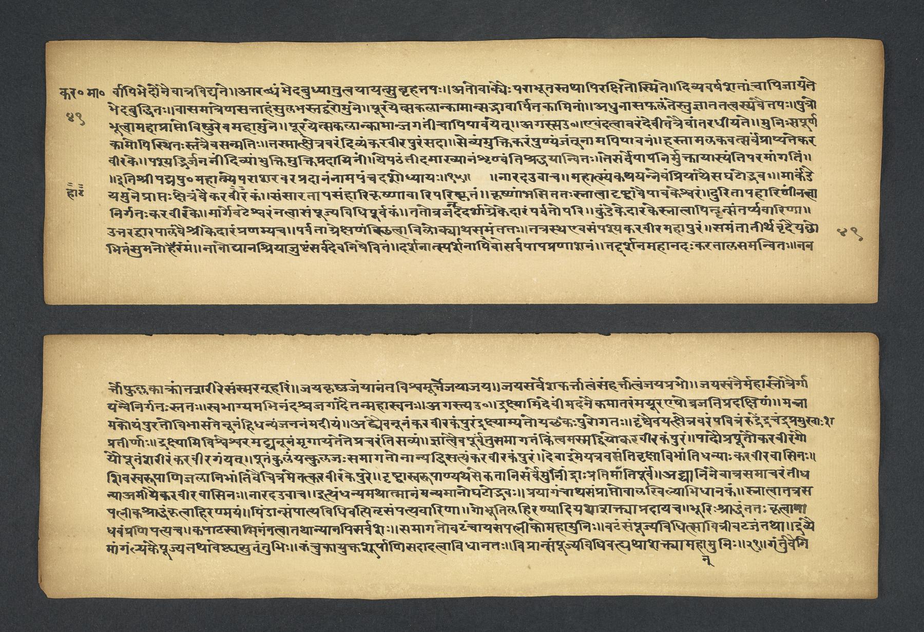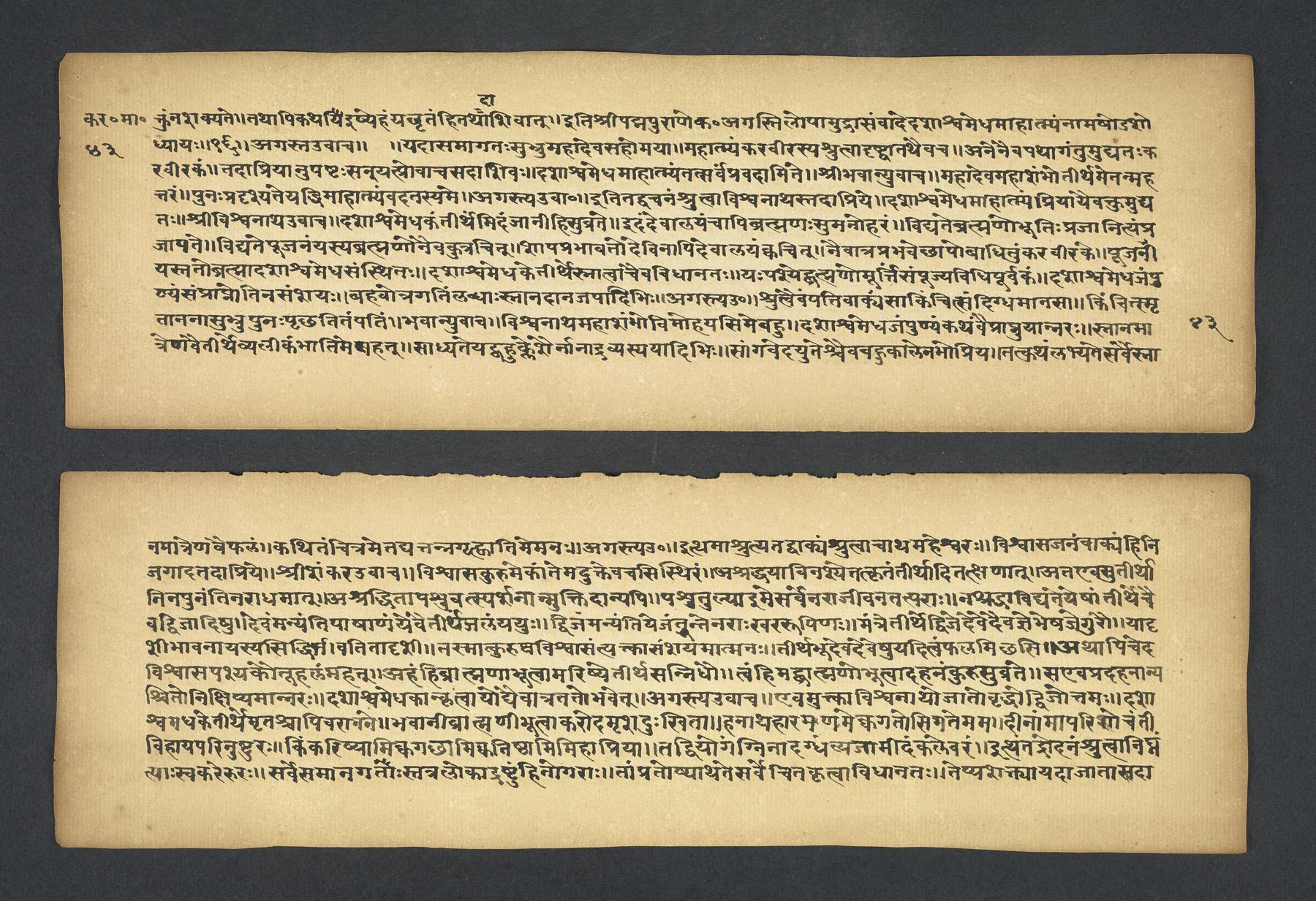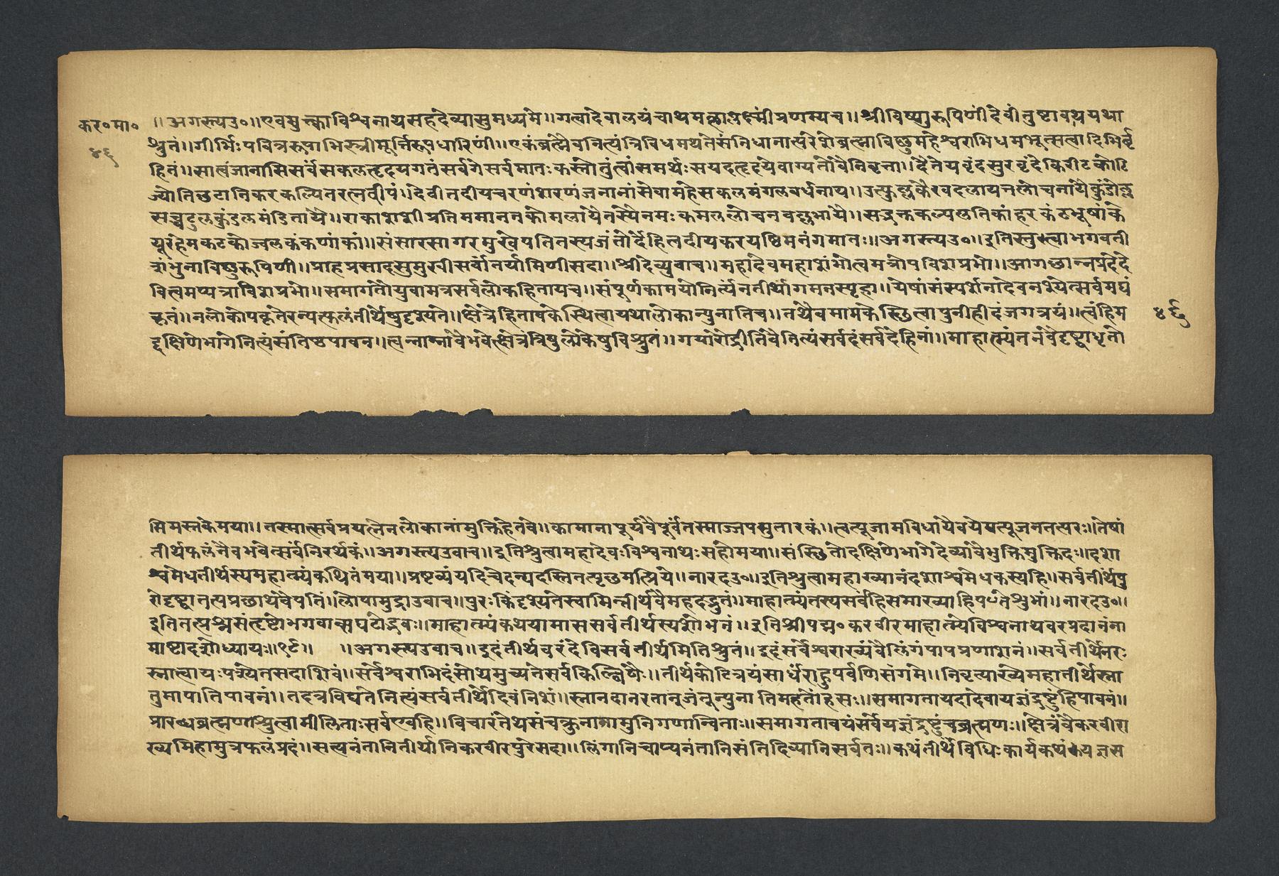 Colophon: iti śrī padmapurāṇe karavīramāhātmye agastilopāmudrāsaṃvāde sarvatīrtha[sa]rvatīrthavarṇaṃ naṃnāmaikaviṃśo 'dhyāyaḥ // 19 // (f. 49r).Subjects topical