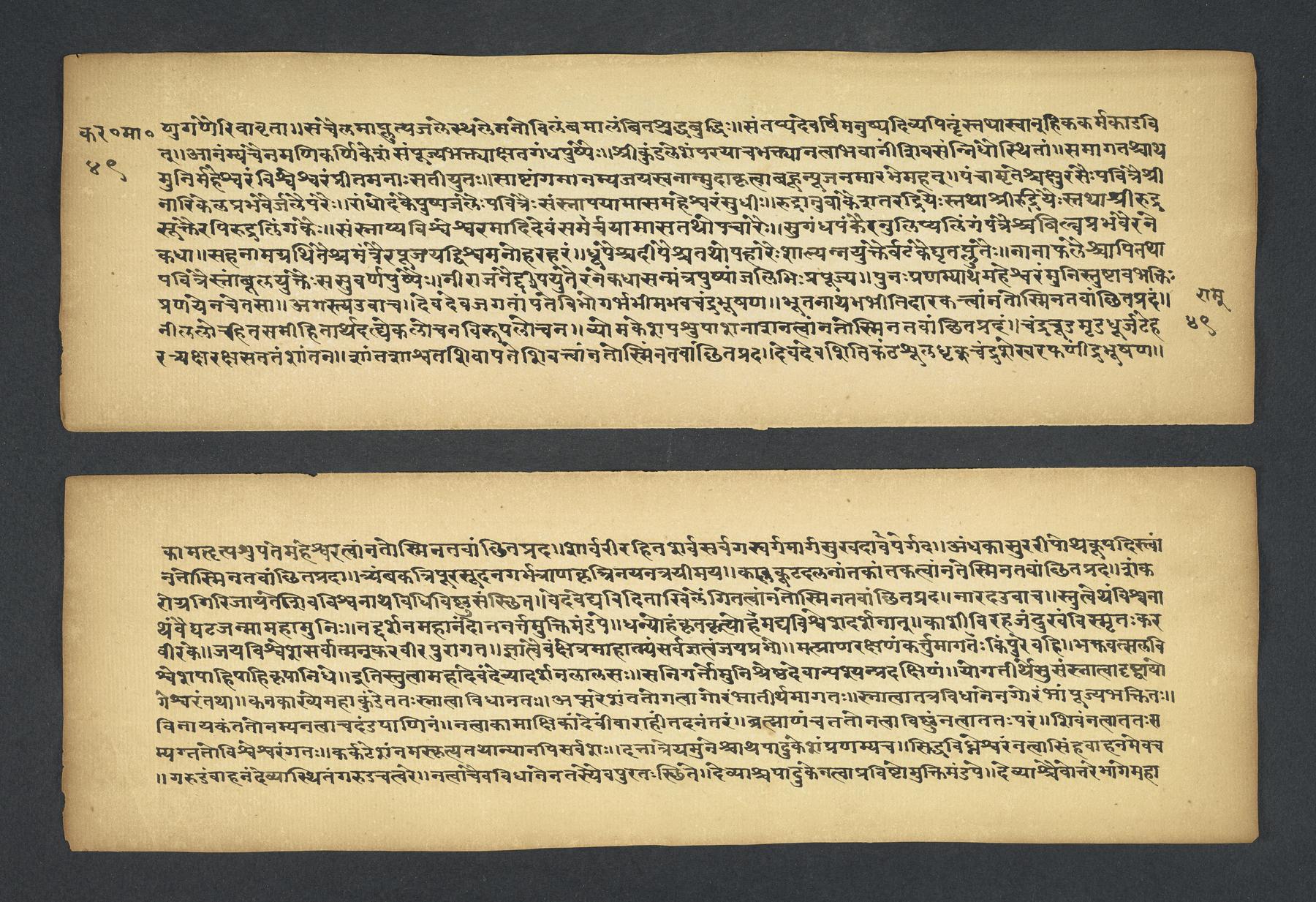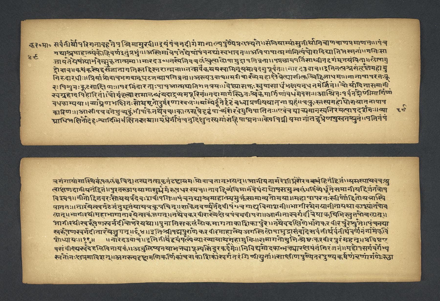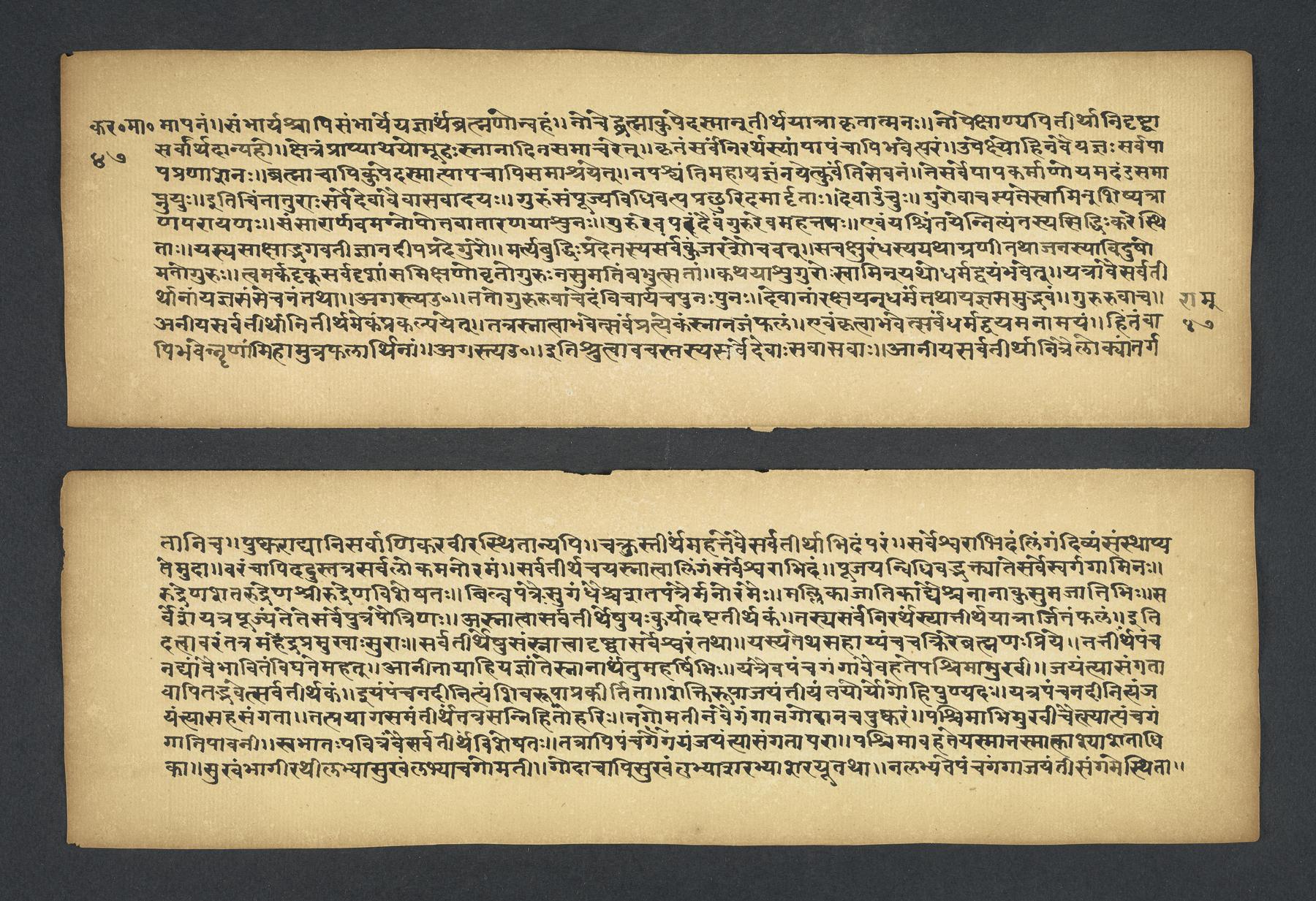Colophon: iti śrī padmapurāṇe karavīramāhātmye agastilopāmudrāsaṃvāde sarvatīrtha[sa]rvatīrthavarṇaṃ naṃnāmaikaviṃśo 'dhyāyaḥ // 19 // (f. 49r).Subjects topical