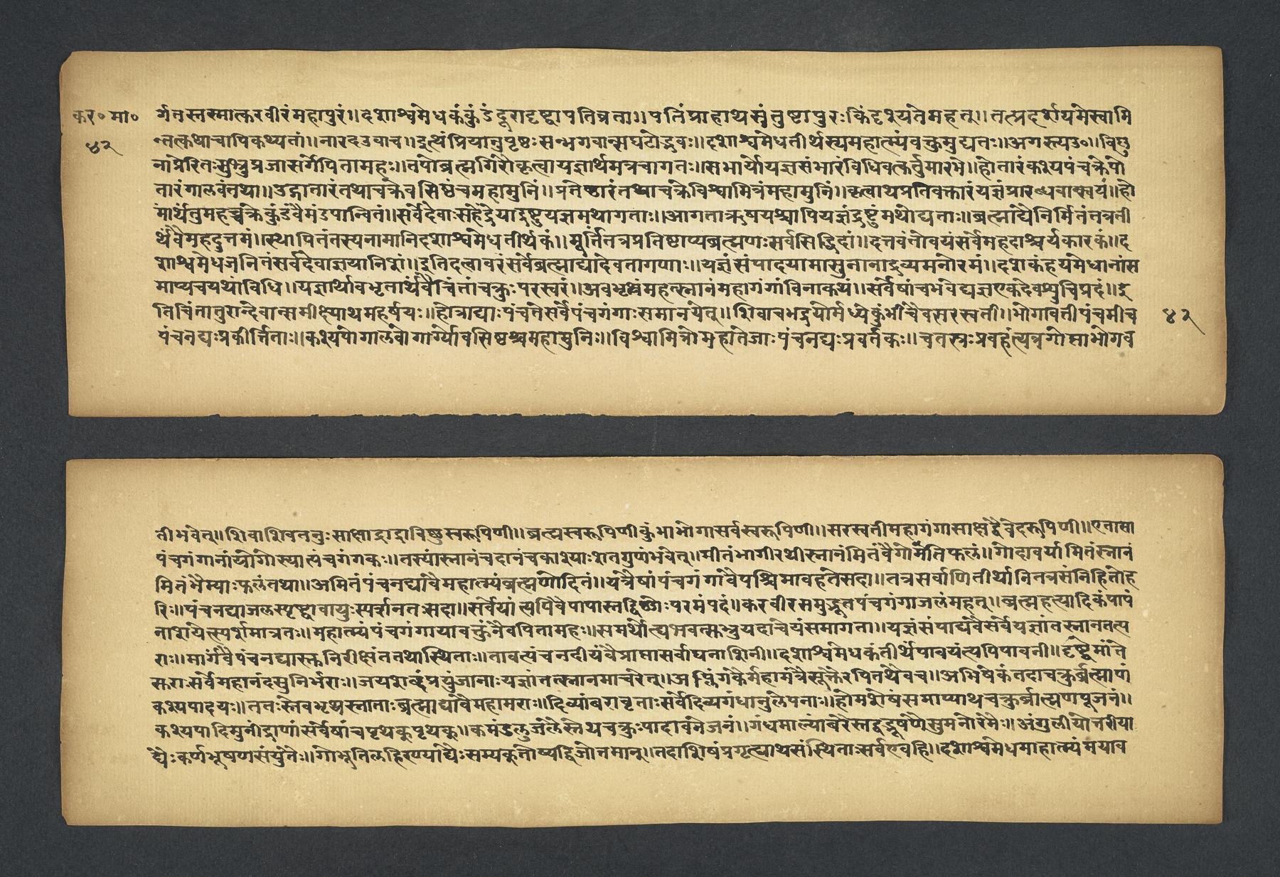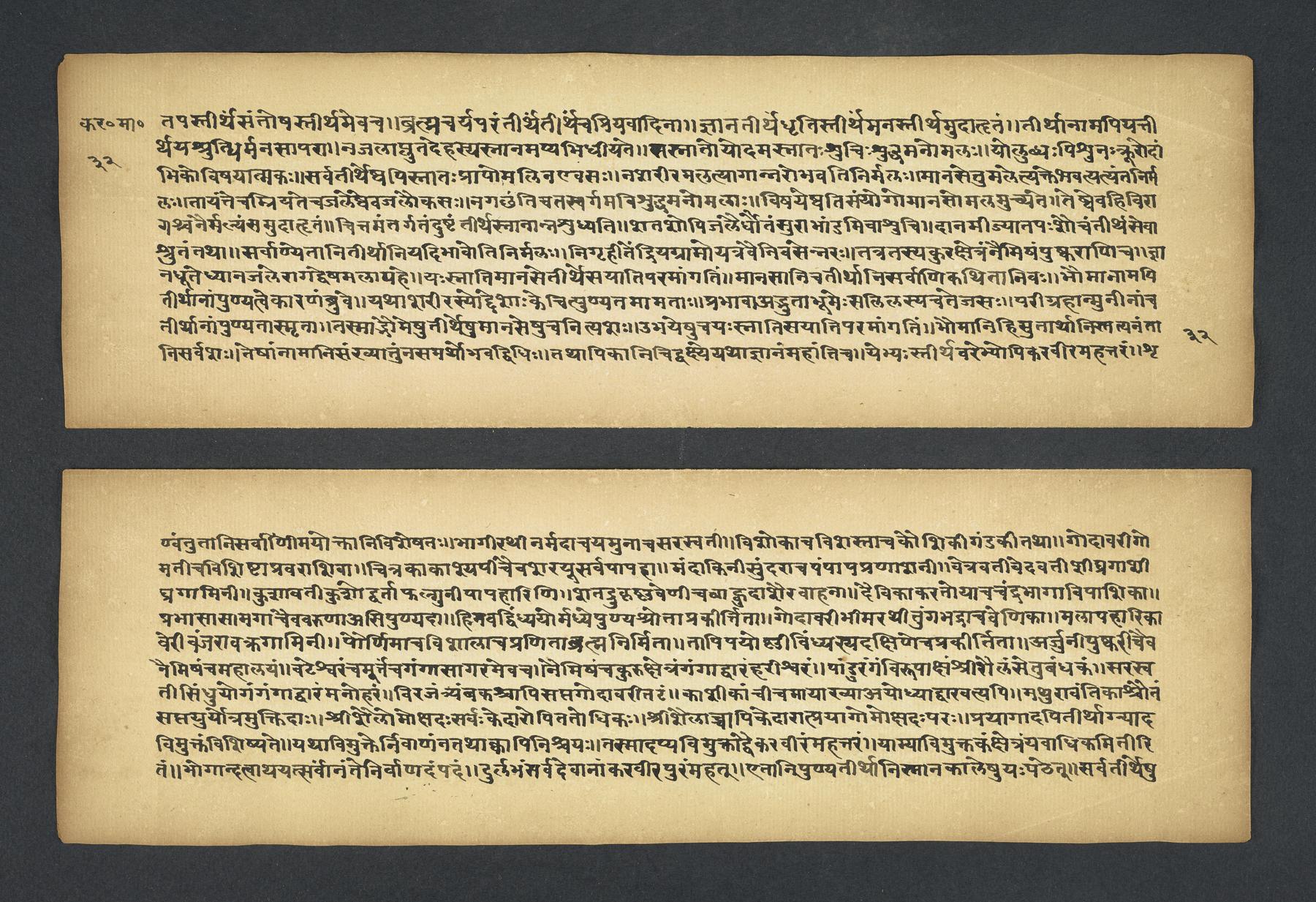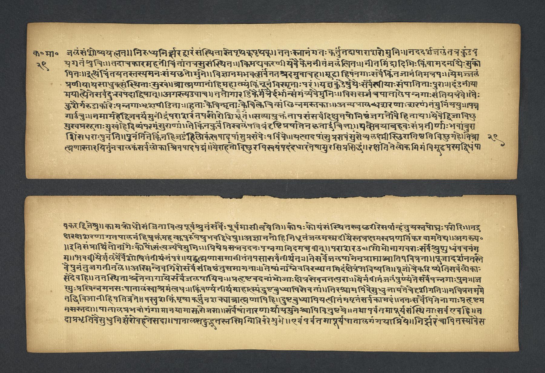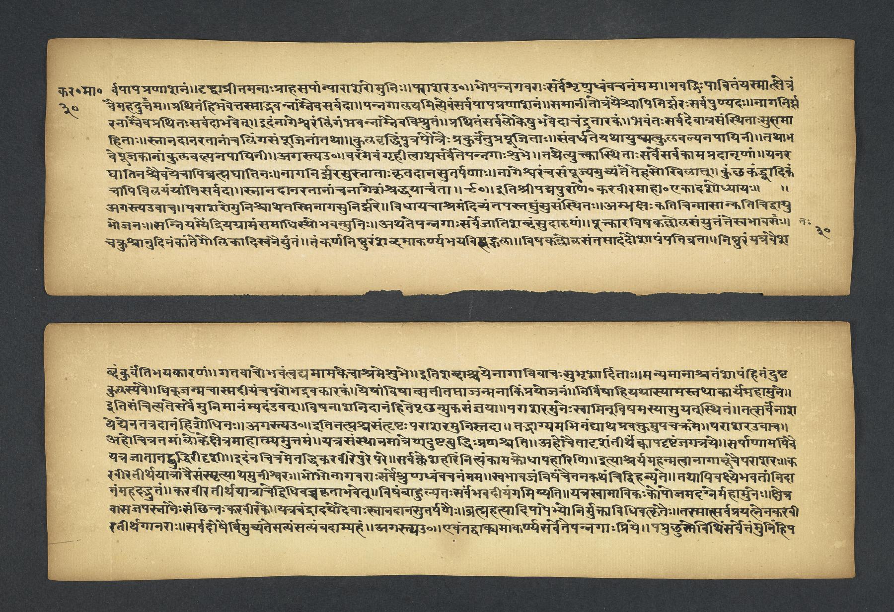 Colophon: iti śrī padmapurāṇe karavīramāhātmye agastilopāmudrāsaṃvāde sarvatīrtha[sa]rvatīrthavarṇaṃ naṃnāmaikaviṃśo 'dhyāyaḥ // 19 // (f. 49r).Subjects topical