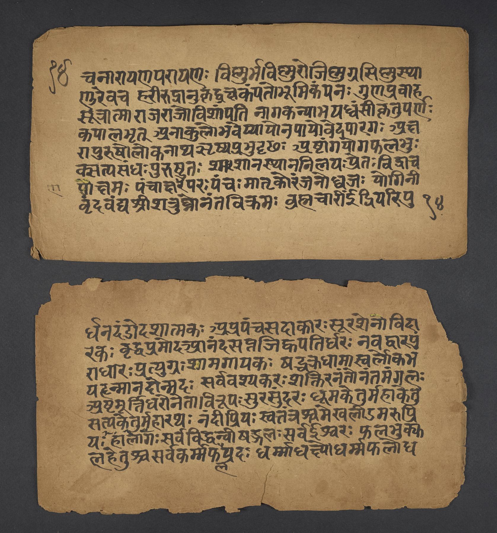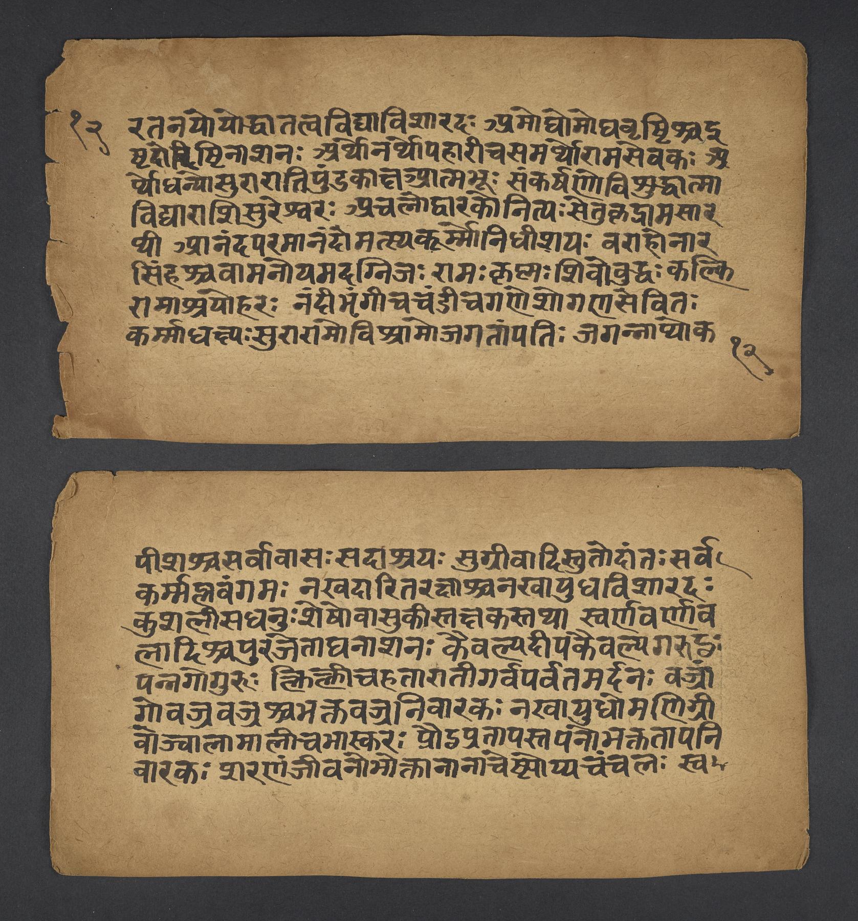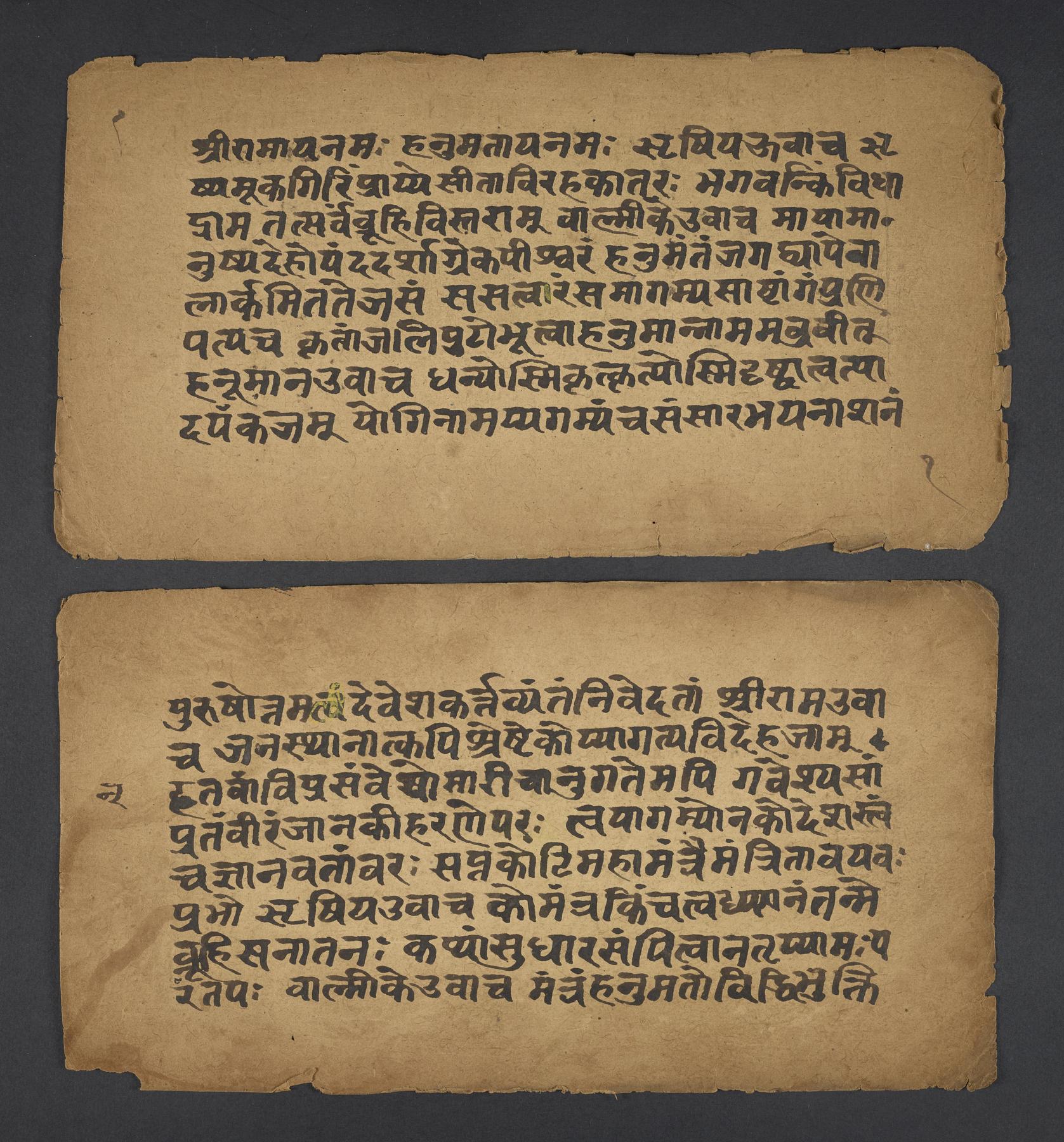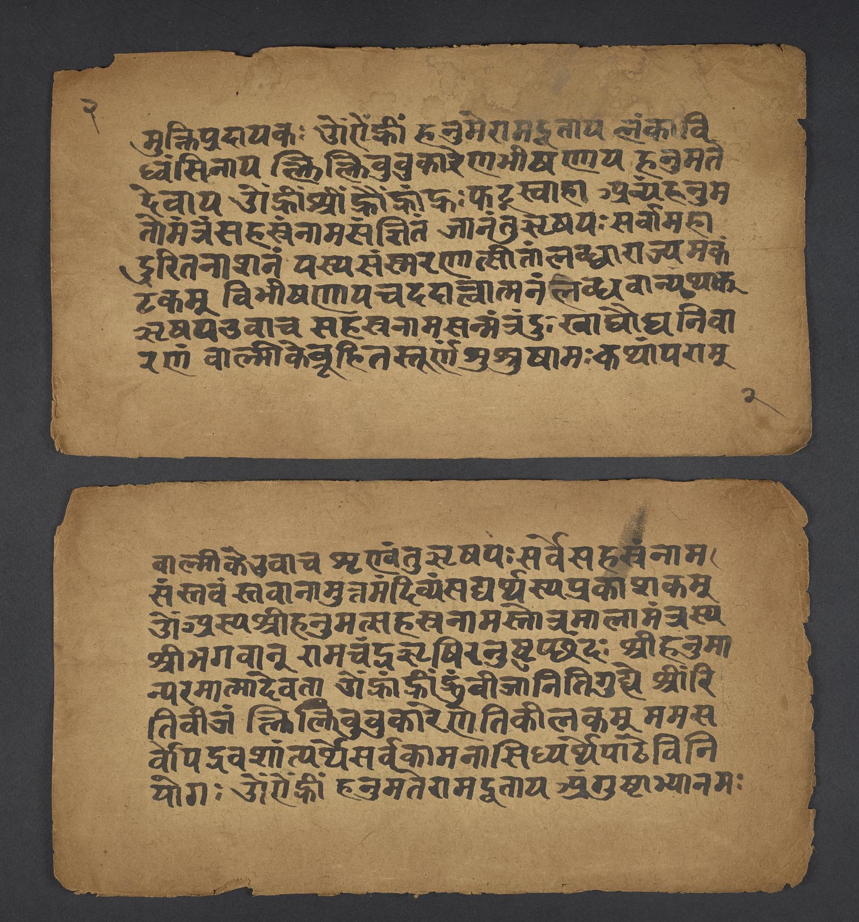 Praise of the thousand names of the Hindu monkey deity Hanuman; said to be conveyed by the Hindu deity and earthly king Rāma; for use in prayer, meditation, and recitation; unrelated verses in another hand on front of text written with folio turned vertically, such as a praise of the Vedanta philosopher Rāmānujā (f. 1r).
