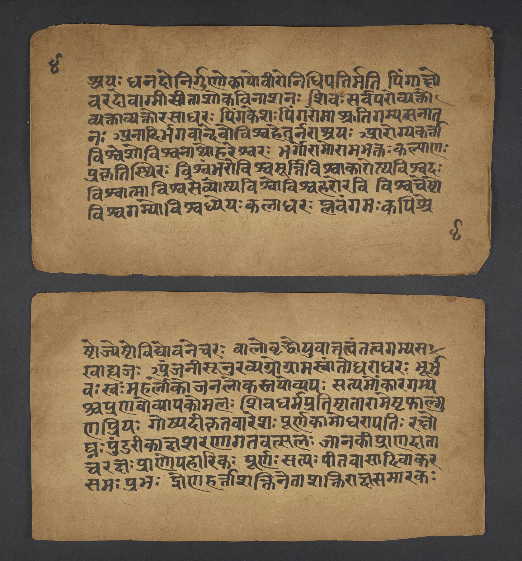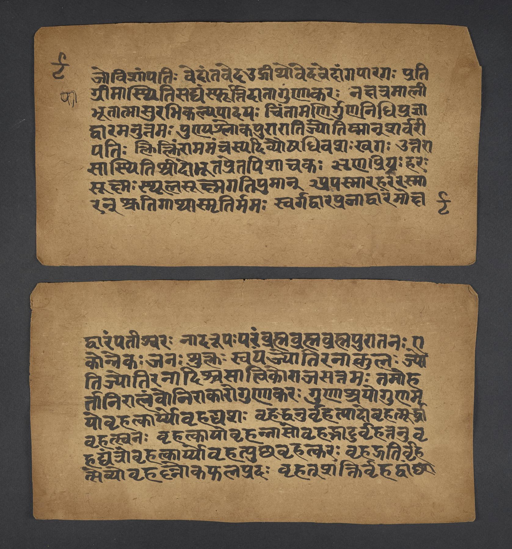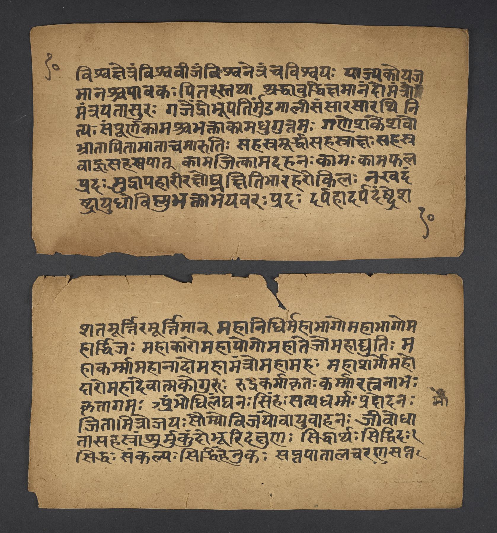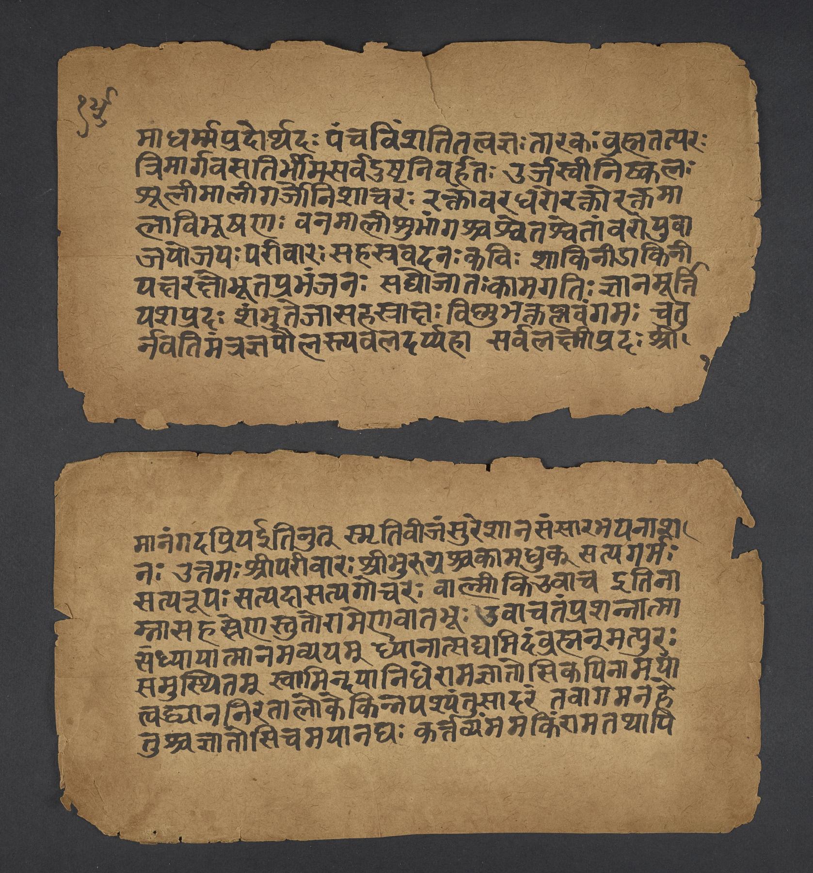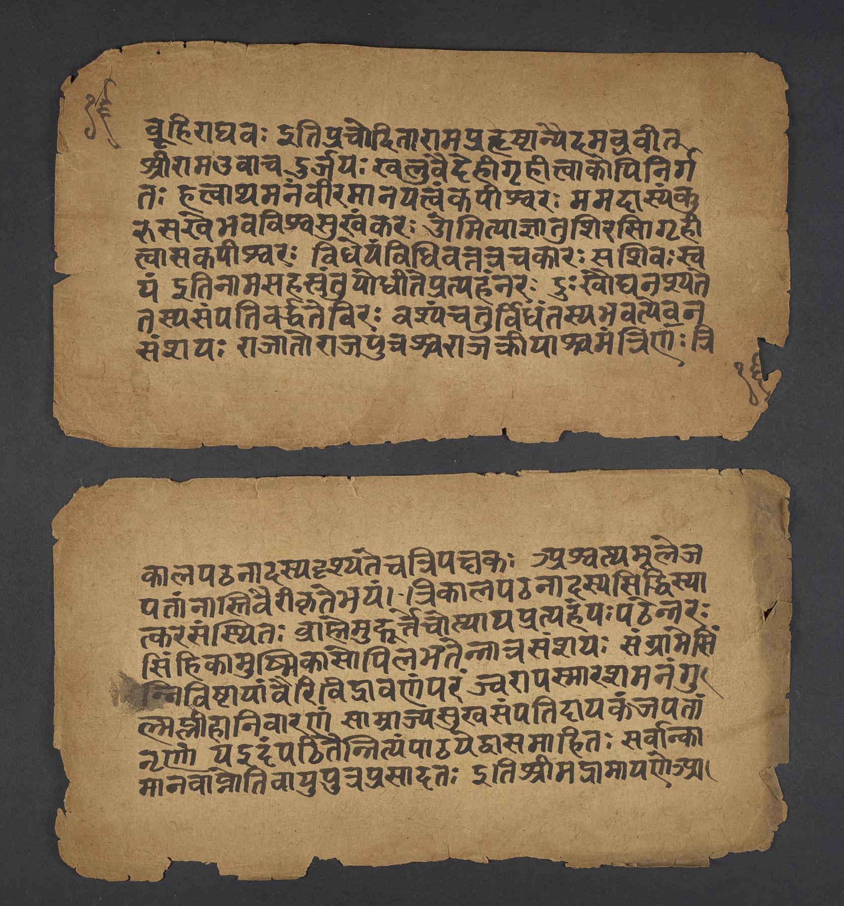 Praise of the thousand names of the Hindu monkey deity Hanuman; said to be conveyed by the Hindu deity and earthly king Rāma; for use in prayer, meditation, and recitation; unrelated verses in another hand on front of text written with folio turned vertically, such as a praise of the Vedanta philosopher Rāmānujā (f. 1r).