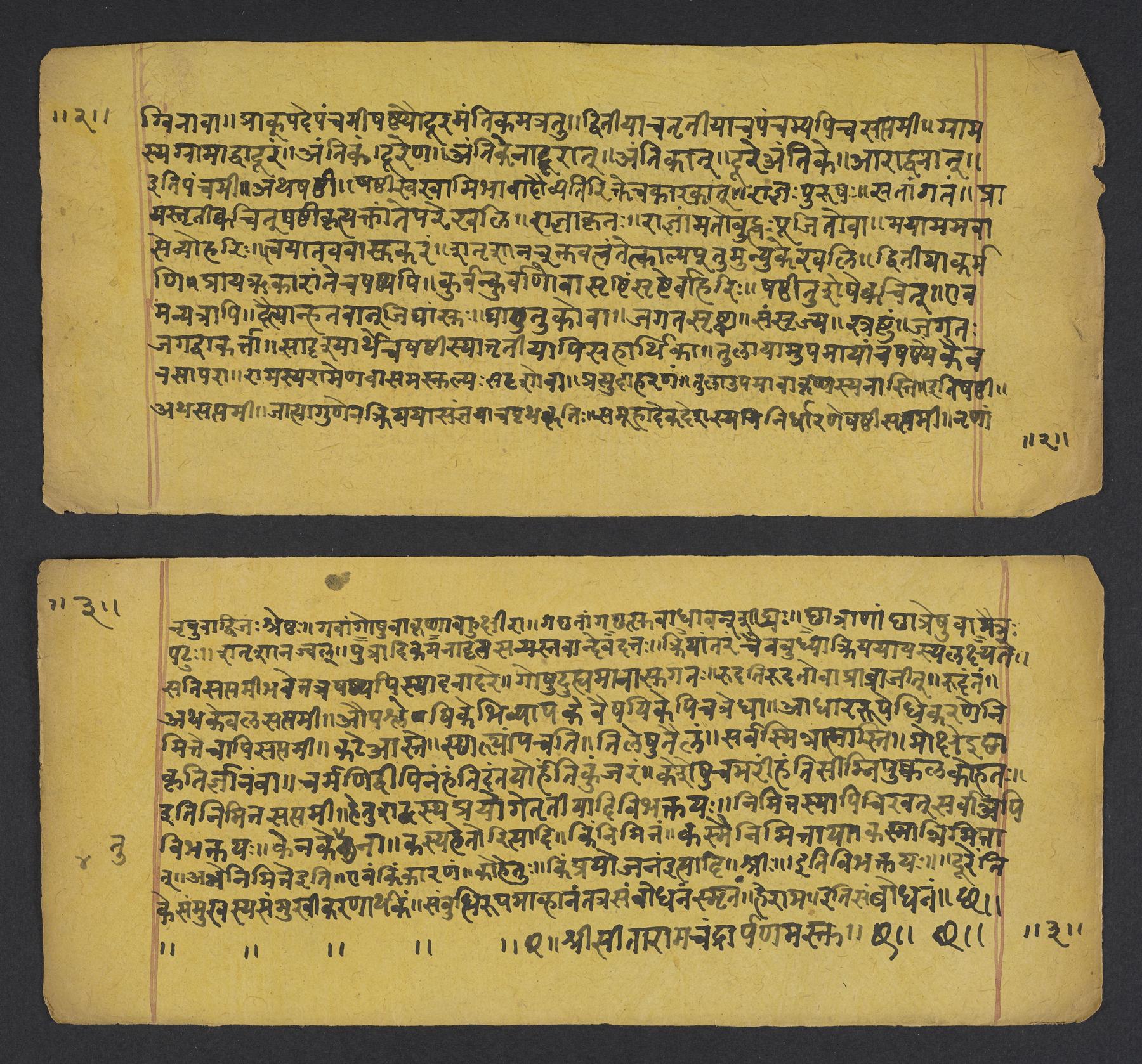 - Mistakes blacked out; some corrections and additions in margins; vertical margins marked with double red line. Folios treated with yellow turmeric powder to protect the manuscript from insects.