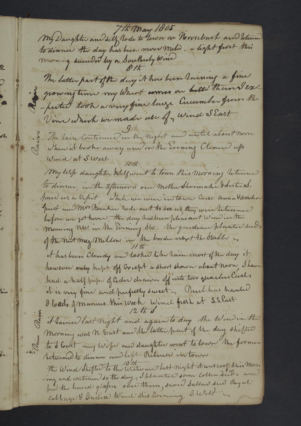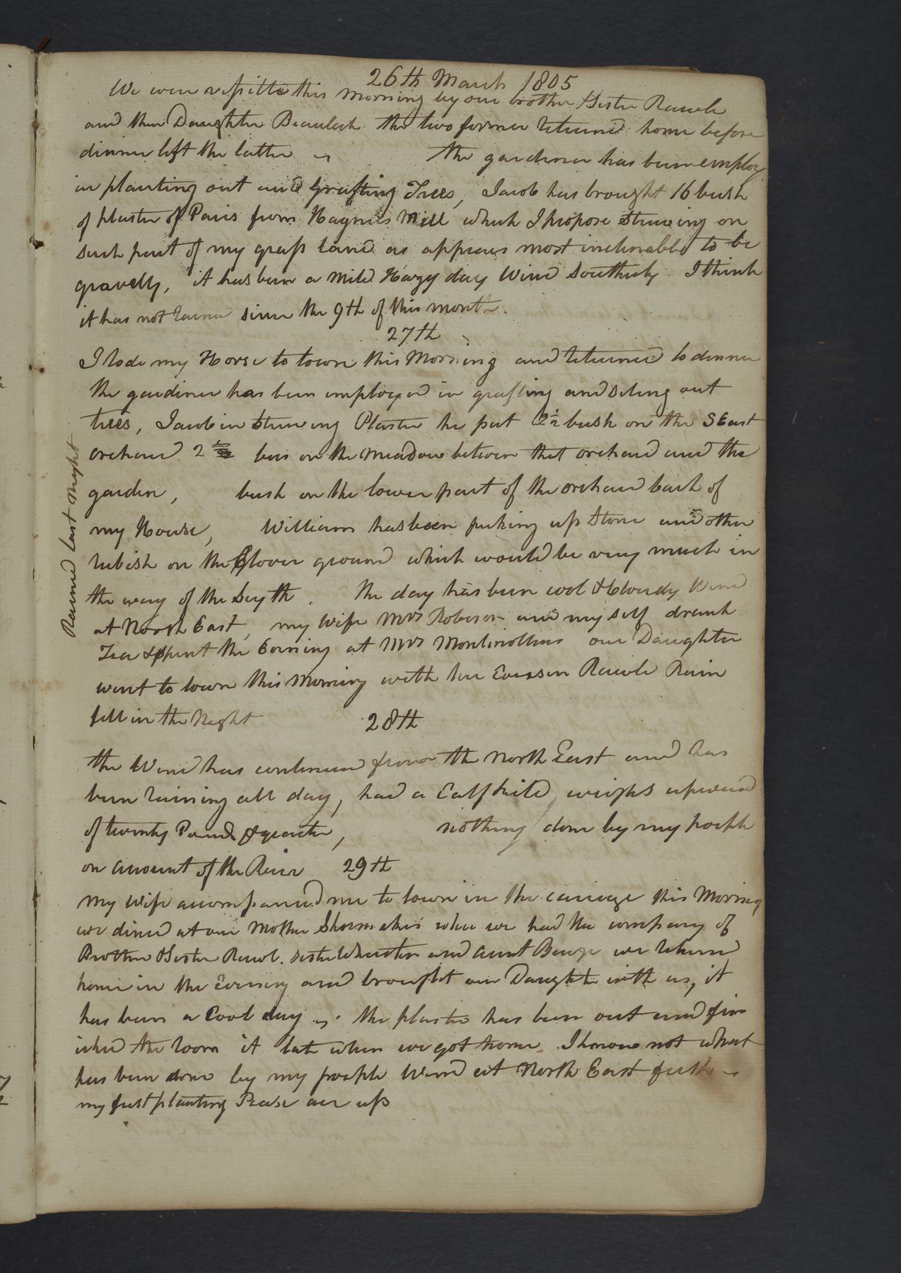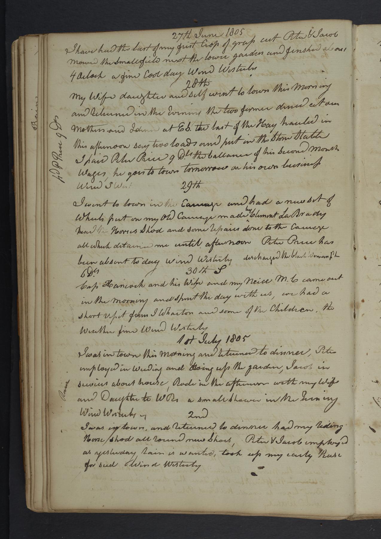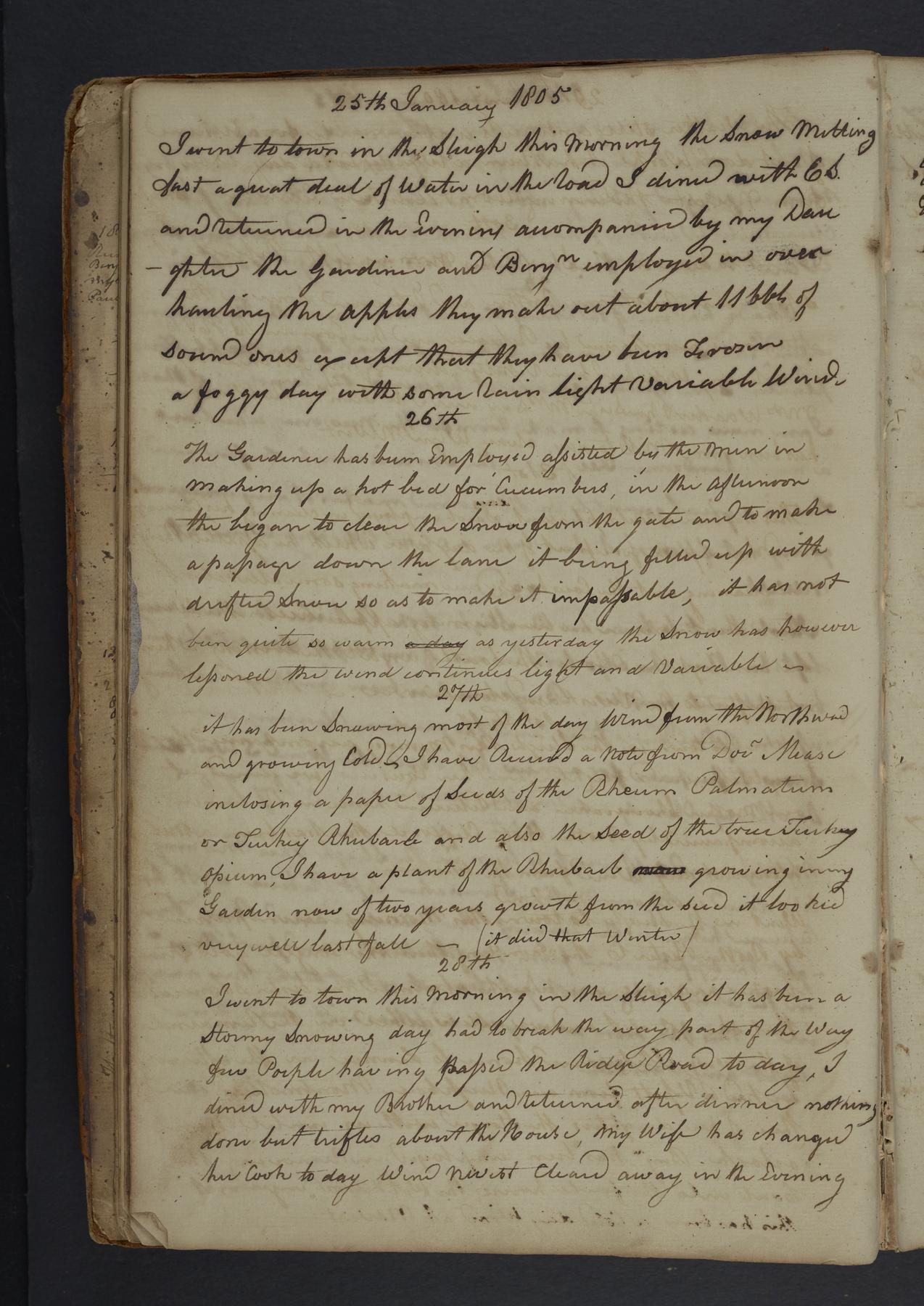 A diary offering daily accounts of John Clifford's home life, especially the management of his orchards and gardens on his Philadelphia estate, located within walking distance of the Schuylkill River. The first entry is dated December 29, 1804 and the last entry was recorded December 28, 1809. Daily descriptions include his whereabouts for the day, the weather, some financial matters (1784-1809) and specific tasks of various men under his employ. Clifford briefly mentions his mercantile business within these pages but there is a loose invoice for the purchase of cloth in 1812. Beginning 5 pages from the end of the book and upside down from the diary entries is a list of the "Sale of the effects of William G. Smith a Bankrupt." Also included are 9 loose pages of genealogical notes on the Pemberton family.
