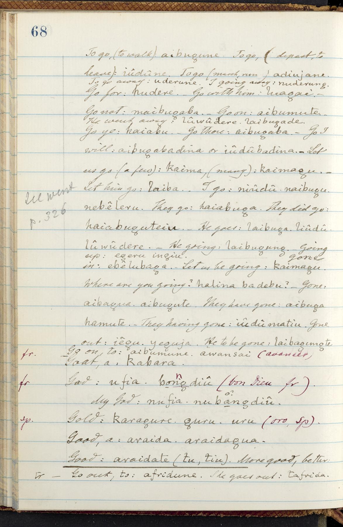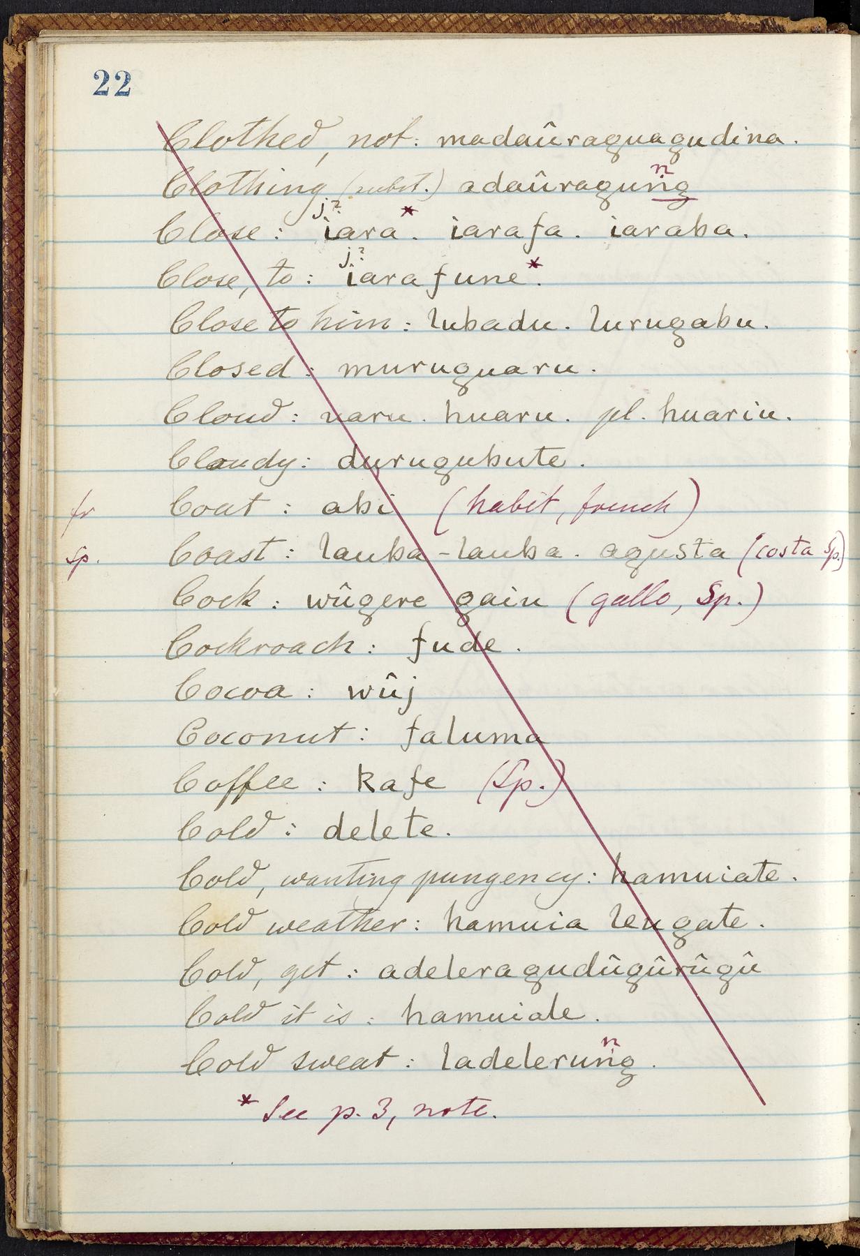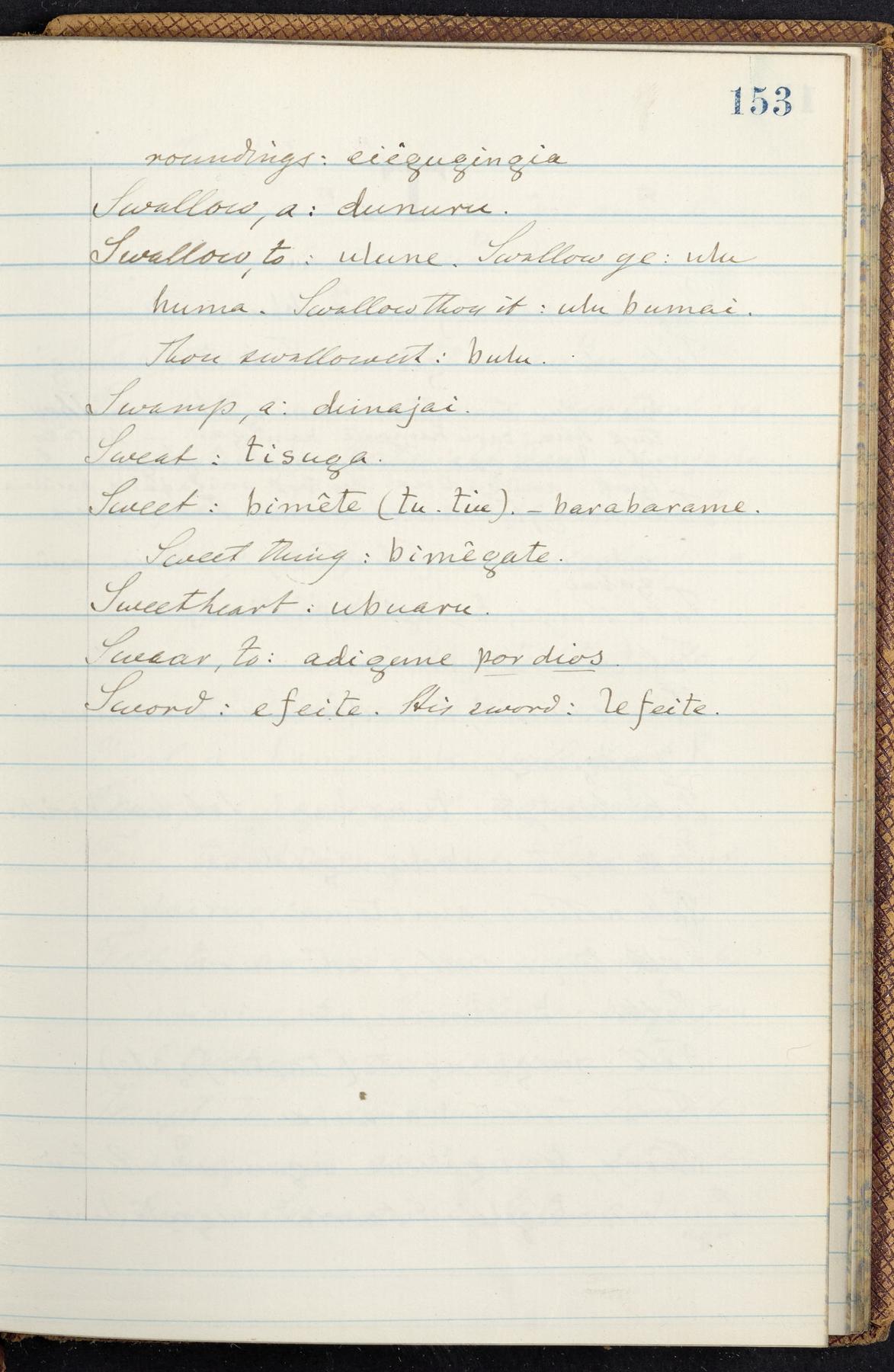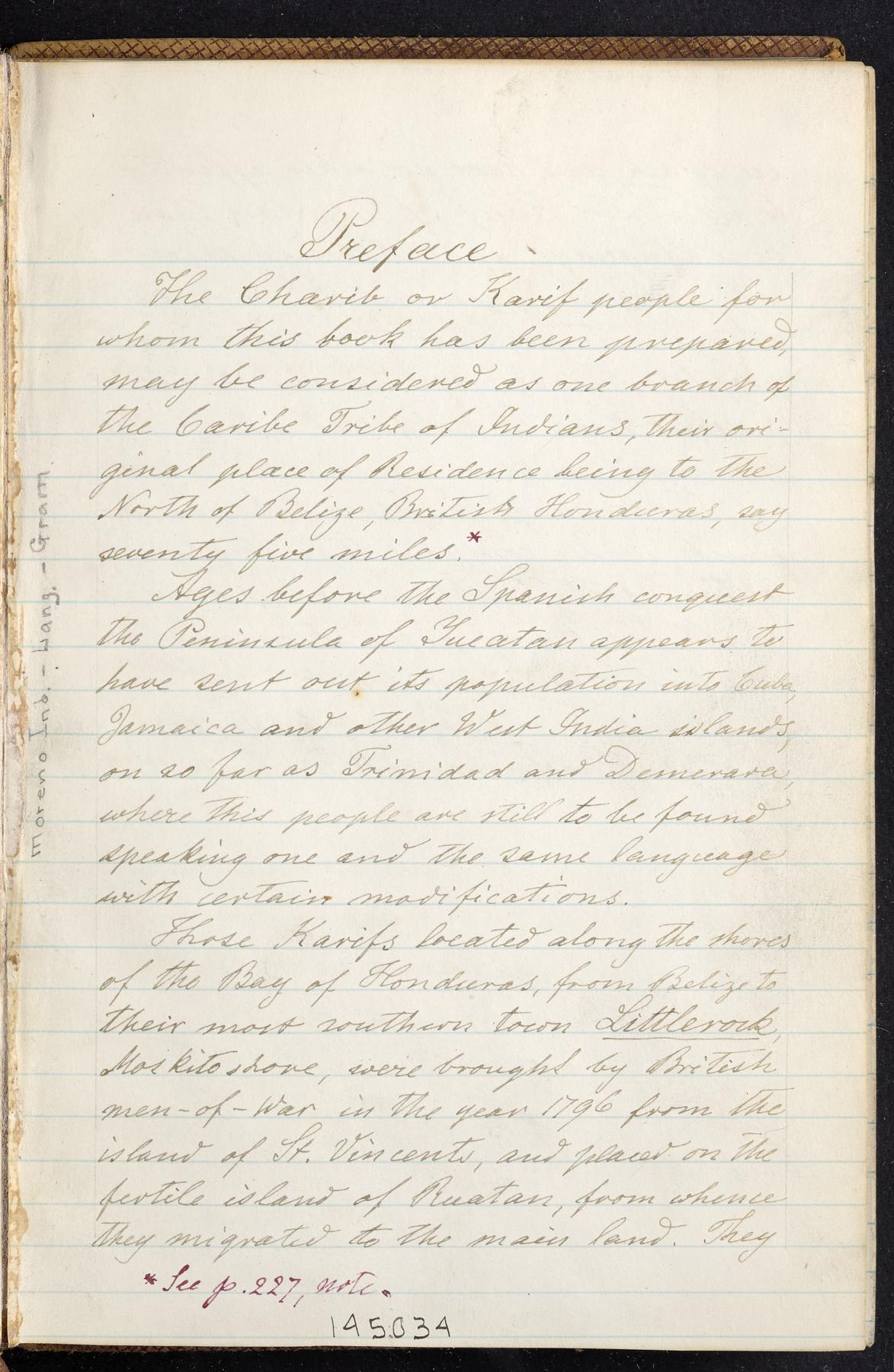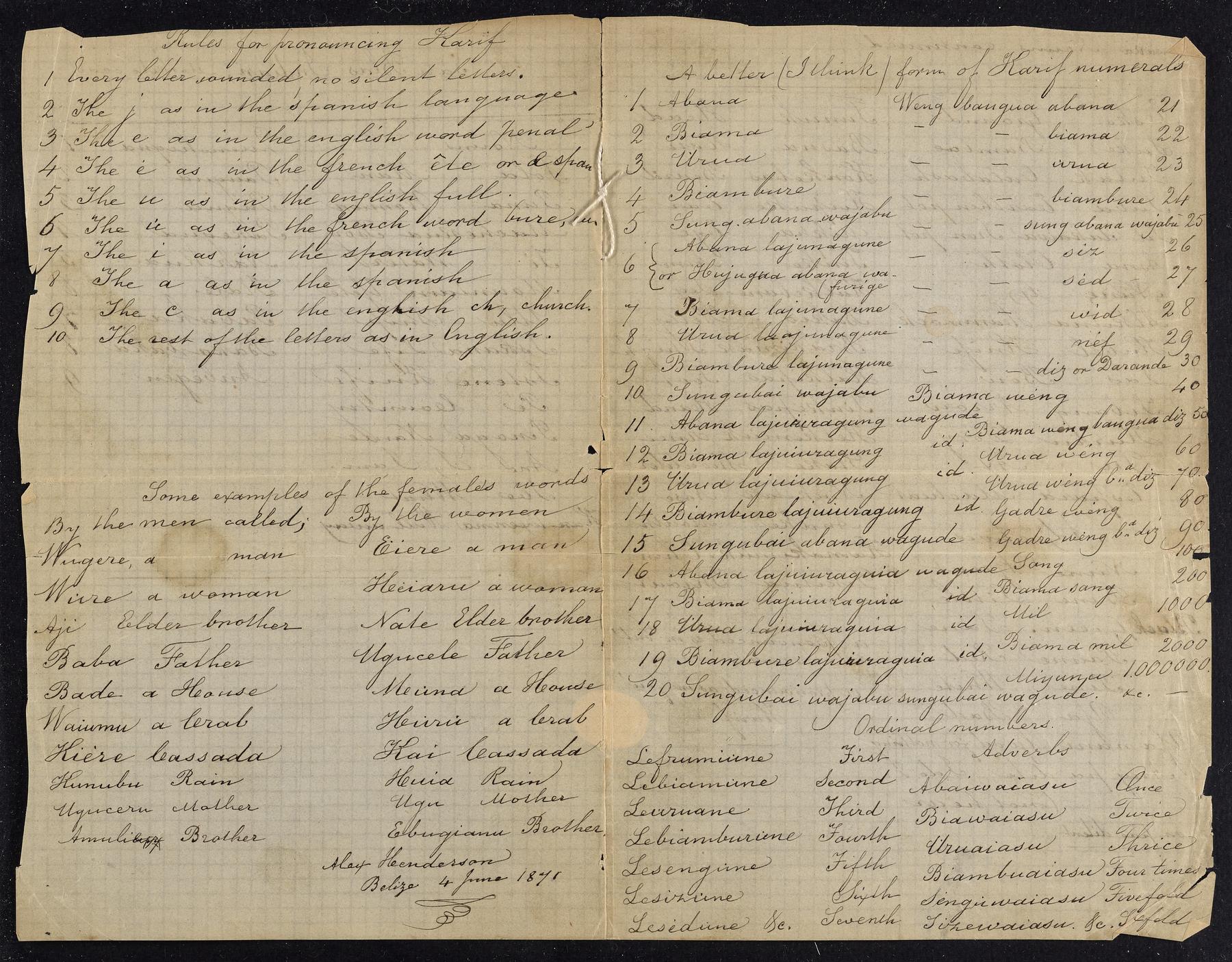 English and Garifuna, with occasional French and Spanish words noted by Berendt throughout the manuscript for comparison. Notes of Henderson include vocabulary in the language of the Tawahka and in the Cuna language of the San Blas IndiansOrigin