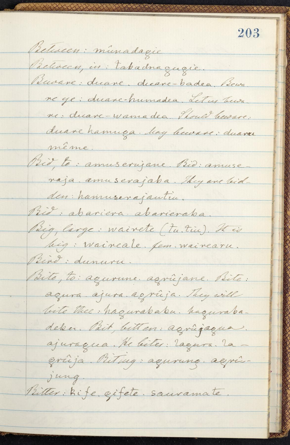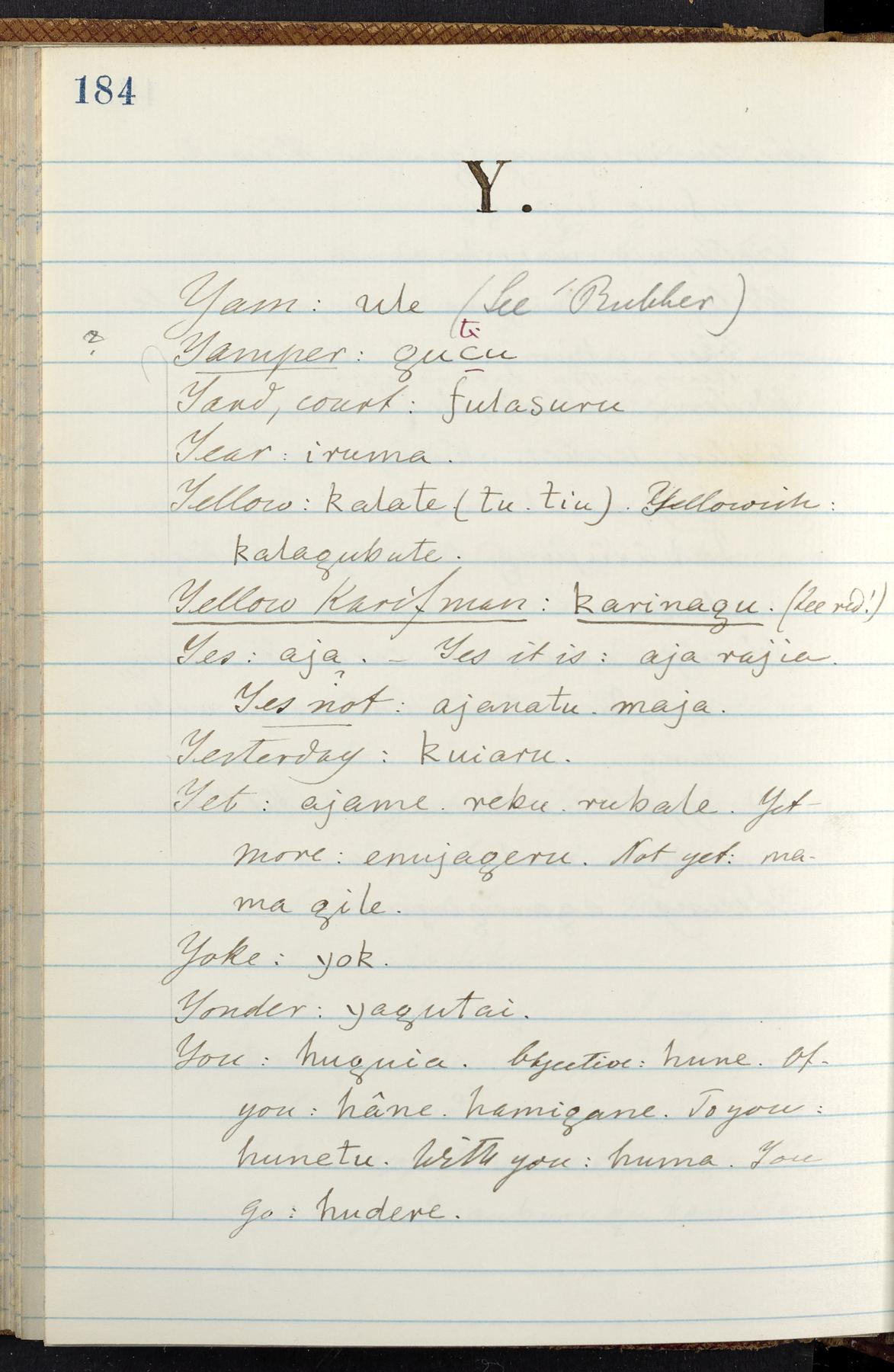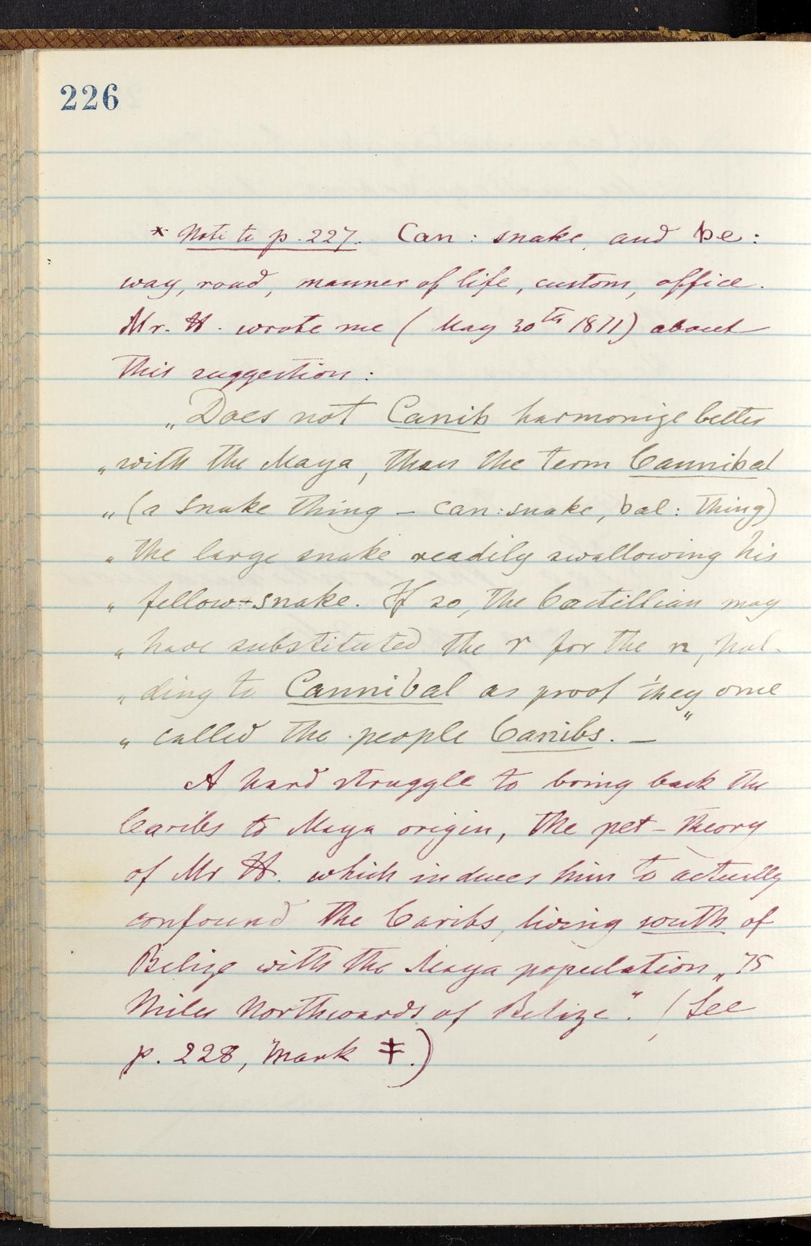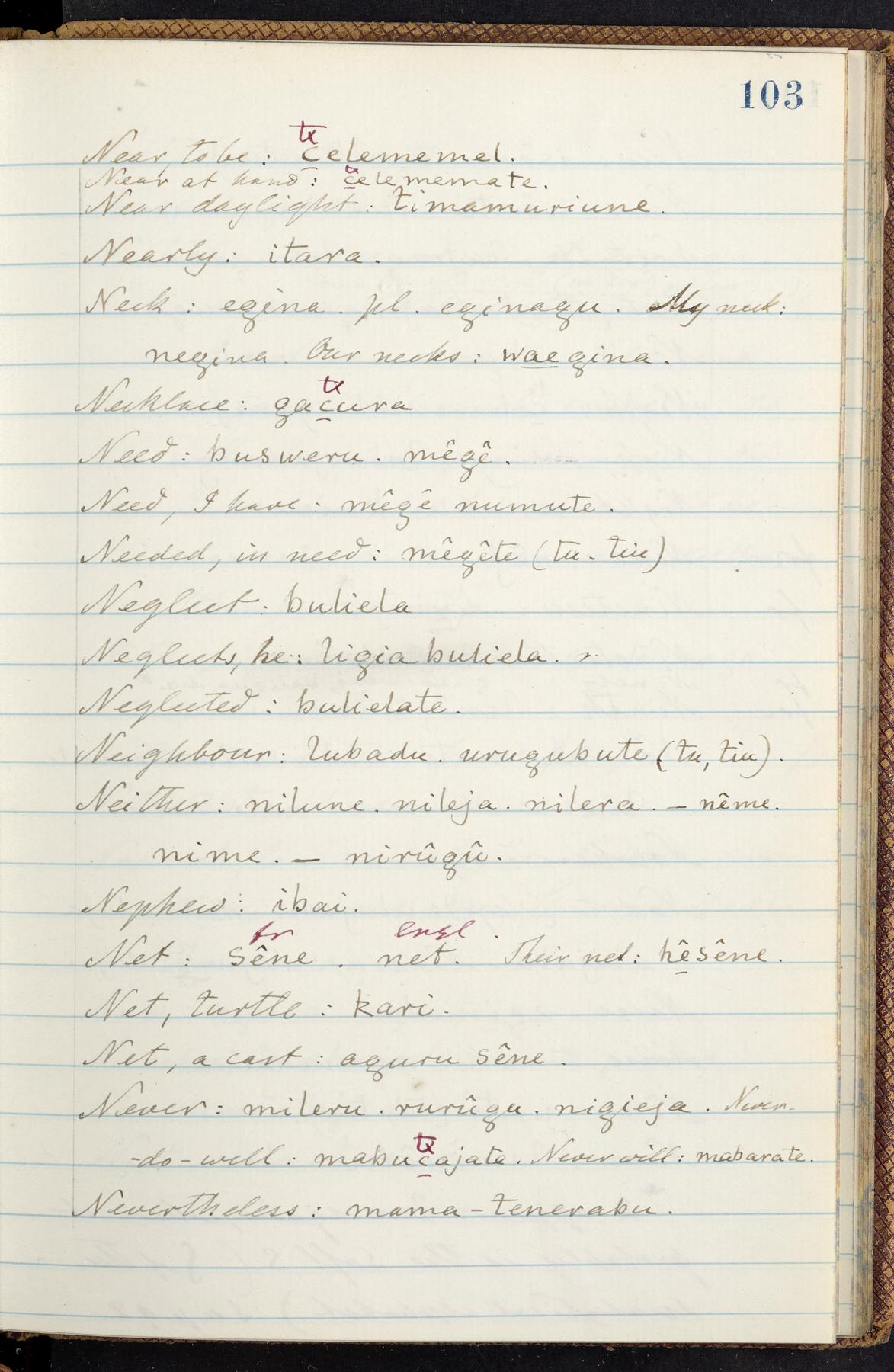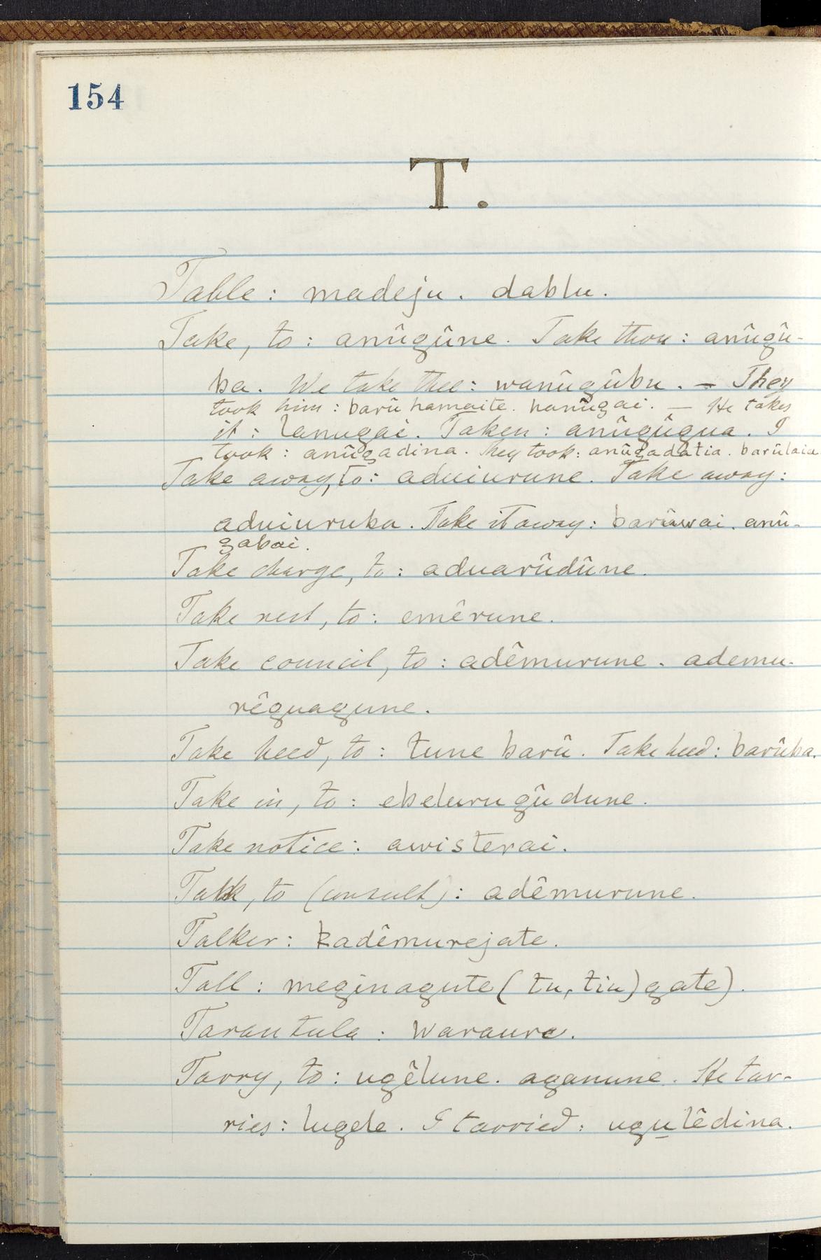 C. Hermann Berendt's transcription, in a notebook of lined paper, of a dictionary of English and Garifuna (Karif), written by Alexander Henderson, documenting the Garifuna language as spoken in the coastal areas around the Gulf (Bay) of Honduras. The dictionary comprised part of a larger manuscript by Henderson on the Garifuna language, which he wrote at the request of Berendt, on the basis of material accumulated years before. For Berendt's copy of the grammar contained in that larger manuscript, see Ms. Coll. 700, Item 126. In the preface (p. III-IV), Henderson specifies that the coastal area in which the language was spoken extended from Belize southward to a town named Littlerock on the Mosquito (Moskito) shore (either northeastern Honduras or Nicaragua). His remarks on the Garifuna people and language include mention of their being moved by the British in 1796 from the island of Saint Vincent to the island of Roatán, and their later migration to the mainland. He also characterizes them as a branch of the Carib Indians originating in a region 75 miles north of Belize. In an extensive footnote (p. 226-231), Berendt takes pains to discount the latter theory about the origin of the Garifuna, quoting a long passage from a letter Henderson wrote him (dated 26 December 1872) in which the theory plays a role, and then describing the regions to the north, in which the Maya language predominates. The early pages of the dictionary (to mid p. 26) are crossed out by Berendt with a diagonal slash across the page, and the reader is referred to the back of the book, where he has revised these pages (p. 187-225). Whereas the crossed-out version is spare, presenting mainly single-word Garifuna equivalents for English words, the revised version, with slightly more entries, often includes examples of usage, especially for verbs. In the rest of the dictionary (p. 26-185), this expanded style of presentation is used. In a note tipped in (verso of title page), Berendt indicates that he has made additions in blue ink taken from a manuscript vocabulary prepared by Henderson for Berendt's comparative vocabulary of languages spoken between the Isthmus of Tehuantepec and Honduras; such blue-ink additions are not evident (the manuscript by Henderson that Berendt refers to here appears to correspond to Ms. Coll. 700, Item 135). The December 1872 letter from Henderson cited above (1 bifolium), along with 4 additional letters from him to Berendt (dated 16 May, 30 May, and 18 October 1871, and 28 July 1873; 1 leaf and 3 bifolia), as well as Berendt's drafts of 2 letters of his to Henderson (dated 20 November 1871 and October 1872, 2 bifolia), are among items that were tipped in or laid in, and are now housed in a separate folder shelved with the manuscript. Besides the Garifuna manuscript, topics of the correspondence include Henderson's manuscript for the comparative vocabulary (referred to above, and described in Henderson's letters of May 1871 as a vocabulary of 600 words); and a vocabulary of the Tawahka (Twaka) Indians that he sent to Berendt, which was originally collected by a certain merchant Mr. Haly. Henderson's original pages of the latter vocabulary, with a few words from the San Blas Indians, are also among the items in the folder shelved with the manuscript (2 bifolia that originally formed a 4-leaf gathering; 2 pages concern Karif). For Berendt's transcription of the Tawahka vocabulary, see Ms. Coll. 700, Item 133; and for his transcription of the vocabulary of the San Blas Indians, see Ms. Coll. 700, Item 164.