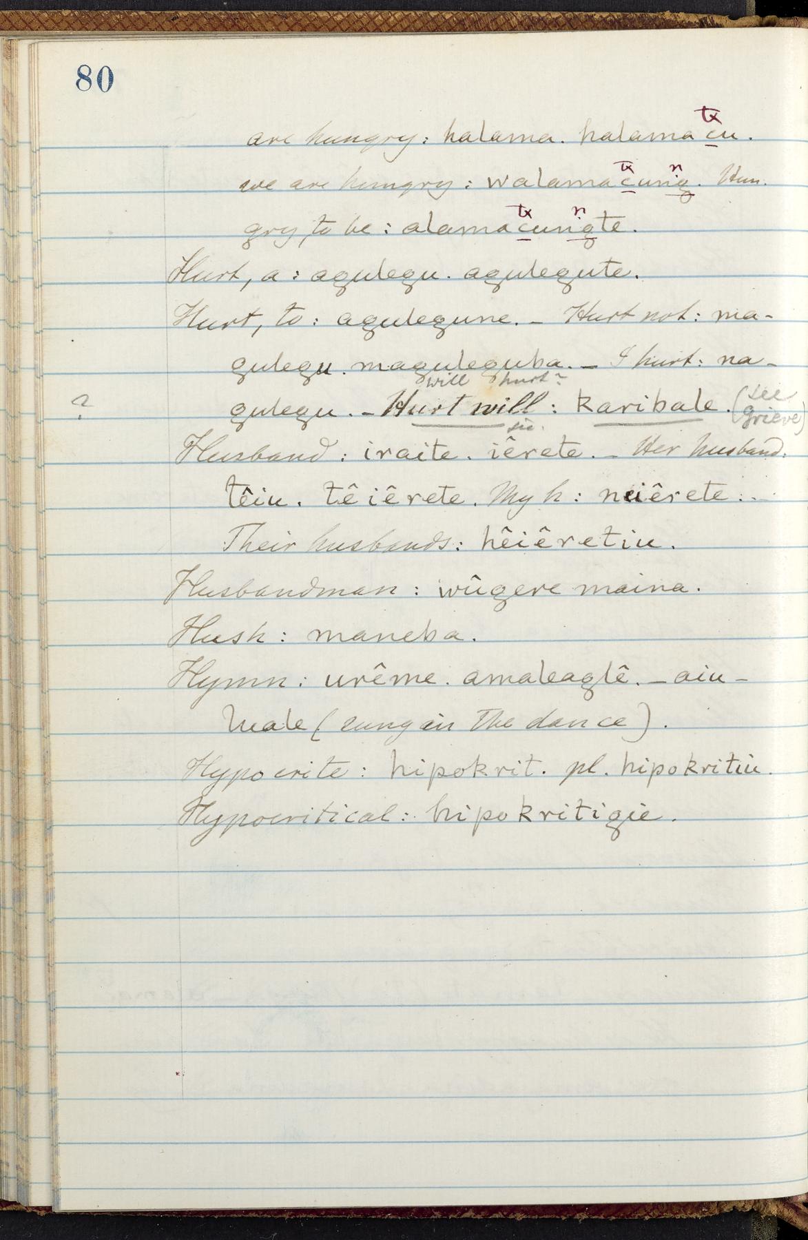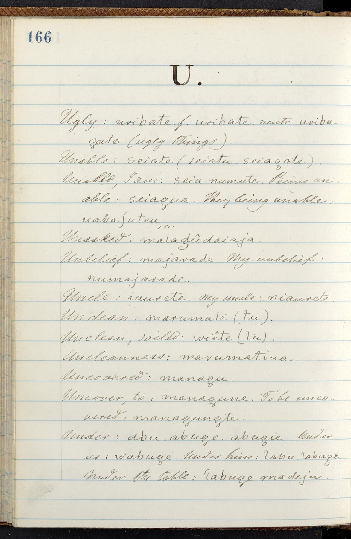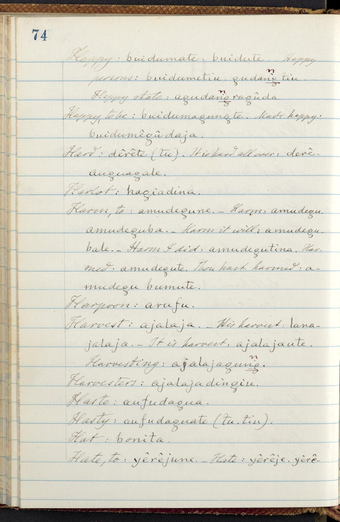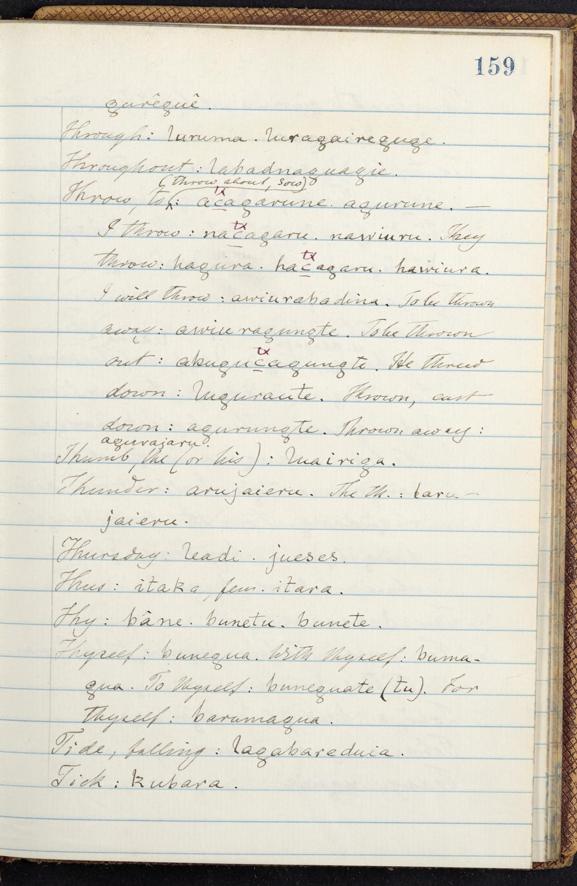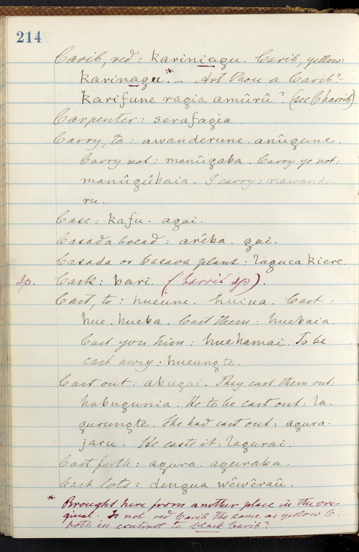 C. Hermann Berendt's transcription, in a notebook of lined paper, of a dictionary of English and Garifuna (Karif), written by Alexander Henderson, documenting the Garifuna language as spoken in the coastal areas around the Gulf (Bay) of Honduras. The dictionary comprised part of a larger manuscript by Henderson on the Garifuna language, which he wrote at the request of Berendt, on the basis of material accumulated years before. For Berendt's copy of the grammar contained in that larger manuscript, see Ms. Coll. 700, Item 126. In the preface (p. III-IV), Henderson specifies that the coastal area in which the language was spoken extended from Belize southward to a town named Littlerock on the Mosquito (Moskito) shore (either northeastern Honduras or Nicaragua). His remarks on the Garifuna people and language include mention of their being moved by the British in 1796 from the island of Saint Vincent to the island of Roatán, and their later migration to the mainland. He also characterizes them as a branch of the Carib Indians originating in a region 75 miles north of Belize. In an extensive footnote (p. 226-231), Berendt takes pains to discount the latter theory about the origin of the Garifuna, quoting a long passage from a letter Henderson wrote him (dated 26 December 1872) in which the theory plays a role, and then describing the regions to the north, in which the Maya language predominates. The early pages of the dictionary (to mid p. 26) are crossed out by Berendt with a diagonal slash across the page, and the reader is referred to the back of the book, where he has revised these pages (p. 187-225). Whereas the crossed-out version is spare, presenting mainly single-word Garifuna equivalents for English words, the revised version, with slightly more entries, often includes examples of usage, especially for verbs. In the rest of the dictionary (p. 26-185), this expanded style of presentation is used. In a note tipped in (verso of title page), Berendt indicates that he has made additions in blue ink taken from a manuscript vocabulary prepared by Henderson for Berendt's comparative vocabulary of languages spoken between the Isthmus of Tehuantepec and Honduras; such blue-ink additions are not evident (the manuscript by Henderson that Berendt refers to here appears to correspond to Ms. Coll. 700, Item 135). The December 1872 letter from Henderson cited above (1 bifolium), along with 4 additional letters from him to Berendt (dated 16 May, 30 May, and 18 October 1871, and 28 July 1873; 1 leaf and 3 bifolia), as well as Berendt's drafts of 2 letters of his to Henderson (dated 20 November 1871 and October 1872, 2 bifolia), are among items that were tipped in or laid in, and are now housed in a separate folder shelved with the manuscript. Besides the Garifuna manuscript, topics of the correspondence include Henderson's manuscript for the comparative vocabulary (referred to above, and described in Henderson's letters of May 1871 as a vocabulary of 600 words); and a vocabulary of the Tawahka (Twaka) Indians that he sent to Berendt, which was originally collected by a certain merchant Mr. Haly. Henderson's original pages of the latter vocabulary, with a few words from the San Blas Indians, are also among the items in the folder shelved with the manuscript (2 bifolia that originally formed a 4-leaf gathering; 2 pages concern Karif). For Berendt's transcription of the Tawahka vocabulary, see Ms. Coll. 700, Item 133; and for his transcription of the vocabulary of the San Blas Indians, see Ms. Coll. 700, Item 164.