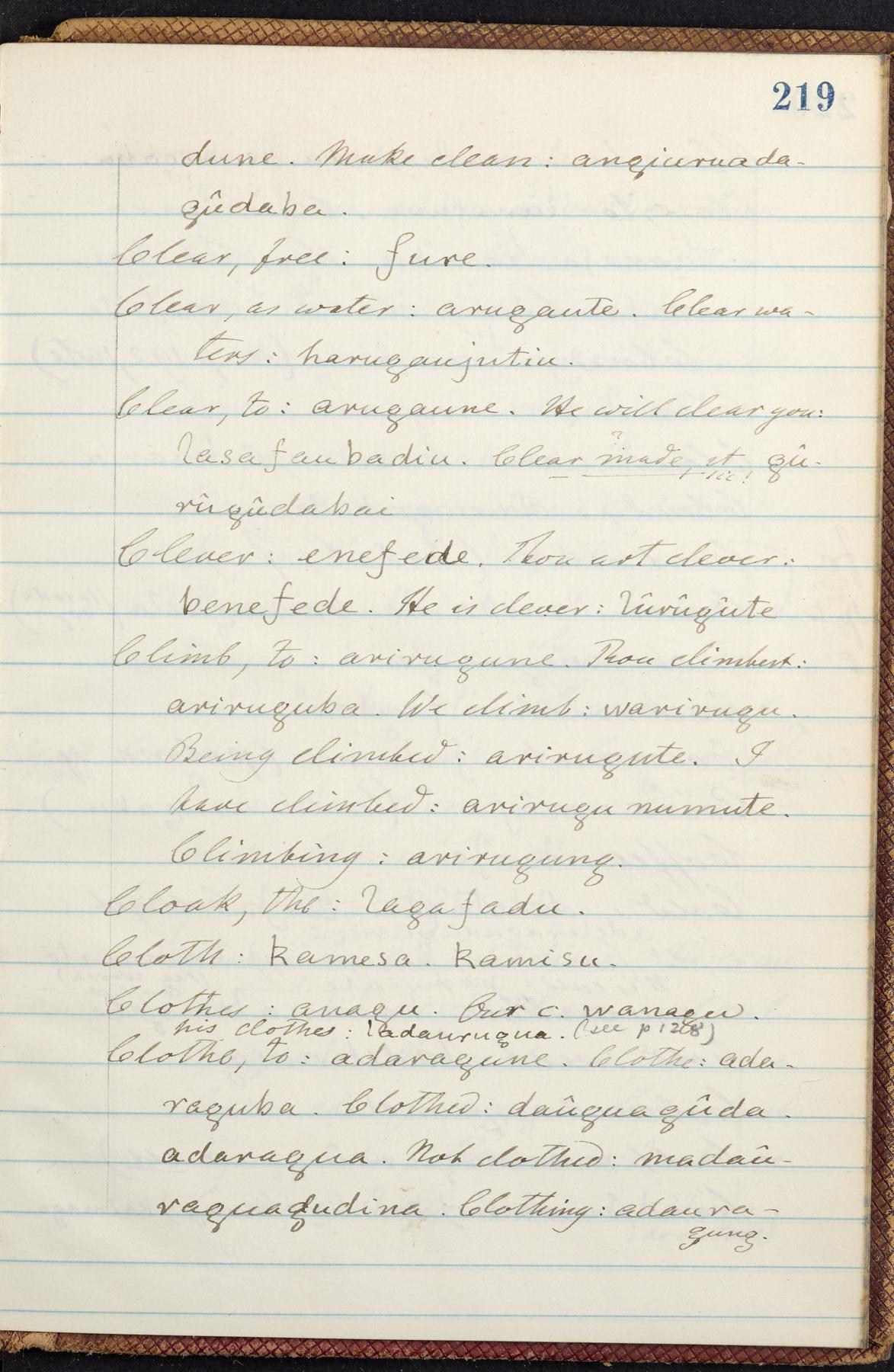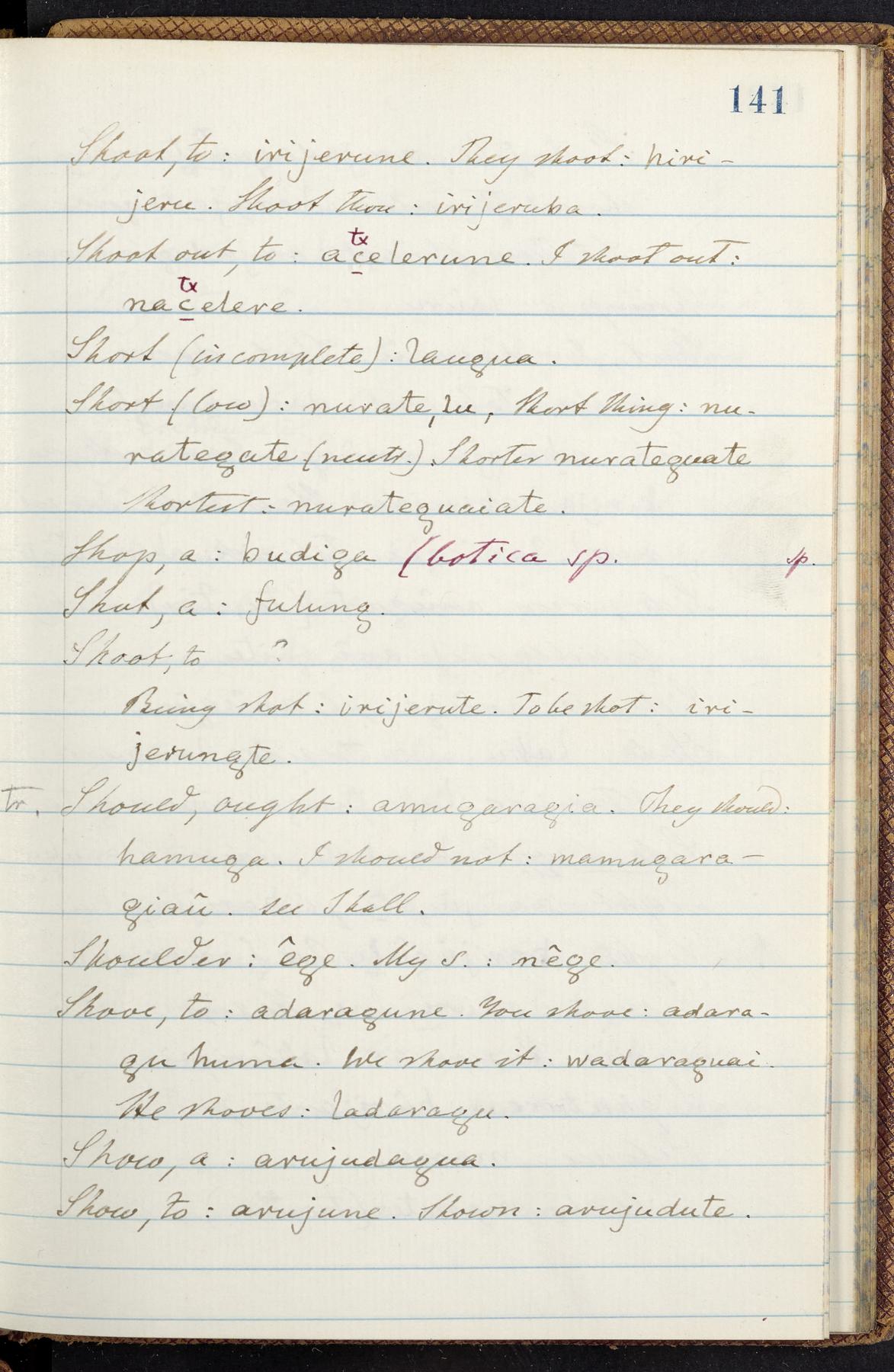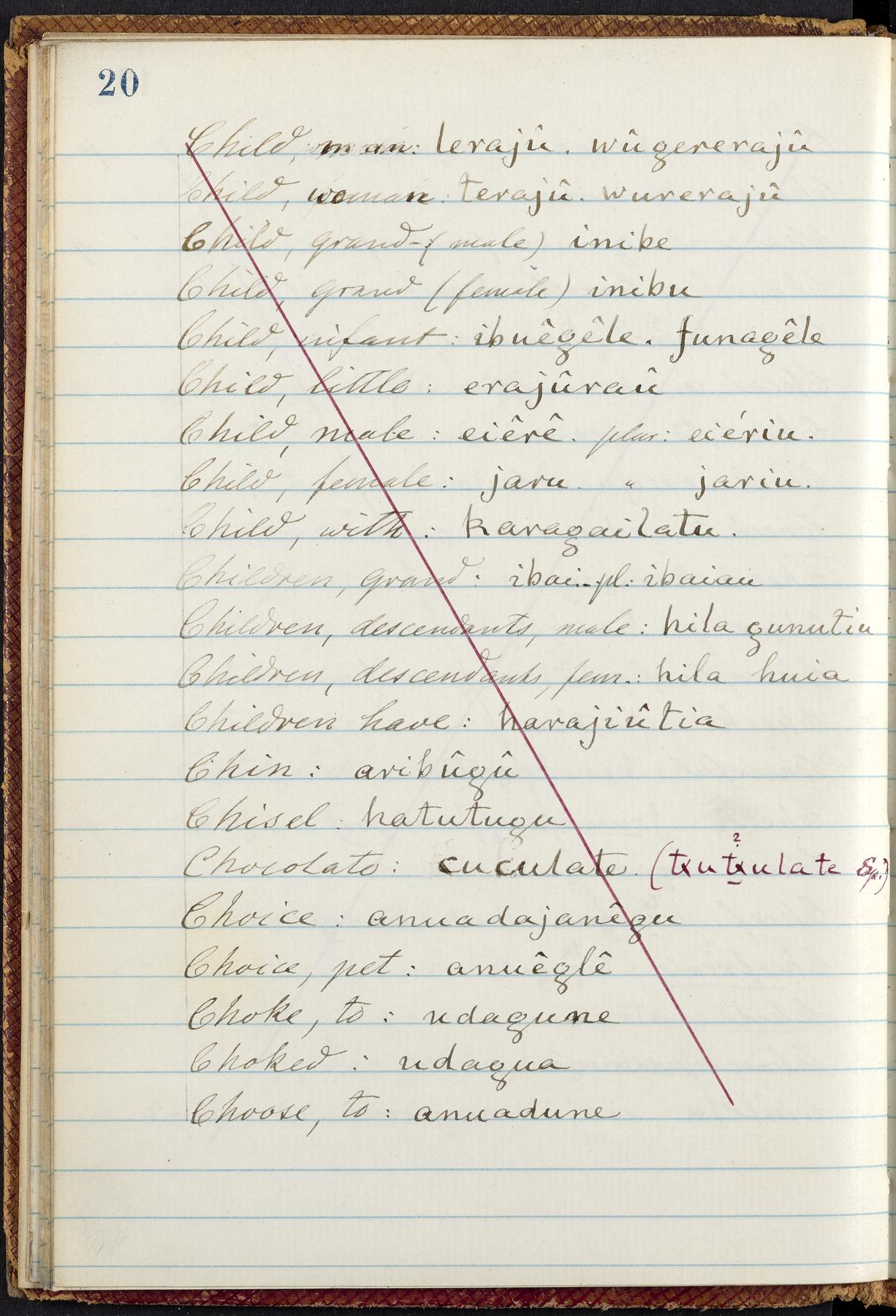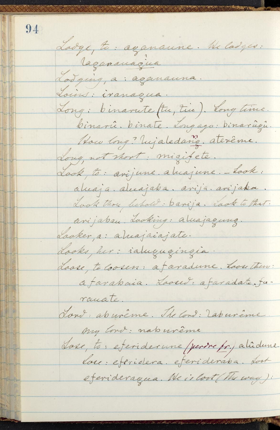C. Hermann Berendt's transcription, in a notebook of lined paper, of a dictionary of English and Garifuna (Karif), written by Alexander Henderson, documenting the Garifuna language as spoken in the coastal areas around the Gulf (Bay) of Honduras. The dictionary comprised part of a larger manuscript by Henderson on the Garifuna language, which he wrote at the request of Berendt, on the basis of material accumulated years before. For Berendt's copy of the grammar contained in that larger manuscript, see Ms. Coll. 700, Item 126. In the preface (p. III-IV), Henderson specifies that the coastal area in which the language was spoken extended from Belize southward to a town named Littlerock on the Mosquito (Moskito) shore (either northeastern Honduras or Nicaragua). His remarks on the Garifuna people and language include mention of their being moved by the British in 1796 from the island of Saint Vincent to the island of Roatán, and their later migration to the mainland. He also characterizes them as a branch of the Carib Indians originating in a region 75 miles north of Belize. In an extensive footnote (p. 226-231), Berendt takes pains to discount the latter theory about the origin of the Garifuna, quoting a long passage from a letter Henderson wrote him (dated 26 December 1872) in which the theory plays a role, and then describing the regions to the north, in which the Maya language predominates. The early pages of the dictionary (to mid p. 26) are crossed out by Berendt with a diagonal slash across the page, and the reader is referred to the back of the book, where he has revised these pages (p. 187-225). Whereas the crossed-out version is spare, presenting mainly single-word Garifuna equivalents for English words, the revised version, with slightly more entries, often includes examples of usage, especially for verbs. In the rest of the dictionary (p. 26-185), this expanded style of presentation is used. In a note tipped in (verso of title page), Berendt indicates that he has made additions in blue ink taken from a manuscript vocabulary prepared by Henderson for Berendt's comparative vocabulary of languages spoken between the Isthmus of Tehuantepec and Honduras; such blue-ink additions are not evident (the manuscript by Henderson that Berendt refers to here appears to correspond to Ms. Coll. 700, Item 135). The December 1872 letter from Henderson cited above (1 bifolium), along with 4 additional letters from him to Berendt (dated 16 May, 30 May, and 18 October 1871, and 28 July 1873; 1 leaf and 3 bifolia), as well as Berendt's drafts of 2 letters of his to Henderson (dated 20 November 1871 and October 1872, 2 bifolia), are among items that were tipped in or laid in, and are now housed in a separate folder shelved with the manuscript. Besides the Garifuna manuscript, topics of the correspondence include Henderson's manuscript for the comparative vocabulary (referred to above, and described in Henderson's letters of May 1871 as a vocabulary of 600 words); and a vocabulary of the Tawahka (Twaka) Indians that he sent to Berendt, which was originally collected by a certain merchant Mr. Haly. Henderson's original pages of the latter vocabulary, with a few words from the San Blas Indians, are also among the items in the folder shelved with the manuscript (2 bifolia that originally formed a 4-leaf gathering; 2 pages concern Karif). For Berendt's transcription of the Tawahka vocabulary, see Ms. Coll. 700, Item 133; and for his transcription of the vocabulary of the San Blas Indians, see Ms. Coll. 700, Item 164.