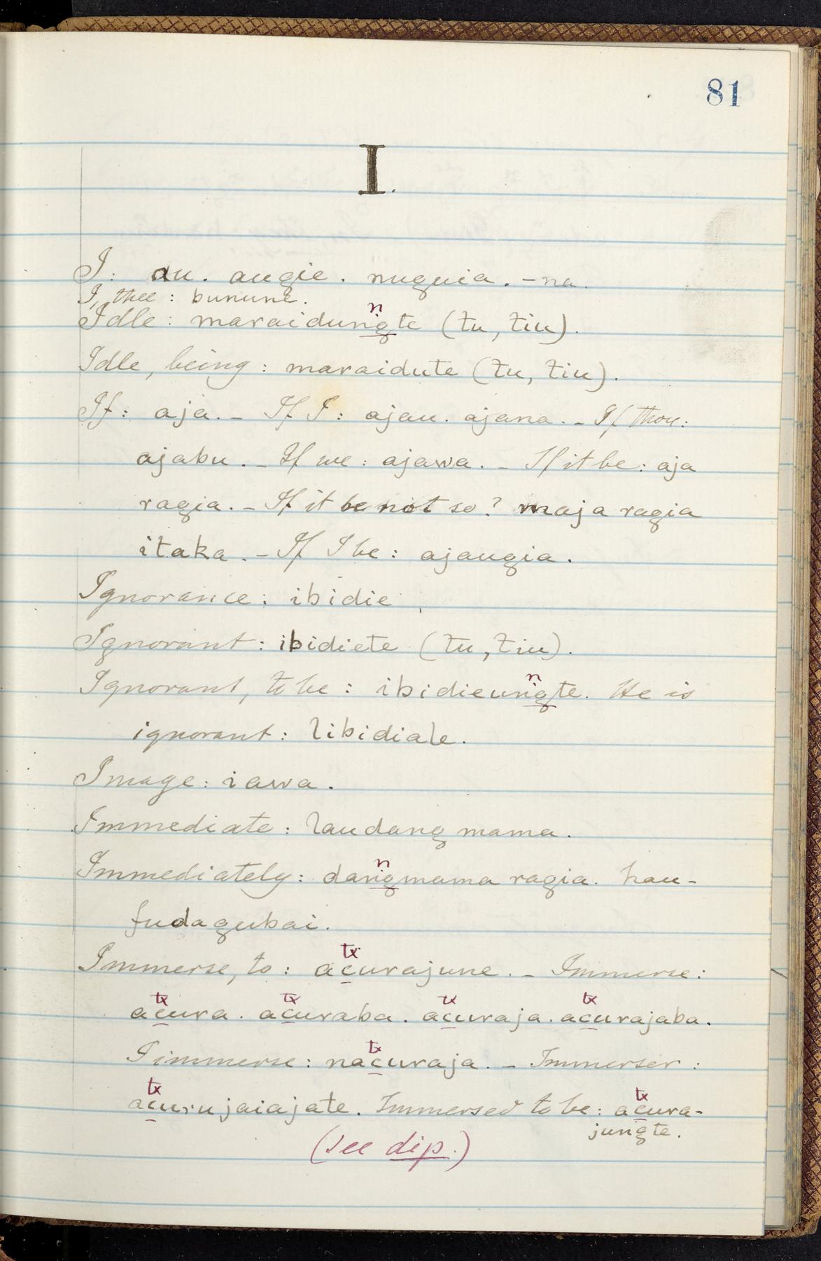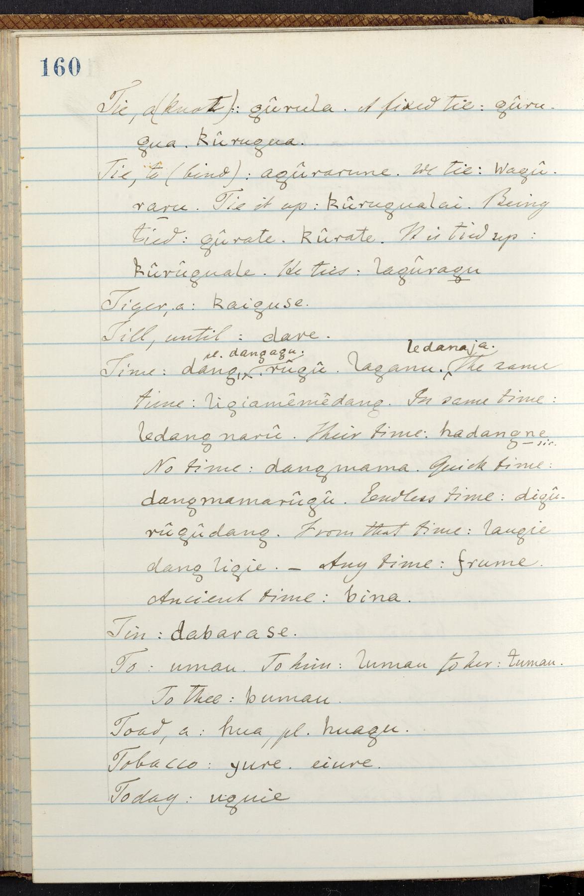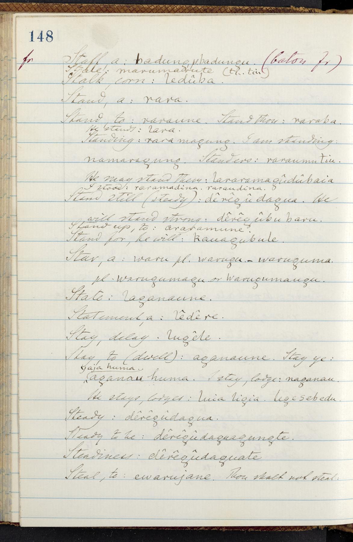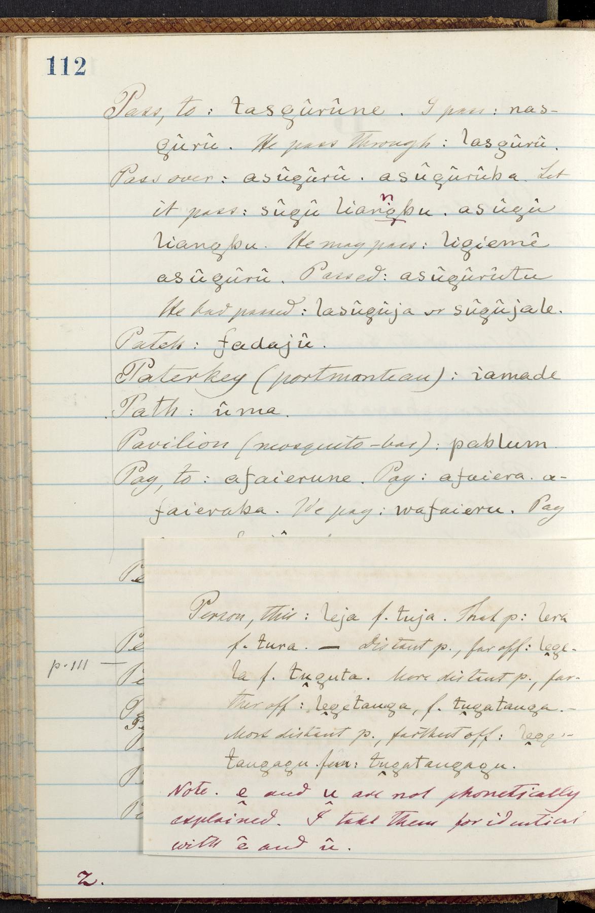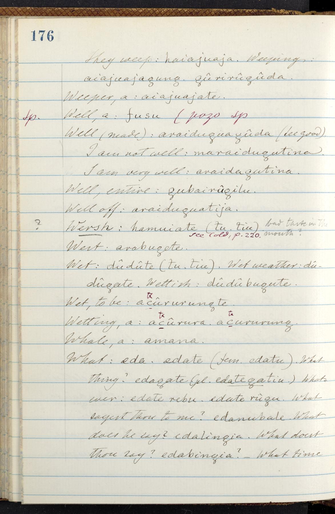 C. Hermann Berendt's transcription, in a notebook of lined paper, of a dictionary of English and Garifuna (Karif), written by Alexander Henderson, documenting the Garifuna language as spoken in the coastal areas around the Gulf (Bay) of Honduras. The dictionary comprised part of a larger manuscript by Henderson on the Garifuna language, which he wrote at the request of Berendt, on the basis of material accumulated years before. For Berendt's copy of the grammar contained in that larger manuscript, see Ms. Coll. 700, Item 126. In the preface (p. III-IV), Henderson specifies that the coastal area in which the language was spoken extended from Belize southward to a town named Littlerock on the Mosquito (Moskito) shore (either northeastern Honduras or Nicaragua). His remarks on the Garifuna people and language include mention of their being moved by the British in 1796 from the island of Saint Vincent to the island of Roatán, and their later migration to the mainland. He also characterizes them as a branch of the Carib Indians originating in a region 75 miles north of Belize. In an extensive footnote (p. 226-231), Berendt takes pains to discount the latter theory about the origin of the Garifuna, quoting a long passage from a letter Henderson wrote him (dated 26 December 1872) in which the theory plays a role, and then describing the regions to the north, in which the Maya language predominates. The early pages of the dictionary (to mid p. 26) are crossed out by Berendt with a diagonal slash across the page, and the reader is referred to the back of the book, where he has revised these pages (p. 187-225). Whereas the crossed-out version is spare, presenting mainly single-word Garifuna equivalents for English words, the revised version, with slightly more entries, often includes examples of usage, especially for verbs. In the rest of the dictionary (p. 26-185), this expanded style of presentation is used. In a note tipped in (verso of title page), Berendt indicates that he has made additions in blue ink taken from a manuscript vocabulary prepared by Henderson for Berendt's comparative vocabulary of languages spoken between the Isthmus of Tehuantepec and Honduras; such blue-ink additions are not evident (the manuscript by Henderson that Berendt refers to here appears to correspond to Ms. Coll. 700, Item 135). The December 1872 letter from Henderson cited above (1 bifolium), along with 4 additional letters from him to Berendt (dated 16 May, 30 May, and 18 October 1871, and 28 July 1873; 1 leaf and 3 bifolia), as well as Berendt's drafts of 2 letters of his to Henderson (dated 20 November 1871 and October 1872, 2 bifolia), are among items that were tipped in or laid in, and are now housed in a separate folder shelved with the manuscript. Besides the Garifuna manuscript, topics of the correspondence include Henderson's manuscript for the comparative vocabulary (referred to above, and described in Henderson's letters of May 1871 as a vocabulary of 600 words); and a vocabulary of the Tawahka (Twaka) Indians that he sent to Berendt, which was originally collected by a certain merchant Mr. Haly. Henderson's original pages of the latter vocabulary, with a few words from the San Blas Indians, are also among the items in the folder shelved with the manuscript (2 bifolia that originally formed a 4-leaf gathering; 2 pages concern Karif). For Berendt's transcription of the Tawahka vocabulary, see Ms. Coll. 700, Item 133; and for his transcription of the vocabulary of the San Blas Indians, see Ms. Coll. 700, Item 164.