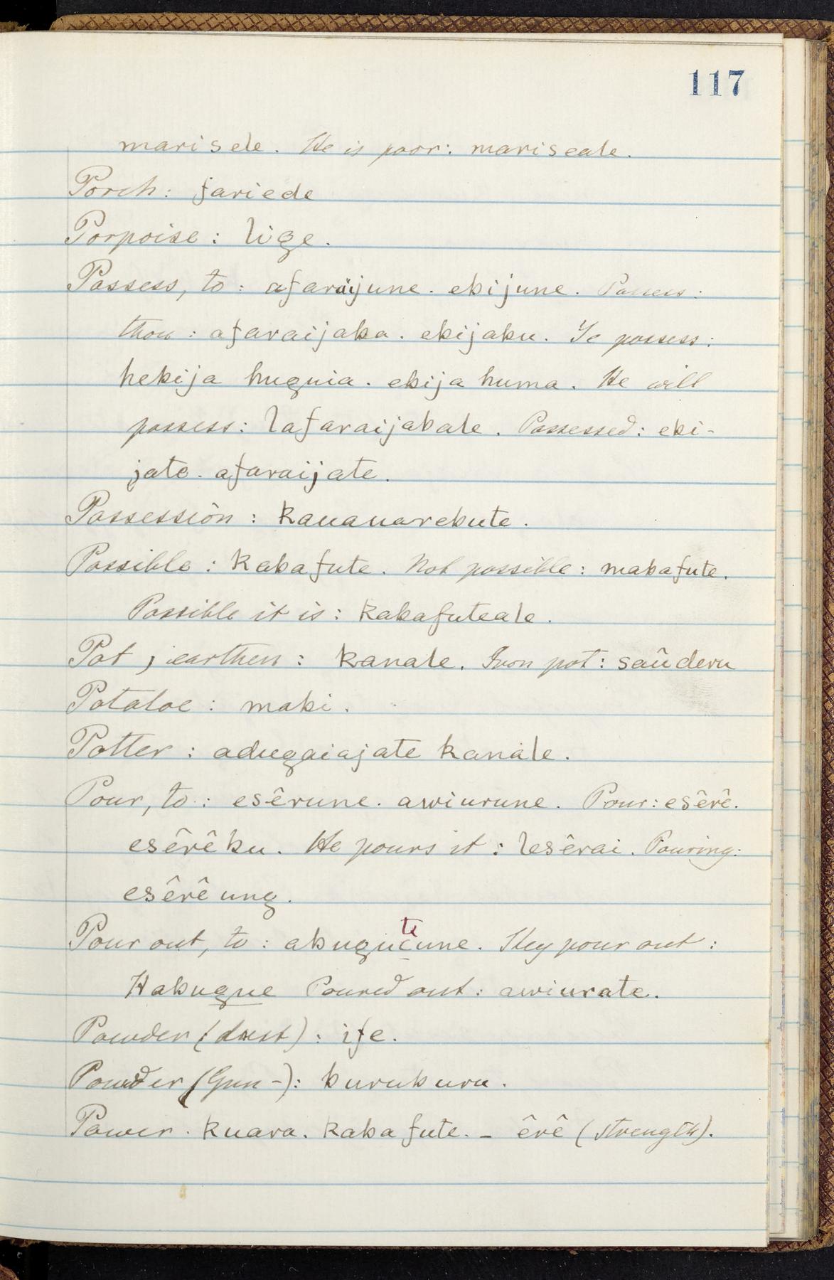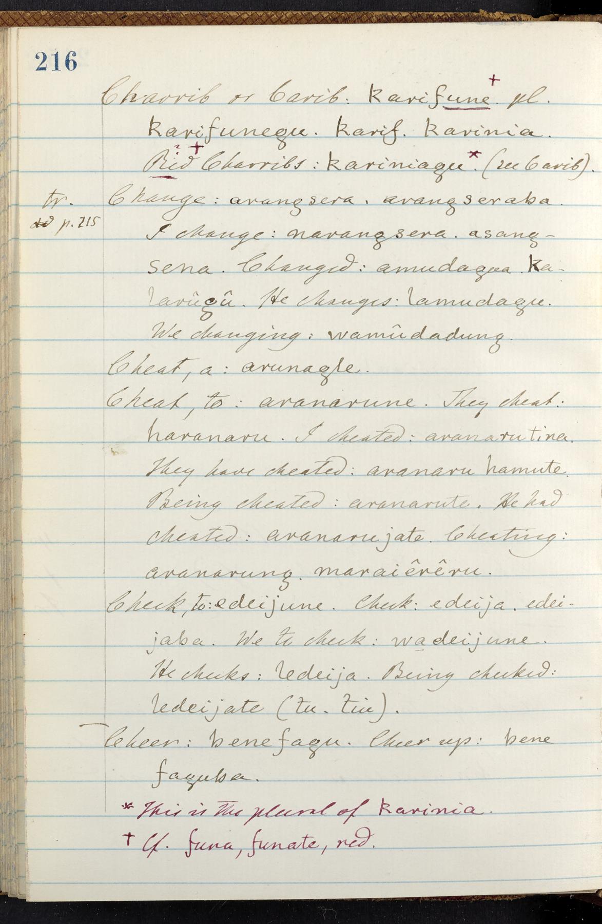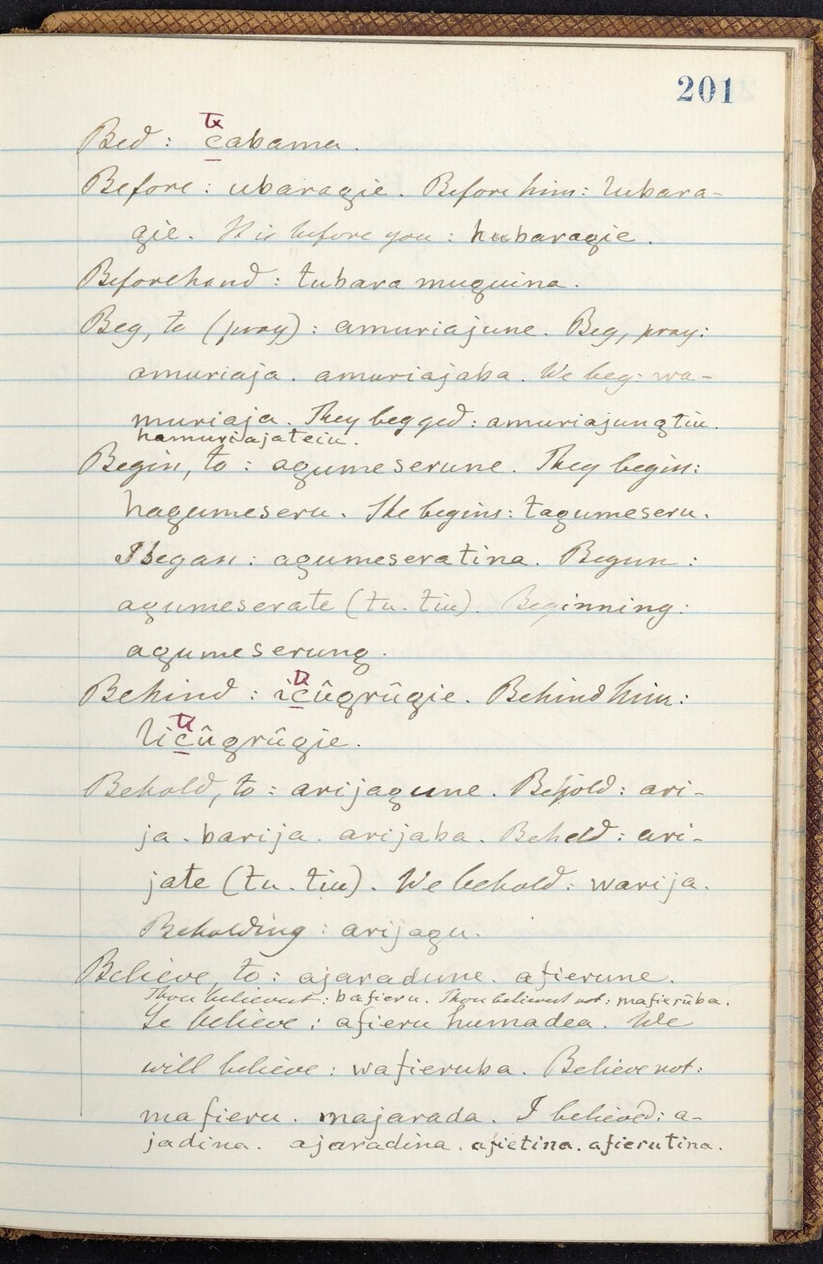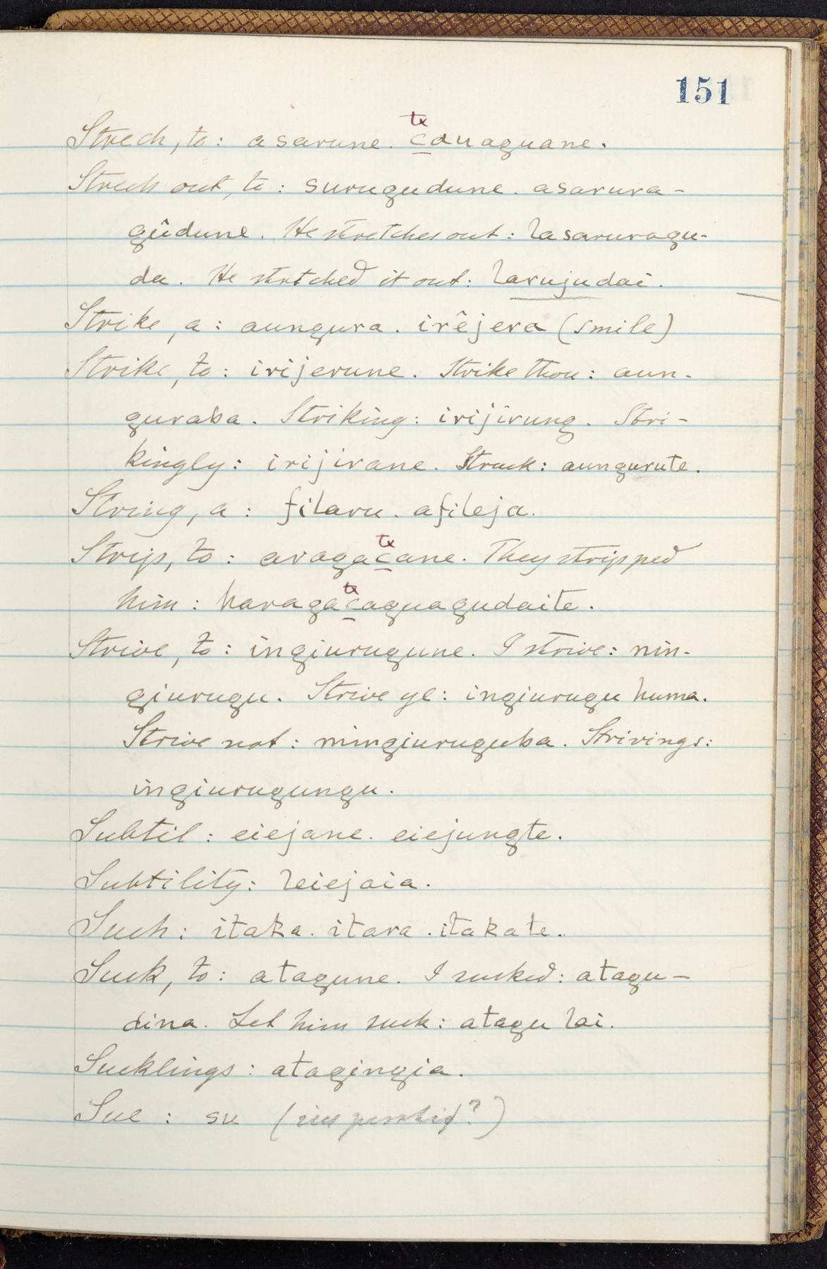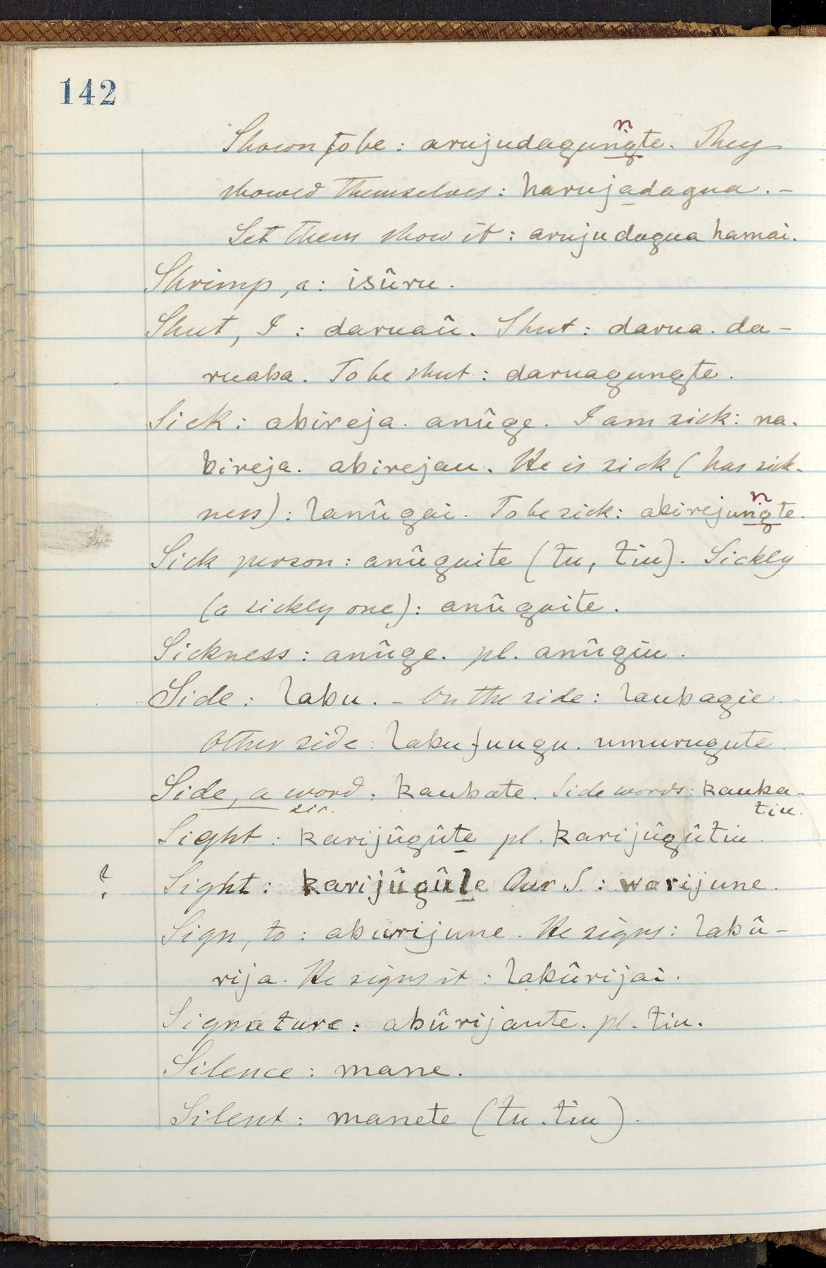 C. Hermann Berendt's transcription, in a notebook of lined paper, of a dictionary of English and Garifuna (Karif), written by Alexander Henderson, documenting the Garifuna language as spoken in the coastal areas around the Gulf (Bay) of Honduras. The dictionary comprised part of a larger manuscript by Henderson on the Garifuna language, which he wrote at the request of Berendt, on the basis of material accumulated years before. For Berendt's copy of the grammar contained in that larger manuscript, see Ms. Coll. 700, Item 126. In the preface (p. III-IV), Henderson specifies that the coastal area in which the language was spoken extended from Belize southward to a town named Littlerock on the Mosquito (Moskito) shore (either northeastern Honduras or Nicaragua). His remarks on the Garifuna people and language include mention of their being moved by the British in 1796 from the island of Saint Vincent to the island of Roatán, and their later migration to the mainland. He also characterizes them as a branch of the Carib Indians originating in a region 75 miles north of Belize. In an extensive footnote (p. 226-231), Berendt takes pains to discount the latter theory about the origin of the Garifuna, quoting a long passage from a letter Henderson wrote him (dated 26 December 1872) in which the theory plays a role, and then describing the regions to the north, in which the Maya language predominates. The early pages of the dictionary (to mid p. 26) are crossed out by Berendt with a diagonal slash across the page, and the reader is referred to the back of the book, where he has revised these pages (p. 187-225). Whereas the crossed-out version is spare, presenting mainly single-word Garifuna equivalents for English words, the revised version, with slightly more entries, often includes examples of usage, especially for verbs. In the rest of the dictionary (p. 26-185), this expanded style of presentation is used. In a note tipped in (verso of title page), Berendt indicates that he has made additions in blue ink taken from a manuscript vocabulary prepared by Henderson for Berendt's comparative vocabulary of languages spoken between the Isthmus of Tehuantepec and Honduras; such blue-ink additions are not evident (the manuscript by Henderson that Berendt refers to here appears to correspond to Ms. Coll. 700, Item 135). The December 1872 letter from Henderson cited above (1 bifolium), along with 4 additional letters from him to Berendt (dated 16 May, 30 May, and 18 October 1871, and 28 July 1873; 1 leaf and 3 bifolia), as well as Berendt's drafts of 2 letters of his to Henderson (dated 20 November 1871 and October 1872, 2 bifolia), are among items that were tipped in or laid in, and are now housed in a separate folder shelved with the manuscript. Besides the Garifuna manuscript, topics of the correspondence include Henderson's manuscript for the comparative vocabulary (referred to above, and described in Henderson's letters of May 1871 as a vocabulary of 600 words); and a vocabulary of the Tawahka (Twaka) Indians that he sent to Berendt, which was originally collected by a certain merchant Mr. Haly. Henderson's original pages of the latter vocabulary, with a few words from the San Blas Indians, are also among the items in the folder shelved with the manuscript (2 bifolia that originally formed a 4-leaf gathering; 2 pages concern Karif). For Berendt's transcription of the Tawahka vocabulary, see Ms. Coll. 700, Item 133; and for his transcription of the vocabulary of the San Blas Indians, see Ms. Coll. 700, Item 164.