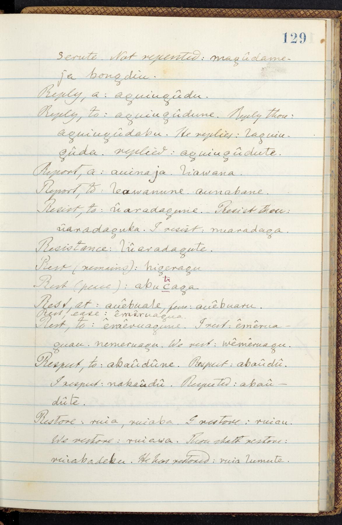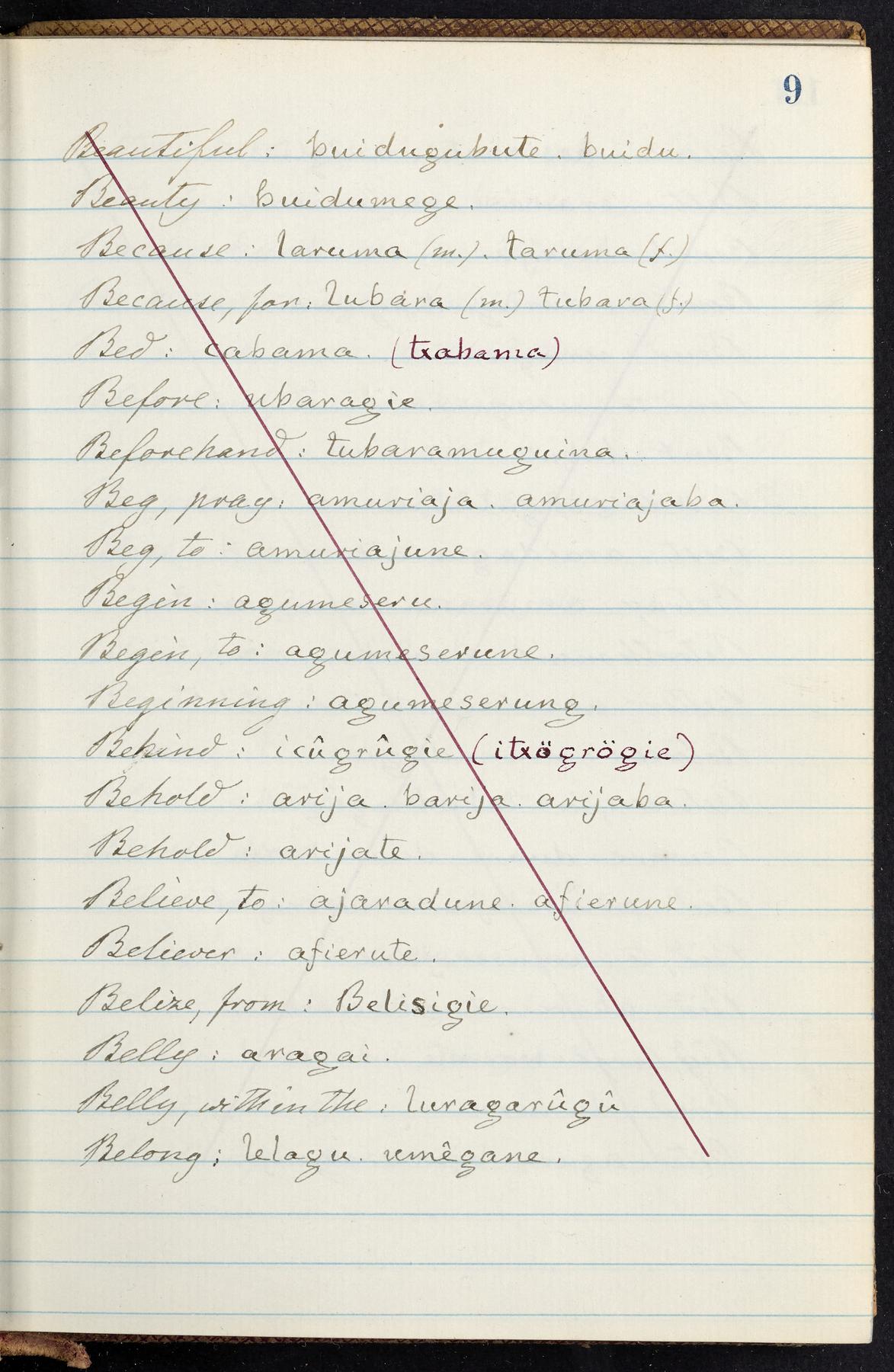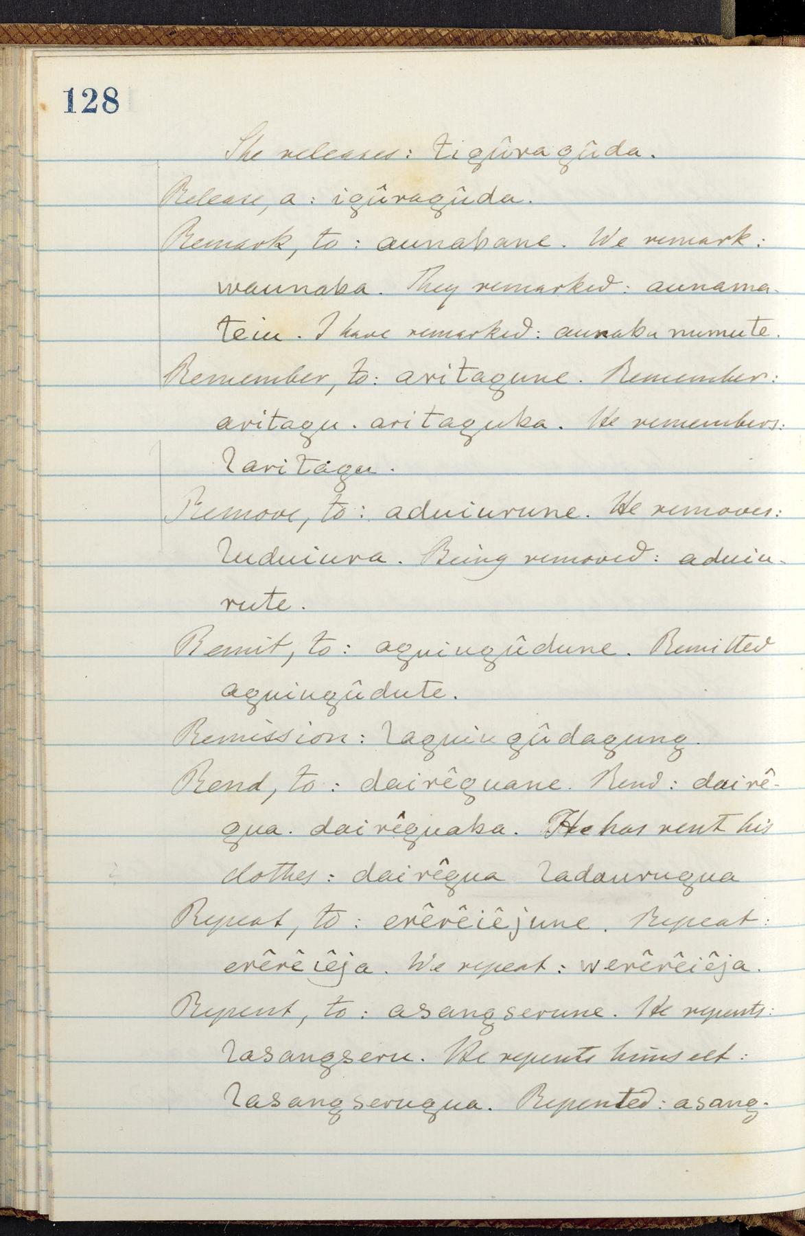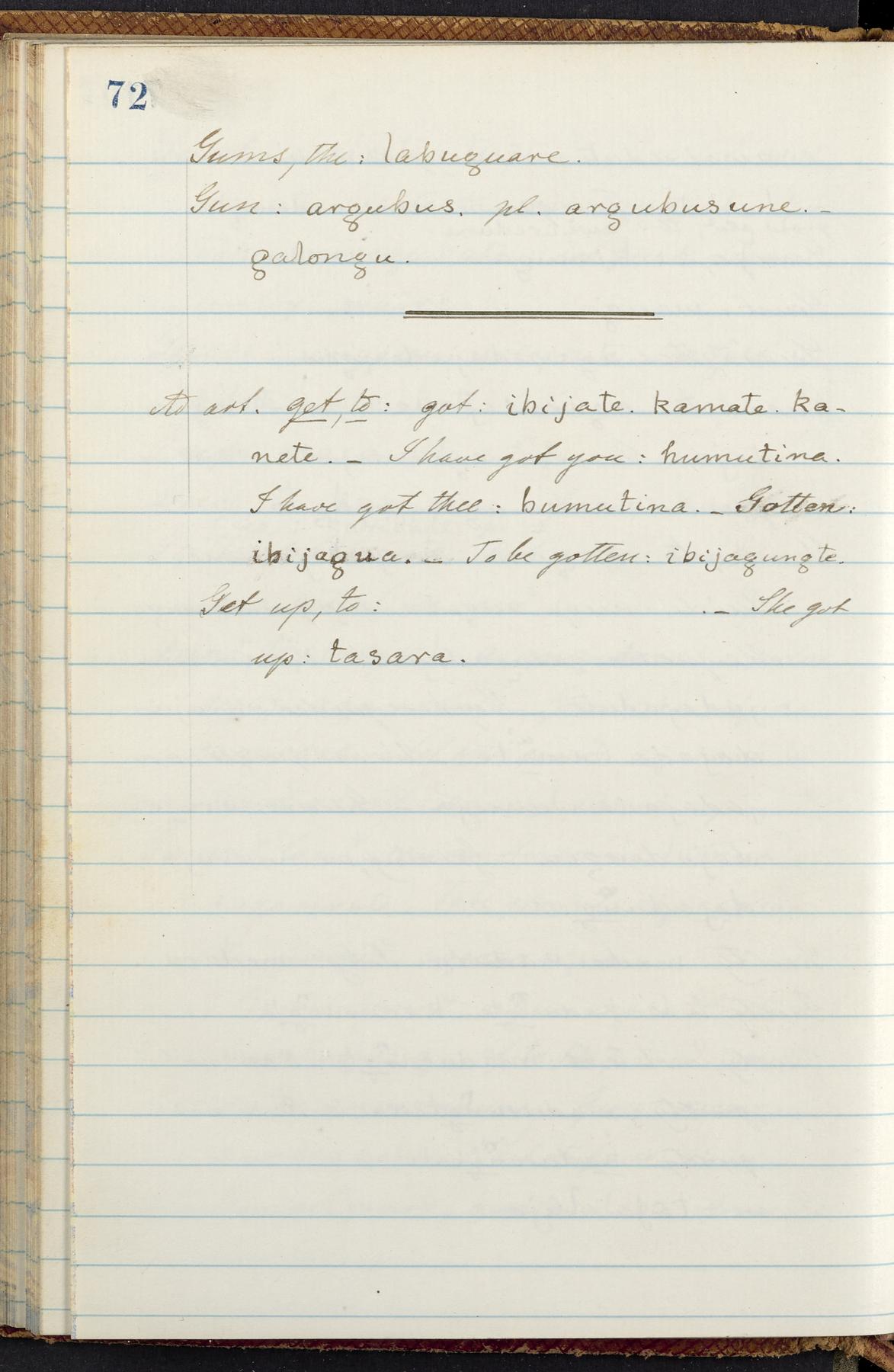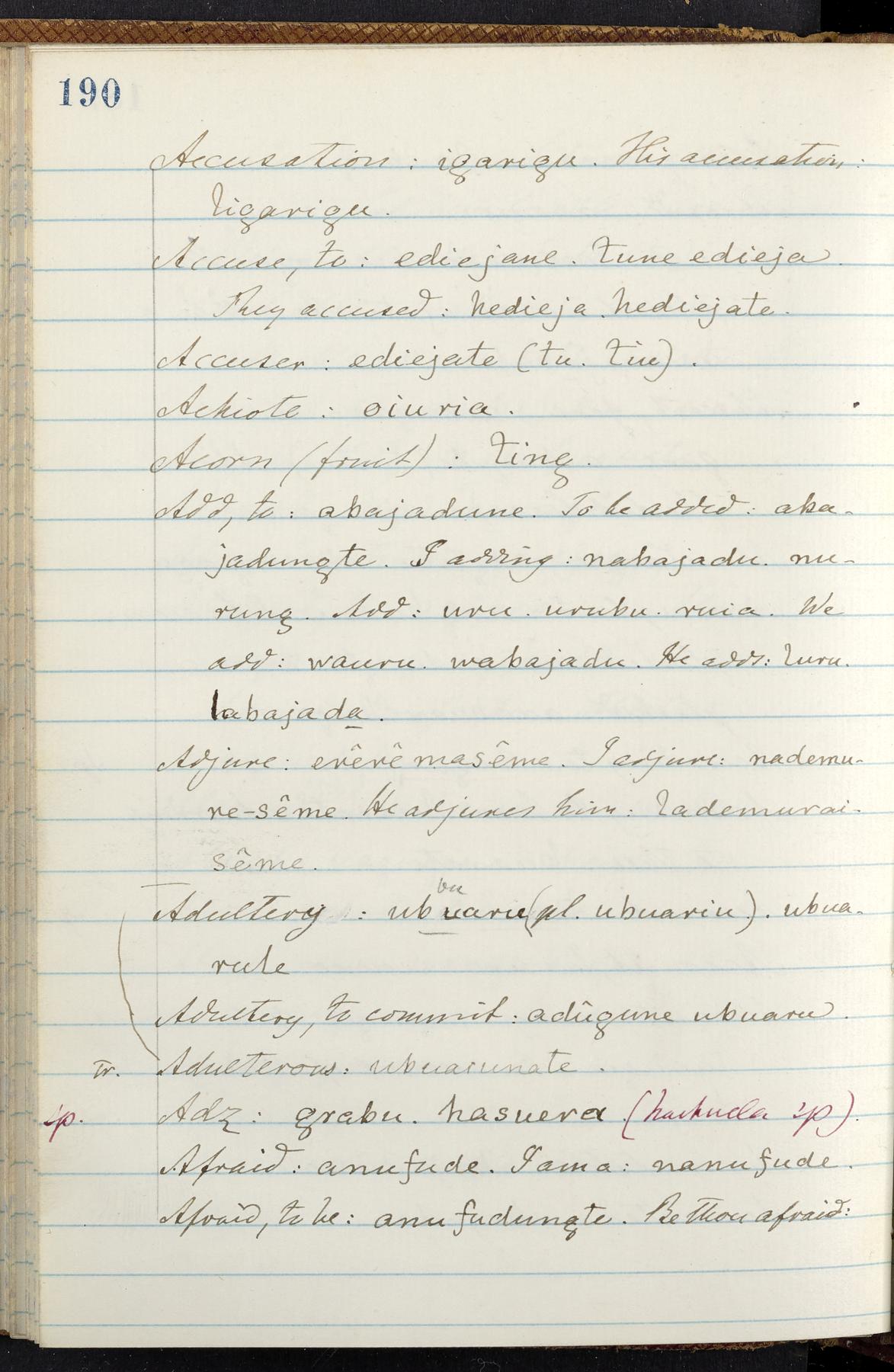 C. Hermann Berendt's transcription, in a notebook of lined paper, of a dictionary of English and Garifuna (Karif), written by Alexander Henderson, documenting the Garifuna language as spoken in the coastal areas around the Gulf (Bay) of Honduras. The dictionary comprised part of a larger manuscript by Henderson on the Garifuna language, which he wrote at the request of Berendt, on the basis of material accumulated years before. For Berendt's copy of the grammar contained in that larger manuscript, see Ms. Coll. 700, Item 126. In the preface (p. III-IV), Henderson specifies that the coastal area in which the language was spoken extended from Belize southward to a town named Littlerock on the Mosquito (Moskito) shore (either northeastern Honduras or Nicaragua). His remarks on the Garifuna people and language include mention of their being moved by the British in 1796 from the island of Saint Vincent to the island of Roatán, and their later migration to the mainland. He also characterizes them as a branch of the Carib Indians originating in a region 75 miles north of Belize. In an extensive footnote (p. 226-231), Berendt takes pains to discount the latter theory about the origin of the Garifuna, quoting a long passage from a letter Henderson wrote him (dated 26 December 1872) in which the theory plays a role, and then describing the regions to the north, in which the Maya language predominates. The early pages of the dictionary (to mid p. 26) are crossed out by Berendt with a diagonal slash across the page, and the reader is referred to the back of the book, where he has revised these pages (p. 187-225). Whereas the crossed-out version is spare, presenting mainly single-word Garifuna equivalents for English words, the revised version, with slightly more entries, often includes examples of usage, especially for verbs. In the rest of the dictionary (p. 26-185), this expanded style of presentation is used. In a note tipped in (verso of title page), Berendt indicates that he has made additions in blue ink taken from a manuscript vocabulary prepared by Henderson for Berendt's comparative vocabulary of languages spoken between the Isthmus of Tehuantepec and Honduras; such blue-ink additions are not evident (the manuscript by Henderson that Berendt refers to here appears to correspond to Ms. Coll. 700, Item 135). The December 1872 letter from Henderson cited above (1 bifolium), along with 4 additional letters from him to Berendt (dated 16 May, 30 May, and 18 October 1871, and 28 July 1873; 1 leaf and 3 bifolia), as well as Berendt's drafts of 2 letters of his to Henderson (dated 20 November 1871 and October 1872, 2 bifolia), are among items that were tipped in or laid in, and are now housed in a separate folder shelved with the manuscript. Besides the Garifuna manuscript, topics of the correspondence include Henderson's manuscript for the comparative vocabulary (referred to above, and described in Henderson's letters of May 1871 as a vocabulary of 600 words); and a vocabulary of the Tawahka (Twaka) Indians that he sent to Berendt, which was originally collected by a certain merchant Mr. Haly. Henderson's original pages of the latter vocabulary, with a few words from the San Blas Indians, are also among the items in the folder shelved with the manuscript (2 bifolia that originally formed a 4-leaf gathering; 2 pages concern Karif). For Berendt's transcription of the Tawahka vocabulary, see Ms. Coll. 700, Item 133; and for his transcription of the vocabulary of the San Blas Indians, see Ms. Coll. 700, Item 164.