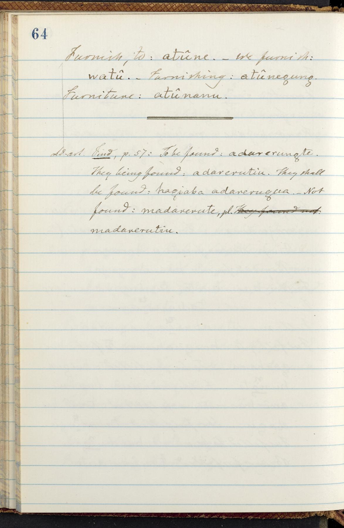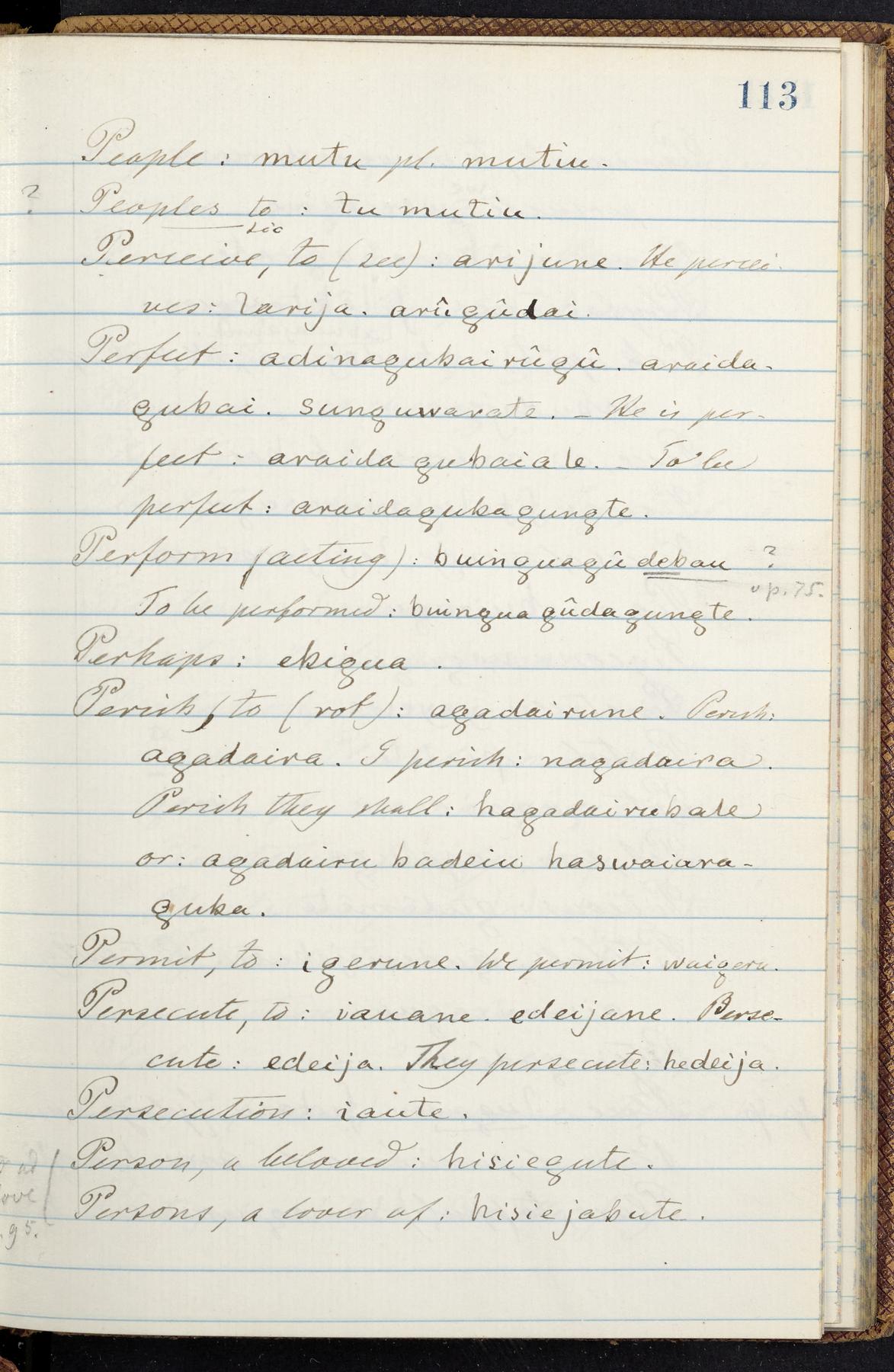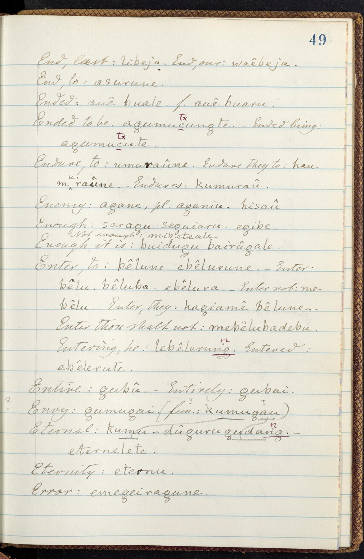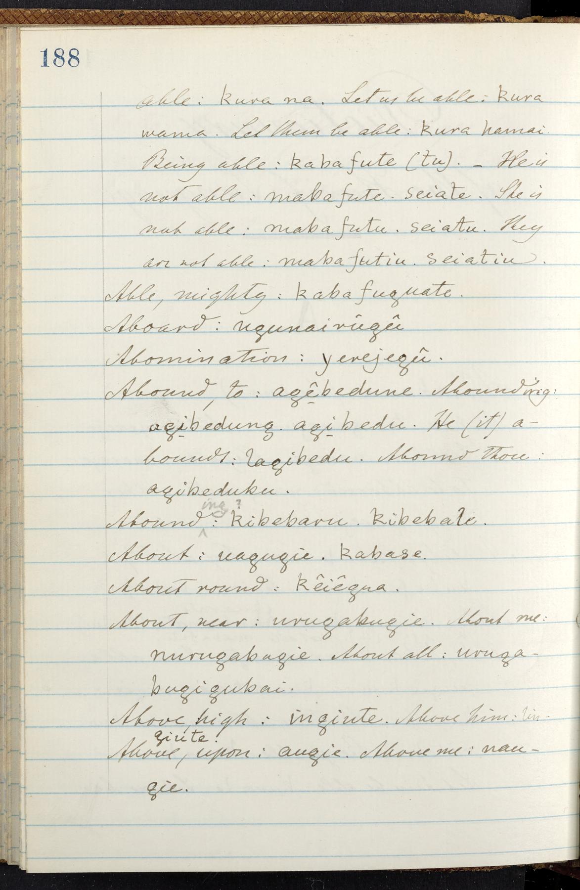 C. Hermann Berendt's transcription, in a notebook of lined paper, of a dictionary of English and Garifuna (Karif), written by Alexander Henderson, documenting the Garifuna language as spoken in the coastal areas around the Gulf (Bay) of Honduras. The dictionary comprised part of a larger manuscript by Henderson on the Garifuna language, which he wrote at the request of Berendt, on the basis of material accumulated years before. For Berendt's copy of the grammar contained in that larger manuscript, see Ms. Coll. 700, Item 126. In the preface (p. III-IV), Henderson specifies that the coastal area in which the language was spoken extended from Belize southward to a town named Littlerock on the Mosquito (Moskito) shore (either northeastern Honduras or Nicaragua). His remarks on the Garifuna people and language include mention of their being moved by the British in 1796 from the island of Saint Vincent to the island of Roatán, and their later migration to the mainland. He also characterizes them as a branch of the Carib Indians originating in a region 75 miles north of Belize. In an extensive footnote (p. 226-231), Berendt takes pains to discount the latter theory about the origin of the Garifuna, quoting a long passage from a letter Henderson wrote him (dated 26 December 1872) in which the theory plays a role, and then describing the regions to the north, in which the Maya language predominates. The early pages of the dictionary (to mid p. 26) are crossed out by Berendt with a diagonal slash across the page, and the reader is referred to the back of the book, where he has revised these pages (p. 187-225). Whereas the crossed-out version is spare, presenting mainly single-word Garifuna equivalents for English words, the revised version, with slightly more entries, often includes examples of usage, especially for verbs. In the rest of the dictionary (p. 26-185), this expanded style of presentation is used. In a note tipped in (verso of title page), Berendt indicates that he has made additions in blue ink taken from a manuscript vocabulary prepared by Henderson for Berendt's comparative vocabulary of languages spoken between the Isthmus of Tehuantepec and Honduras; such blue-ink additions are not evident (the manuscript by Henderson that Berendt refers to here appears to correspond to Ms. Coll. 700, Item 135). The December 1872 letter from Henderson cited above (1 bifolium), along with 4 additional letters from him to Berendt (dated 16 May, 30 May, and 18 October 1871, and 28 July 1873; 1 leaf and 3 bifolia), as well as Berendt's drafts of 2 letters of his to Henderson (dated 20 November 1871 and October 1872, 2 bifolia), are among items that were tipped in or laid in, and are now housed in a separate folder shelved with the manuscript. Besides the Garifuna manuscript, topics of the correspondence include Henderson's manuscript for the comparative vocabulary (referred to above, and described in Henderson's letters of May 1871 as a vocabulary of 600 words); and a vocabulary of the Tawahka (Twaka) Indians that he sent to Berendt, which was originally collected by a certain merchant Mr. Haly. Henderson's original pages of the latter vocabulary, with a few words from the San Blas Indians, are also among the items in the folder shelved with the manuscript (2 bifolia that originally formed a 4-leaf gathering; 2 pages concern Karif). For Berendt's transcription of the Tawahka vocabulary, see Ms. Coll. 700, Item 133; and for his transcription of the vocabulary of the San Blas Indians, see Ms. Coll. 700, Item 164.
