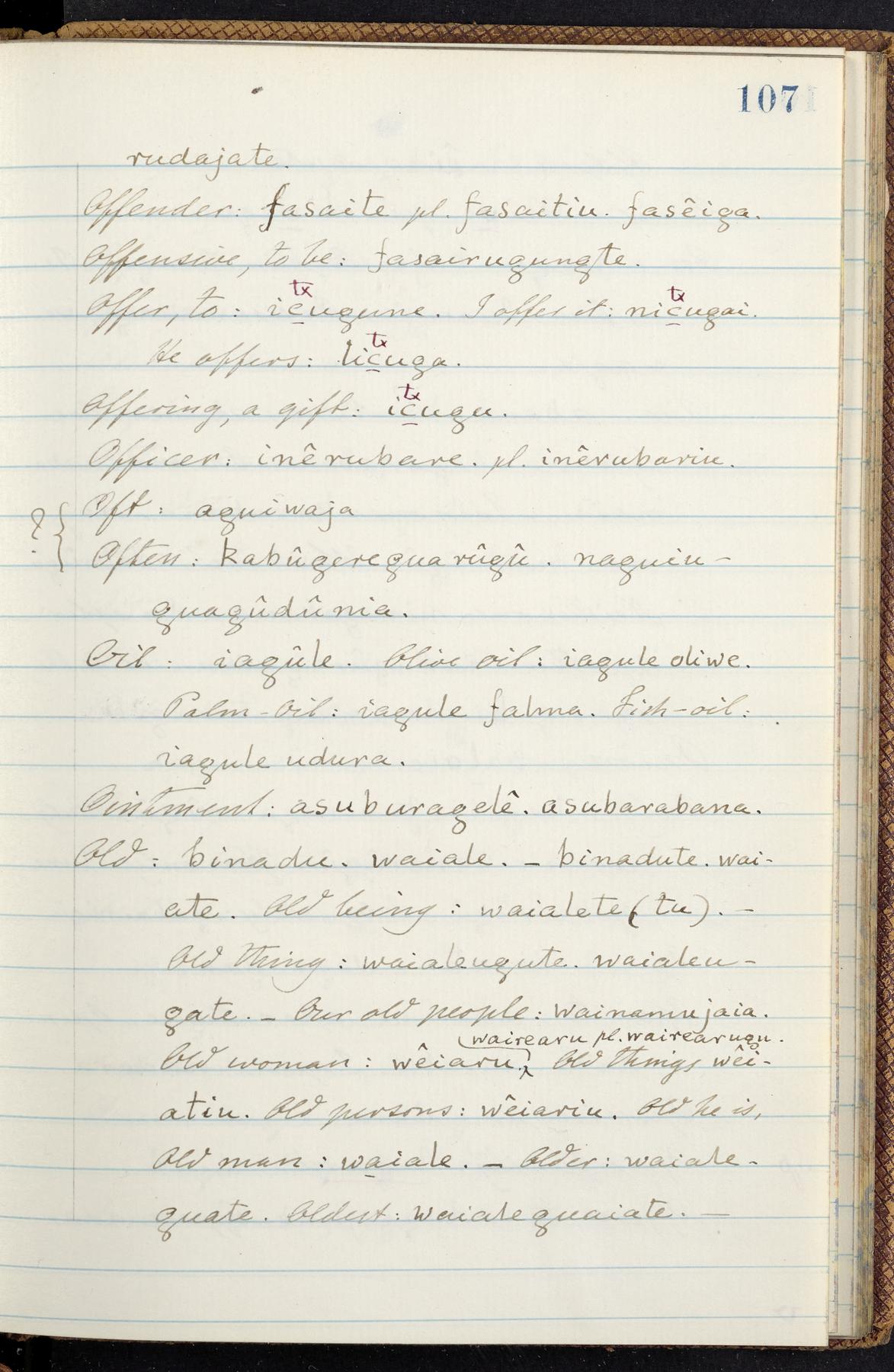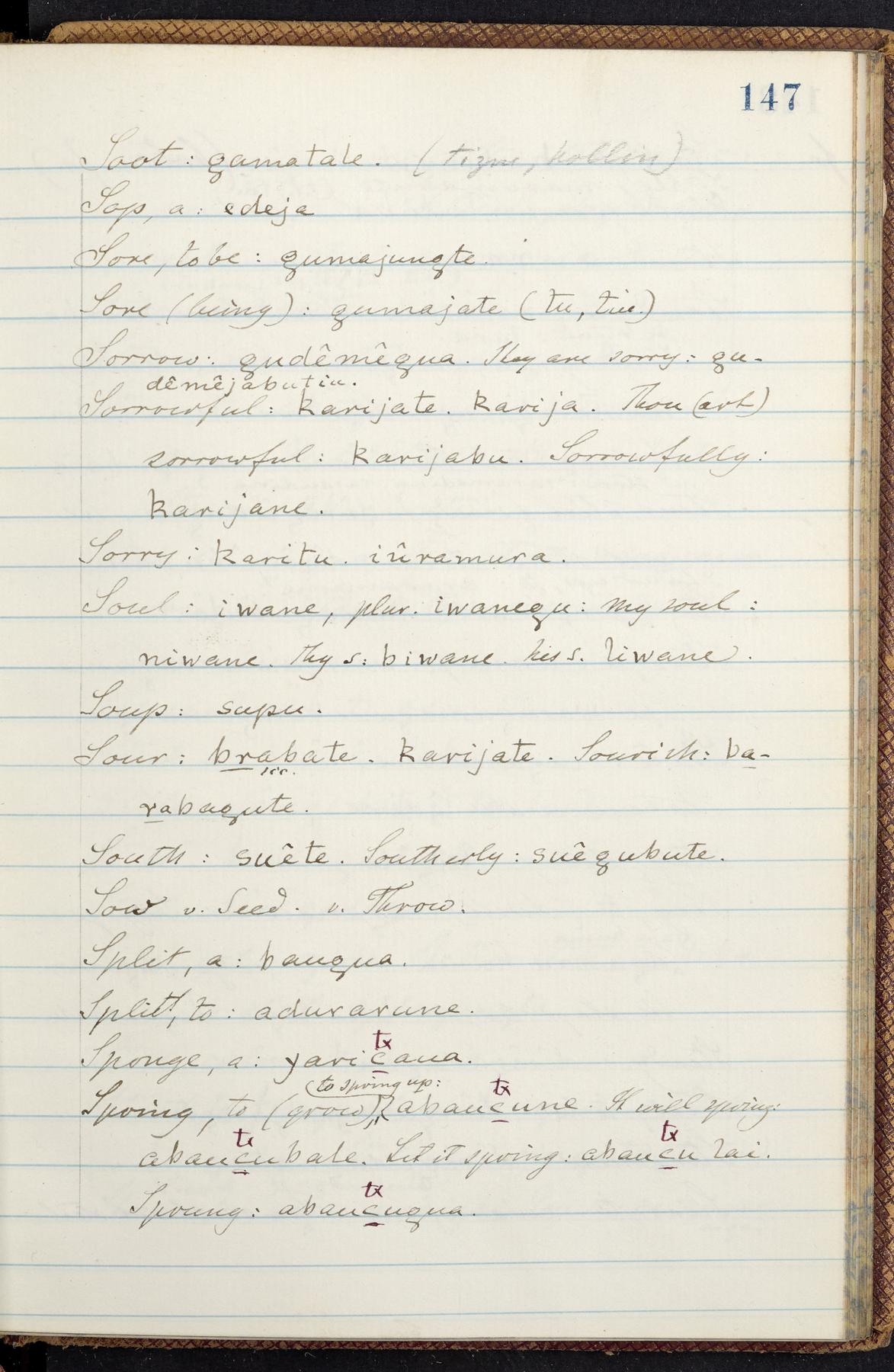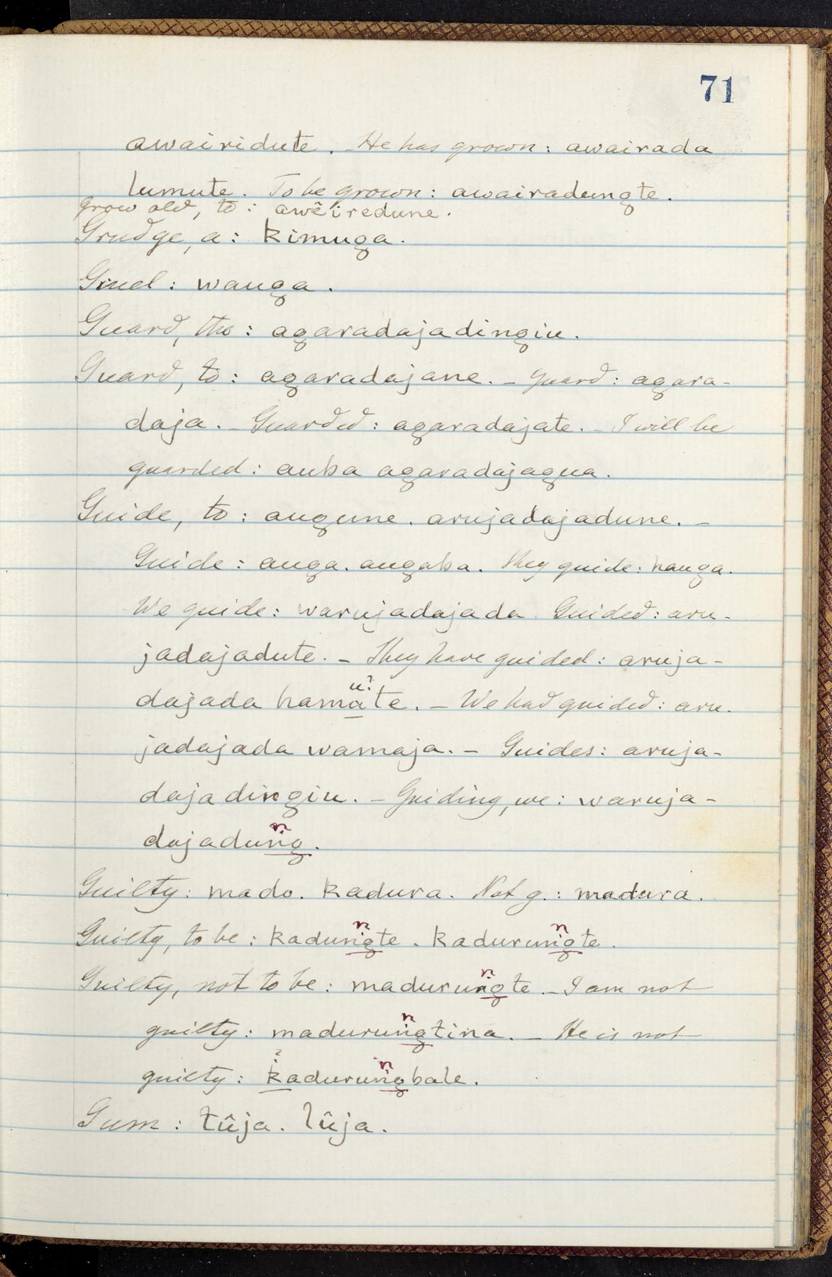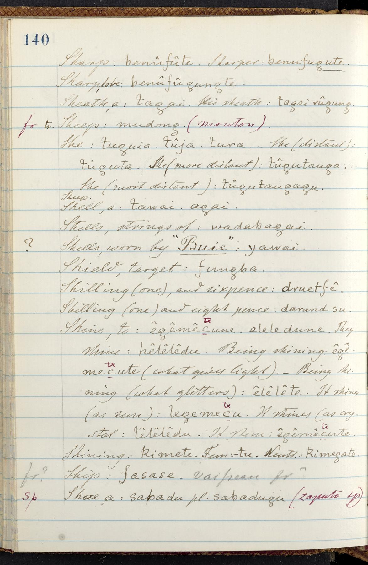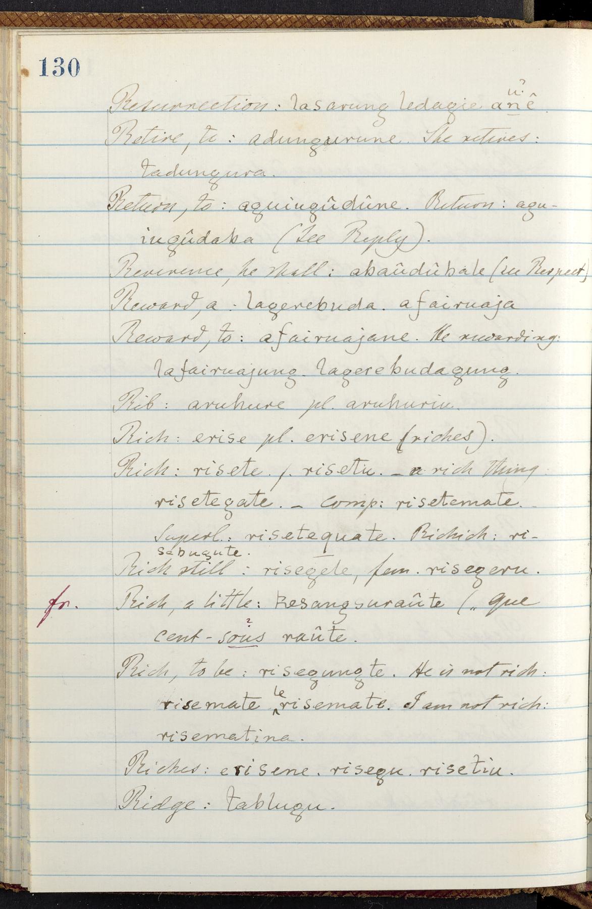C. Hermann Berendt's transcription, in a notebook of lined paper, of a dictionary of English and Garifuna (Karif), written by Alexander Henderson, documenting the Garifuna language as spoken in the coastal areas around the Gulf (Bay) of Honduras. The dictionary comprised part of a larger manuscript by Henderson on the Garifuna language, which he wrote at the request of Berendt, on the basis of material accumulated years before. For Berendt's copy of the grammar contained in that larger manuscript, see Ms. Coll. 700, Item 126. In the preface (p. III-IV), Henderson specifies that the coastal area in which the language was spoken extended from Belize southward to a town named Littlerock on the Mosquito (Moskito) shore (either northeastern Honduras or Nicaragua). His remarks on the Garifuna people and language include mention of their being moved by the British in 1796 from the island of Saint Vincent to the island of Roatán, and their later migration to the mainland. He also characterizes them as a branch of the Carib Indians originating in a region 75 miles north of Belize. In an extensive footnote (p. 226-231), Berendt takes pains to discount the latter theory about the origin of the Garifuna, quoting a long passage from a letter Henderson wrote him (dated 26 December 1872) in which the theory plays a role, and then describing the regions to the north, in which the Maya language predominates. The early pages of the dictionary (to mid p. 26) are crossed out by Berendt with a diagonal slash across the page, and the reader is referred to the back of the book, where he has revised these pages (p. 187-225). Whereas the crossed-out version is spare, presenting mainly single-word Garifuna equivalents for English words, the revised version, with slightly more entries, often includes examples of usage, especially for verbs. In the rest of the dictionary (p. 26-185), this expanded style of presentation is used. In a note tipped in (verso of title page), Berendt indicates that he has made additions in blue ink taken from a manuscript vocabulary prepared by Henderson for Berendt's comparative vocabulary of languages spoken between the Isthmus of Tehuantepec and Honduras; such blue-ink additions are not evident (the manuscript by Henderson that Berendt refers to here appears to correspond to Ms. Coll. 700, Item 135). The December 1872 letter from Henderson cited above (1 bifolium), along with 4 additional letters from him to Berendt (dated 16 May, 30 May, and 18 October 1871, and 28 July 1873; 1 leaf and 3 bifolia), as well as Berendt's drafts of 2 letters of his to Henderson (dated 20 November 1871 and October 1872, 2 bifolia), are among items that were tipped in or laid in, and are now housed in a separate folder shelved with the manuscript. Besides the Garifuna manuscript, topics of the correspondence include Henderson's manuscript for the comparative vocabulary (referred to above, and described in Henderson's letters of May 1871 as a vocabulary of 600 words); and a vocabulary of the Tawahka (Twaka) Indians that he sent to Berendt, which was originally collected by a certain merchant Mr. Haly. Henderson's original pages of the latter vocabulary, with a few words from the San Blas Indians, are also among the items in the folder shelved with the manuscript (2 bifolia that originally formed a 4-leaf gathering; 2 pages concern Karif). For Berendt's transcription of the Tawahka vocabulary, see Ms. Coll. 700, Item 133; and for his transcription of the vocabulary of the San Blas Indians, see Ms. Coll. 700, Item 164.