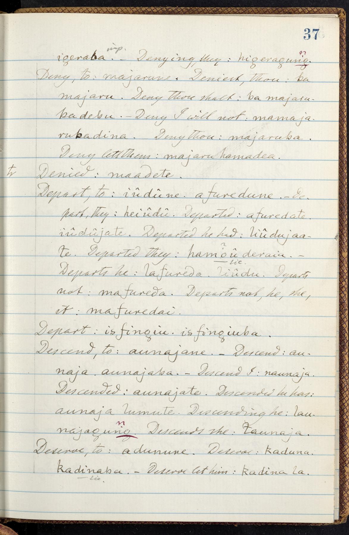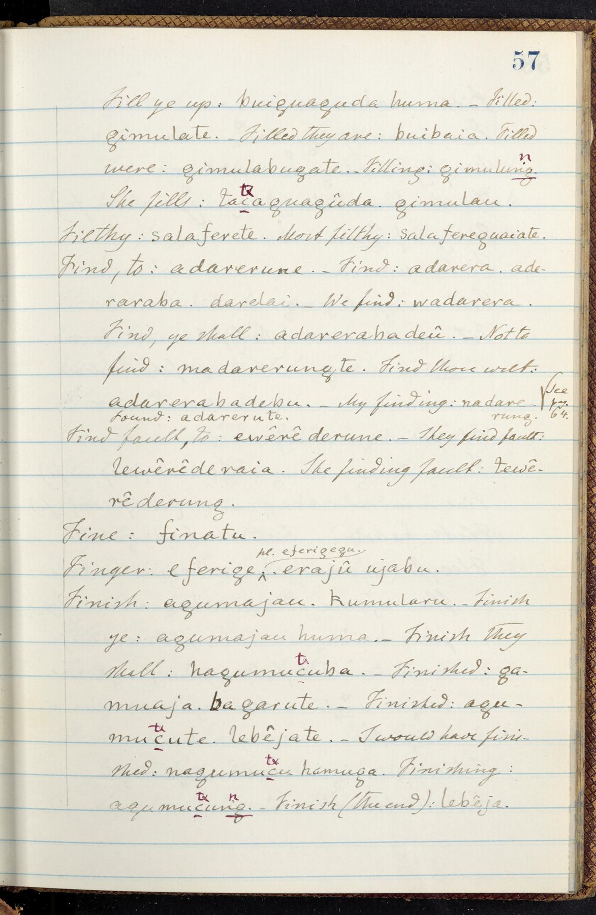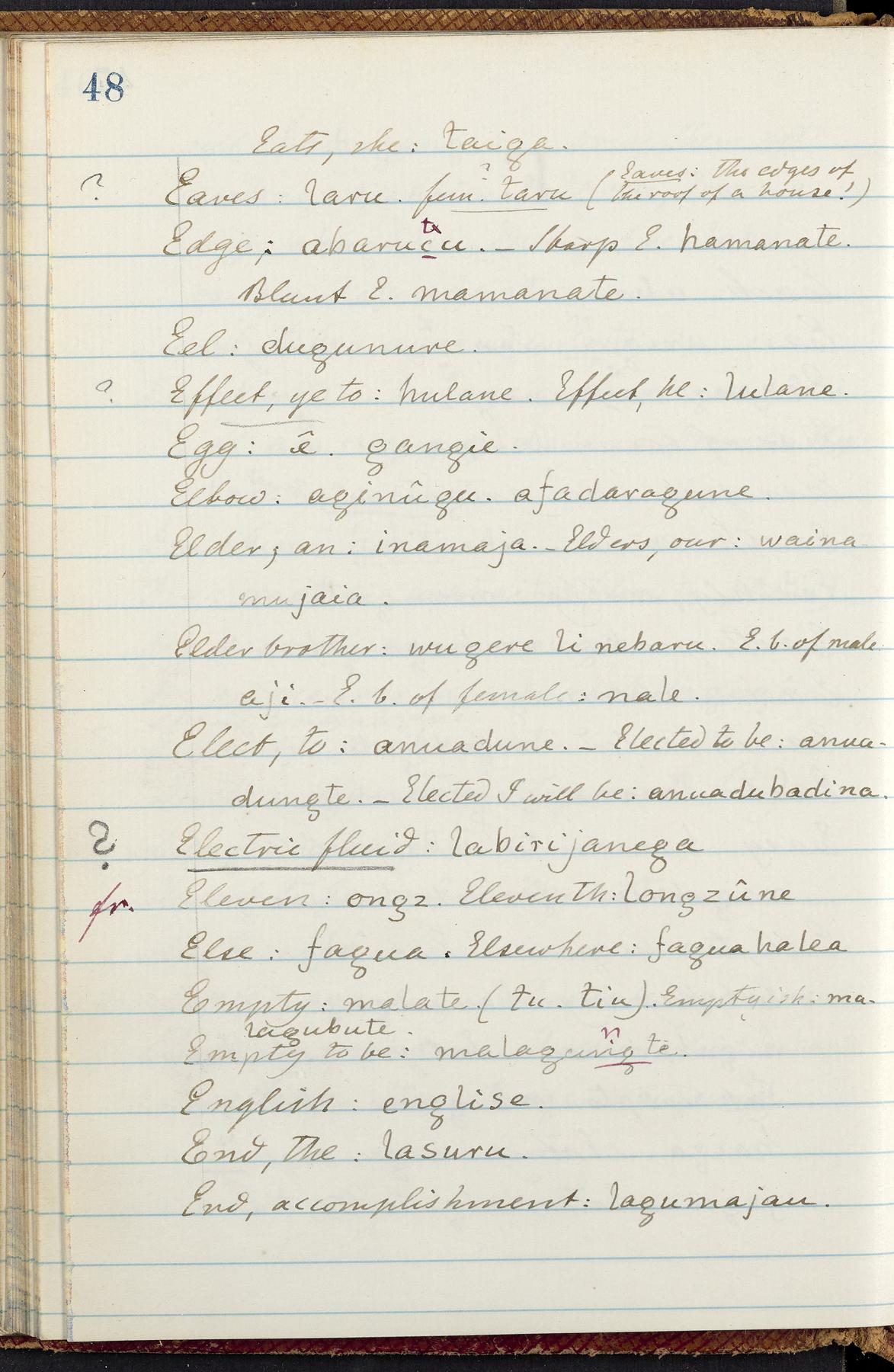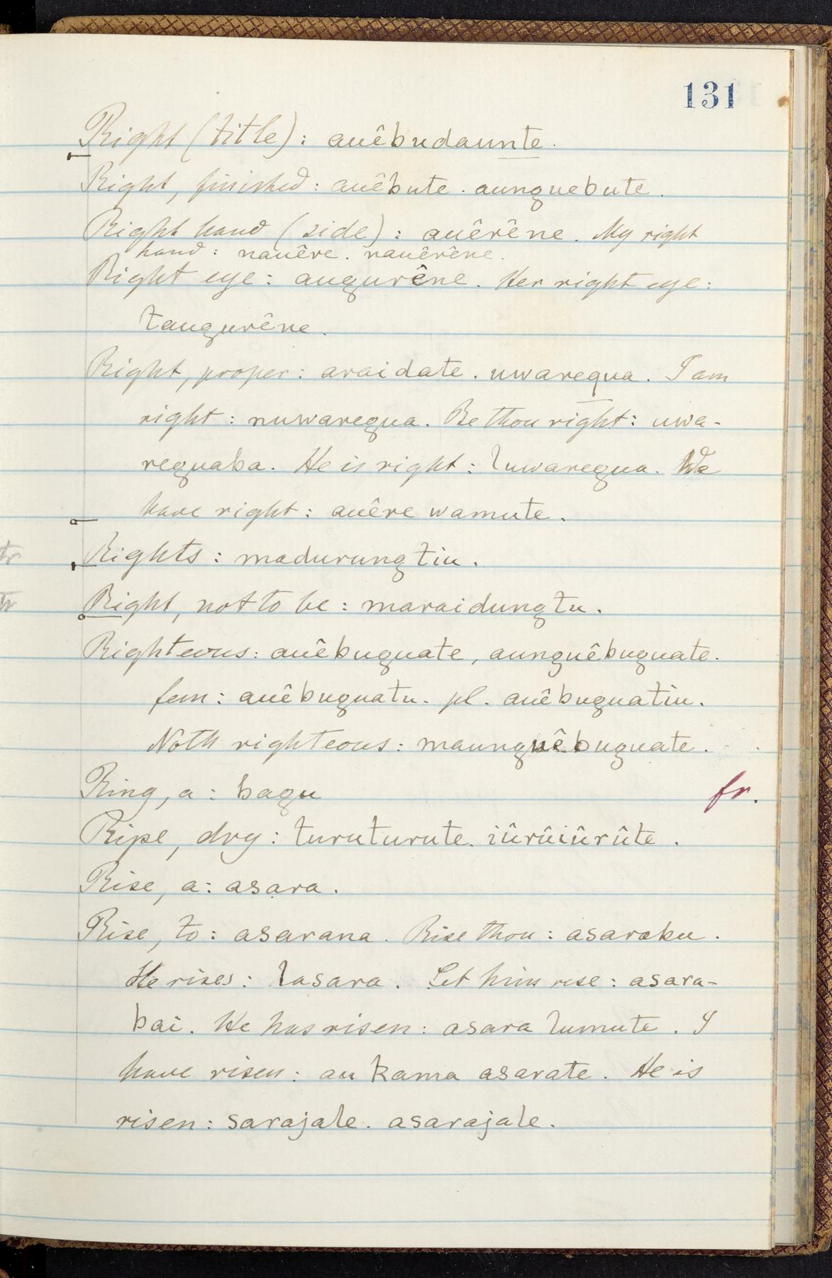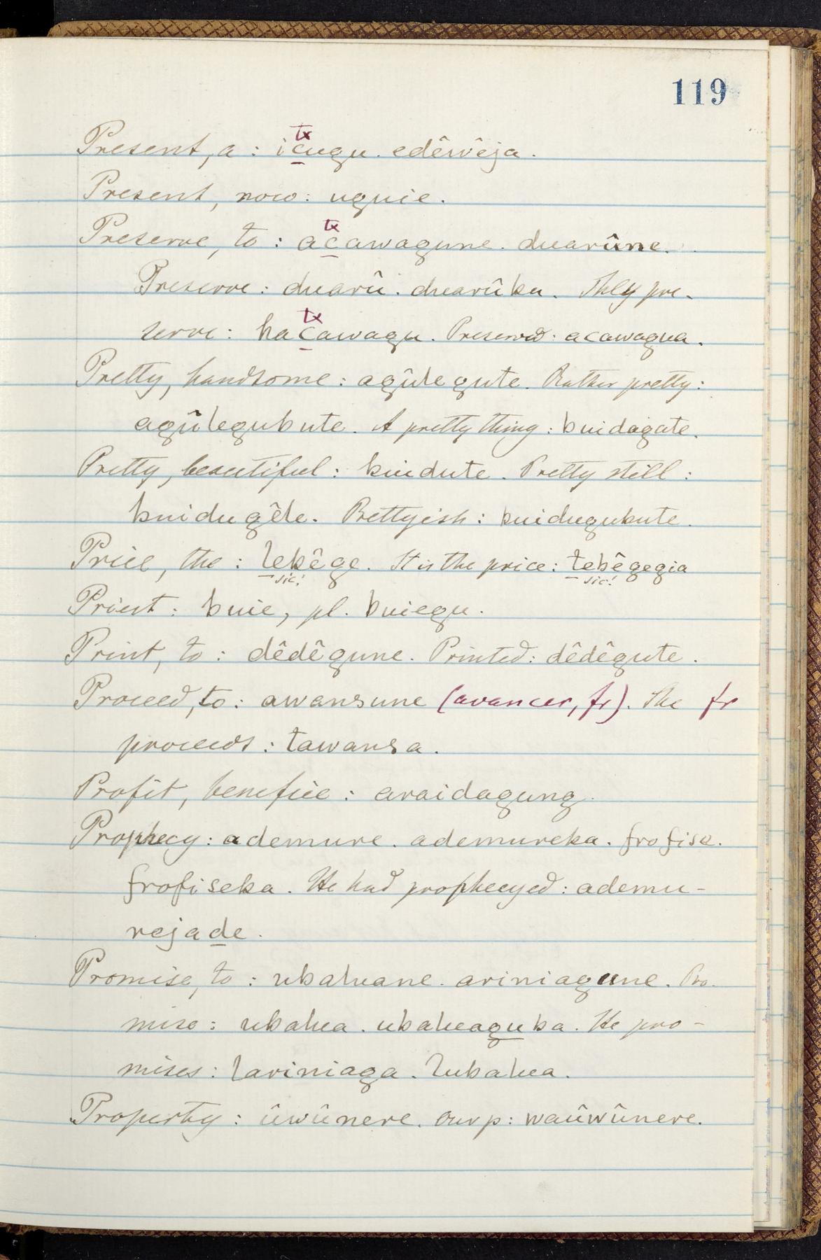 C. Hermann Berendt's transcription, in a notebook of lined paper, of a dictionary of English and Garifuna (Karif), written by Alexander Henderson, documenting the Garifuna language as spoken in the coastal areas around the Gulf (Bay) of Honduras. The dictionary comprised part of a larger manuscript by Henderson on the Garifuna language, which he wrote at the request of Berendt, on the basis of material accumulated years before. For Berendt's copy of the grammar contained in that larger manuscript, see Ms. Coll. 700, Item 126. In the preface (p. III-IV), Henderson specifies that the coastal area in which the language was spoken extended from Belize southward to a town named Littlerock on the Mosquito (Moskito) shore (either northeastern Honduras or Nicaragua). His remarks on the Garifuna people and language include mention of their being moved by the British in 1796 from the island of Saint Vincent to the island of Roatán, and their later migration to the mainland. He also characterizes them as a branch of the Carib Indians originating in a region 75 miles north of Belize. In an extensive footnote (p. 226-231), Berendt takes pains to discount the latter theory about the origin of the Garifuna, quoting a long passage from a letter Henderson wrote him (dated 26 December 1872) in which the theory plays a role, and then describing the regions to the north, in which the Maya language predominates. The early pages of the dictionary (to mid p. 26) are crossed out by Berendt with a diagonal slash across the page, and the reader is referred to the back of the book, where he has revised these pages (p. 187-225). Whereas the crossed-out version is spare, presenting mainly single-word Garifuna equivalents for English words, the revised version, with slightly more entries, often includes examples of usage, especially for verbs. In the rest of the dictionary (p. 26-185), this expanded style of presentation is used. In a note tipped in (verso of title page), Berendt indicates that he has made additions in blue ink taken from a manuscript vocabulary prepared by Henderson for Berendt's comparative vocabulary of languages spoken between the Isthmus of Tehuantepec and Honduras; such blue-ink additions are not evident (the manuscript by Henderson that Berendt refers to here appears to correspond to Ms. Coll. 700, Item 135). The December 1872 letter from Henderson cited above (1 bifolium), along with 4 additional letters from him to Berendt (dated 16 May, 30 May, and 18 October 1871, and 28 July 1873; 1 leaf and 3 bifolia), as well as Berendt's drafts of 2 letters of his to Henderson (dated 20 November 1871 and October 1872, 2 bifolia), are among items that were tipped in or laid in, and are now housed in a separate folder shelved with the manuscript. Besides the Garifuna manuscript, topics of the correspondence include Henderson's manuscript for the comparative vocabulary (referred to above, and described in Henderson's letters of May 1871 as a vocabulary of 600 words); and a vocabulary of the Tawahka (Twaka) Indians that he sent to Berendt, which was originally collected by a certain merchant Mr. Haly. Henderson's original pages of the latter vocabulary, with a few words from the San Blas Indians, are also among the items in the folder shelved with the manuscript (2 bifolia that originally formed a 4-leaf gathering; 2 pages concern Karif). For Berendt's transcription of the Tawahka vocabulary, see Ms. Coll. 700, Item 133; and for his transcription of the vocabulary of the San Blas Indians, see Ms. Coll. 700, Item 164.