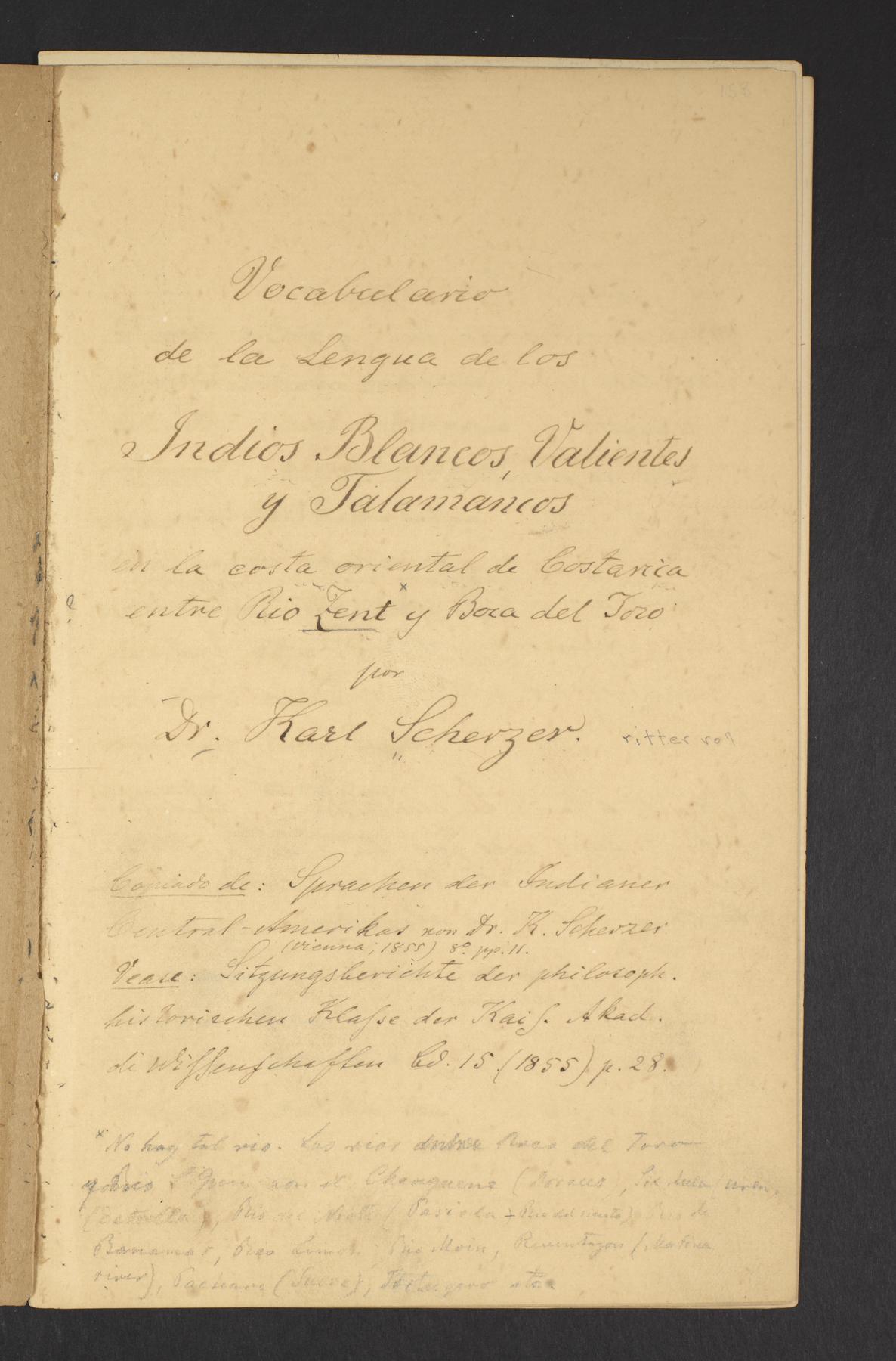 C. Hermann Berendt's transcription of approximately 180 vocabulary entries, including numbers, from the list that Karl Scherzer attributed to the Blanco, Valiente, and Talamanca tribes, in his article entitled Sprachen der Indianer Central-Amerika's (Sitzungsberichte der kaiserlichen Akademie der Wissenschaften, philosophisch-historische Classe, 15. Band, Wien, 1855, p. 28-37). Berendt uses the name Viceita (cover), which is often associated with the Bribri, and sometimes also with the Cabecar Indians. Scherzer's article comprised a comparative table of languages of Indians of Central America, and he described the above-named tribes as inhabiting the eastern coast of Costa Rica between Rio Zent and Boca del Toro. Scherzer provided the Indian equivalents of German vocabulary entries arranged in the order of Albert Gallatin's comparative Indian vocabulary. Berendt's manuscript comprises vocabulary entries in Spanish (retaining the same order used by Scherzer), followed by the Indian word in Scherzer's spelling, and then the spelling according to Berendt's analytical alphabet. In a prefatory note (p. ii), Berendt paraphrases Scherzer's remarks concerning the German-oriented orthography he used. In Berendt's own notes appended to the vocabulary (p. 10-12), he makes reference (p. 10) to the later publication of this same vocabulary in a book that Scherzer co-authored with Moritz Wagner, Die Republik Costa Rica in Central-Amerika (p. 573-576), first published in 1856. Berendt explains that in the latter work Scherzer reported his source to be a certain Indian by the name of Tomas Ottárola of the Blancos tribe, who was born in San José and lived at the time in Orosi; and that at one point in a note (Wagner/Scherzer, p. 563) he refers to the vocabulary as being the language of the Viseitas (Viceitas) and Blancos. In further remarks pertaining to the specification of the Indians and the language in question Berendt refers to a communication he had from Philipp J. J. Valentini (p. 11). For Berendt's revised version of this manuscript, see Ms. Coll. 700, Item 159; in the latter he specifies the 1857 printing of the Wagner/Scherzer book.