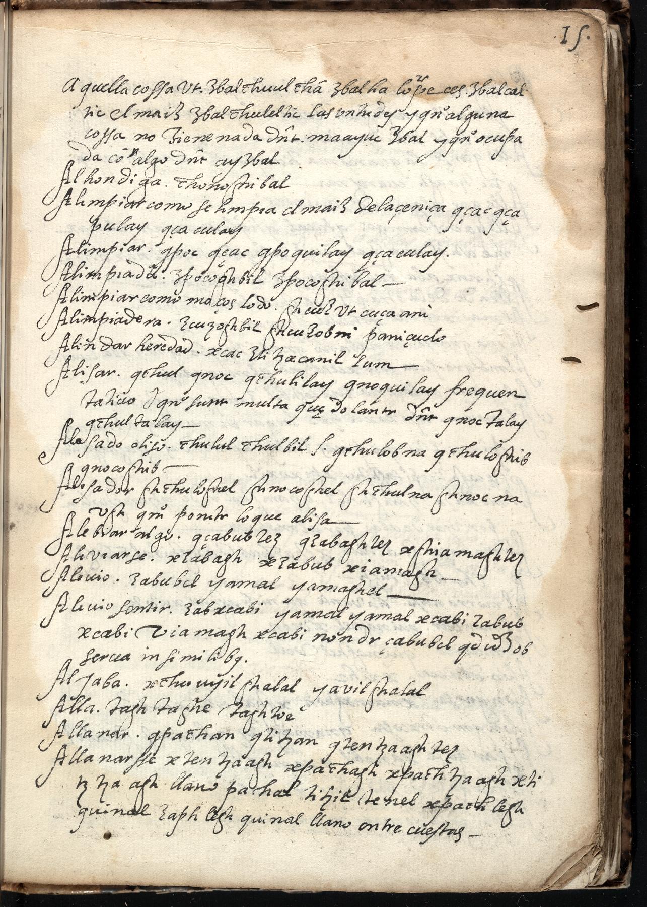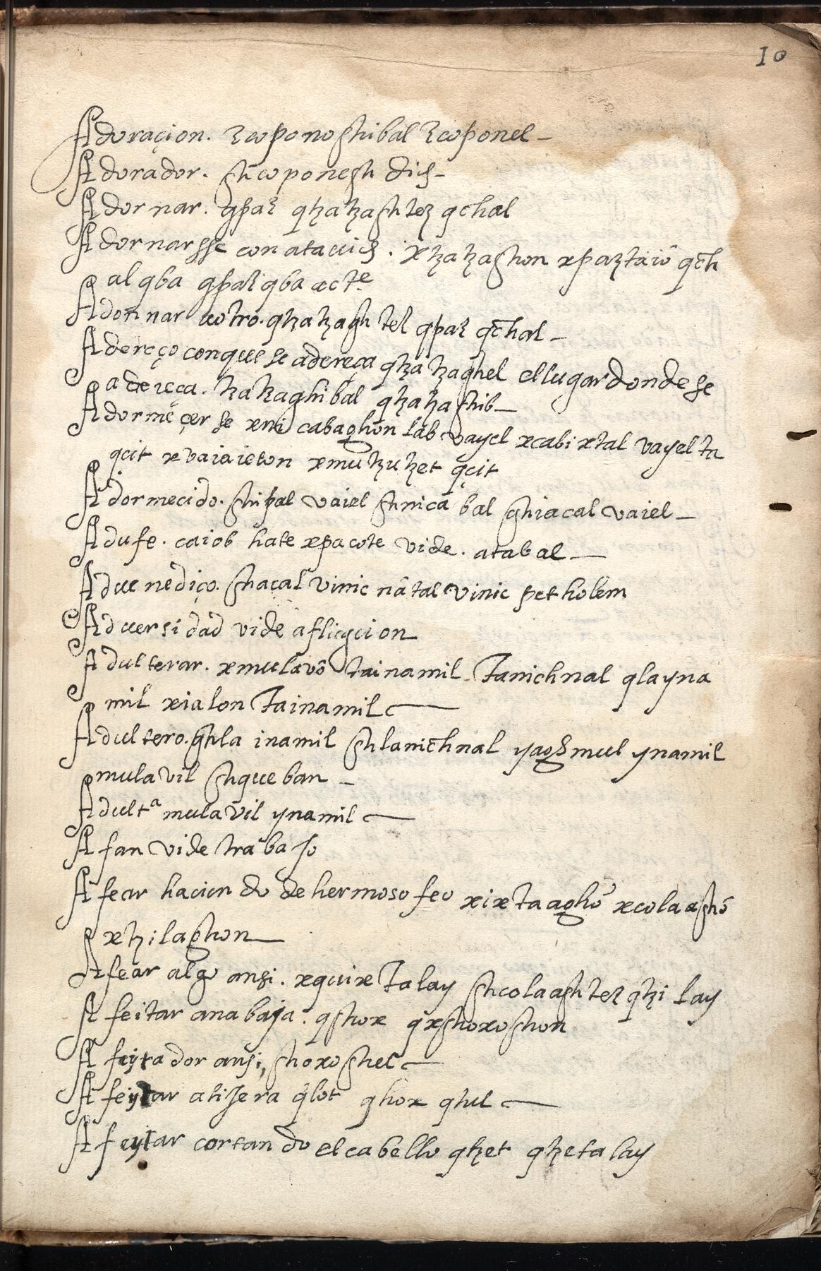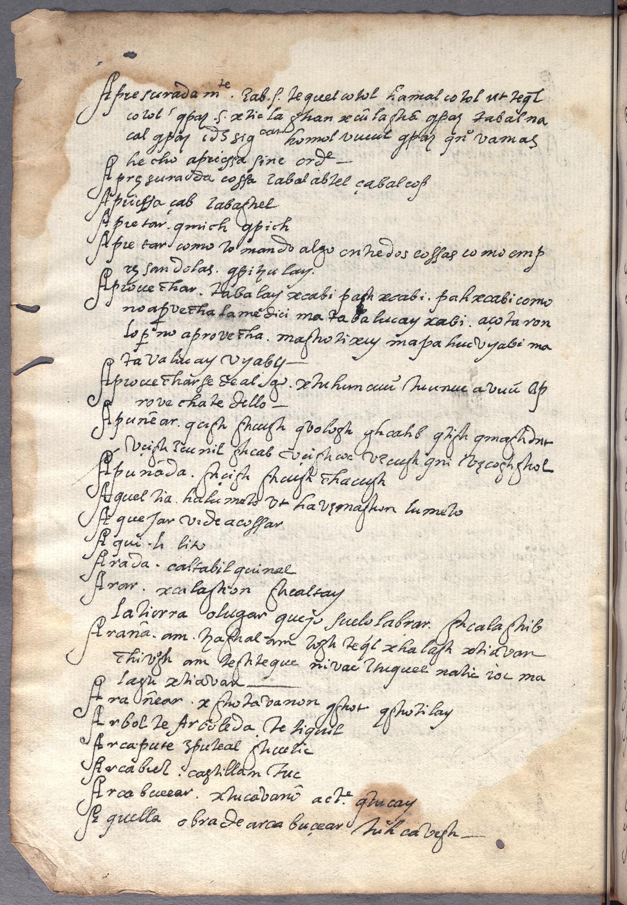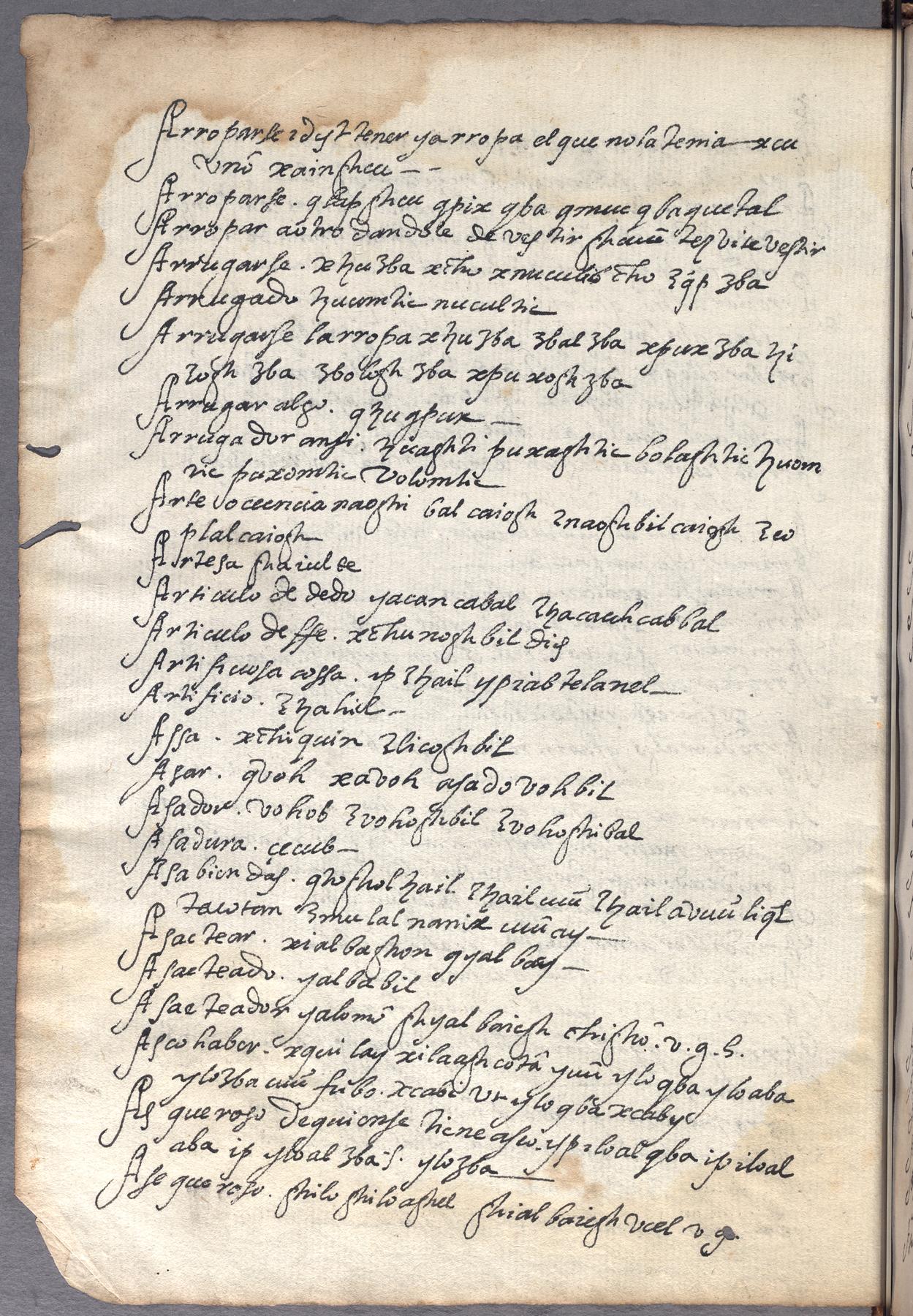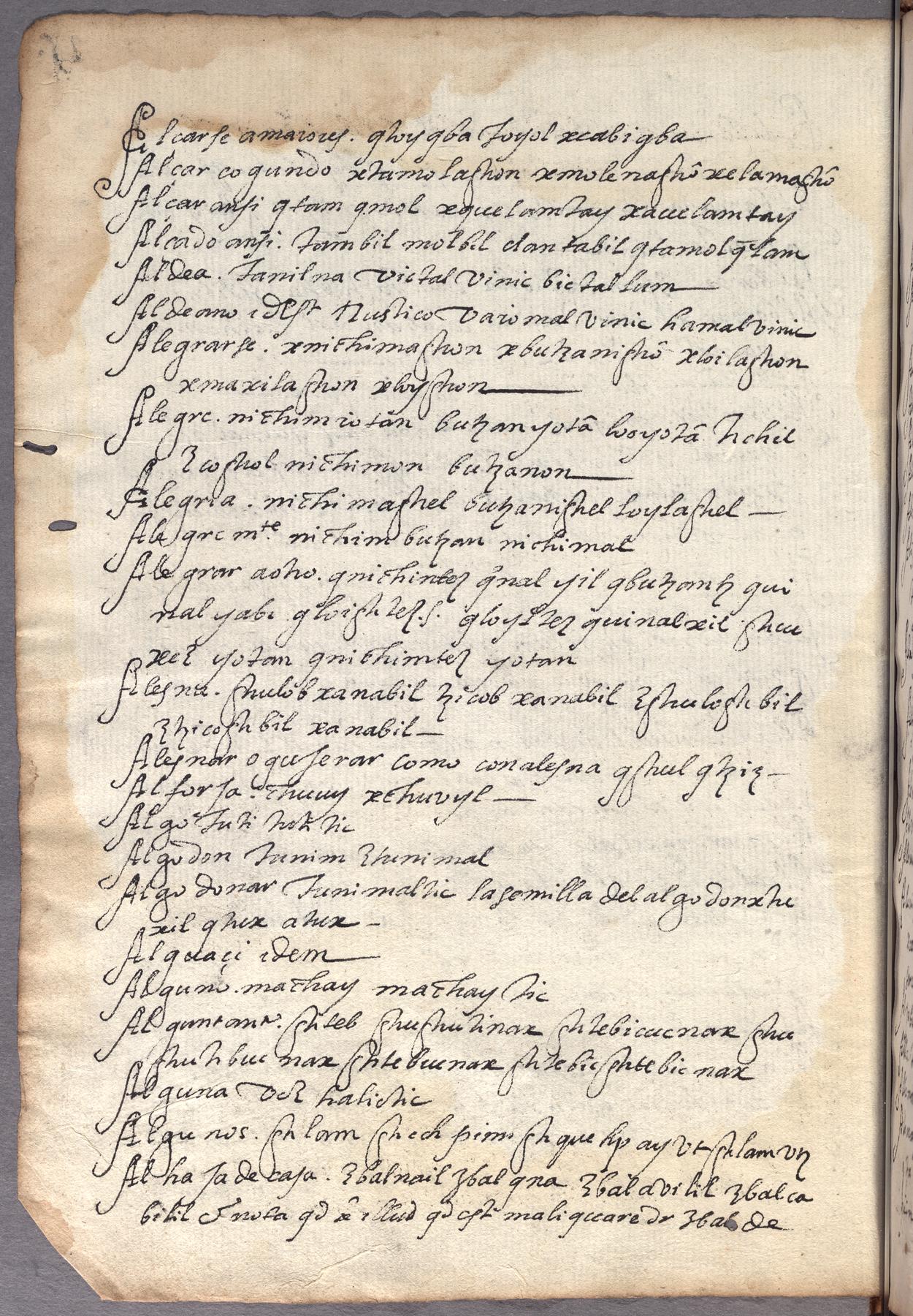 A copy, probably made in the 17th century, of an alphabetical list of Spanish names, words, and phrases, with translations in Tzeltal.