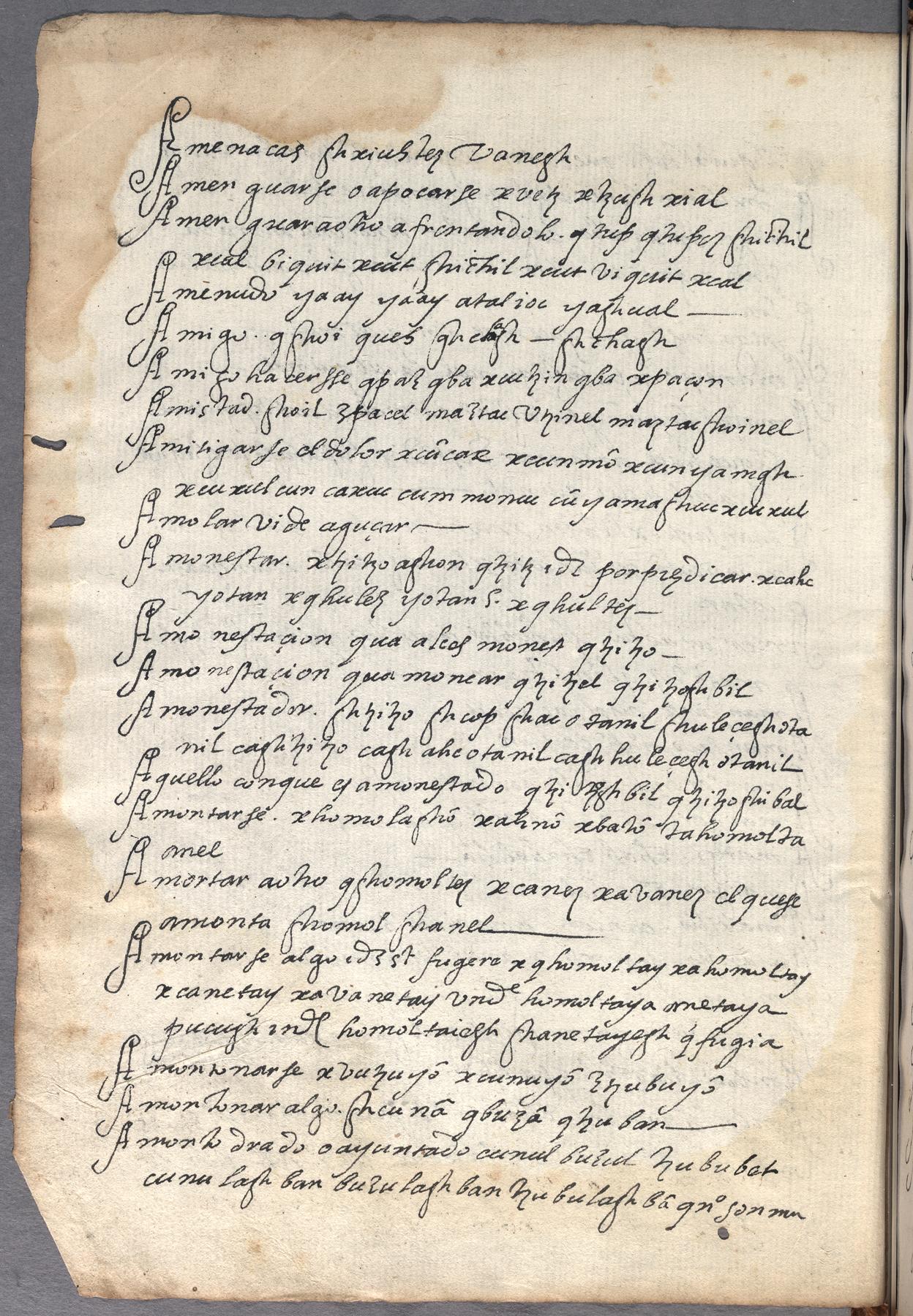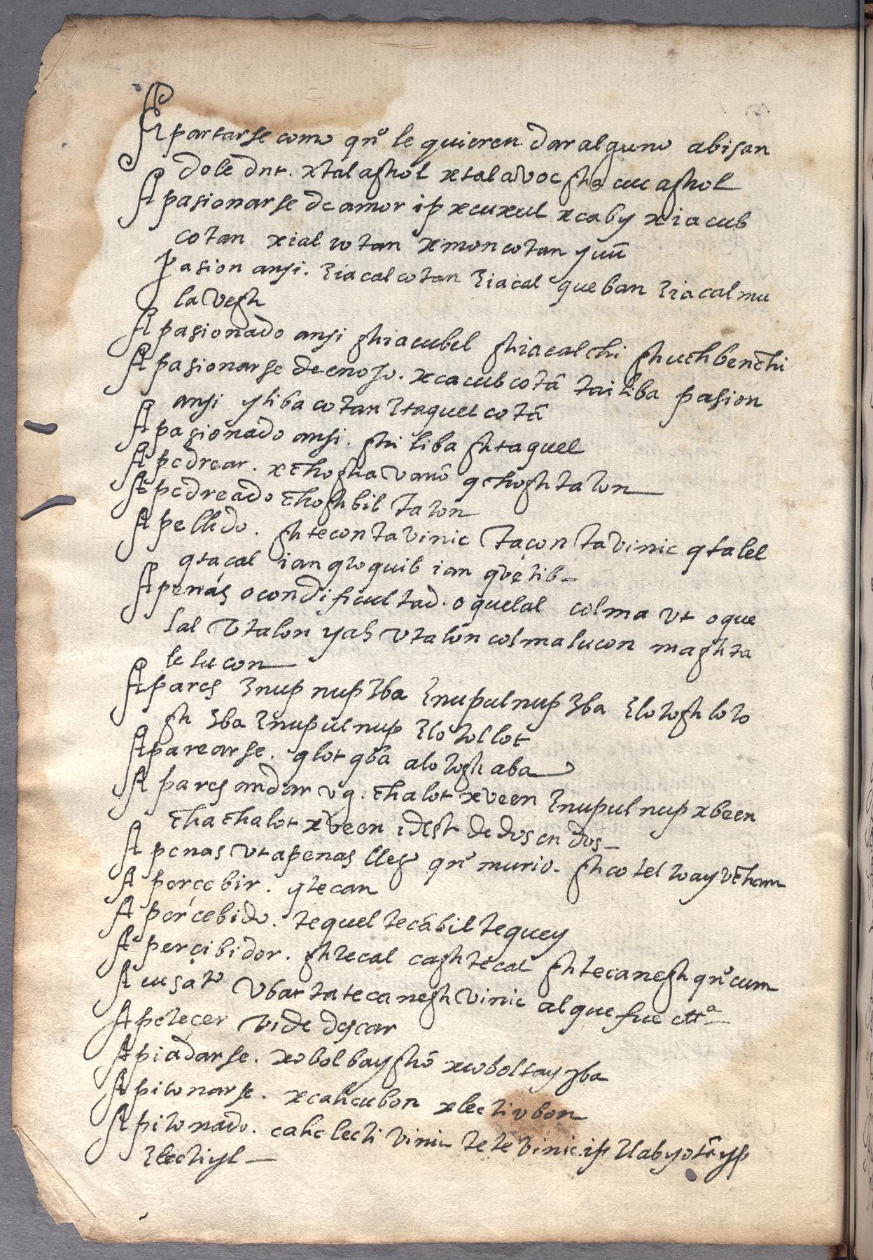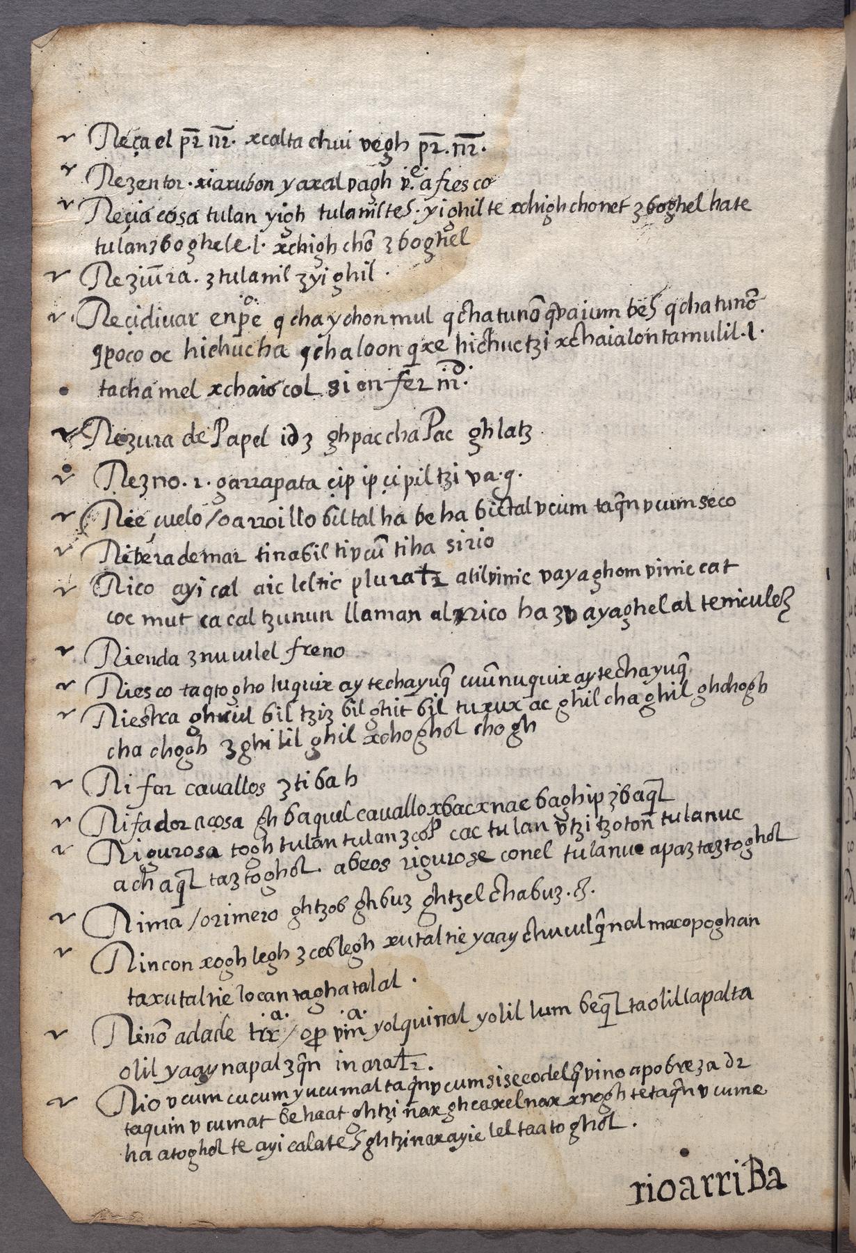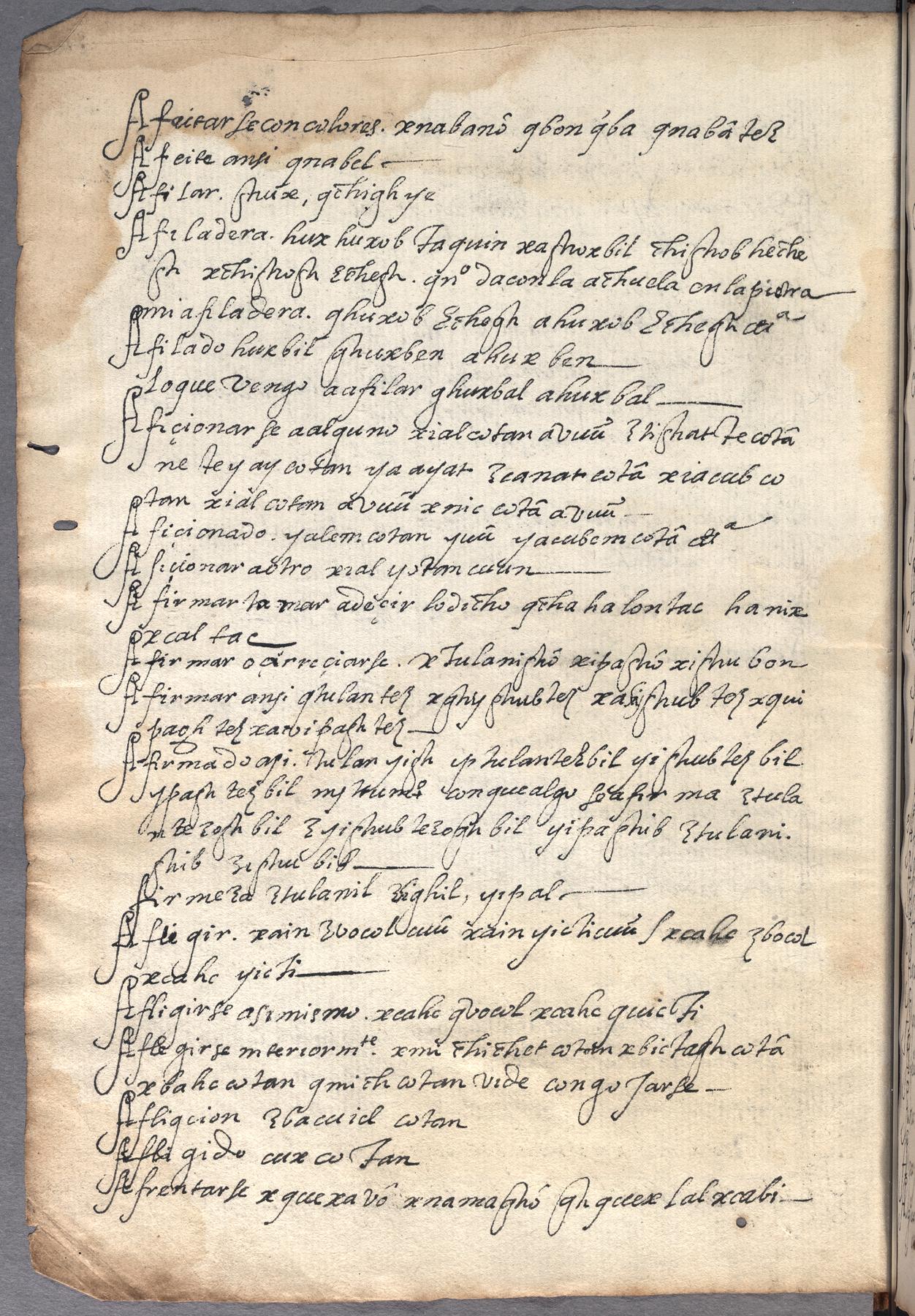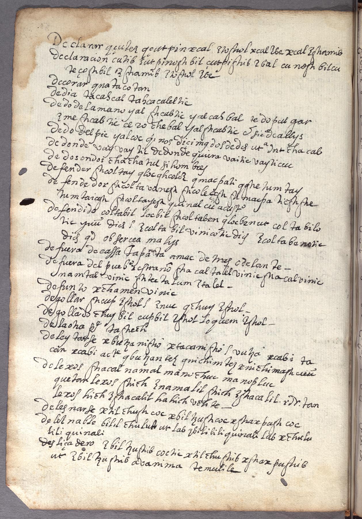 A copy, probably made in the 17th century, of an alphabetical list of Spanish names, words, and phrases, with translations in Tzeltal.