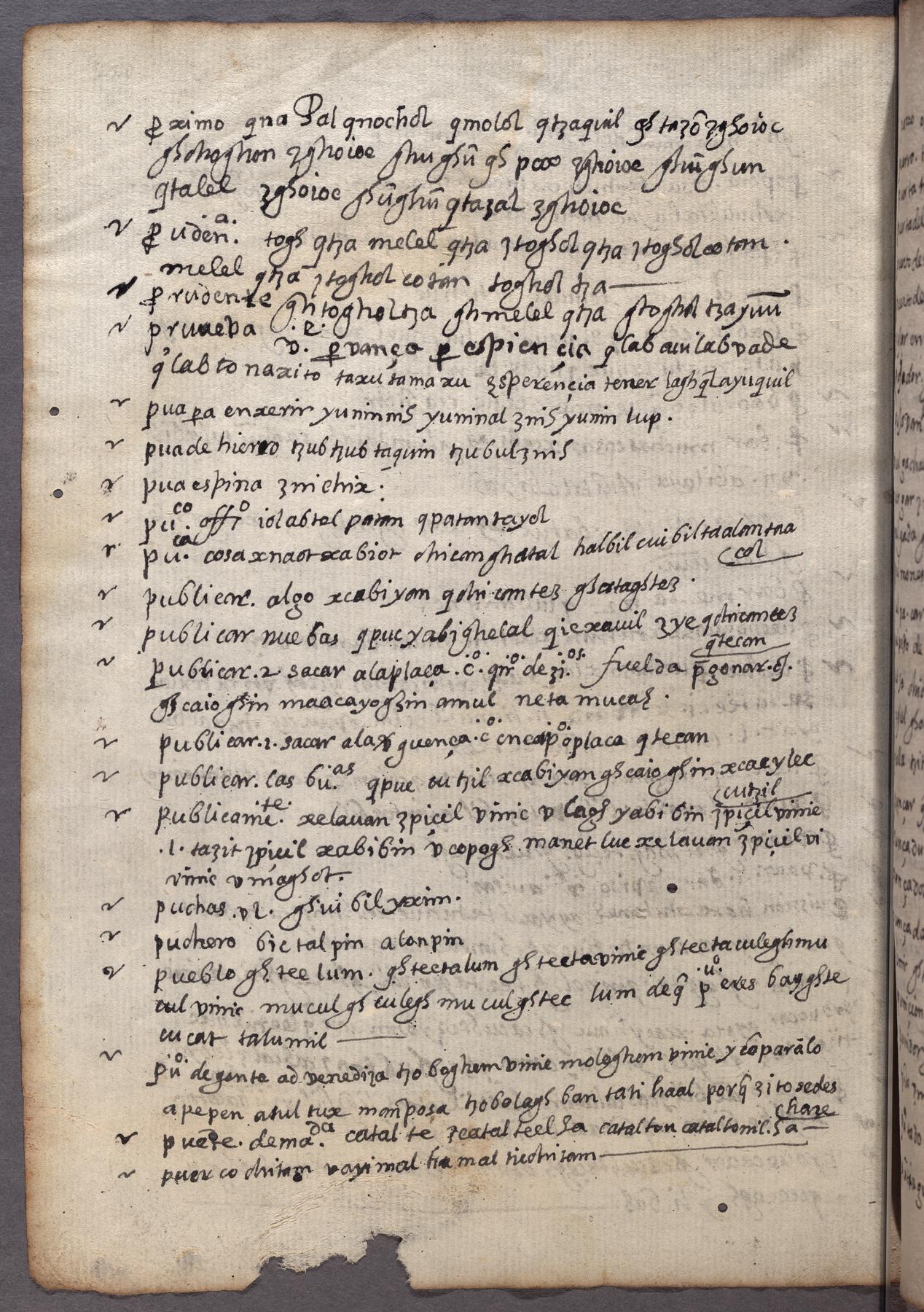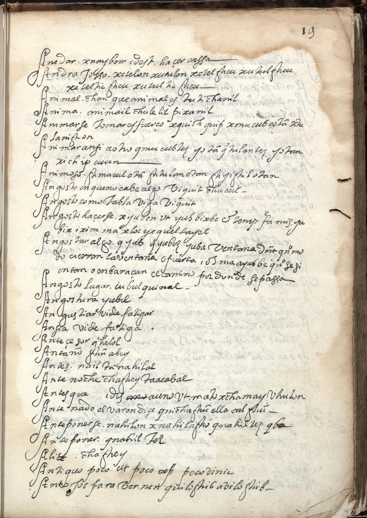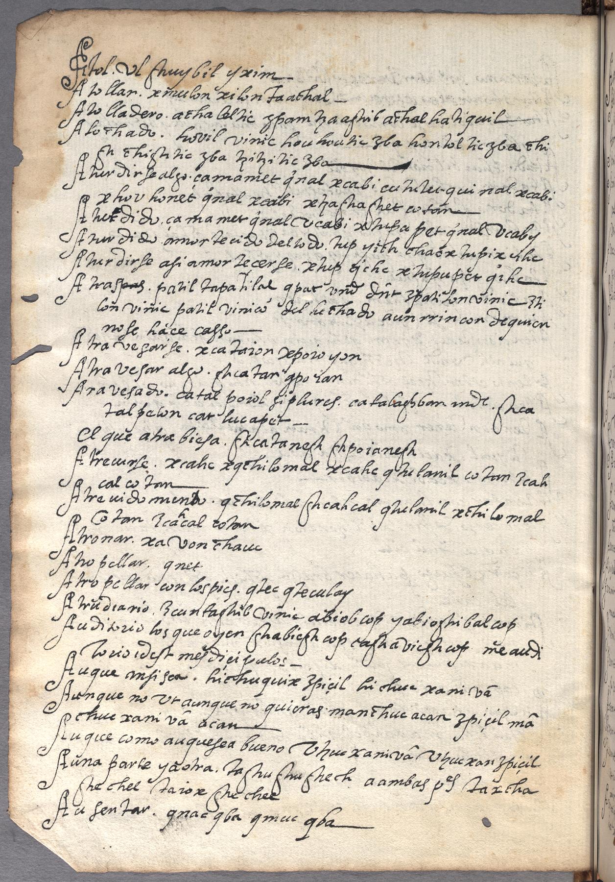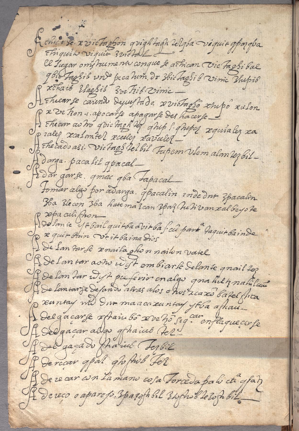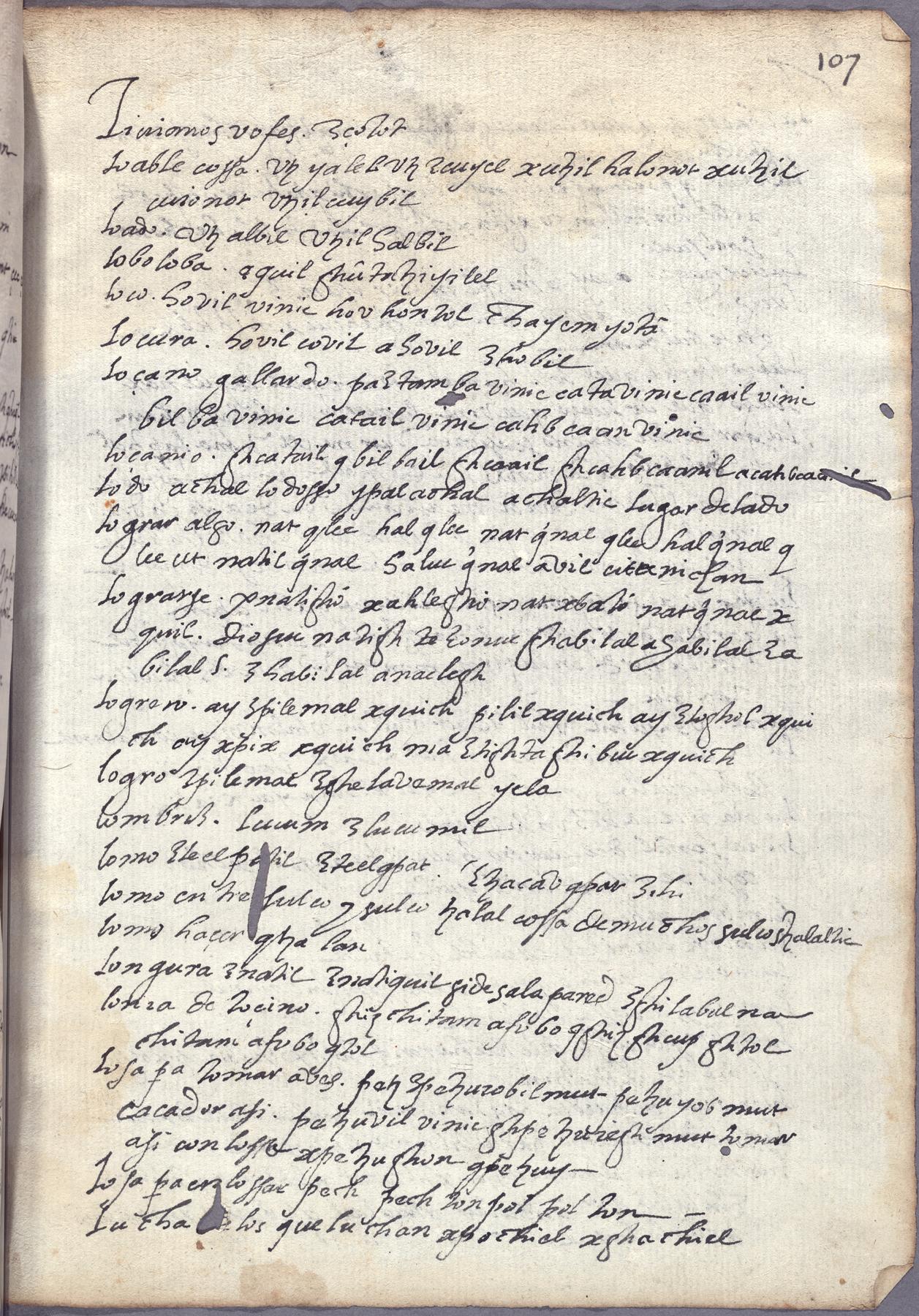 A copy, probably made in the 17th century, of an alphabetical list of Spanish names, words, and phrases, with translations in Tzeltal.