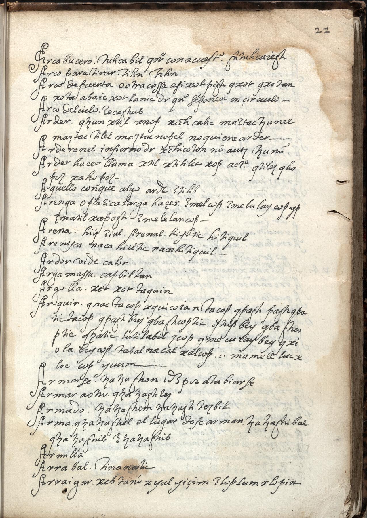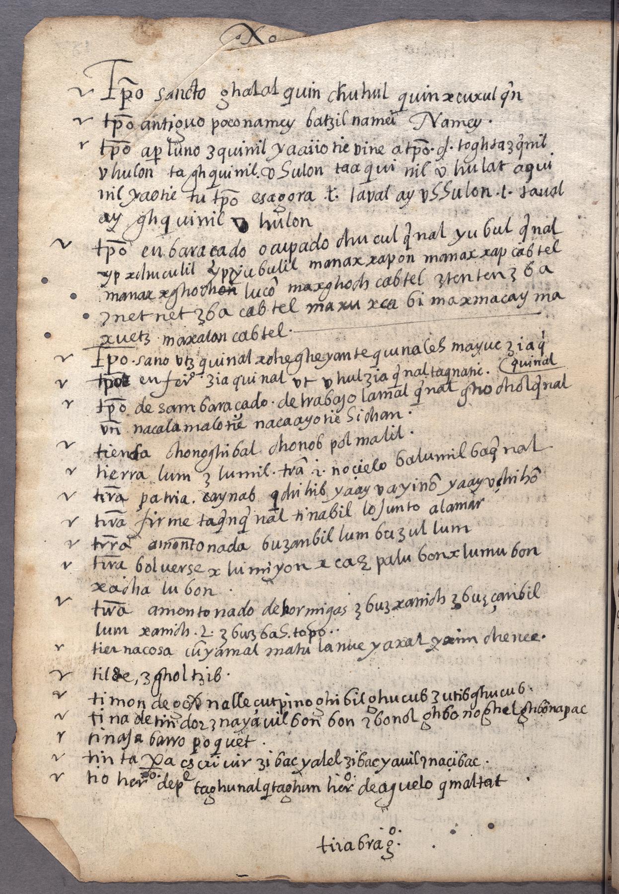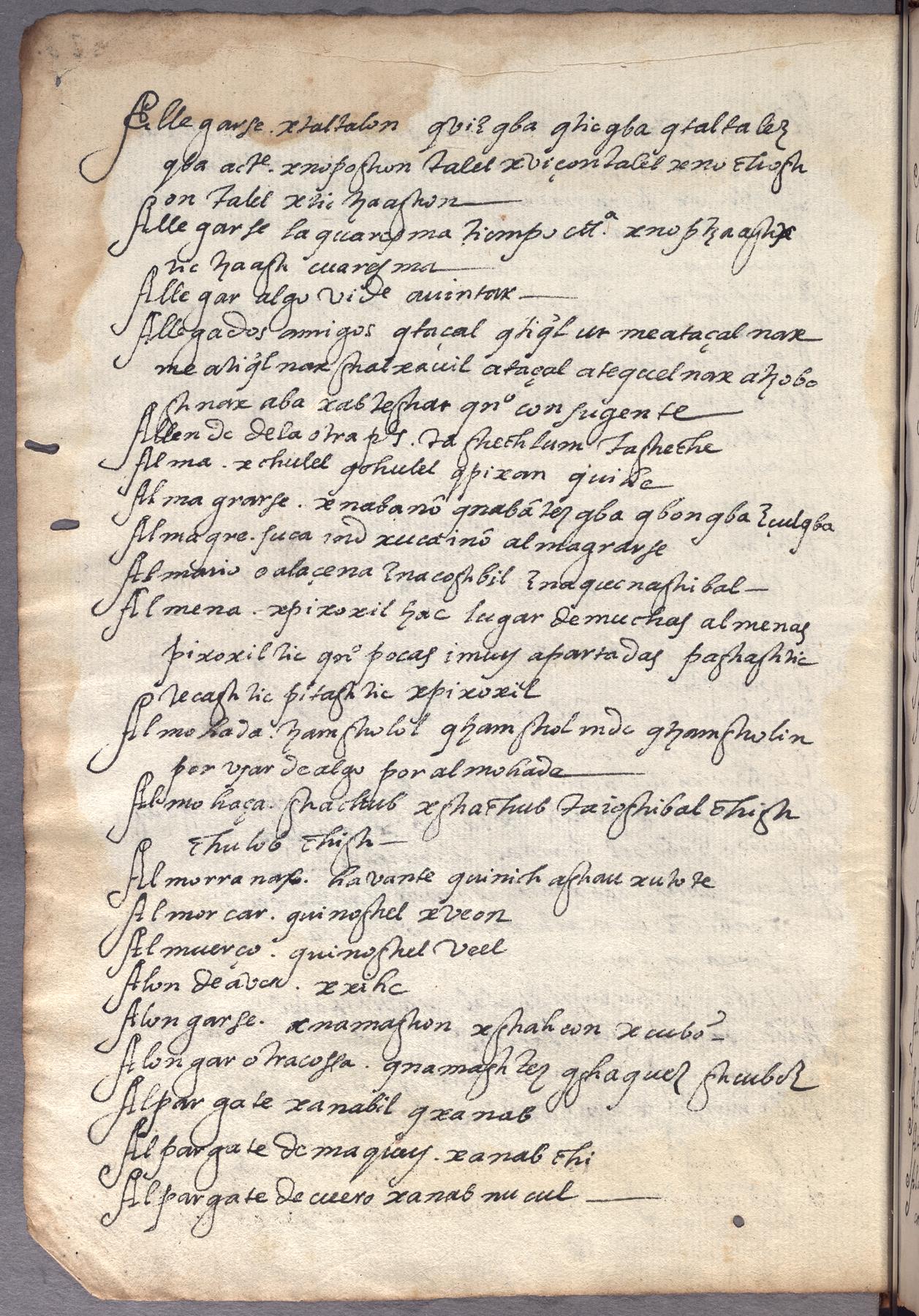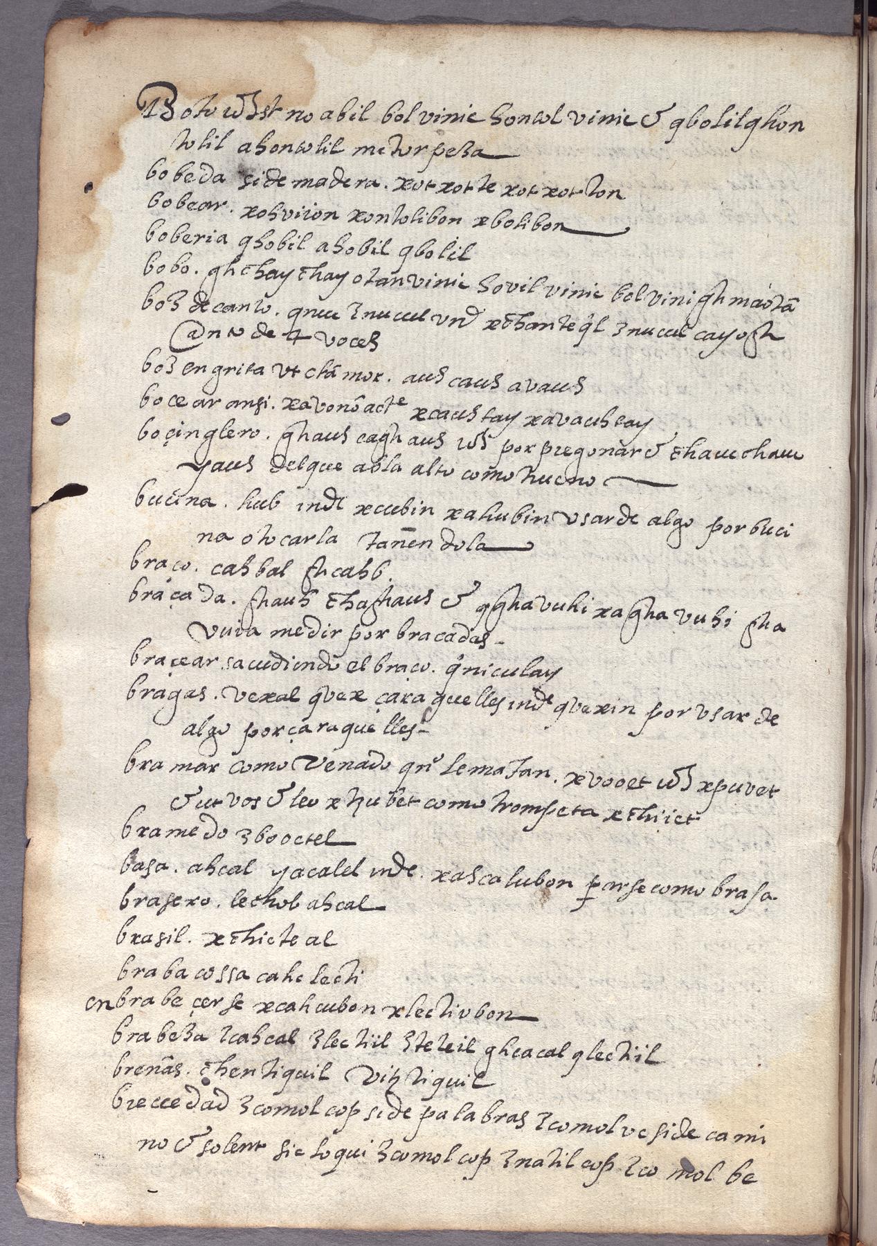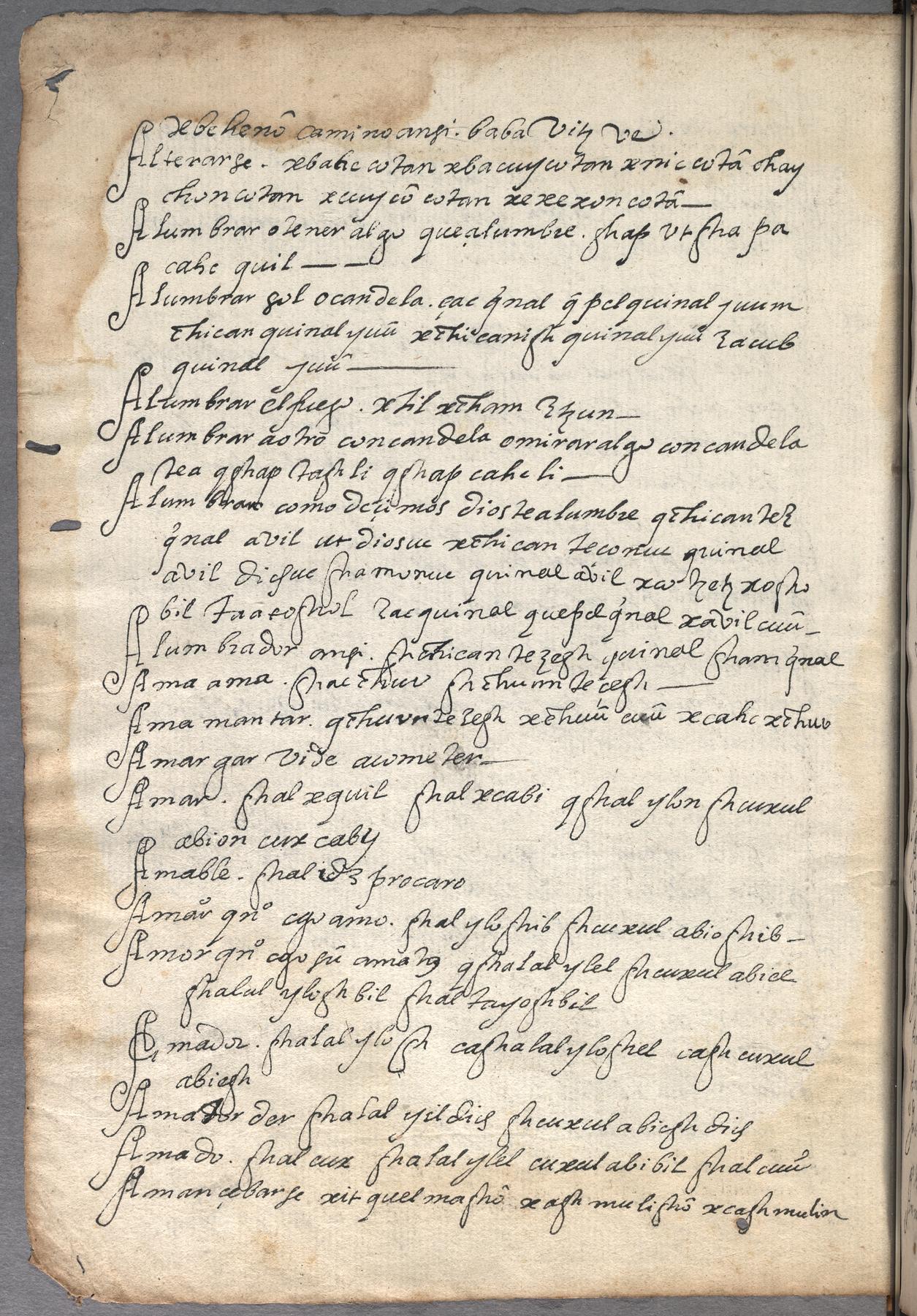 A copy, probably made in the 17th century, of an alphabetical list of Spanish names, words, and phrases, with translations in Tzeltal.