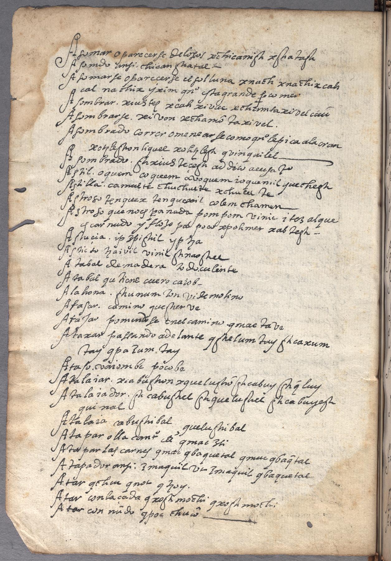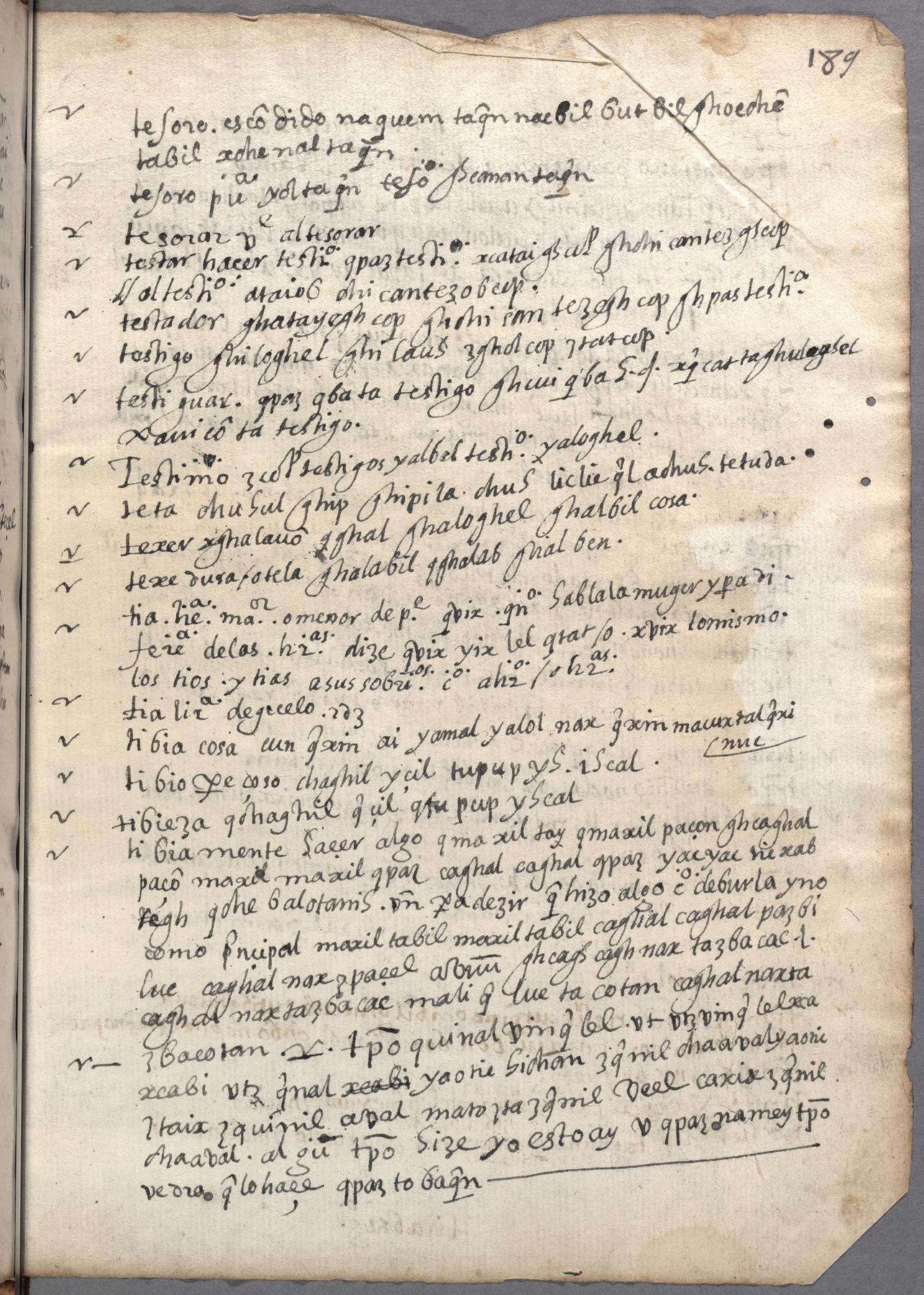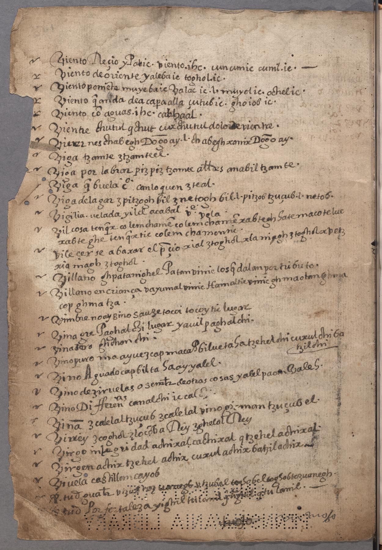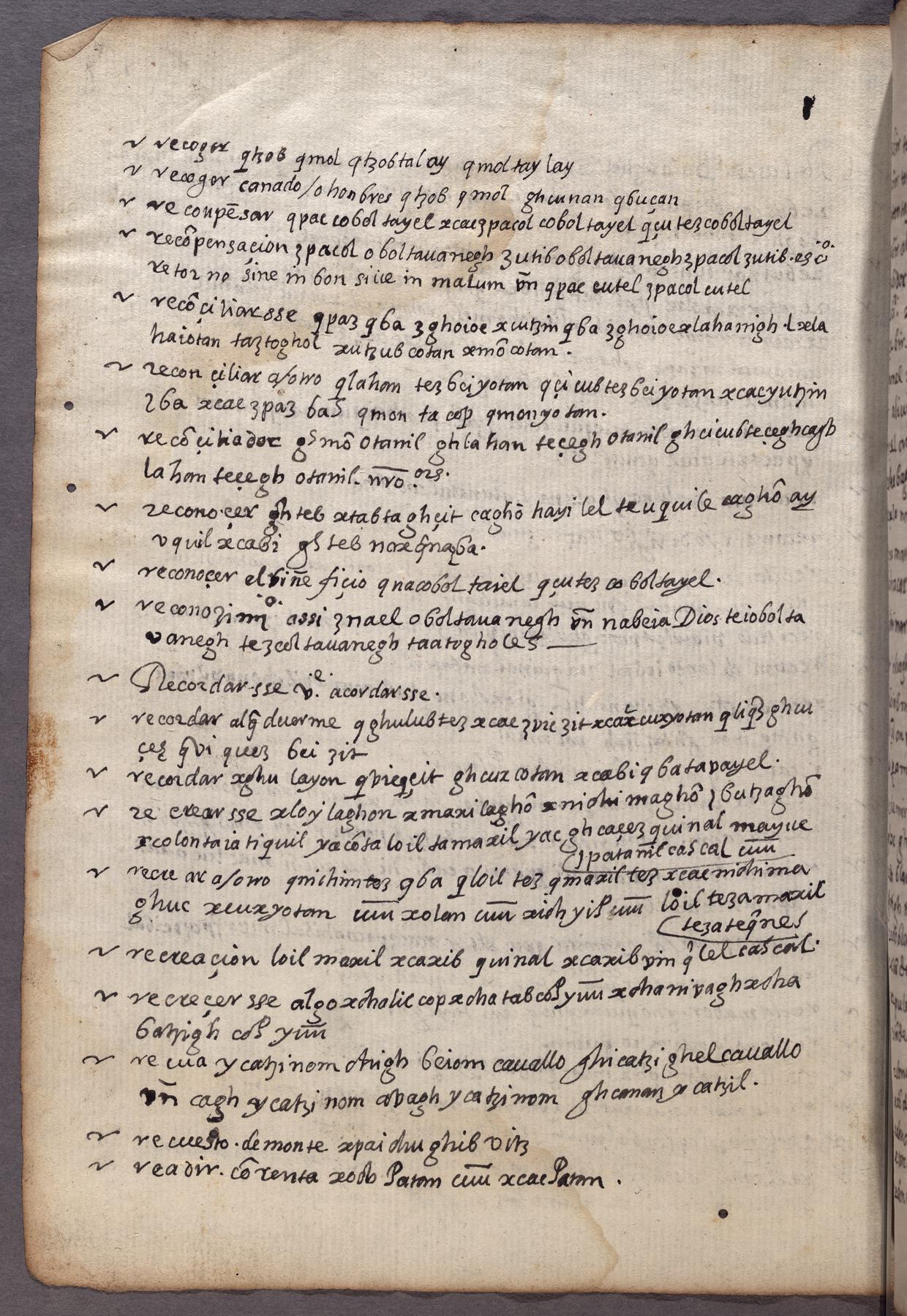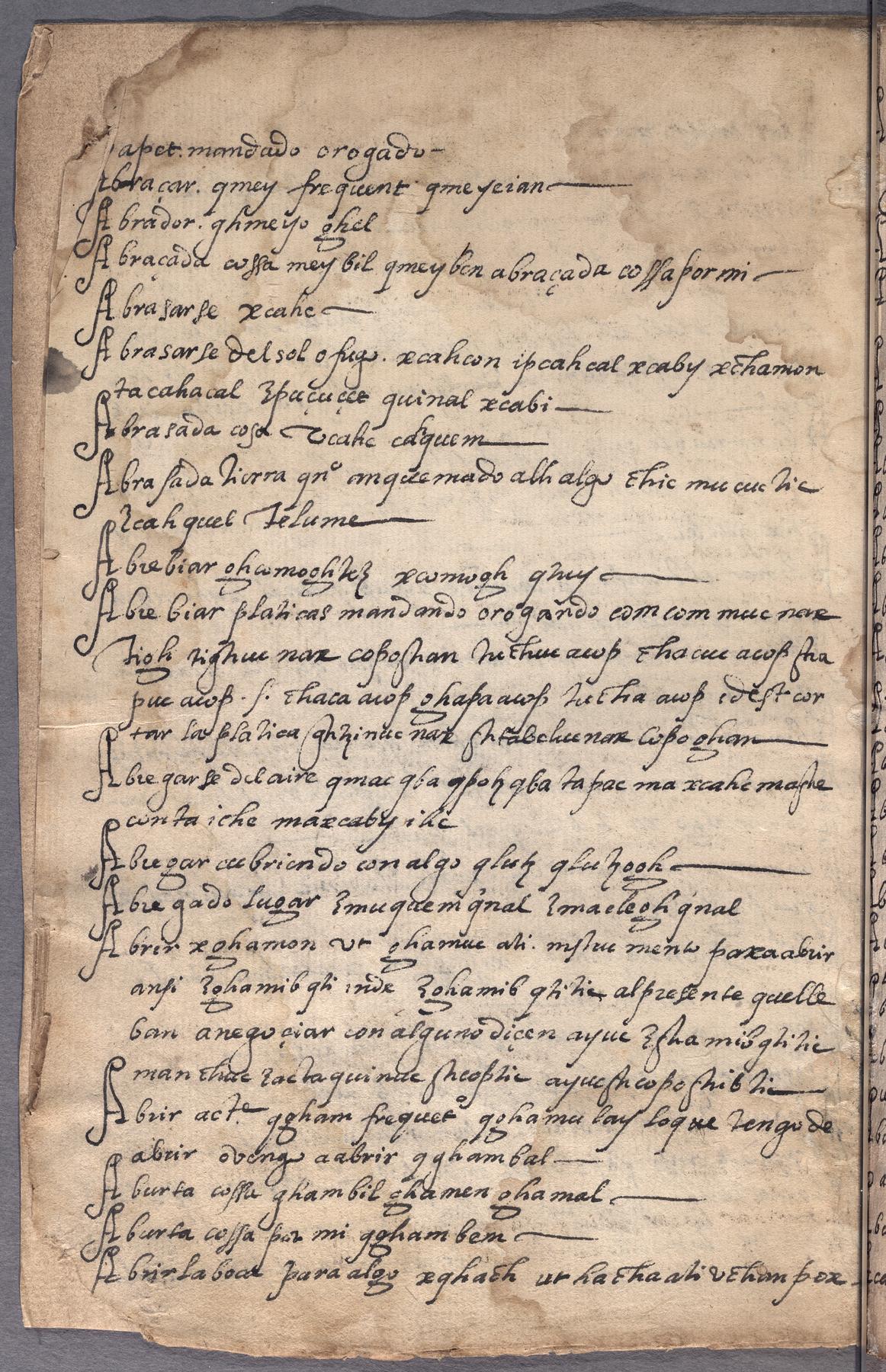 A copy, probably made in the 17th century, of an alphabetical list of Spanish names, words, and phrases, with translations in Tzeltal.