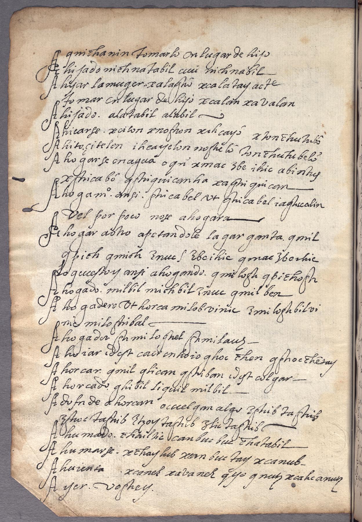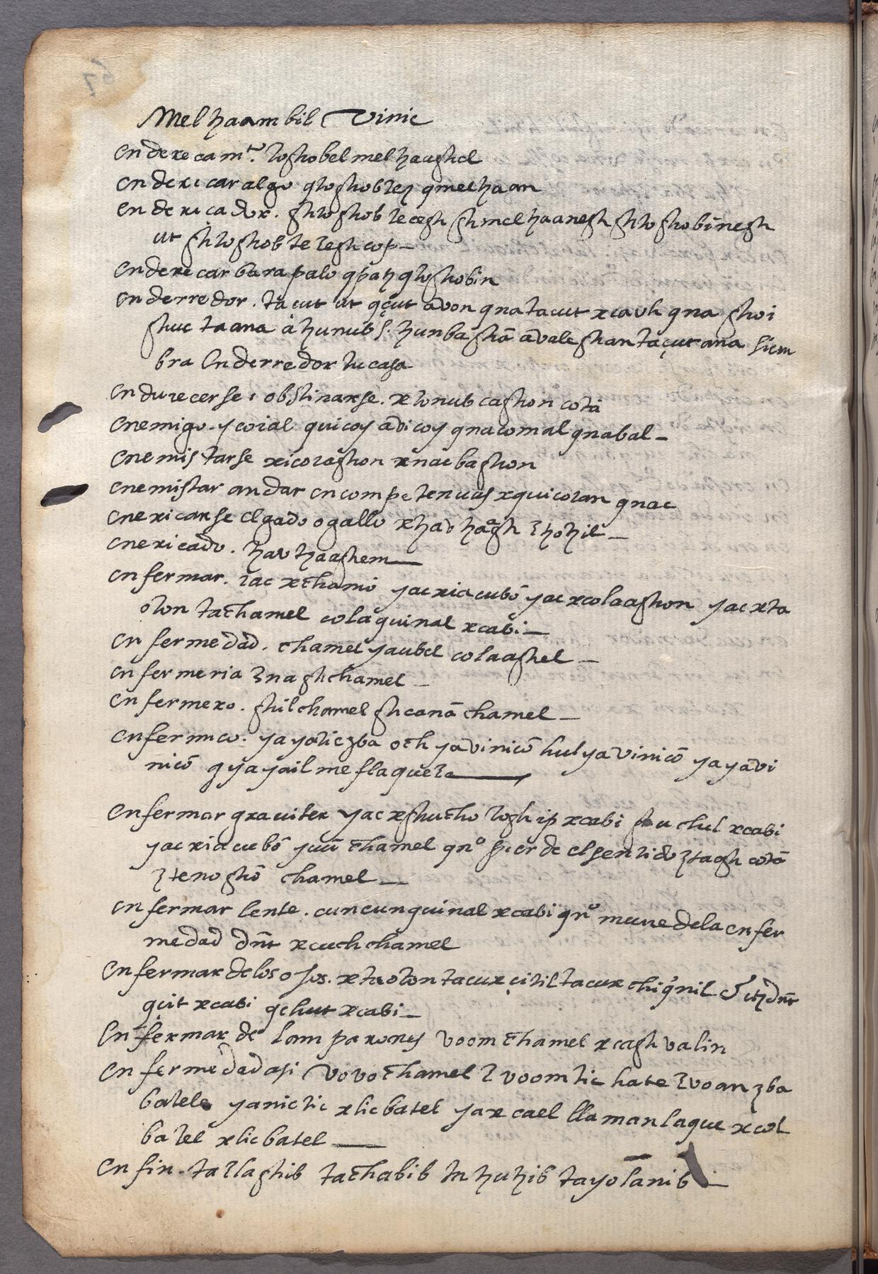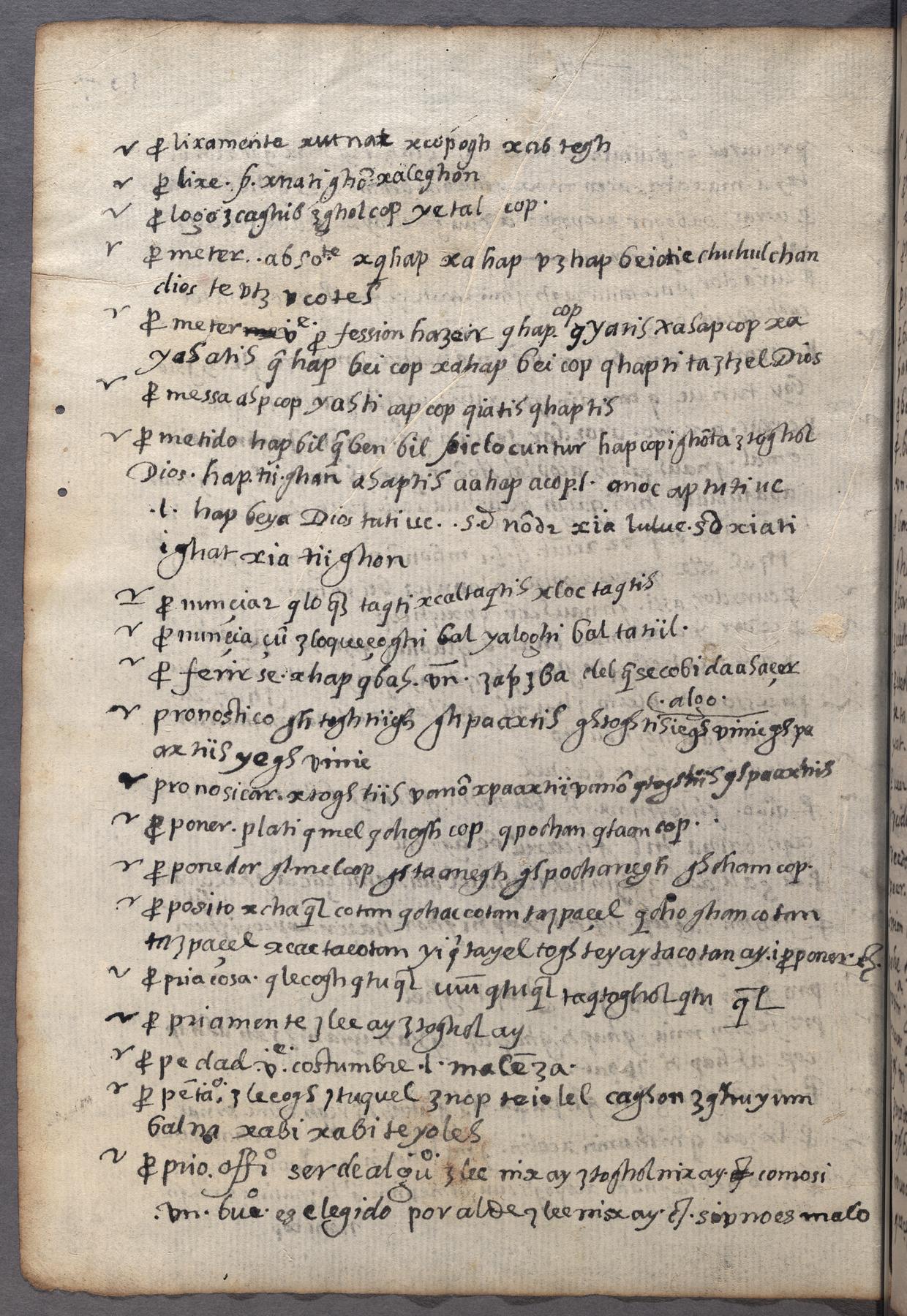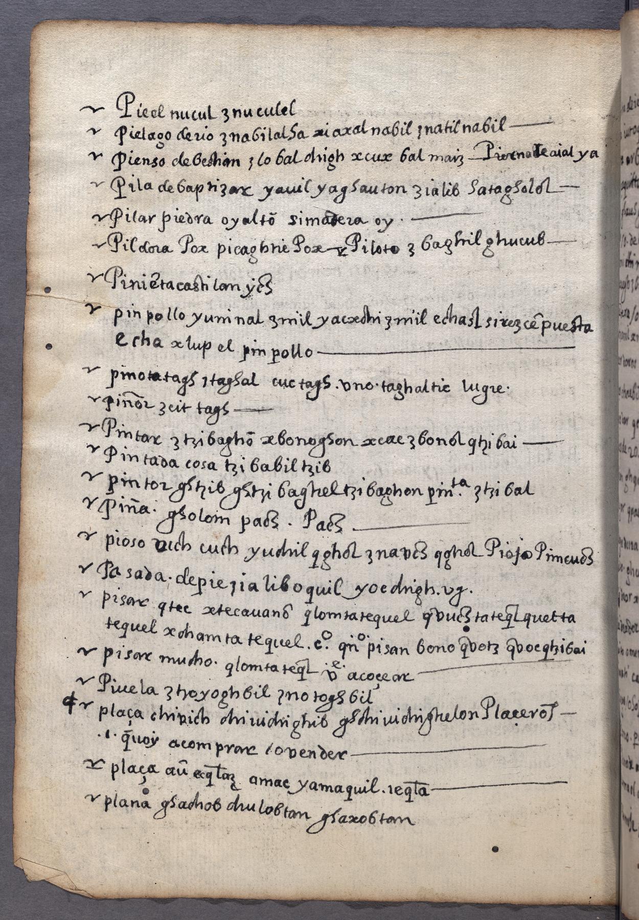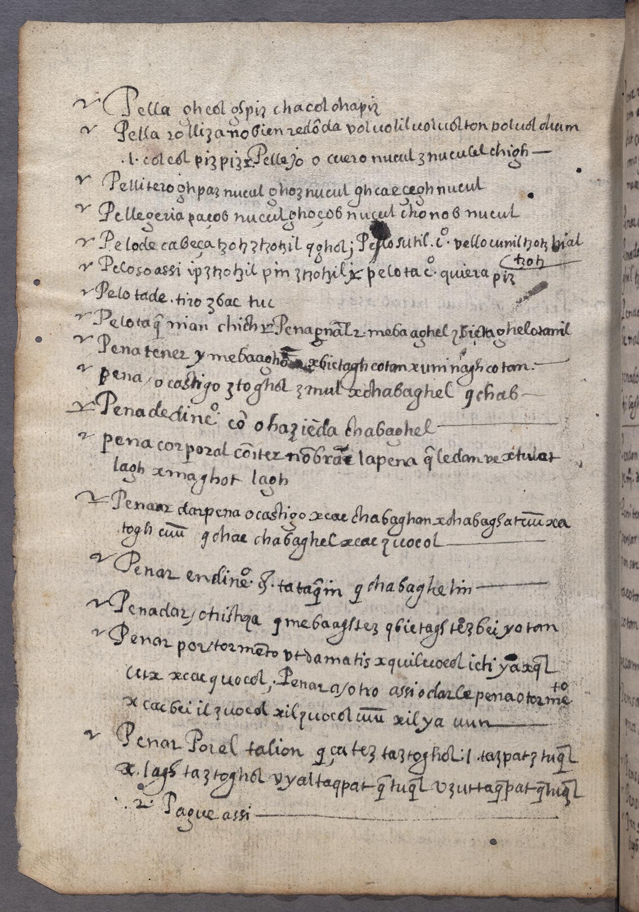 A copy, probably made in the 17th century, of an alphabetical list of Spanish names, words, and phrases, with translations in Tzeltal.