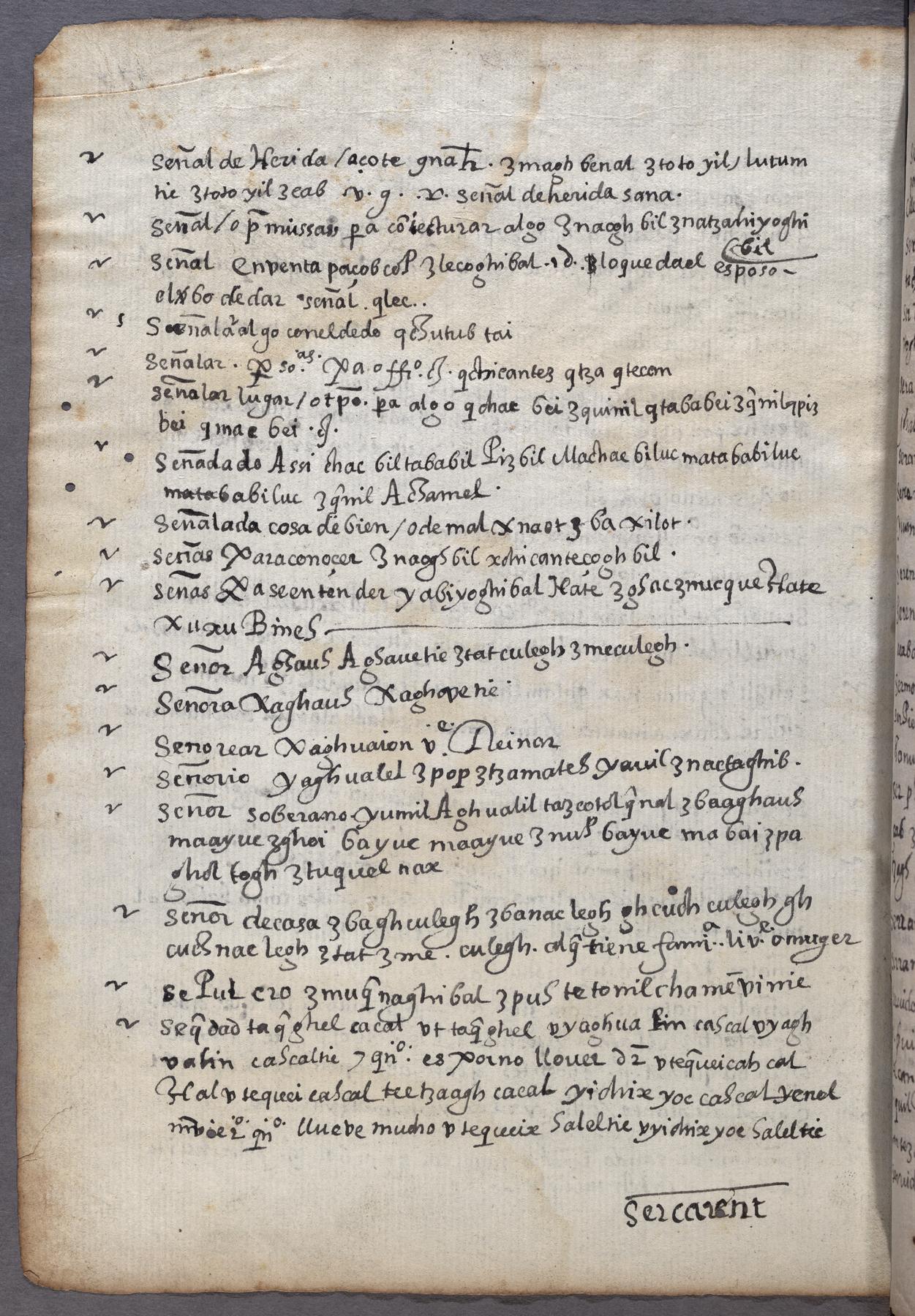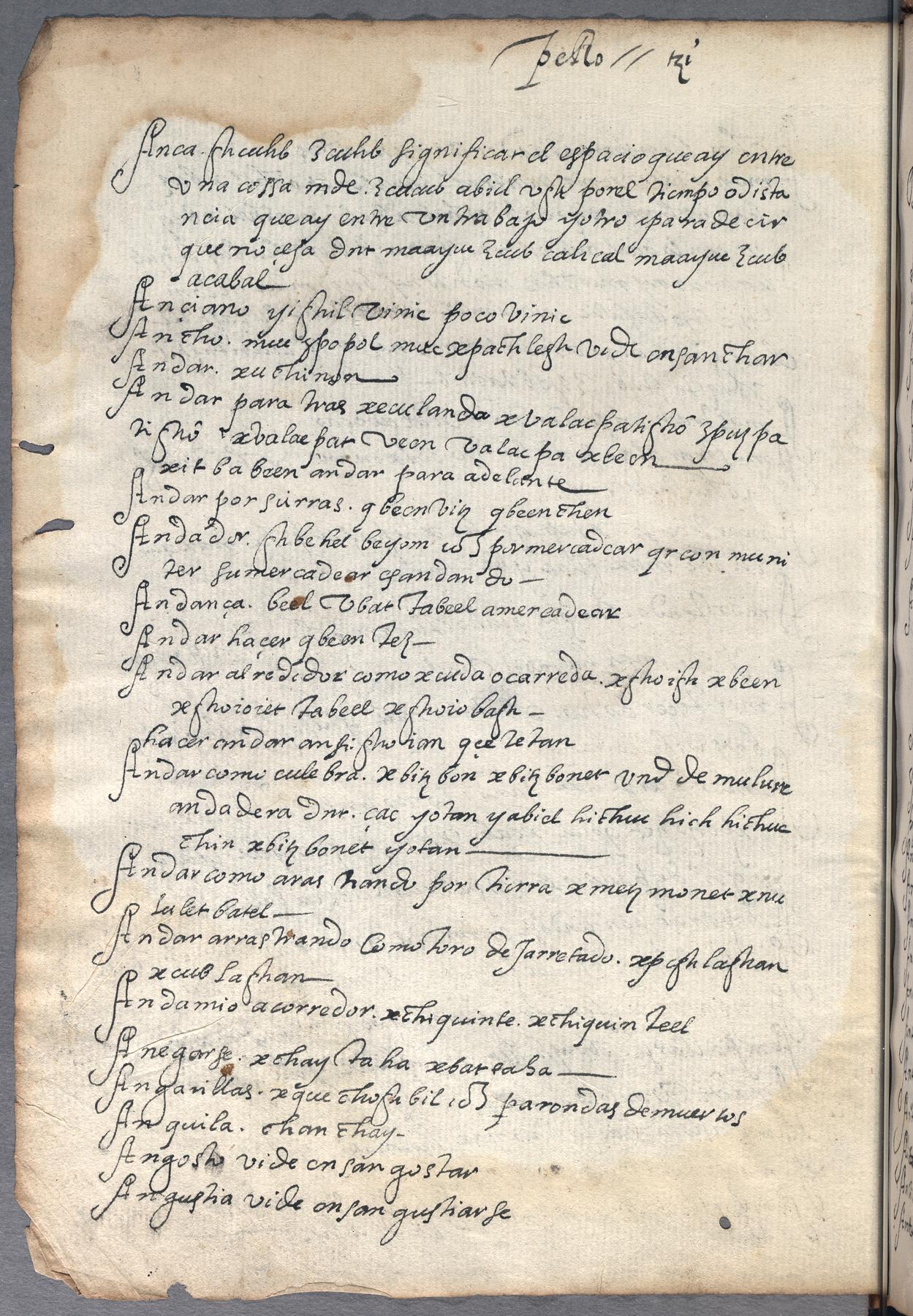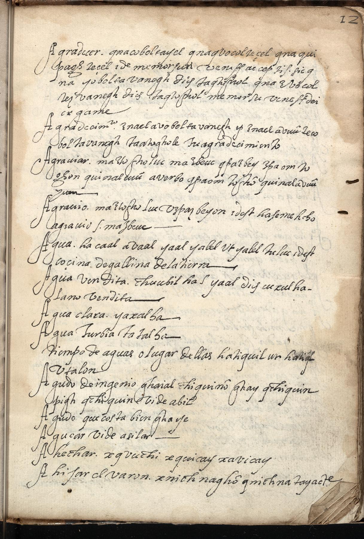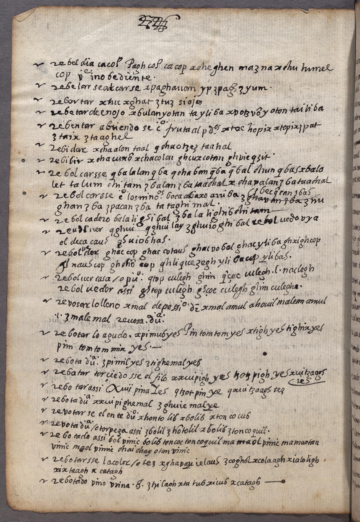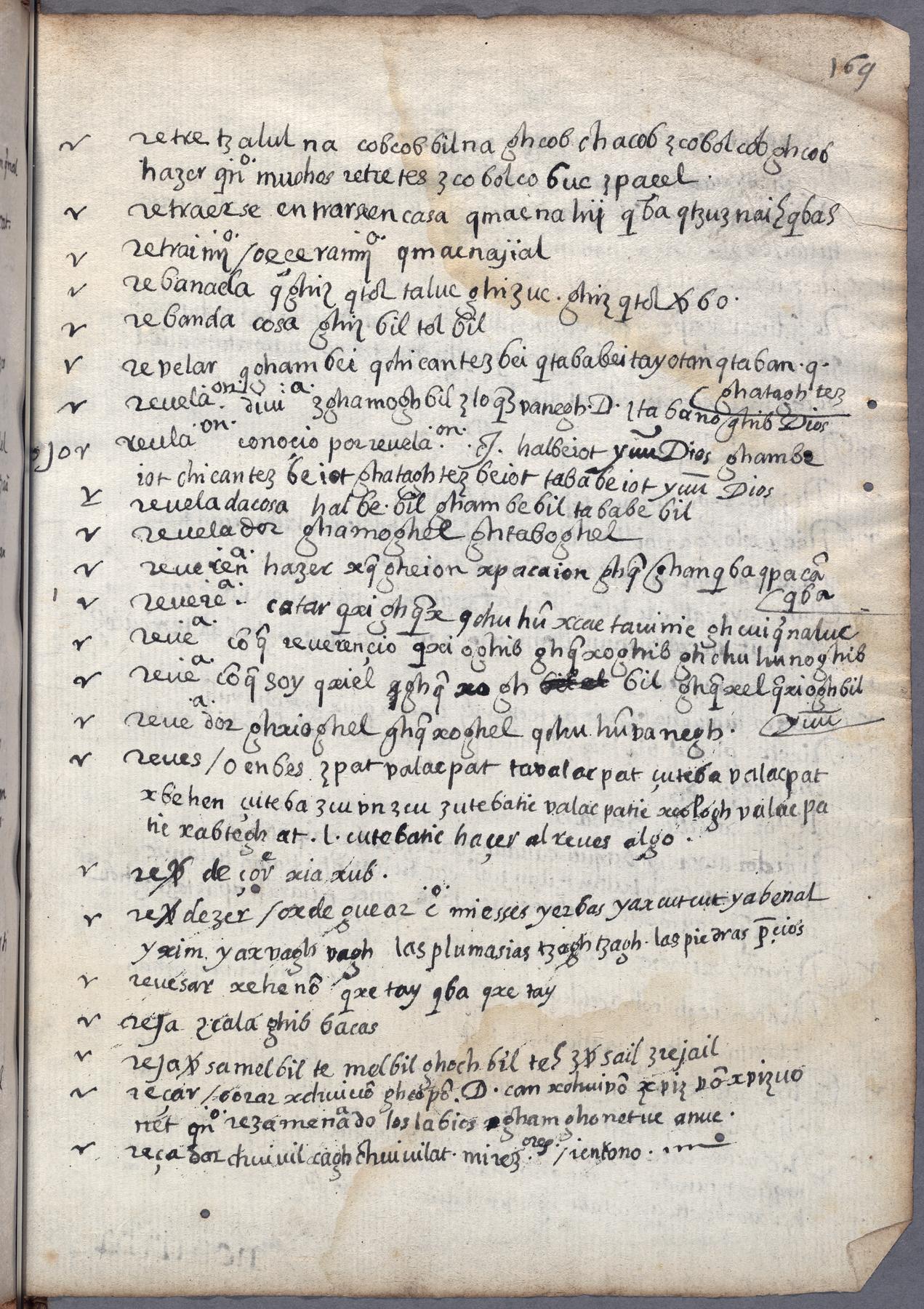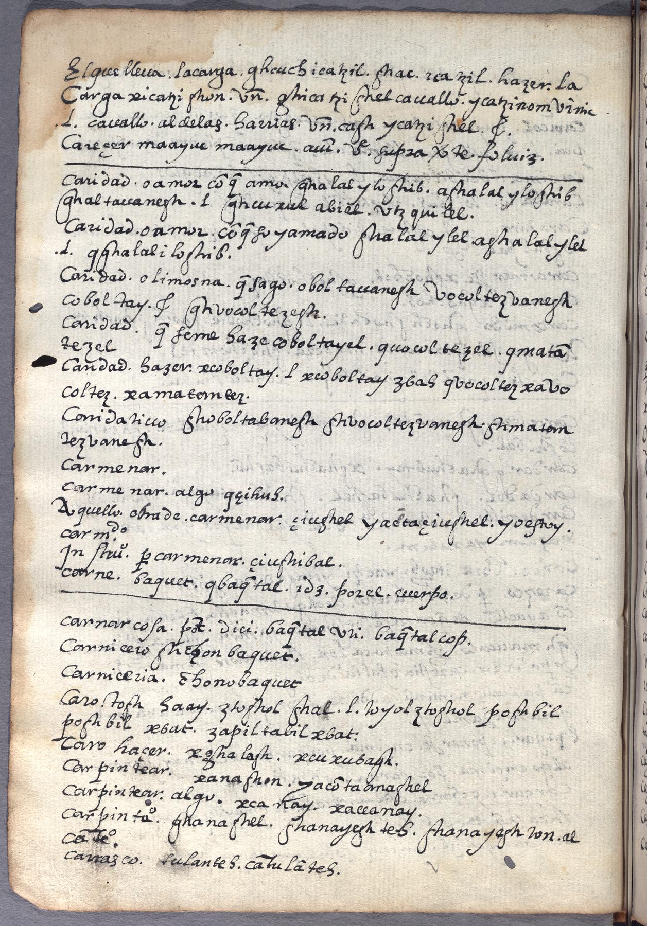 A copy, probably made in the 17th century, of an alphabetical list of Spanish names, words, and phrases, with translations in Tzeltal.